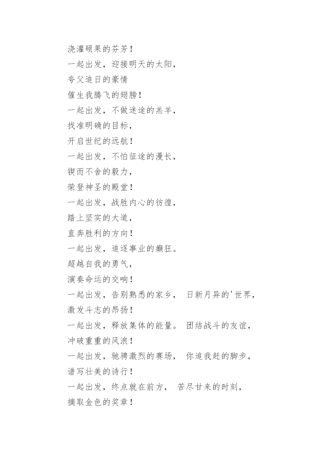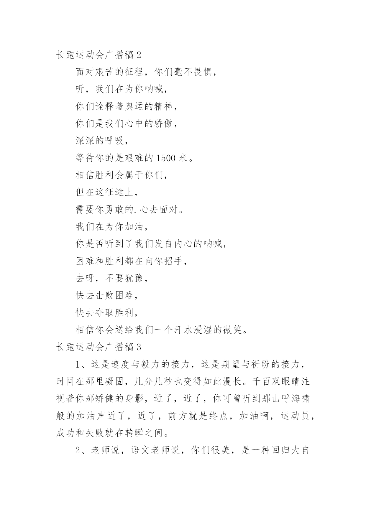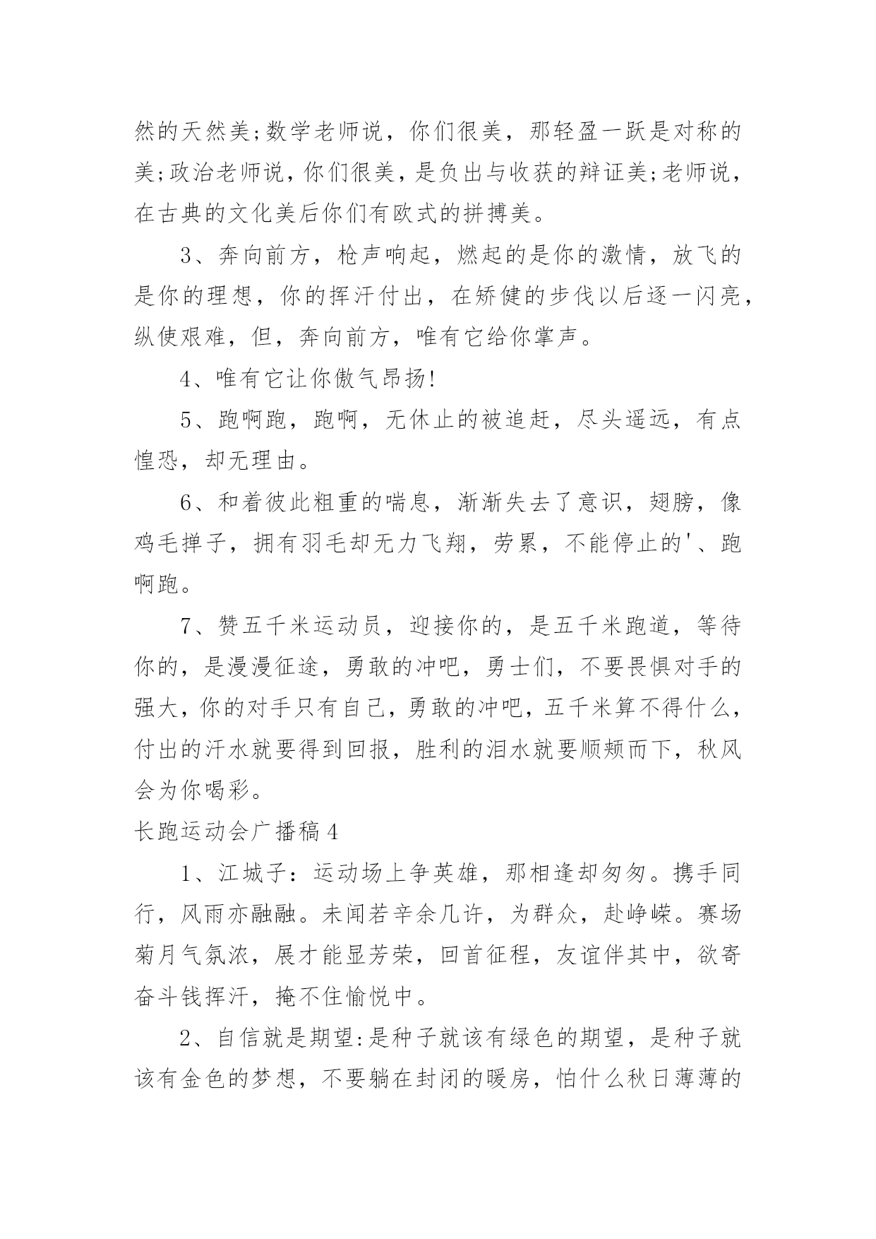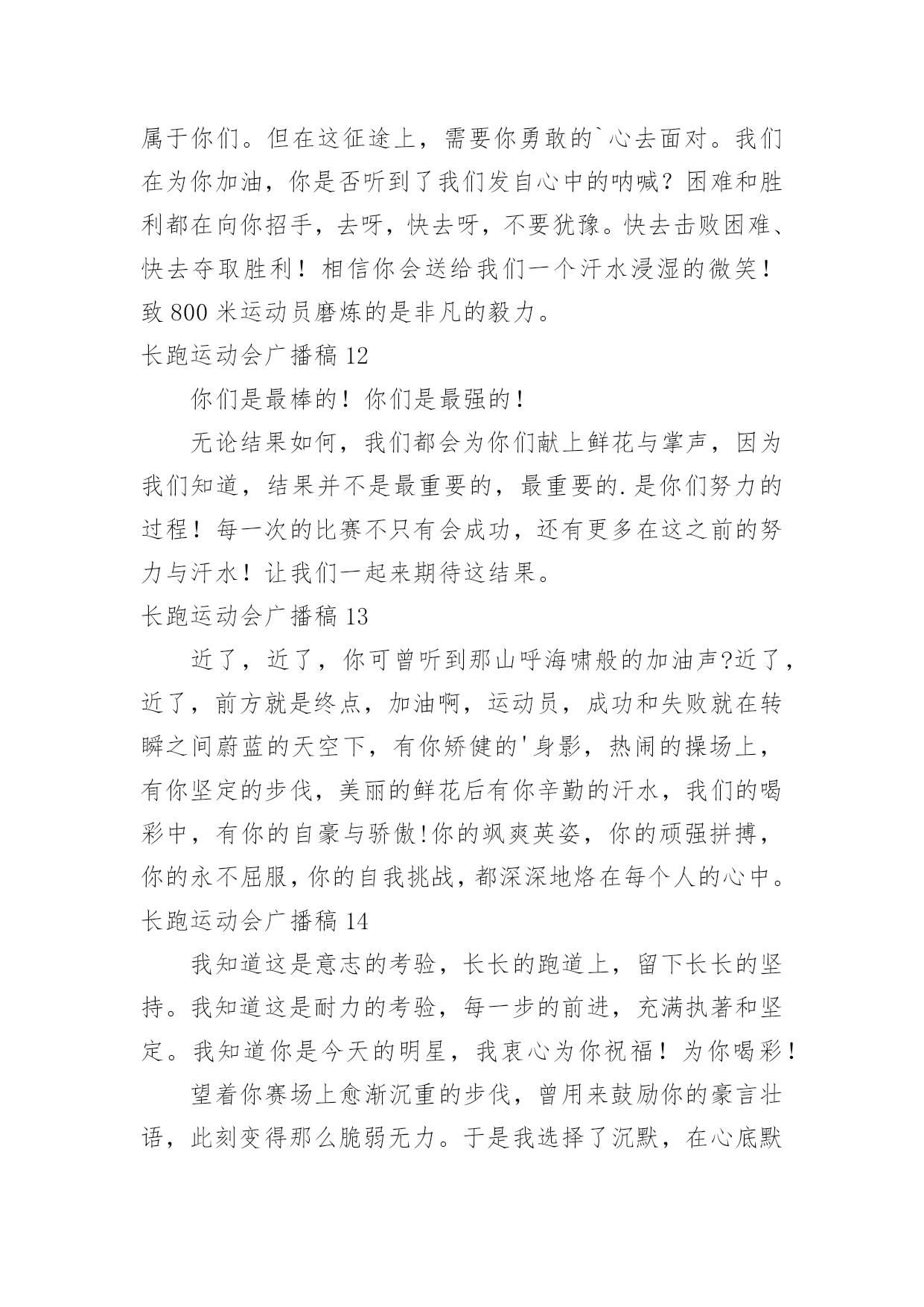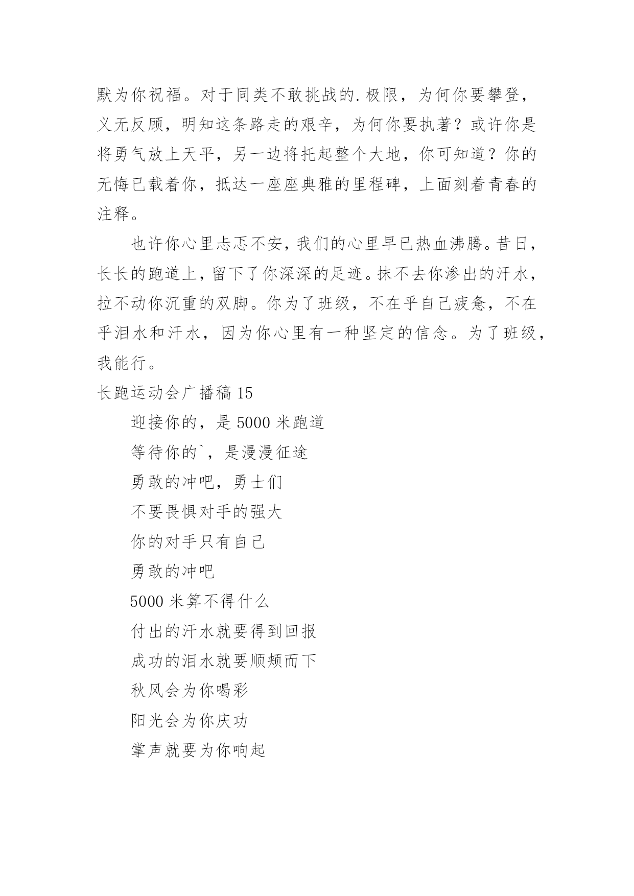 长跑运动会广播稿长跑运动会广播稿在学校广播站锻炼的学生都知道,大家广播前一般都会预先做好广播稿,一流的广播稿会带来更好的节目效果,那么广播稿应该怎么写才合适呢?下面是小编为大家收集的长跑运动会广播稿,仅供参考,欢迎大家阅读。长跑运动会广播稿1常远撰写一起出发,趁着明媚的春光,随处绽放的花蕾,点燃我青春的梦想!一起出发,伴着雄伟的乐章,华夏沸腾的热血,注入我宽广的胸膛!一起出发,带上师友的热望,响在耳边的掌声,增添我奋进的力量!一起出发,挺起自信的脊梁,充满坎坷的征程,磨砺我意志的坚强!一起出发,开创人生的辉煌,额头晶莹的汗水,浇灌硕果的芬芳!一起出发,迎接明天的太阳,夸父追日的豪情催生我腾飞的翅膀!一起出发,不做迷途的羔羊,找准明确的目标,开启世纪的远航!一起出发,不怕征途的漫长,锲而不舍的毅力,荣登神圣的殿堂!一起出发,战胜内心的彷徨,踏上坚实的大道,直奔胜利的方向!一起出发,追逐事业的癫狂。超越自我的勇气,演奏命运的交响!一起出发,告别熟悉的家乡,日新月异的'世界,激发斗志的昂扬!一起出发,释放集体的能量。团结战斗的友谊,冲破重重的风浪!一起出发,驰骋激烈的赛场,你追我赶的脚步,谱写壮美的诗行!一起出发,终点就在前方,苦尽甘来的时刻,摘取金色的奖章!长跑运动会广播稿2面对艰苦的征程,你们毫不畏惧,听,我们在为你呐喊,你们诠释着奥运的精神,你们是我们心中的骄傲,深深的呼吸,等待你的是艰难的1500米。相信胜利会属于你们,但在这征途上,需要你勇敢的.心去面对。我们在为你加油,你是否听到了我们发自内心的呐喊,困难和胜利都在向你招手,去呀,不要犹豫,快去击败困难,快去夺取胜利,相信你会送给我们一个汗水浸湿的微笑。长跑运动会广播稿31、这是速度与毅力的接力,这是期望与祈盼的接力,时间在那里凝固,几分几秒也变得如此漫长。千百双眼睛注视着你那矫健的身影,近了,近了,你可曾听到那山呼海啸般的加油声近了,近了,前方就是终点,加油啊,运动员,成功和失败就在转瞬之间。2、老师说,语文老师说,你们很美,是一种回归大自然的天然美;数学老师说,你们很美,那轻盈一跃是对称的美;政治老师说,你们很美,是负出与收获的辩证美;老师说,在古典的文化美后你们有欧式的拼搏美。3、奔向前方,枪声响起,燃起的是你的激情,放飞的是你的理想,你的挥汗付出,在矫健的步伐以后逐一闪亮,纵使艰难,但,奔向前方,唯有它给你掌声。4、唯有它让你傲气昂扬!5、跑啊跑,跑啊,无休止的被追赶,尽头遥远,有点惶恐,却无理由。6、和着彼此粗重的喘息,渐渐失去了意识,翅膀,像鸡毛掸子,拥有羽毛却无力飞翔,劳累,不能停止的'、跑啊跑。7、赞五千米运动员,迎接你的,是五千米跑道,等待你的,是漫漫征途,勇敢的冲吧,勇士们,不要畏惧对手的强大,你的对手只有自己,勇敢的冲吧,五千米算不得什么,付出的汗水就要得到回报,胜利的泪水就要顺颊而下,秋风会为你喝彩。长跑运动会广播稿41、江城子:运动场上争英雄,那相逢却匆匆。携手同行,风雨亦融融。未闻若辛余几许,为群众,赴峥嵘。赛场菊月气氛浓,展才能显芳荣,回首征程,友谊伴其中,欲寄奋斗钱挥汗,掩不住愉悦中。2、自信就是期望:是种子就该有绿色的期望,是种子就该有金色的梦想,不要躺在封闭的暖房,怕什么秋日薄薄的风霜,既然已走上了运动场,心里就不要多想,跑道已洒满阳光,不要羞涩不要紧张,听秋雁在空中为你歌唱,快去拾取片片金黄,充满信心,就有期望。3、赞啦啦队:几许真诚的鼓励,几句亲切的问候,几注深情的目光,几多支持与帮忙,带给运动员的`是信心,是勇气,是誓夺第一的决心和毅力。几句呐喊,几束鲜花,阵阵锣鼓,片片掌声,带给运动员的是满足,是感激,是成功后的喜悦和快意。多谢你,我们的啦啦队!4、有多少次挥汗如雨,伤痛曾添满记忆,只因为始终相信,去拼搏才能胜利。总在鼓舞自己,要成功就得努力。热血在赛场沸腾,巨人在赛场升起。相信自己,你将赢得胜利,创造奇迹;相信自己,梦想在你手中,这是你的天地。当一切过去,你们将是第一。相信自己,你们将超越极限,超越自己!相信自己,加油吧,健儿们,相信你自己。5、来吧,现在才是关键,把脆弱放在一边。抓不住机会的你,上不了最前线。踏上雪白跑线,把头发甩到后边。能量化成流汗,让我疯狂呐喊。相信我的预感,一定第一个撞线,定睛向你看,心情便会HIGH到极度点。长跑运动会广播稿51500米,1500米磨炼的是非凡的毅力,较量的`是超常的体力,拼搏的是出类拔萃的耐力。把长长的跑道跑成一段漫漫的征途,听!呼啸的风在为你喝彩,看!猎猎的彩旗在为你加油,加油吧!为了到达终点时那一刻的辉煌!长跑运动会广播稿61、致运动员,红色的跑道上,你像一簇火焰,用尽自己的热情,来燃烧自己的活力,殊不知,你是忍着疼痛,在为班级争光,那一圈圈的绷带格外醒目,加油吧,你所有的好