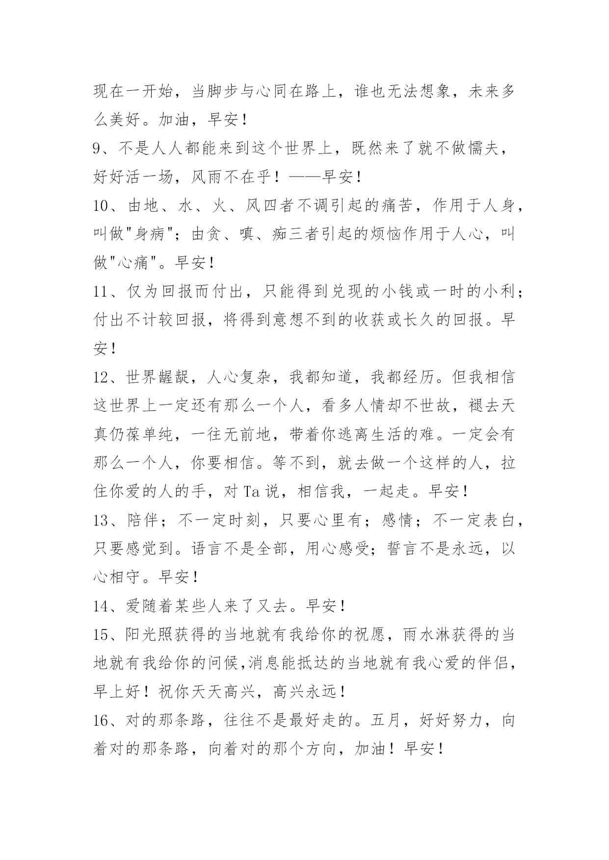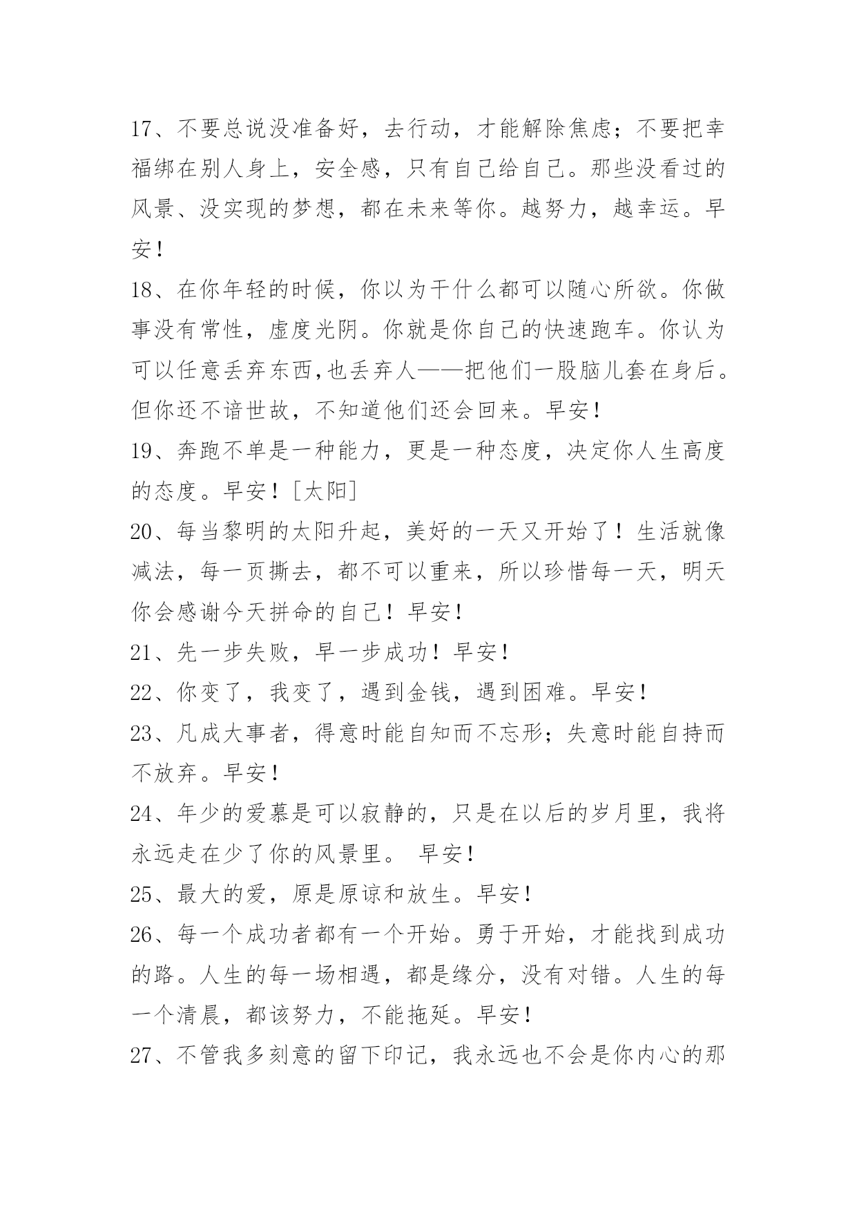 生活早安心语短信生活早安心语短信27句生活是人们发明出来的再美妙不过的东西了。早安!以下是小编精心整理的生活早安心语27句,欢迎大家前来欣赏。1、清晨,东方出现了瑰丽的朝霞,村子里的屋顶L飘着缕缕炊烟,空气中弥漫着轻纱似的薄雾。早安!2、念旧的人最容易受伤,喜欢拿余生来等一句别来无恙。早安!3、常常提醒自己注意幸福,就像在寒冷的日子里经常看看太阳,心就不知不觉暖洋洋亮光光。早安!4、承诺是男人常用的言语技巧,不知寻获了多少芳心。早安!5、别把我想的太好了,省的我把缺点展现给你的时候又说我变了。早安!6、做人坚持该坚持的,做事放弃该放弃的。早安!7、游乐场到中年再去吗?高跟鞋等六十岁再穿吗?我爱你要等分手再说吗?人要等走了才知道在你生命中的轻重吗?爱就要趁早,为自己献上一束花,要让它绽放,别让它含苞枯萎,别让等待成为后悔。8、永远不要对自己说不可以、不可能,人的能都是被逼出来的,没有谁天生就有一副神奇的翅膀,没有人能够随随便便成功。生命的每一片彩虹都是风雨换来的,你也只有非常努力,才能看起来像那些成功的人一样毫不费力。梦想就从现在一开始,当脚步与心同在路上,谁也无法想象,未来多么美好。加油,早安!9、不是人人都能来到这个世界上,既然来了就不做懦夫,好好活一场,风雨不在乎!——早安!10、由地、水、火、风四者不调引起的痛苦,作用于人身,叫做"身病";由贪、嗔、痴三者引起的烦恼作用于人心,叫做"心痛"。早安!11、仅为回报而付出,只能得到兑现的小钱或一时的小利;付出不计较回报,将得到意想不到的收获或长久的回报。早安!12、世界龌龊,人心复杂,我都知道,我都经历。但我相信这世界上一定还有那么一个人,看多人情却不世故,褪去天真仍葆单纯,一往无前地,带着你逃离生活的难。一定会有那么一个人,你要相信。等不到,就去做一个这样的人,拉住你爱的人的手,对Ta说,相信我,一起走。早安!13、陪伴;不一定时刻,只要心里有;感情;不一定表白,只要感觉到。语言不是全部,用心感受;誓言不是永远,以心相守。早安!14、爱随着某些人来了又去。早安!15、阳光照获得的当地就有我给你的祝愿,雨水淋获得的当地就有我给你的问候,消息能抵达的当地就有我心爱的伴侣,早上好!祝你天天高兴,高兴永远!16、对的那条路,往往不是最好走的。五月,好好努力,向着对的那条路,向着对的那个方向,加油!早安!17、不要总说没准备好,去行动,才能解除焦虑;不要把幸福绑在别人身上,安全感,只有自己给自己。那些没看过的风景、没实现的梦想,都在未来等你。越努力,越幸运。早安!18、在你年轻的时候,你以为干什么都可以随心所欲。你做事没有常性,虚度光阴。你就是你自己的快速跑车。你认为可以任意丢弃东西,也丢弃人——把他们一股脑儿套在身后。但你还不谙世故,不知道他们还会回来。早安!19、奔跑不单是一种能力,更是一种态度,决定你人生高度的态度。早安![太阳]20、每当黎明的太阳升起,美好的一天又开始了!生活就像减法,每一页撕去,都不可以重来,所以珍惜每一天,明天你会感谢今天拼命的自己!早安!21、先一步失败,早一步成功!早安!22、你变了,我变了,遇到金钱,遇到困难。早安!23、凡成大事者,得意时能自知而不忘形;失意时能自持而不放弃。早安!24、年少的爱慕是可以寂静的,只是在以后的岁月里,我将永远走在少了你的风景里。早安!25、最大的爱,原是原谅和放生。早安!26、每一个成功者都有一个开始。勇于开始,才能找到成功的路。人生的每一场相遇,都是缘分,没有对错。人生的每一个清晨,都该努力,不能拖延。早安!27、不管我多刻意的留下印记,我永远也不会是你内心的那道刻骨的铭心。早安!