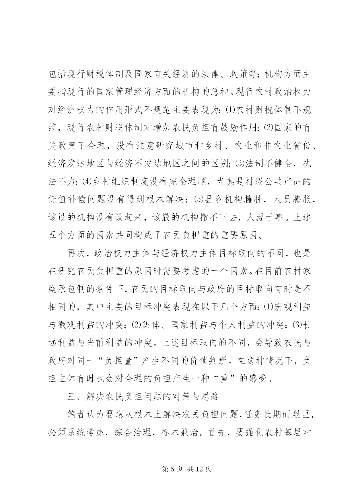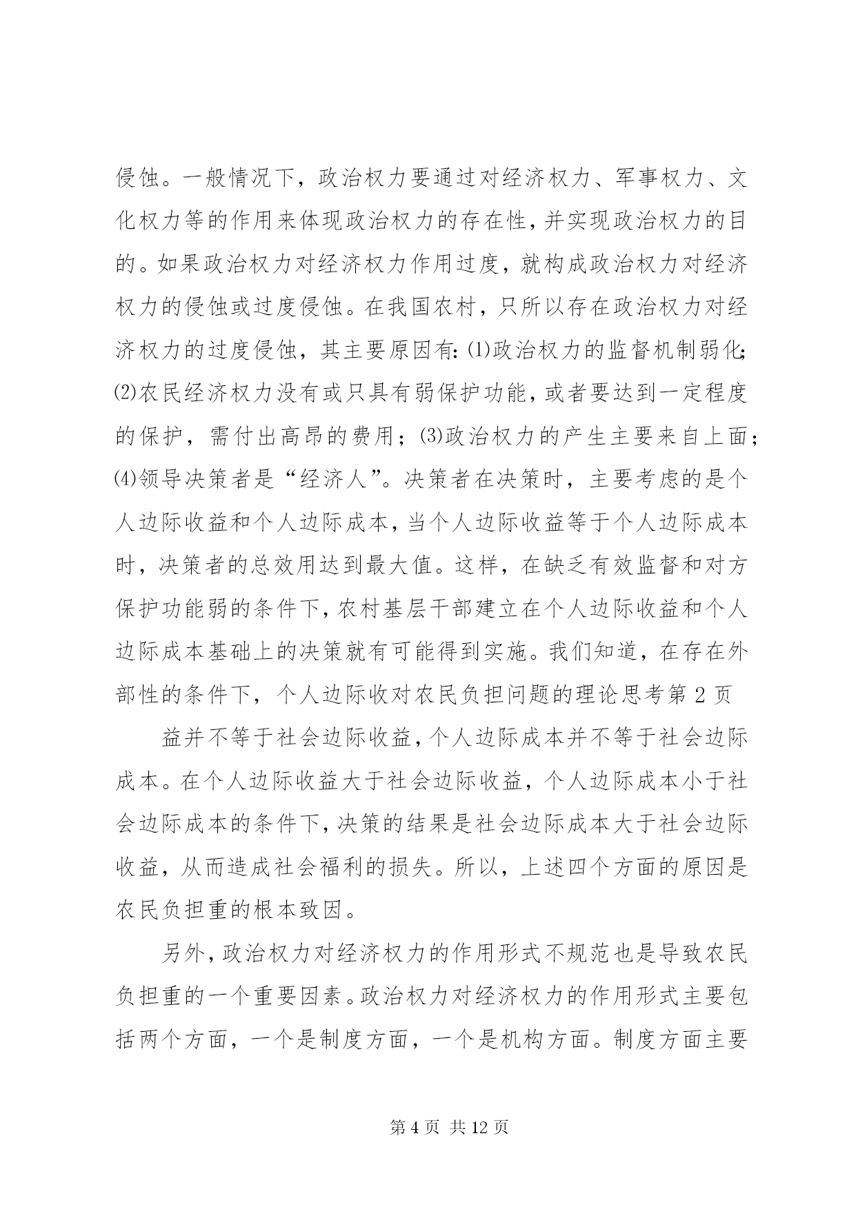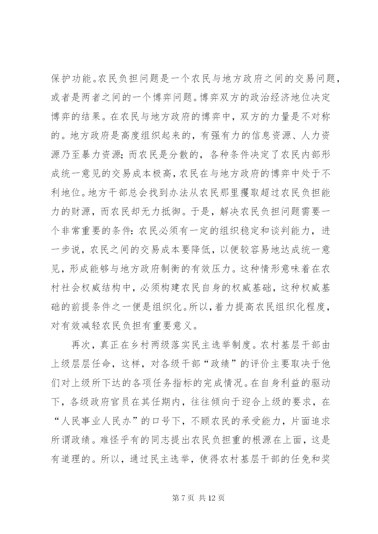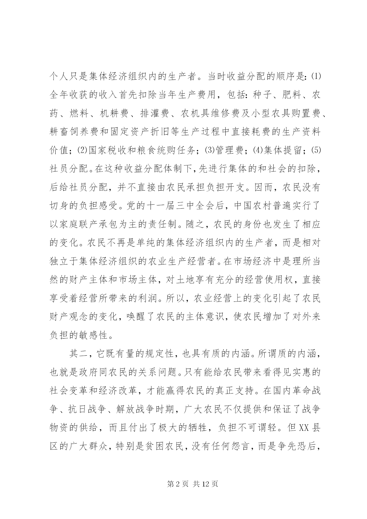 第PAGE\*Arabic\*MERGEFORMAT12页共NUMPAGES\*MERGEFORMAT12页对农民负担问题的理论思考对农民负担问题的理论思考农民负担是一个历史范畴。中国历代王朝的兴衰,都与农民负担问题有着非常密切的关系。新中国成立以来,也一直存在着农民负担问题,但作为农村乃至全社会关注的一个热点问题,却是80年代中后期以来的事情。多年来,党中央和国务院对减轻农民负担非常重视,采取了一系列重大措施,制定了一系列法律、法规和规章,对解决农民负担问题起到了关键的作用。目前,随着农村社会主义市场经济体制改革的深化,农民负担仍是一个十分突出的问题,要想从根本上解决之,任务仍十分艰巨。一、农民负担问题的界定一般来说,我们通常把政府及其部门向农民征收的一切税费,包括税收(明税和暗税)、乡统筹村提留、农村义务工和劳动积累工以及集资、摊派、罚款等统称之为农民负担。如果进一步思考,农民负担有着更为深刻的内涵。其一,它既是一个客观范畴,也具有主观特性。从客观方面来看,农民负担是实实在在的物资支出或货币支出,没有这些实际的支出,农民负担就无从谈起。但从另一方面来看,农民负担又是负担主体农民的一种感受。从这个意义上来讲,80年代农民负担问题的提出与农民自身因素的变化有着极大的关系。在人民公社体制下,农村的土地等基本生产资料归集体所有,并由集体统一使用,组织集体劳动,农民个人只是集体经济组织内的生产者。当时收益分配的顺序是:⑴全年收获的收入首先扣除当年生产费用,包括:种子、肥料、农药、燃料、机耕费、排灌费、农机具维修费及小型农具购置费、耕畜饲养费和固定资产折旧等生产过程中直接耗费的生产资料价值;⑵国家税收和粮食统购任务;⑶管理费;⑷集体提留;⑸社员分配。在这种收益分配体制下,先进行集体的和社会的扣除,后给社员分配,并不直接由农民承担负担开支。因而,农民没有切身的负担感受。党的十一届三中全会后,中国农村普遍实行了以家庭联产承包为主的责任制。随之,农民的身份也发生了相应的变化。农民不再是单纯的集体经济组织内的生产者,而是相对独立于集体经济组织的农业生产经营者。在市场经济中是理所当然的财产主体和市场主体,对土地享有充分的经营使用权,直接享受着经营所带来的利润。所以,农业经营上的变化引起了农民财产观念的变化,唤醒了农民的主体意识,使农民增加了对外来负担的敏感性。其二,它既有量的规定性,也具有质的内涵。所谓质的内涵,也就是政府同农民的关系问题。只有能给农民带来看得见实惠的社会变革和经济改革,才能赢得农民的真正支持。在国内革命战争、抗日战争、解放战争时期,广大农民不仅提供和保证了战争物资的供给,而且付出了极大的牺牲,负担不可谓轻。但XX县区的广大群众,特别是贫困农民,没有任何怨言,而是争先恐后,踊跃输粮输人。所以,农民负担问题有时是用数量说明不了问题的。其根本性在于政府与农民的利益是否完全一致,在于民心的向背。其三。它不仅具有经济属性,而且具有政治属性。“三农”问题的核心是农民问题。农民问题的本质是农民的物质利益问题。保护还是损害农民的物质利益,突出表现在农民负担问题上。江泽民总书记指出:减轻还是加重农民负担绝不是少拿多拿几个钱的问题,而是保护还是挫伤农民积极性的问题,是促进还是阻碍农村生产力发展的问题,是增强还是丧失农民群众信任和拥护的问题。必须把减轻农民负担问题提到这样的政治高度来认识,提到我们党的宗旨和农村政权稳定的高度来认识,农村是我们党革命的摇篮,农民是我们革命的主力军。没有农民群众的巨大牺牲,就不可能取得革命的胜利。全心全意为人民服务是我们党的一贯宗旨。我国80%的人口都在农村,与农民关系处理得好坏,直接关系到我们党是否得到了人民群众的支持和拥护,如果这方面出了问题,可以说我们就抢劫了最广大、最可靠的同盟军,我们的立国之本就会动摇,我们的事业就很可能葬送。所以,农民负担问题不仅仅是一个经济问题,更重要的是一个政治问题。农民负担不仅具有经济属性,而且也具有政治属性。二、农民负担重的根源农民负担重的实质是农村基层政治权力对经济权力的过度侵蚀。一般情况下,政治权力要通过对经济权力、军事权力、文化权力等的作用来体现政治权力的存在性,并实现政治权力的目的。如果政治权力对经济权力作用过度,就构成政治权力对经济权力的侵蚀或过度侵蚀。在我国农村,只所以存在政治权力对经济权力的过度侵蚀,其主要原因有:⑴政治权力的监督机制弱化;⑵农民经济权力没有或只具有弱保护功能,或者要达到一定程度的保护,需付出高昂的费用;⑶政治权力的产生主要来自上面;⑷领导决策者是“经济人”。决策者在决策时,主要考虑的是个人边际收益和个人边际成本,当个人边际收益等于个人边际成本时,决策者的总效用达到最大值。这样,在缺乏有效监督和对方保护功能弱的条件下,农村基层干