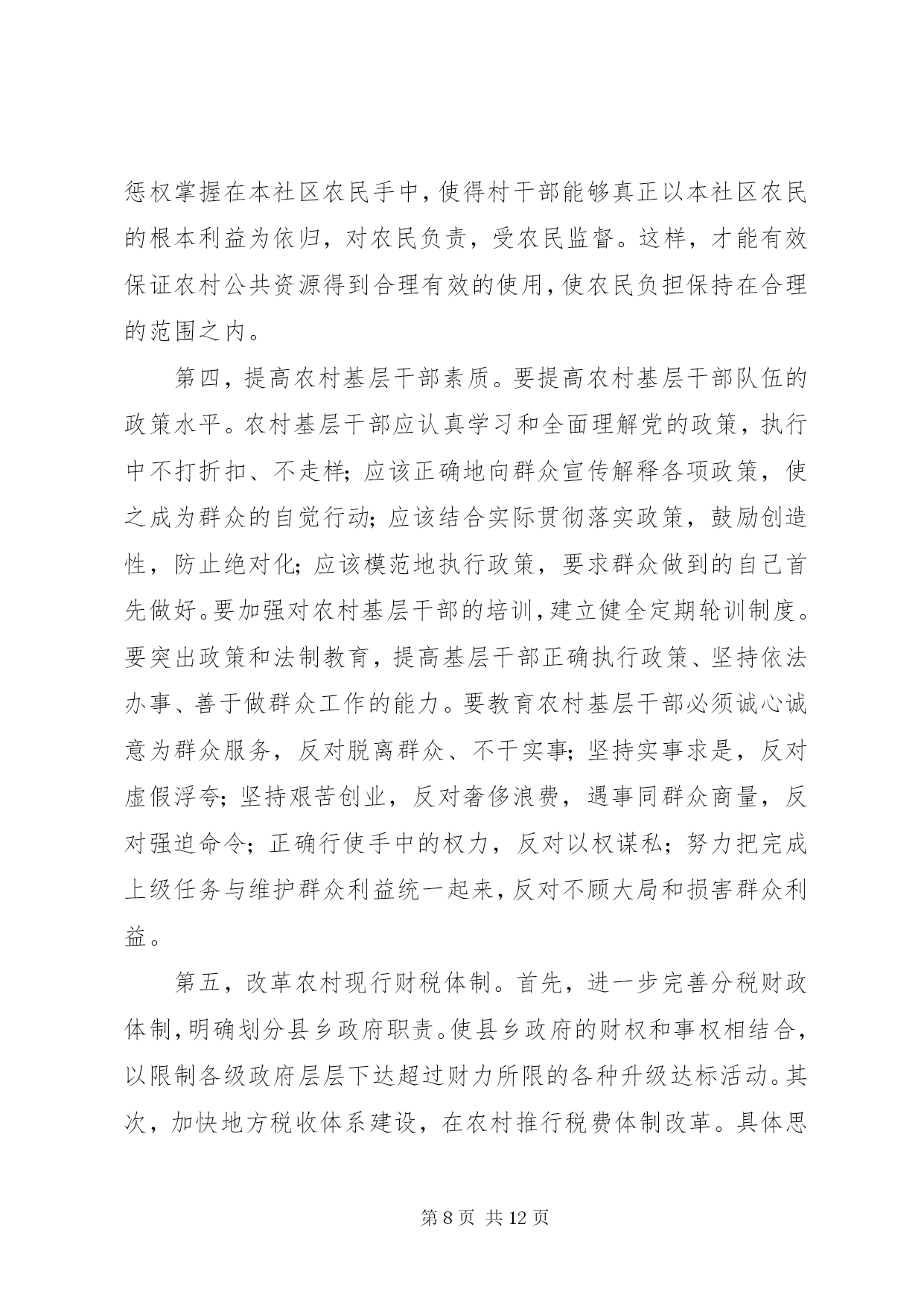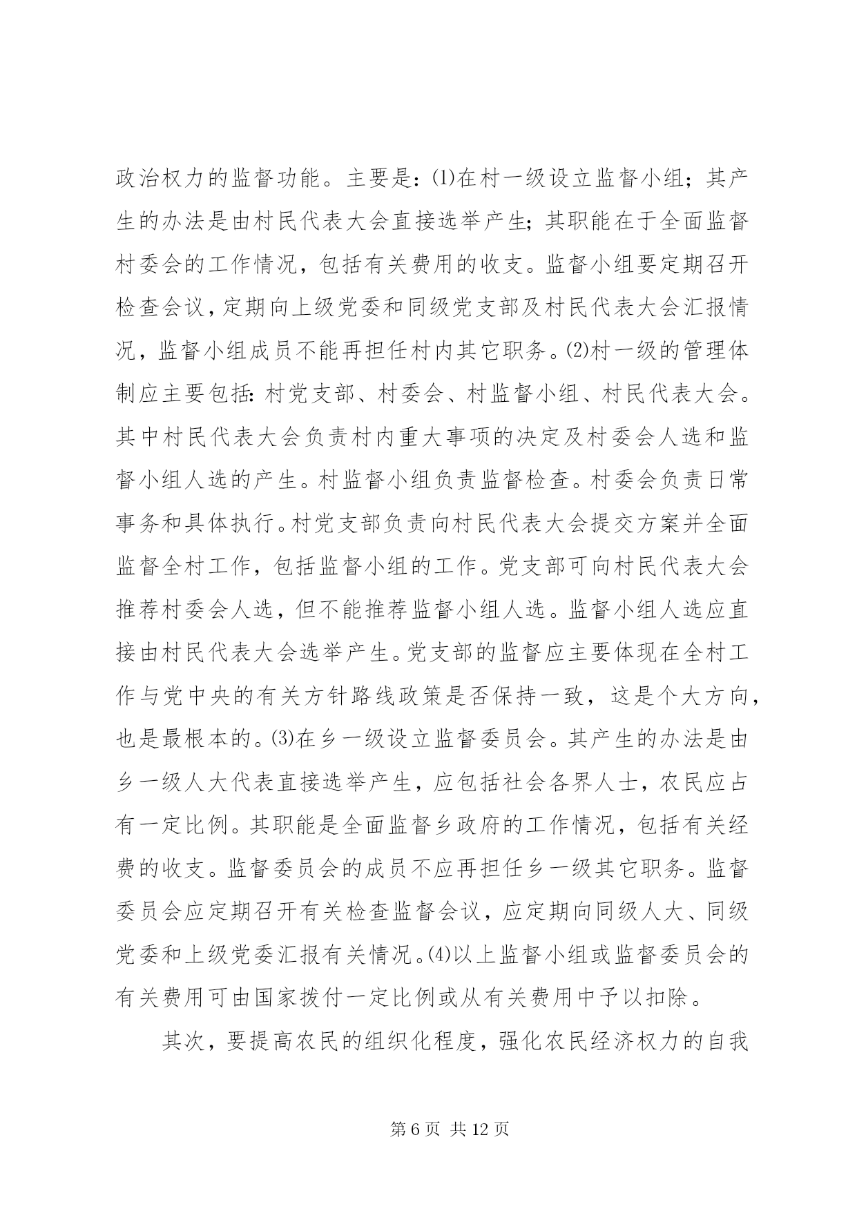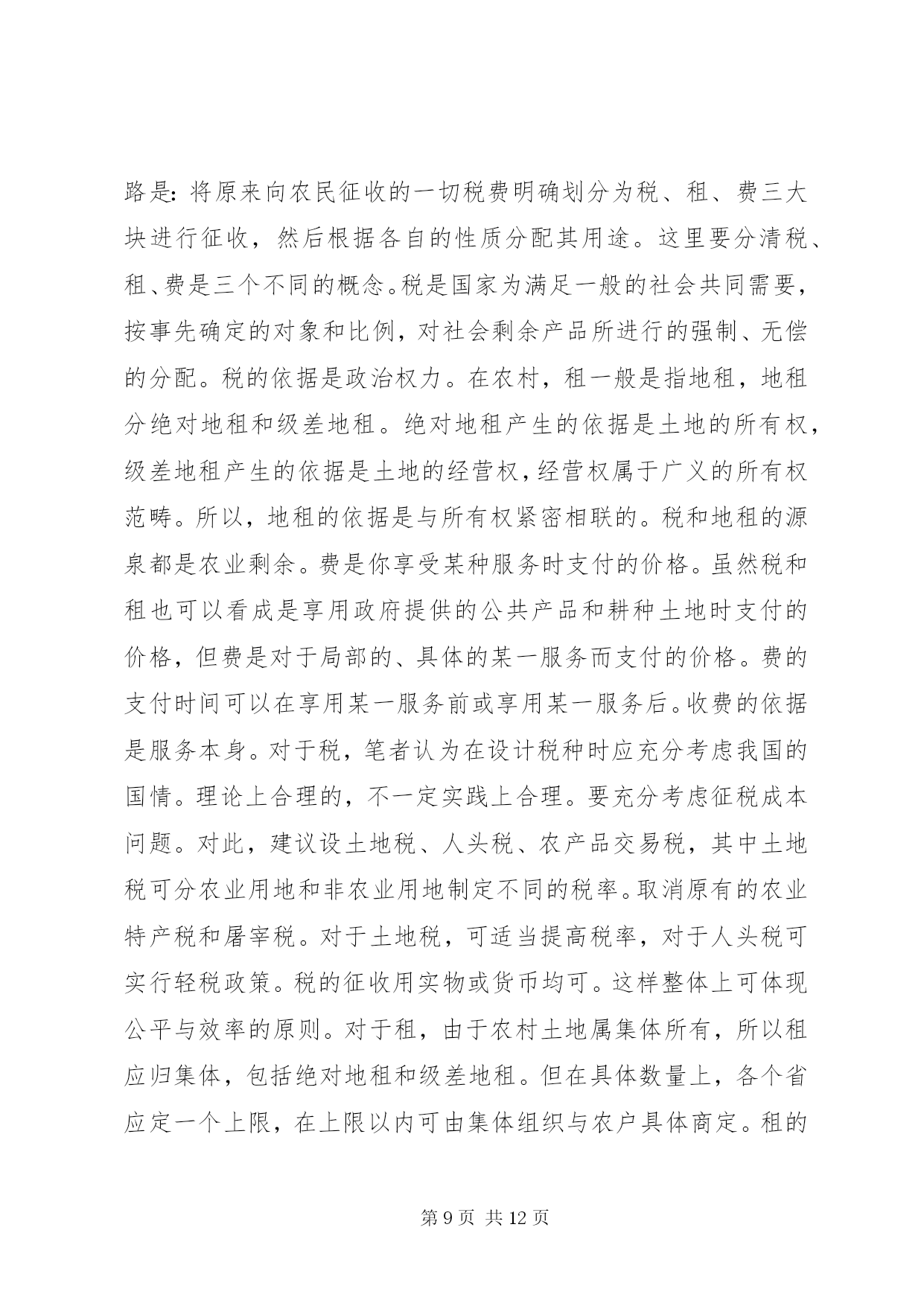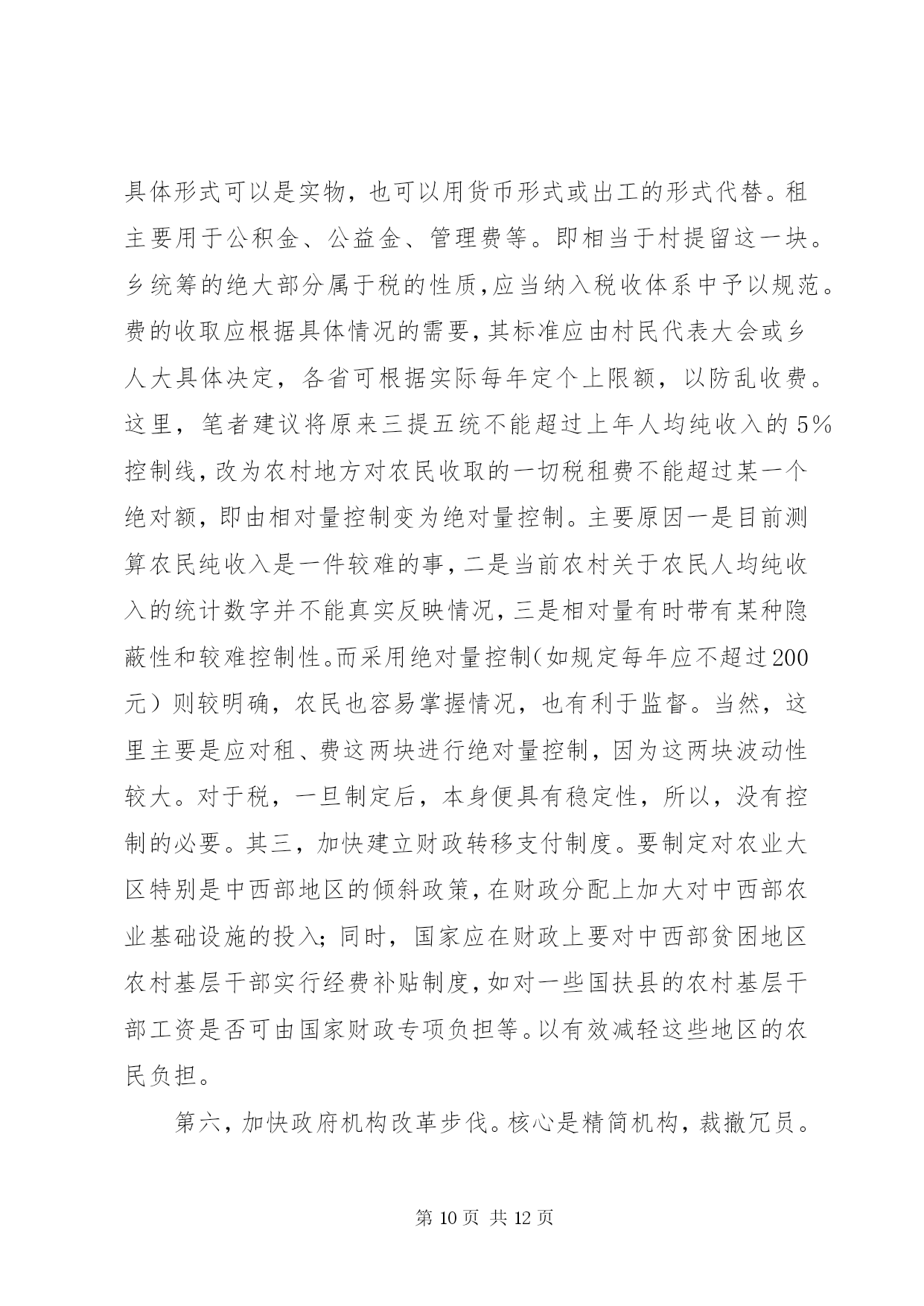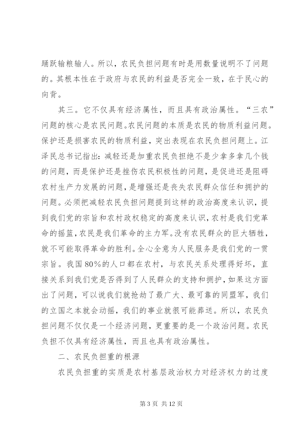 第PAGE\*Arabic\*MERGEFORMAT12页共NUMPAGES\*MERGEFORMAT12页对农民负担问题的理论思考对农民负担问题的理论思考农民负担是一个历史范畴。中国历代王朝的兴衰,都与农民负担问题有着非常密切的关系。新中国成立以来,也一直存在着农民负担问题,但作为农村乃至全社会关注的一个热点问题,却是80年代中后期以来的事情。多年来,党中央和国务院对减轻农民负担非常重视,采取了一系列重大措施,制定了一系列法律、法规和规章,对解决农民负担问题起到了关键的作用。目前,随着农村社会主义市场经济体制改革的深化,农民负担仍是一个十分突出的问题,要想从根本上解决之,任务仍十分艰巨。一、农民负担问题的界定一般来说,我们通常把政府及其部门向农民征收的一切税费,包括税收(明税和暗税)、乡统筹村提留、农村义务工和劳动积累工以及集资、摊派、罚款等统称之为农民负担。如果进一步思考,农民负担有着更为深刻的内涵。其一,它既是一个客观范畴,也具有主观特性。从客观方面来看,农民负担是实实在在的物资支出或货币支出,没有这些实际的支出,农民负担就无从谈起。但从另一方面来看,农民负担又是负担主体农民的一种感受。从这个意义上来讲,80年代农民负担问题的提出与农民自身因素的变化有着极大的关系。在人民公社体制下,农村的土地等基本生产资料归集体所有,并由集体统一使用,组织集体劳动,农民个人只是集体经济组织内的生产者。当时收益分配的顺序是:⑴全年收获的收入首先扣除当年生产费用,包括:种子、肥料、农药、燃料、机耕费、排灌费、农机具维修费及小型农具购置费、耕畜饲养费和固定资产折旧等生产过程中直接耗费的生产资料价值;⑵国家税收和粮食统购任务;⑶管理费;⑷集体提留;⑸社员分配。在这种收益分配体制下,先进行集体的和社会的扣除,后给社员分配,并不直接由农民承担负担开支。因而,农民没有切身的负担感受。党的十一届三中全会后,中国农村普遍实行了以家庭联产承包为主的责任制。随之,农民的身份也发生了相应的变化。农民不再是单纯的集体经济组织内的生产者,而是相对独立于集体经济组织的农业生产经营者。在市场经济中是理所当然的财产主体和市场主体,对土地享有充分的经营使用权,直接享受着经营所带来的利润。所以,农业经营上的变化引起了农民财产观念的变化,唤醒了农民的主体意识,使农民增加了对外来负担的敏感性。其二,它既有量的规定性,也具有质的内涵。所谓质的内涵,也就是政府同农民的关系问题。只有能给农民带来看得见实惠的社会变革和经济改革,才能赢得农民的真正支持。在国内革命战争、抗日战争、解放战争时期,广大农民不仅提供和保证了战争物资的供给,而且付出了极大的牺牲,负担不可谓轻。但XX县区的广大群众,特别是贫困农民,没有任何怨言,而是争先恐后,踊跃输粮输人。所以,农民负担问题有时是用数量说明不了问题的。其根本性在于政府与农民的利益是否完全一致,在于民心的向背。其三。它不仅具有经济属性,而且具有政治属性。“三农”问题的核心是农民问题。农民问题的本质是农民的物质利益问题。保护还是损害农民的物质利益,突出表现在农民负担问题上。江泽民总书记指出:减轻还是加重农民负担绝不是少拿多拿几个钱的问题,而是保护还是挫伤农民积极性的问题,是促进还是阻碍农村生产力发展的问题,是增强还是丧失农民群众信任和拥护的问题。必须把减轻农民负担问题提到这样的政治高度来认识,提到我们党的宗旨和农村政权稳定的高度来认识,农村是我们党革命的摇篮,农民是我们革命的主力军。没有农民群众的巨大牺牲,就不可能取得革命的胜利。全心全意为人民服务是我们党的一贯宗旨。我国80%的人口都在农村,与农民关系处理得好坏,直接关系到我们党是否得到了人民群众的支持和拥护,如果这方面出了问题,可以说我们就抢劫了最广大、最可靠的同盟军,我们的立国之本就会动摇,我们的事业就很可能葬送。所以,农民负担问题不仅仅是一个经济问题,更重要的是一个政治问题。农民负担不仅具有经济属性,而且也具有政治属性。二、农民负担重的根源农民负担重的实质是农村基层政治权力对经济权力的过度侵蚀。一般情况下,政治权力要通过对经济权力、军事权力、文化权力等的作用来体现政治权力的存在性,并实现政治权力的目的。如果政治权力对经济权力作用过度,就构成政治权力对经济权力的侵蚀或过度侵蚀。在我国农村,只所以存在政治权力对经济权力的过度侵蚀,其主要原因有:⑴政治权力的监督机制弱化;⑵农民经济权力没有或只具有弱保护功能,或者要达到一定程度的保护,需付出高昂的费用;⑶政治权力的产生主要来自上面;⑷领导决策者是“经济人”。决策者在决策时,主要考虑的是个人边际收益和个人边际成本,当个人边际收益等于个人边际成本时,决策者的总效用达到最大值。这样,在缺乏有效监督和对方保护功能弱的条件下,农村基层干
