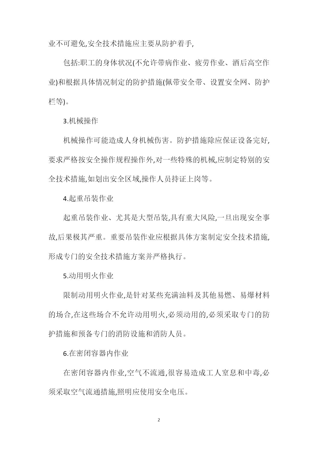 PAGEPAGE4机电工程项目施工安全技术措施一、施工安全技术措施的制定(一)制定施工安全技术措施应遵循消除、预防、减少、隔离、个体保护(首先是消除)的原则。对不可避免的危险源,要在防护上、技术上和管理上采取相应的措施,并不断监测防止其超出可承受范围。(二)根据具体工程项目特点,有针对性地制定施工安全技术措施,其主要内容包括:1.施工平面布置的安全技术要求(1)油料及其他易燃、易爆材料库房与其他建筑物的距离应按规范、规程设置,符合安全要求。(2)电气设备、变配电设备、输配电线路的位置、防护及与其他设施、构筑物、道路等的距离符合安全要求。(3)材料、机械设备与结构坑、槽的距离符合安全要求。(4)加工场地、施工机械的位置应满足使用、维修的安全距离。(5)配置必要的消防设施、装备、器材,确定控制和检查手段、方法、措施。2.高空作业人员在高空作业,如意外从高空跌落,可能造成人身伤害。高空作业不可避免,安全技术措施应主要从防护着手,包括:职工的身体状况(不允许带病作业、疲劳作业、酒后高空作业)和根据具体情况制定的防护措施(佩带安全带、设置安全网、防护栏等)。3.机械操作机械操作可能造成人身机械伤害。防护措施除应保证设备完好,要求严格按安全操作规程操作外,对一些特殊的机械,应制定特别的安全技术措施,如划出安全区域,操作人员持证上岗等。4.起重吊装作业起重吊装作业、尤其是大型吊装,具有重大风险,一旦出现安全事故,后果极其严重。重要吊装作业应根据具体方案制定安全技术措施,形成专门的安全技术措施方案并严格执行。5.动用明火作业限制动用明火作业,是针对某些充满油料及其他易燃、易爆材料的场合,在这些场合不允许动用明火,必须动用的,必须采取专门的防护措施和预备专门的消防设施和消防人员。6.在密闭容器内作业在密闭容器内作业,空气不流通,很容易造成工人窒息和中毒,必须采取空气流通措施,照明应使用安全电压。7.带电调试作业带电调试作业既可能导致工人触电发生事故,也可能发生用电机械产生误动作而引发安全事故。必须采取相应的安全技术措施防止触电和用电机械产生误动作。8.管道和容器的探伤、冲洗及压力试验(1)管道和压力容器的无损探伤包括射线、超声波、磁粉和渗透探伤等。(2)管道和容器的酸洗过程中,严格遵守酸洗的操作规程。(3)管道和容器压力试验中的气压试验,其安全技术措施主要是严格按试压程序进行,即先水压试验,后气压试验,分级试压,试压前严格执行检查、报批程序。9.临时用电施工现场应该严格按原建设部颁发的现行标准《施工现场临时用电安全技术规程》(JCJ46)进行临时用电施工,充分考虑施工现场的临时用电部位,规范布线,严格管理等,特别要做好带电作业和高压作业的防护。10.单机试车和联动试车单机试车和联动试车是施工过程中安全事故、特别是重大安全事故的频发段。应根据设备的工艺作用、工作特点、与其他设施的关联等制定安全技术措施方案。此外还有冬期、雨期、夏季高温期、夜间等施工时安全技术措施;针对工程项目的特殊需求,补充相应的安全操作规程或措施;针对采用新工艺、新技术、新设备、新材料施工的特殊性制定相应的安全技术措施;对施工各专业、工种、施工各阶段、交叉作业等编制针对性的安全技术措施等。