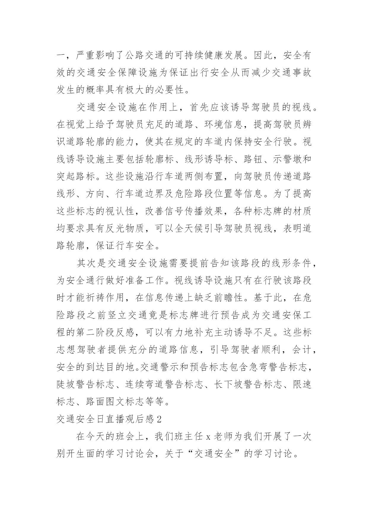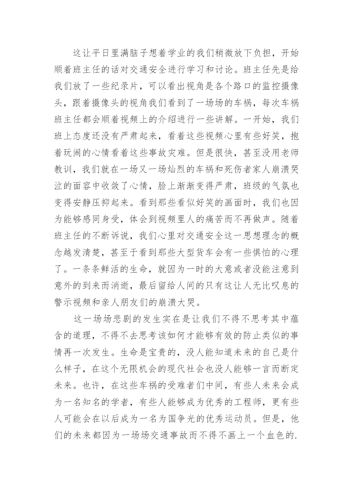 交通安全日直播观后感交通安全日直播观后感细细品味一部作品以后,这次观看让你心中有什么感想呢?需要写一篇观后感好好地作记录了。你想知道观后感怎么写吗?以下是小编整理的交通安全日直播观后感,仅供参考,希望能够帮助到大家。交通安全日直播观后感1近年来,我国的交通事业得到了迅猛的发展。交通基础设施建设不断取得新成绩,运输保障能力得到进一步的提高。至20xx年底,我国的公路里程已达到357.3万公里,高速公路达到5.36万公里,稳居世界第二位。我国的公路建设只用10余年的时间就走过西方发达国家几十年的发展历程,成绩斐然。但是与西方发达国家一样,随着公路建设的突飞猛进、机动化水平的迅速提高和驾驶员数量的大幅增长,我国道路交通的事故也居高不下。1990年,全国有49271人死于道路交通事故,到了20xx年,首次超过10万人,达到105930人。其间尤以20xx和20xx年增长最多,每年增幅超过1万人。20xx年,死亡人数的增速虽然有所下降,但由于基数较大,总量仍高达109381人,达到历史上的'最高峰。截至20xx年6月,我国目前机动车保有量为152807598辆,仅占全球汽车保有量的2%;而每年死于交通事故的人数却占全球的15%-20%。目前,我国公路交通死亡人数世界第一,严重影响了公路交通的可持续健康发展。因此,安全有效的交通安全保障设施为保证出行安全从而减少交通事故发生的概率具有极大的必要性。交通安全设施在作用上,首先应该诱导驾驶员的视线。在视觉上给予驾驶员充足的道路、环境信息,提高驾驶员辨识道路轮廓的能力,使其在规定的车道内保持安全行驶。视线诱导设施主要包括轮廓标、线形诱导标、路钮、示警墩和突起路标。这些设施沿行车道两侧布置,向驾驶员传递道路线形、方向、行车道边界及危险路段位置等信息。为了提高这些标志的视认性,改善信号传播效果,各种标志牌的材质均要求具有反光物质,可以全天候引导驾驶员视线,表明道路轮廓,保证行车安全。其次是交通安全设施需要提前告知该路段的线形条件,为安全通行做好准备工作。视线诱导设施只有在行驶该路段时才能祈祷作用,在信息传递上缺乏前瞻性。基于此,在危险路段之前竖立交通竟是标志牌进行预告成为交通安保工程的第二阶段反感,可以有力地补充主动诱导不足。这些标志想驾驶者提供充分的道路信息,引导驾驶者顺利,会计,安全的到达目的地。交通警示和预告标志包含急弯警告标志,陡坡警告标志、连续弯道警告标志、长下坡警告标志、限速标志、路面图文标志等等。交通安全日直播观后感2在今天的班会上,我们班主任x老师为我们开展了一次别开生面的学习讨论会,关于“交通安全”的学习讨论。这让平日里满脑子想着学业的我们稍微放下负担,开始顺着班主任的话对交通安全进行学习和讨论。班主任先是给我们放了一些纪录片,可以看出视角是各个路口的监控摄像头,跟着摄像头的视角我们看到了一场场的车祸,每次车祸班主任都会顺着视频上的介绍进行一些讲解。一开始,我们班上态度还没有严肃起来,看着这些视频心里有些好笑,抱着玩闹的心情看着这些事故灾难。但是很快,甚至没用老师教训,我们就在一场又一场灿烈的车祸和死伤者家人崩溃哭泣的面容中收敛了心情,脸上渐渐变得严肃,班级的气氛也变得安静压抑起来。看到那些看似好笑的画面时,我们也因为能够感同身受,体会到视频里人的痛苦而不再做声。随着班主任的不断诉说,我们心里对交通安全这一思想理念的概念越发清楚,甚至于看到那些大型货车会有一些惧怕的心理了。一条条鲜活的生命,就因为一时的大意或者没能注意到意外的到来而消逝,最后留给人间的只有这让人无比叹息的警示视频和亲人朋友们的崩溃大哭。这一场场悲剧的发生实在是让我们不得不思考其中蕴含的道理,不得不去思考该如何才能够有效的防止类似的事情再一次发生。生命是宝贵的,没人能知道未来的自己是什么样子,在这个无限机会的现代社会也没人能够一言而断定未来。也许,在这些车祸的受难者们中间,有些人未来会成为一名知名的学者,有些人能够成为优秀的工程师,更有些人可能会在以后成为一名为国争光的优秀运动员。但是,他们的未来都因为一场场交通事故而不得不画上一个血色的.句号,徒留给人间无尽的遗憾。为了避免这样事故的发生,我想了很多,但是最终只能做到自己多多注意,保持警惕,才能预防类似的事情发生。我们的生命只有一次,但是很多人在事情没有发生在自己身上的时候常常不以为意,认为发生的几率这么小,怎么可能会正好碰到自己身上。因此肆无忌惮的横穿马路,对左右两边的道路安全缺乏关注,走在马路上跟走在自己家里一样随意。殊不知恰巧就是这样的行为才提高了事故发生的几率,等于是将自己送上了危险的边缘。因此,我们应该在以后的日常生活中,对于交通安全多加留意,做到不闯红灯,不抢行,遵守交通规则,这既是对自己的安全负责,也是对社会秩序的维护。让我们将交通安全从自己做起,