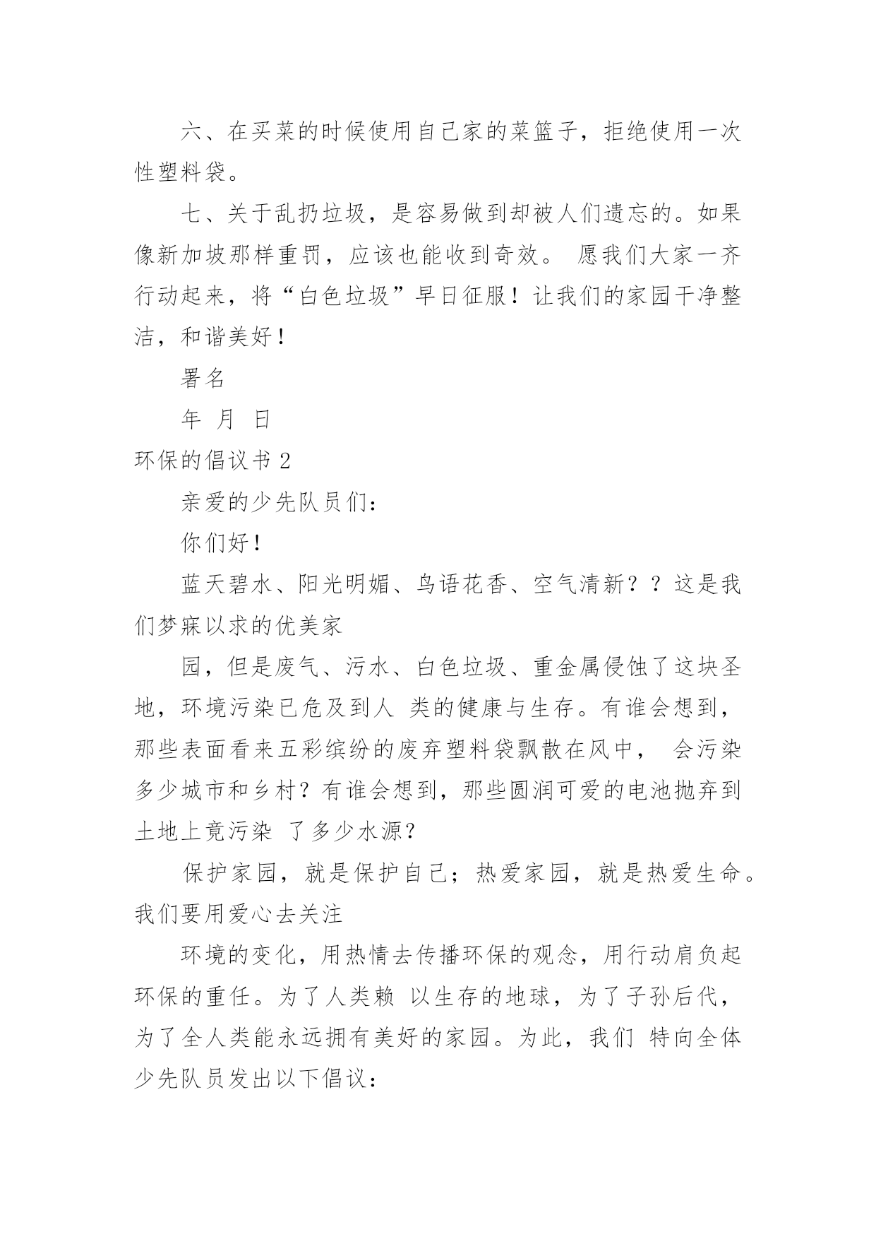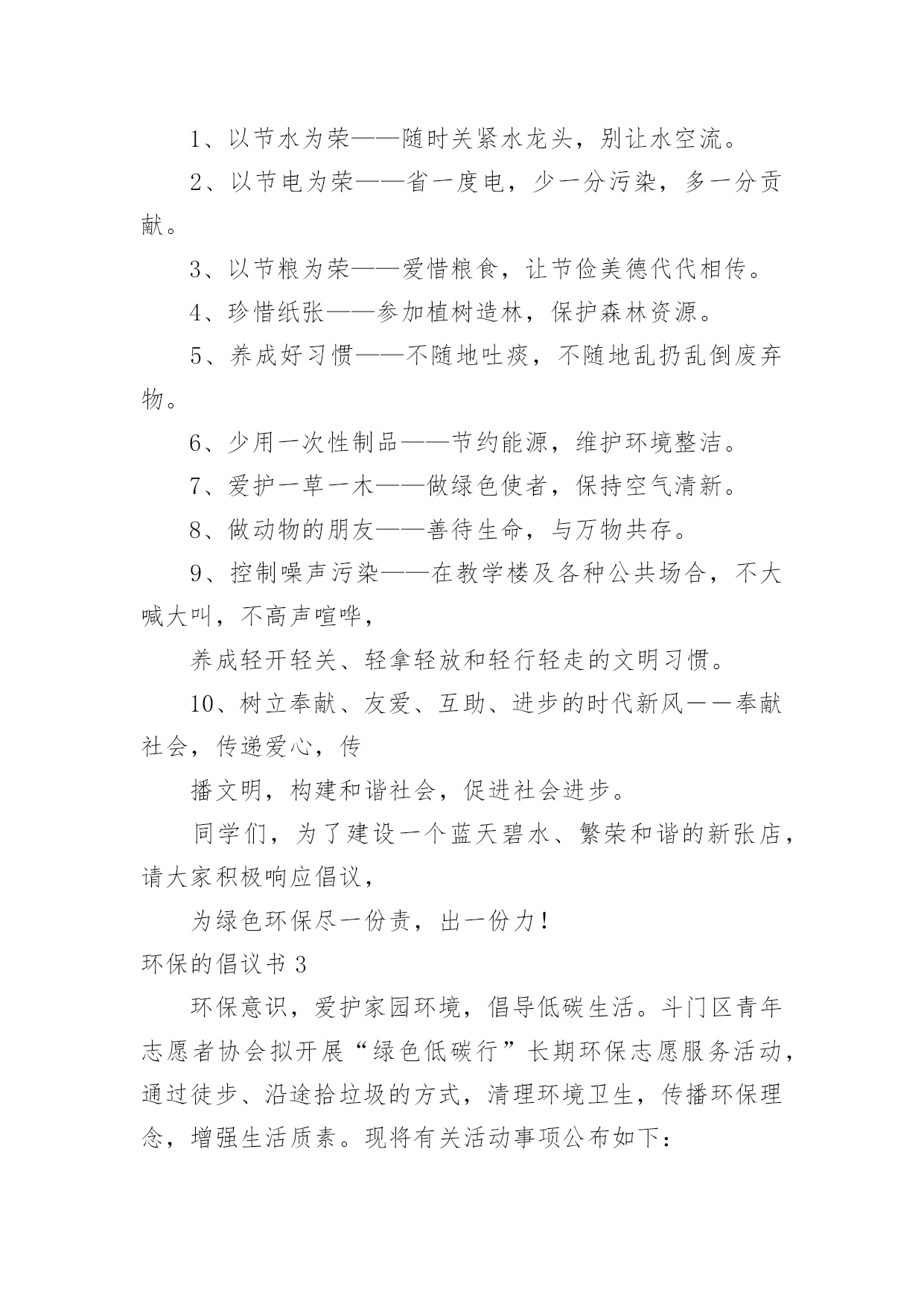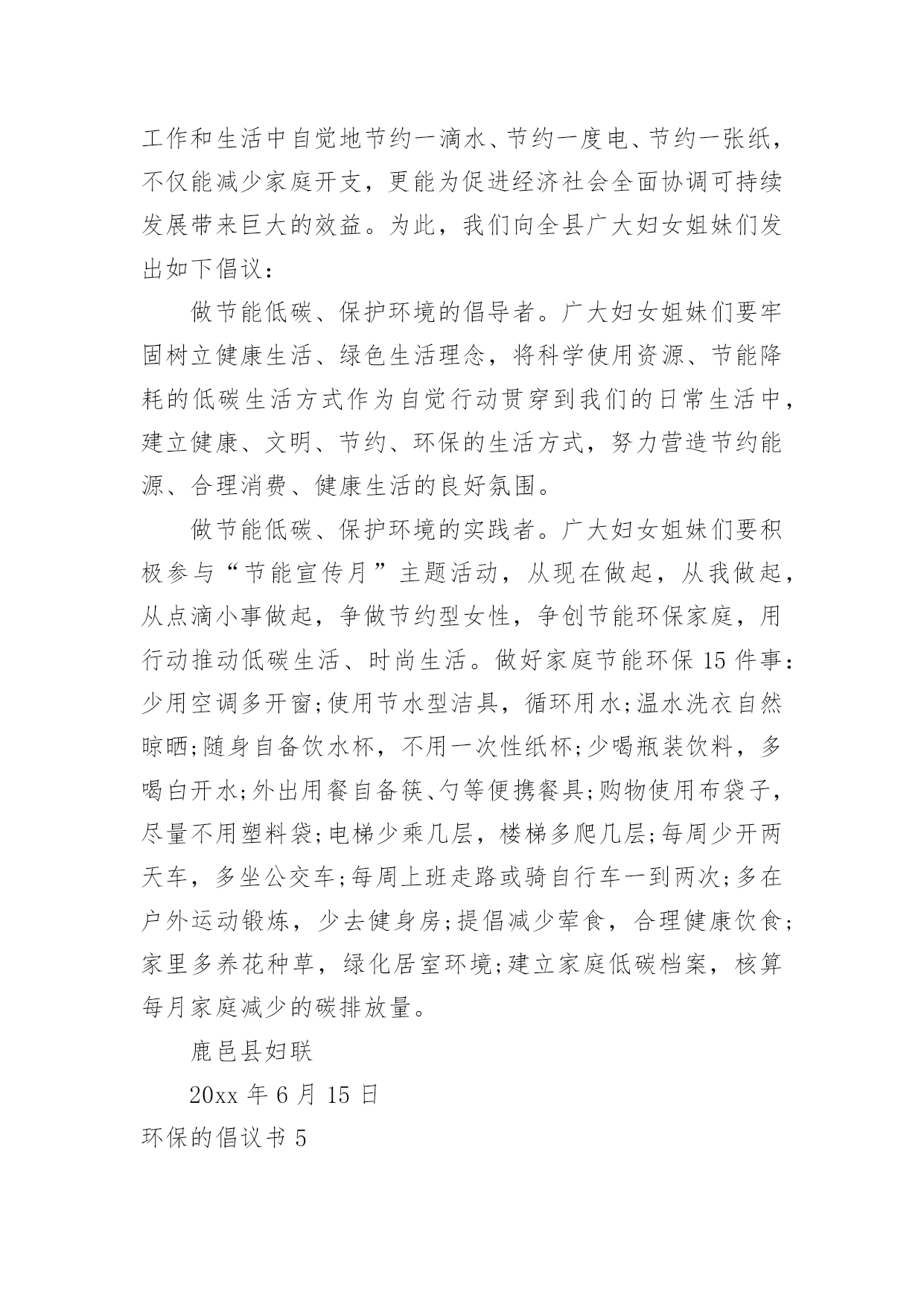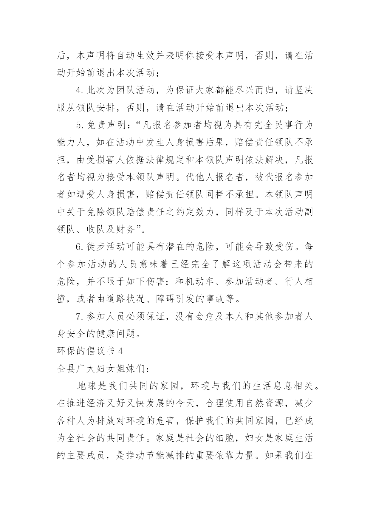 环保的倡议书环保的倡议书(通用15篇)随着社会不断地进步,倡议书的使用越来越广泛,倡议书作为一种公开提议性的专用书信,其在写作上有一定的规范。倡议书的注意事项有许多,你确定会写吗?下面是小编为大家收集的环保的倡议书,希望能够帮助到大家。环保的倡议书1全体师生:你们好我们是实验小学五年级的学生,通过前一段时间的综合实践活动我们了解到周围的“白色垃圾”正在迅速蔓延,种类增多,范围扩大,在我们生活的周围随处可见,散落的废旧塑料包装物给人们的视觉带来不良刺激,造成严重的视觉污染,而且这些废旧塑料包装物进入环境后,由于其很难分解,造成长期的生态环境破坏,且危害非常巨大,给我们的生活带来了许多麻烦,影响了环境。为此,我们提出以下建议:一.尽量减少使用带塑料制品的物品。二.使用时不可随意丢弃。三.平时随见随捡,放于指定地点。四.建立自己的收集袋。五.提出自己的合理处理建议。六、在买菜的时候使用自己家的菜篮子,拒绝使用一次性塑料袋。七、关于乱扔垃圾,是容易做到却被人们遗忘的。如果像新加坡那样重罚,应该也能收到奇效。愿我们大家一齐行动起来,将“白色垃圾”早日征服!让我们的家园干净整洁,和谐美好!署名年月日环保的倡议书2亲爱的少先队员们:你们好!蓝天碧水、阳光明媚、鸟语花香、空气清新??这是我们梦寐以求的优美家园,但是废气、污水、白色垃圾、重金属侵蚀了这块圣地,环境污染已危及到人类的健康与生存。有谁会想到,那些表面看来五彩缤纷的废弃塑料袋飘散在风中,会污染多少城市和乡村?有谁会想到,那些圆润可爱的电池抛弃到土地上竟污染了多少水源?保护家园,就是保护自己;热爱家园,就是热爱生命。我们要用爱心去关注环境的变化,用热情去传播环保的观念,用行动肩负起环保的重任。为了人类赖以生存的地球,为了子孙后代,为了全人类能永远拥有美好的家园。为此,我们特向全体少先队员发出以下倡议:1、以节水为荣——随时关紧水龙头,别让水空流。2、以节电为荣——省一度电,少一分污染,多一分贡献。3、以节粮为荣——爱惜粮食,让节俭美德代代相传。4、珍惜纸张——参加植树造林,保护森林资源。5、养成好习惯——不随地吐痰,不随地乱扔乱倒废弃物。6、少用一次性制品——节约能源,维护环境整洁。7、爱护一草一木——做绿色使者,保持空气清新。8、做动物的朋友——善待生命,与万物共存。9、控制噪声污染——在教学楼及各种公共场合,不大喊大叫,不高声喧哗,养成轻开轻关、轻拿轻放和轻行轻走的文明习惯。10、树立奉献、友爱、互助、进步的时代新风――奉献社会,传递爱心,传播文明,构建和谐社会,促进社会进步。同学们,为了建设一个蓝天碧水、繁荣和谐的新张店,请大家积极响应倡议,为绿色环保尽一份责,出一份力!环保的倡议书3环保意识,爱护家园环境,倡导低碳生活。斗门区青年志愿者协会拟开展“绿色低碳行”长期环保志愿服务活动,通过徒步、沿途拾垃圾的方式,清理环境卫生,传播环保理念,增强生活质素。现将有关活动事项公布如下:1.活动时间:20xx年03月05日上午9:30至14:302.集合地点:井岸金鸿酒店门口(即原来新鸿酒店)3.对象及人数:会员(18岁以上),30人4.活动领队:赵豪华(小兵)电话:13825653246副领队:赵超明(阳光)电话:13823041161副领队:黄冬兰(真水)电话:138256923835.报名方式:请发短信“姓名+电话+身份证号码”至赵豪华手机报名截止时间:20xx年03月04日下午20:00止行程安排:9:15分在金鸿酒店门口集中,签到,9:30准时乘公交出发,过期不候。到御温泉下车,约10点。我们的徒步活动从绿道4号线的驿站开始,以金台寺为目标。()沿着绿道,一边欣赏沿途旖旎的风光,一边进行环保活动。为了配合本次的环保活动,请各位伙伴自备胶手套、米袋,作为环保的工具。从驿站至金台寺约5.5公里,估计11:30到达金台寺的山门。山门前有一块空地,我们可以就地休息,进行休整。利用1小时的时间,搞一些团队的拓展游戏。12:30进入回程,从山门往金台寺路口走,到达路口约2点。全程约11公里。2点我们可以到华姐饭店进行午餐,品尝具有农家特色的小菜。费用aa。饭后,再乘公交车返回井岸,解散。活动费用:保险费用3元/人(协会统一购买),午餐aa约40元,公交车费约8元;总开销约51元。活动装备:协会的太阳帽、运动装束、舒适的运动鞋、厚袜、饮用水、小量带糖的食物(用于中途补给),请注意防晒防雨;为配合环保活动,请带上环保用具;温馨提醒:1.参加的朋友最好带足够的水和运动饮料,早餐要吃好;2.一切行动必须听从指挥,不得擅自离队;中途离队或有情况要告知领队;3.当天如果下大雨,活动取消,小雨照常进行;4.本次活动执行预报名制度,如果报名参加活动,当天有事不能来的,请向领队请假。否则将会影响你的信誉哦