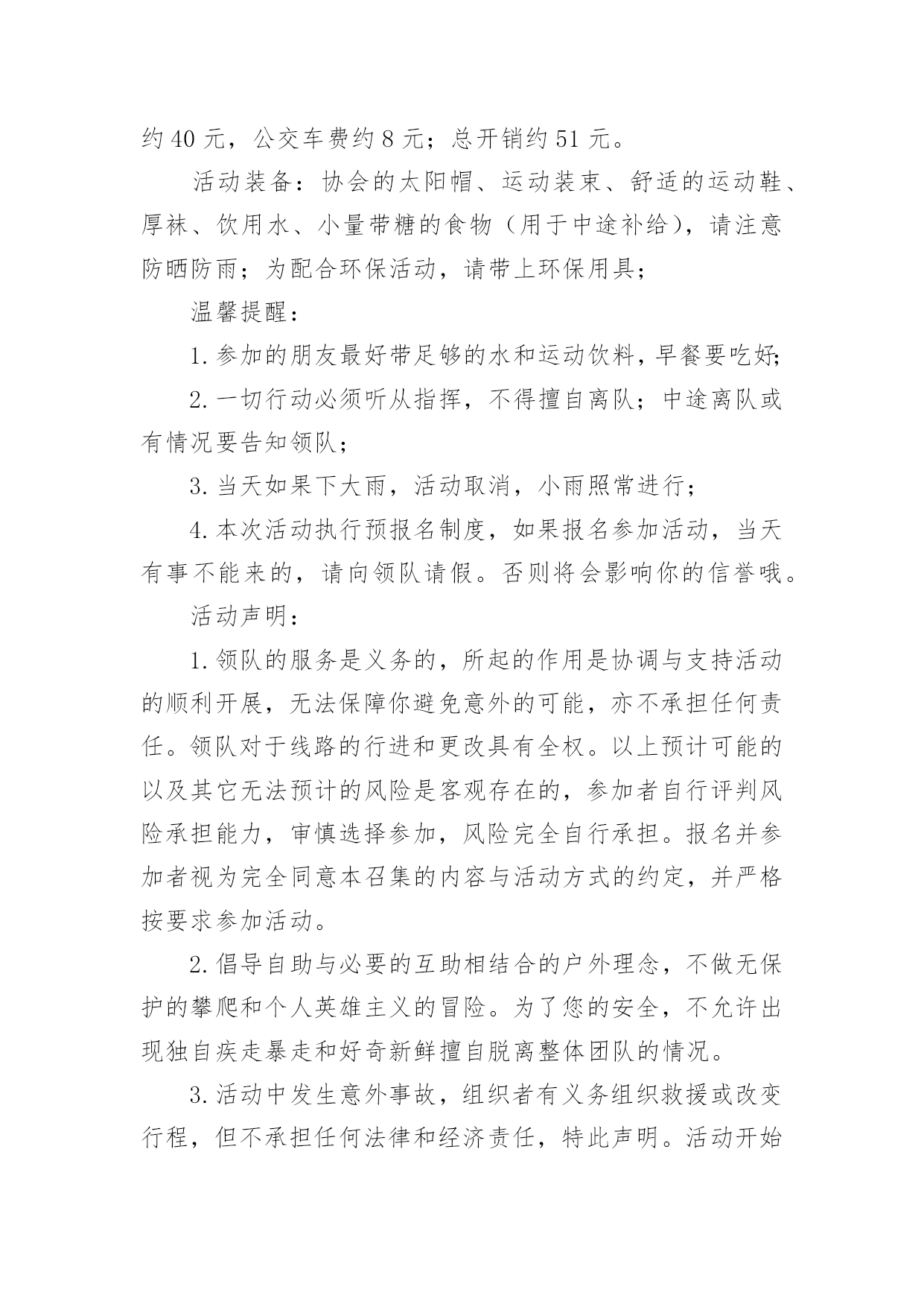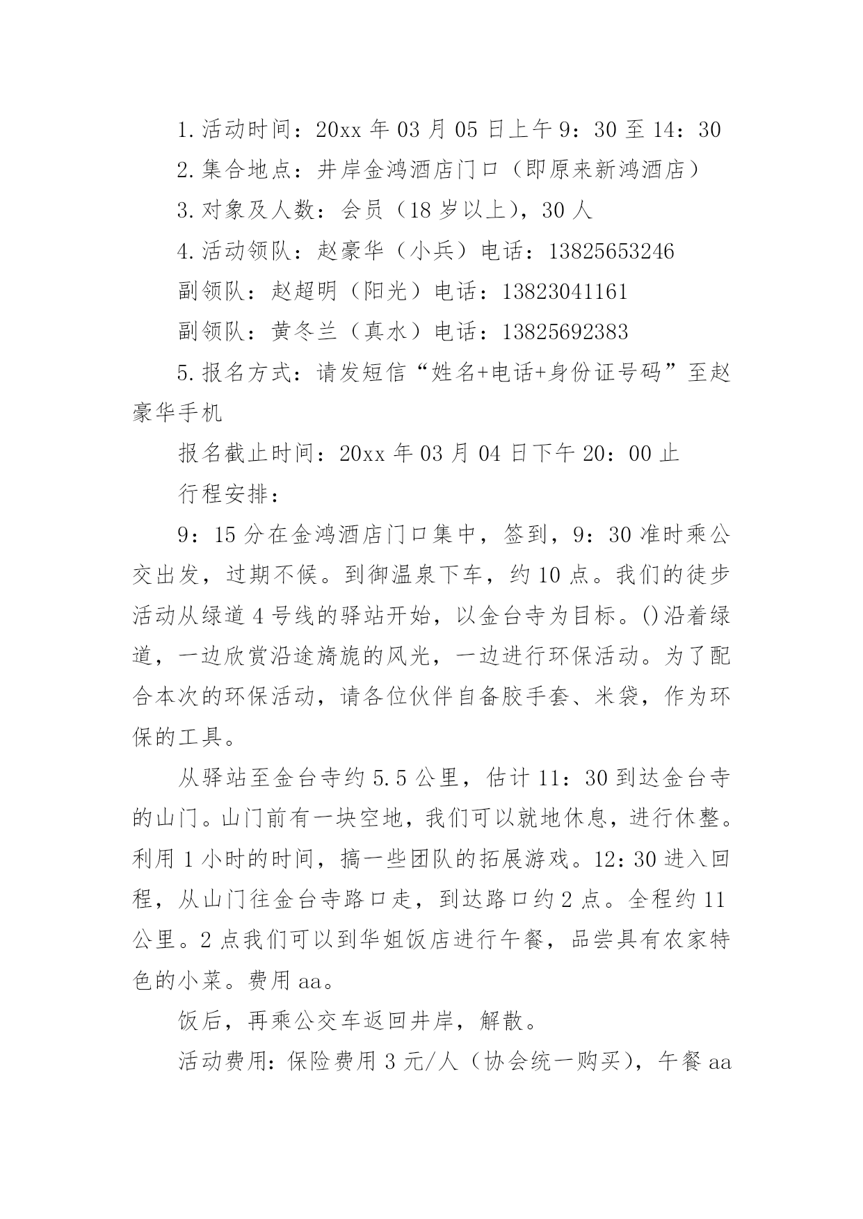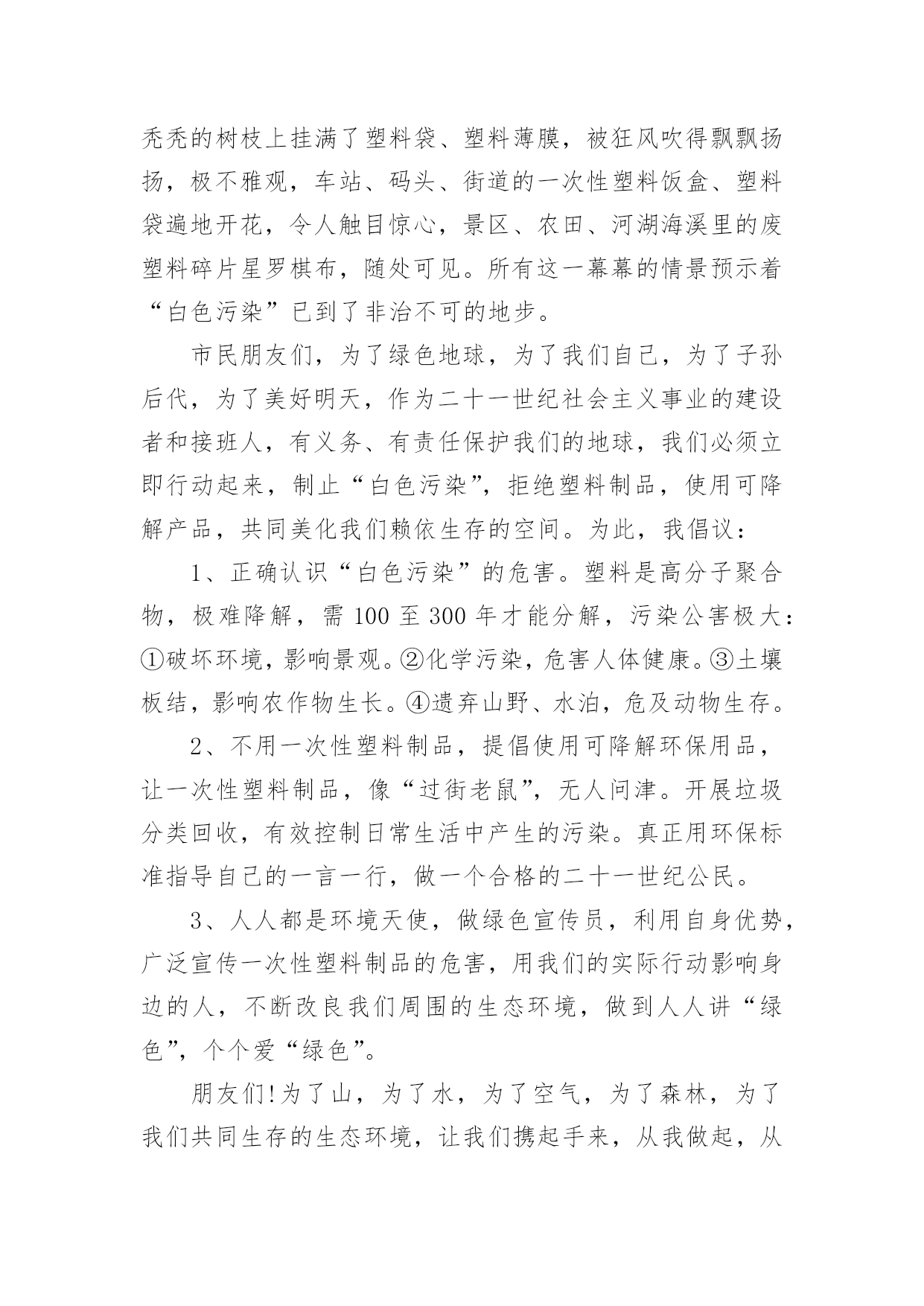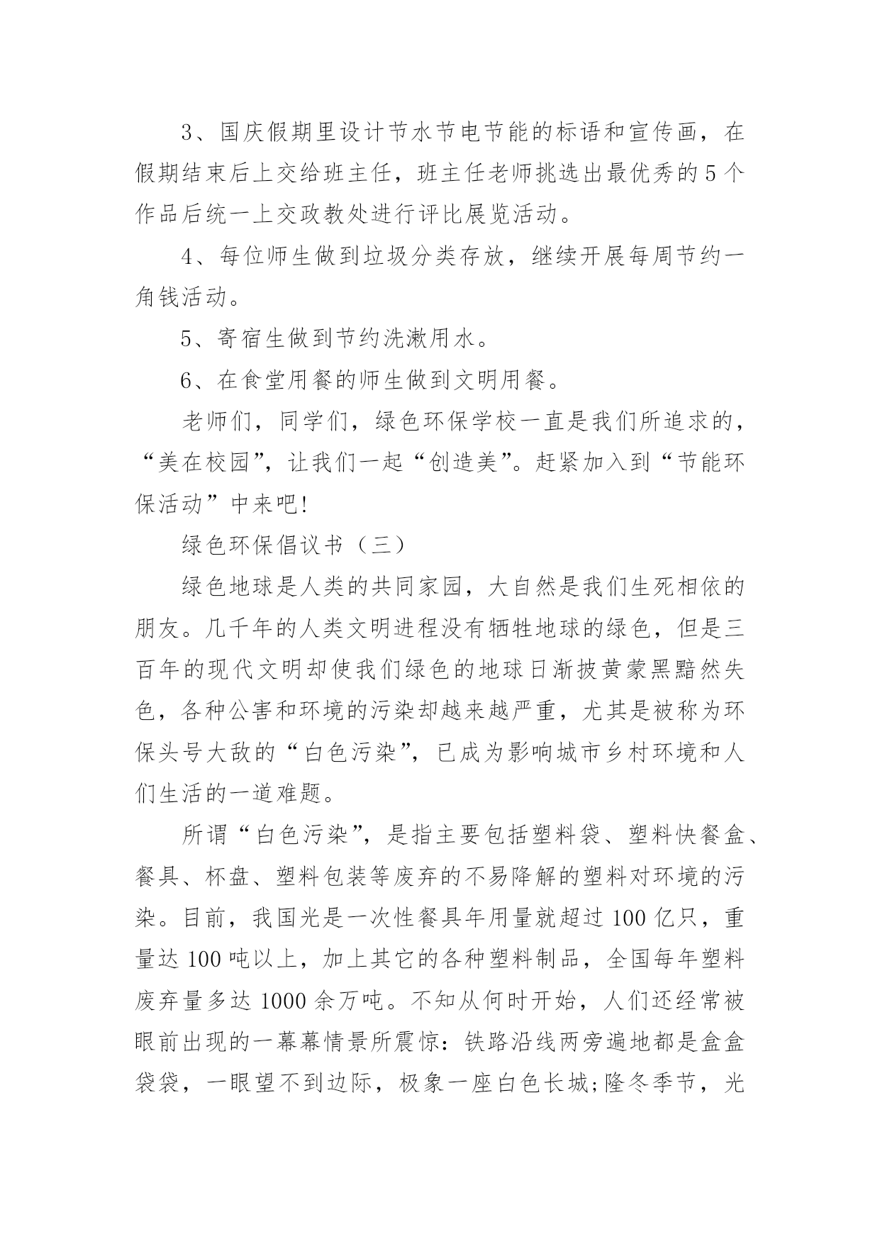 环保的倡议书环保的倡议书(通用15篇)随着社会不断地进步,倡议书的使用越来越广泛,倡议书作为一种公开提议性的专用书信,其在写作上有一定的规范。倡议书的注意事项有许多,你确定会写吗?下面是小编为大家收集的环保的倡议书,希望能够帮助到大家。环保的倡议书1全体师生:你们好我们是实验小学五年级的学生,通过前一段时间的综合实践活动我们了解到周围的“白色垃圾”正在迅速蔓延,种类增多,范围扩大,在我们生活的周围随处可见,散落的废旧塑料包装物给人们的视觉带来不良刺激,造成严重的视觉污染,而且这些废旧塑料包装物进入环境后,由于其很难分解,造成长期的生态环境破坏,且危害非常巨大,给我们的生活带来了许多麻烦,影响了环境。为此,我们提出以下建议:一.尽量减少使用带塑料制品的物品。二.使用时不可随意丢弃。三.平时随见随捡,放于指定地点。四.建立自己的收集袋。五.提出自己的合理处理建议。六、在买菜的时候使用自己家的菜篮子,拒绝使用一次性塑料袋。七、关于乱扔垃圾,是容易做到却被人们遗忘的。如果像新加坡那样重罚,应该也能收到奇效。愿我们大家一齐行动起来,将“白色垃圾”早日征服!让我们的家园干净整洁,和谐美好!署名年月日环保的倡议书2亲爱的少先队员们:你们好!蓝天碧水、阳光明媚、鸟语花香、空气清新??这是我们梦寐以求的优美家园,但是废气、污水、白色垃圾、重金属侵蚀了这块圣地,环境污染已危及到人类的健康与生存。有谁会想到,那些表面看来五彩缤纷的废弃塑料袋飘散在风中,会污染多少城市和乡村?有谁会想到,那些圆润可爱的电池抛弃到土地上竟污染了多少水源?保护家园,就是保护自己;热爱家园,就是热爱生命。我们要用爱心去关注环境的变化,用热情去传播环保的观念,用行动肩负起环保的重任。为了人类赖以生存的地球,为了子孙后代,为了全人类能永远拥有美好的家园。为此,我们特向全体少先队员发出以下倡议:1、以节水为荣——随时关紧水龙头,别让水空流。2、以节电为荣——省一度电,少一分污染,多一分贡献。3、以节粮为荣——爱惜粮食,让节俭美德代代相传。4、珍惜纸张——参加植树造林,保护森林资源。5、养成好习惯——不随地吐痰,不随地乱扔乱倒废弃物。6、少用一次性制品——节约能源,维护环境整洁。7、爱护一草一木——做绿色使者,保持空气清新。8、做动物的朋友——善待生命,与万物共存。9、控制噪声污染——在教学楼及各种公共场合,不大喊大叫,不高声喧哗,养成轻开轻关、轻拿轻放和轻行轻走的文明习惯。10、树立奉献、友爱、互助、进步的时代新风――奉献社会,传递爱心,传播文明,构建和谐社会,促进社会进步。同学们,为了建设一个蓝天碧水、繁荣和谐的新张店,请大家积极响应倡议,为绿色环保尽一份责,出一份力!环保的倡议书3环保意识,爱护家园环境,倡导低碳生活。斗门区青年志愿者协会拟开展“绿色低碳行”长期环保志愿服务活动,通过徒步、沿途拾垃圾的方式,清理环境卫生,传播环保理念,增强生活质素。现将有关活动事项公布如下:1.活动时间:20xx年03月05日上午9:30至14:302.集合地点:井岸金鸿酒店门口(即原来新鸿酒店)3.对象及人数:会员(18岁以上),30人4.活动领队:赵豪华(小兵)电话:13825653246副领队:赵超明(阳光)电话:13823041161副领队:黄冬兰(真水)电话:138256923835.报名方式:请发短信“姓名+电话+身份证号码”至赵豪华手机报名截止时间:20xx年03月04日下午20:00止行程安排:9:15分在金鸿酒店门口集中,签到,9:30准时乘公交出发,过期不候。到御温泉下车,约10点。我们的徒步活动从绿道4号线的驿站开始,以金台寺为目标。()沿着绿道,一边欣赏沿途旖旎的风光,一边进行环保活动。为了配合本次的环保活动,请各位伙伴自备胶手套、米袋,作为环保的工具。从驿站至金台寺约5.5公里,估计11:30到达金台寺的山门。山门前有一块空地,我们可以就地休息,进行休整。利用1小时的时间,搞一些团队的拓展游戏。12:30进入回程,从山门往金台寺路口走,到达路口约2点。全程约11公里。2点我们可以到华姐饭店进行午餐,品尝具有农家特色的小菜。费用aa。饭后,再乘公交车返回井岸,解散。活动费用:保险费用3元/人(协会统一购买),午餐aa约40元,公交车费约8元;总开销约51元。活动装备:协会的太阳帽、运动装束、舒适的运动鞋、厚袜、饮用水、小量带糖的食物(用于中途补给),请注意防晒防雨;为配合环保活动,请带上环保用具;温馨提醒:1.参加的朋友最好带足够的水和运动饮料,早餐要吃好;2.一切行动必须听从指挥,不得擅自离队;中途离队或有情况要告知领队;3.当天如果下大雨,活动取消,小雨照常进行;4.本次活动执行预报名制度,如果报名参加活动,当天有事不能来的,请向领队请假。否则将会影响你的信誉哦