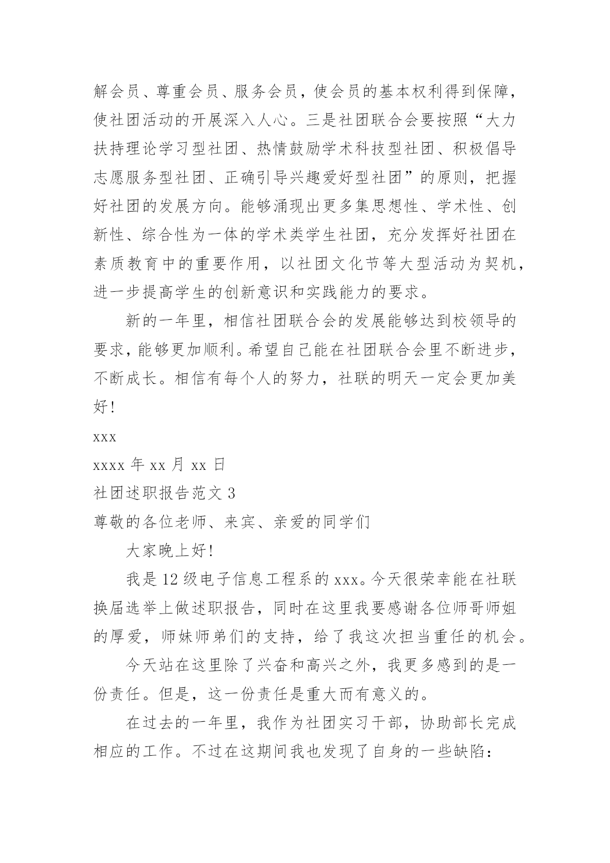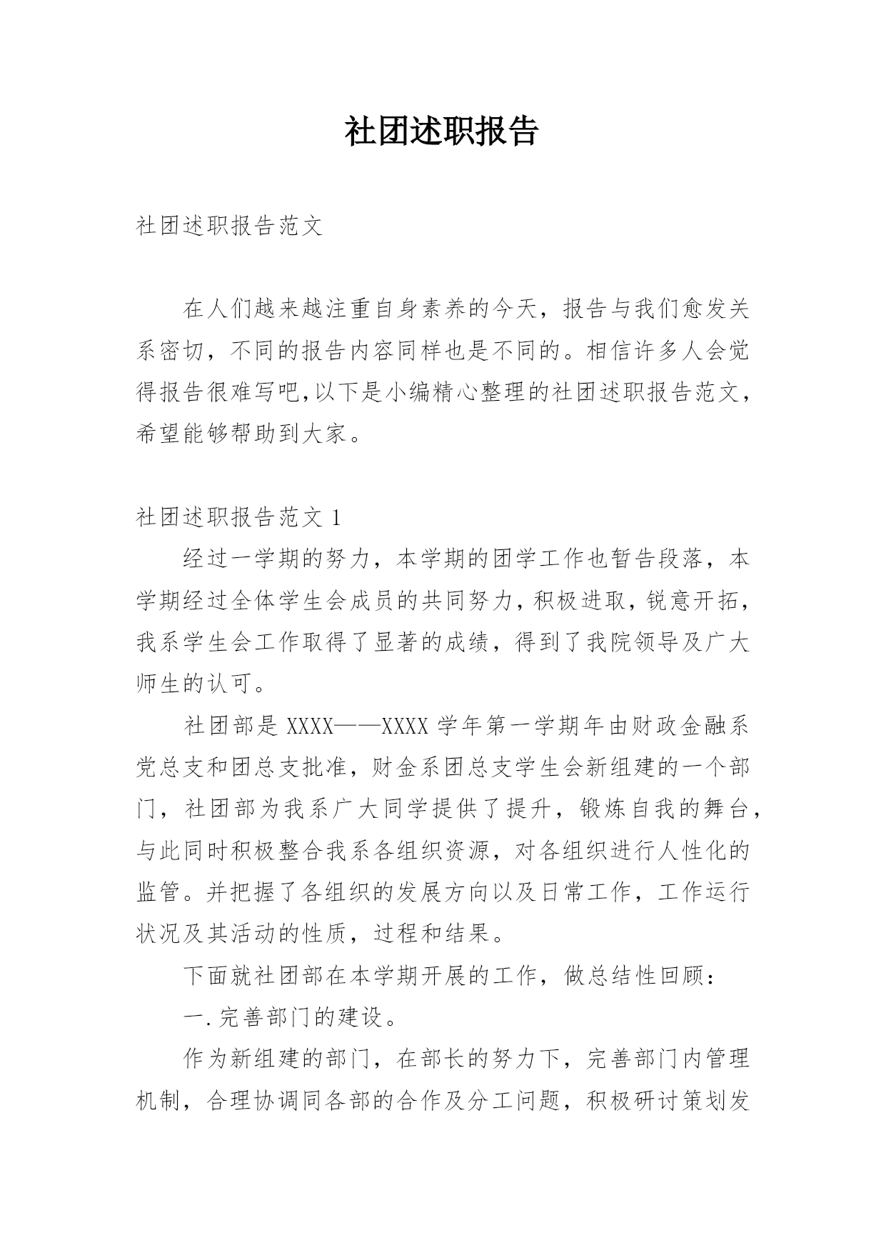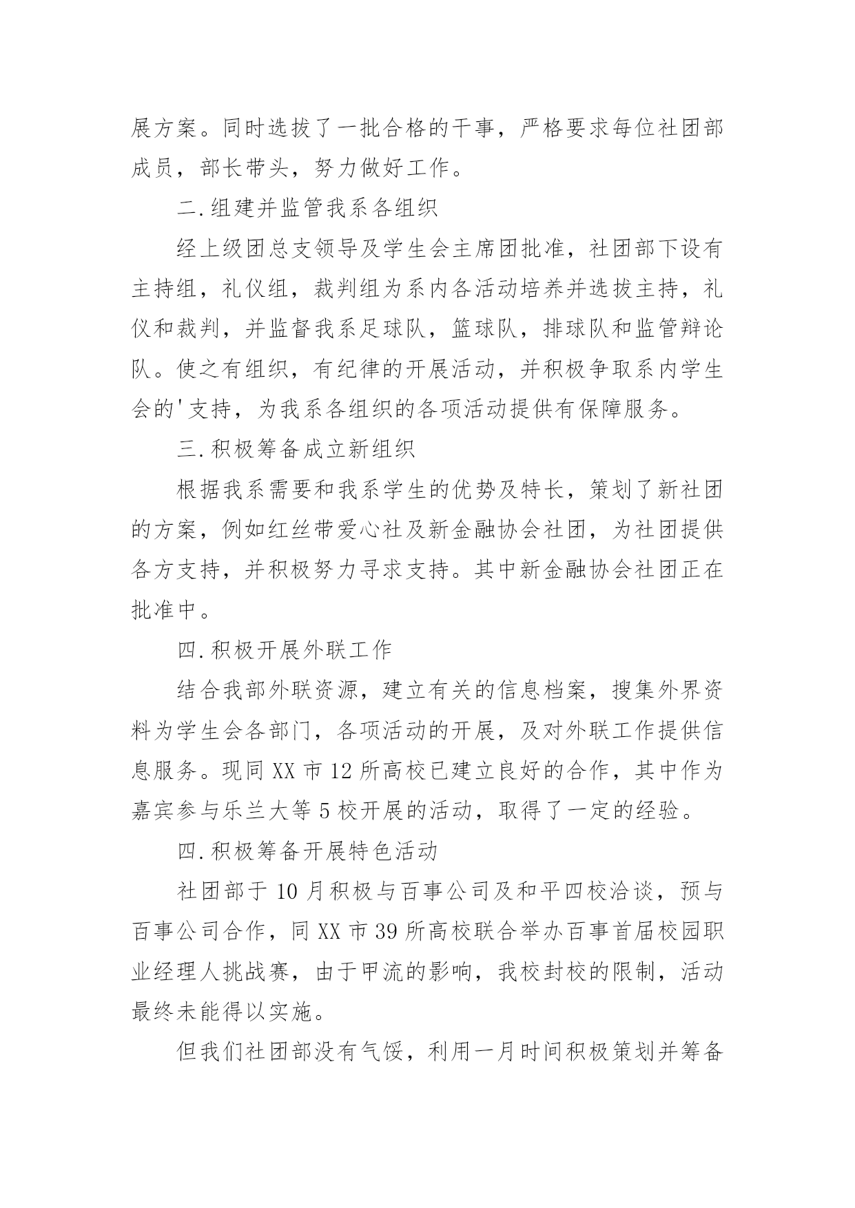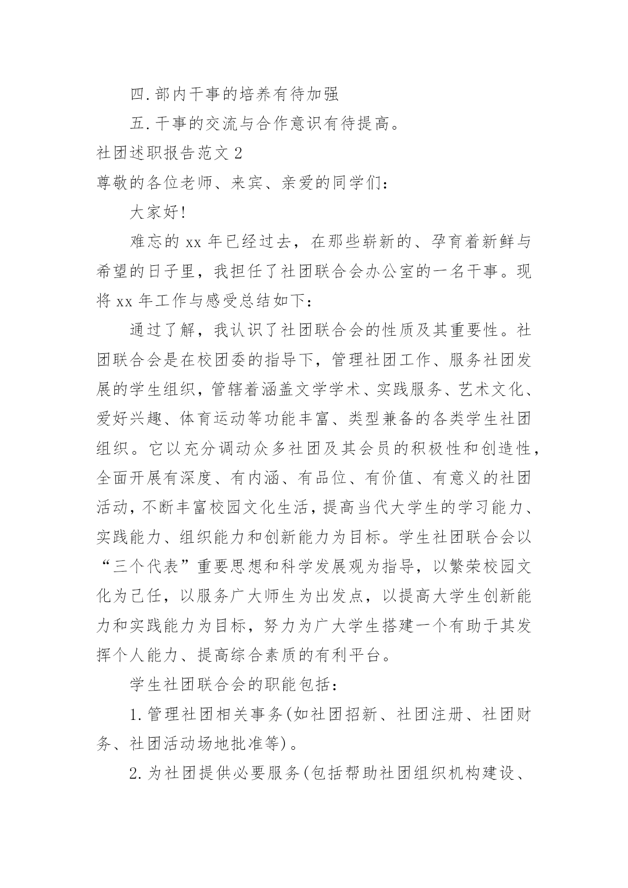 社团述职报告社团述职报告范文在人们越来越注重自身素养的今天,报告与我们愈发关系密切,不同的报告内容同样也是不同的。相信许多人会觉得报告很难写吧,以下是小编精心整理的社团述职报告范文,希望能够帮助到大家。社团述职报告范文1经过一学期的努力,本学期的团学工作也暂告段落,本学期经过全体学生会成员的共同努力,积极进取,锐意开拓,我系学生会工作取得了显著的成绩,得到了我院领导及广大师生的认可。社团部是XXXX——XXXX学年第一学期年由财政金融系党总支和团总支批准,财金系团总支学生会新组建的一个部门,社团部为我系广大同学提供了提升,锻炼自我的舞台,与此同时积极整合我系各组织资源,对各组织进行人性化的监管。并把握了各组织的发展方向以及日常工作,工作运行状况及其活动的性质,过程和结果。下面就社团部在本学期开展的工作,做总结性回顾:一.完善部门的建设。作为新组建的部门,在部长的努力下,完善部门内管理机制,合理协调同各部的合作及分工问题,积极研讨策划发展方案。同时选拔了一批合格的干事,严格要求每位社团部成员,部长带头,努力做好工作。二.组建并监管我系各组织经上级团总支领导及学生会主席团批准,社团部下设有主持组,礼仪组,裁判组为系内各活动培养并选拔主持,礼仪和裁判,并监督我系足球队,篮球队,排球队和监管辩论队。使之有组织,有纪律的开展活动,并积极争取系内学生会的'支持,为我系各组织的各项活动提供有保障服务。三.积极筹备成立新组织根据我系需要和我系学生的优势及特长,策划了新社团的方案,例如红丝带爱心社及新金融协会社团,为社团提供各方支持,并积极努力寻求支持。其中新金融协会社团正在批准中。四.积极开展外联工作结合我部外联资源,建立有关的信息档案,搜集外界资料为学生会各部门,各项活动的开展,及对外联工作提供信息服务。现同XX市12所高校已建立良好的合作,其中作为嘉宾参与乐兰大等5校开展的活动,取得了一定的经验。四.积极筹备开展特色活动社团部于10月积极与百事公司及和平四校洽谈,预与百事公司合作,同XX市39所高校联合举办百事首届校园职业经理人挑战赛,由于甲流的影响,我校封校的限制,活动最终未能得以实施。但我们社团部没有气馁,利用一月时间积极策划并筹备了预防艾滋病大型公益宣传活动,积极争取,做好了外联工作,得到了XX省红十字会,XX省卫生厅预防艾滋病委员会,XX省疾控中心,XX省高校学生预防艾滋病协作组织的大力支持,为我们活动的开展提供了很多便利。本次活动,提供防艾折页,青少年防艾知识册,农民工读本,防艾海报及扑克,红十字会预防艾滋病调查问卷,近千余物品,并提供部分资金支持及提出好的建议,而且邀请了兰州大学红丝带爱心社长期从事艾滋病宣传的志愿者来我院进行艾滋病知识宣讲及青少年同伴教育的讲座,使我财政金融系团总支学生会的本次公益活动能圆满的举办。其次,在我院系领导,院团委的各方协调下,在各个方面都予以支持使得这次活动得以顺利进行。五.立足校园文化,积极参与各项活动作为我系学生会的一部分,社团部积极配合各部,参加了各项活动及赛事。其中在迎新杯系列体育赛事中,协同各部,积极为我系学子提供服务,加油助威。同时在学院及我系活动中,例如校园歌手大赛,校纪校规知识竞赛,防艾活动,金融投资模拟交易大赛表彰大会,部分讲座,会议中等,提供主持及礼仪工作,为各项活动的开展提供了有力的保障。当然,工作中我们也存在着很多问题,例如:一.我部发展方向及开展工作任务不够明确二.工作当中分工不够明确,计划欠周密三.工作的前瞻性和灵活需要加强四.部内干事的培养有待加强五.干事的交流与合作意识有待提高。社团述职报告范文2尊敬的各位老师、来宾、亲爱的同学们:大家好!难忘的xx年已经过去,在那些崭新的、孕育着新鲜与希望的日子里,我担任了社团联合会办公室的一名干事。现将xx年工作与感受总结如下:通过了解,我认识了社团联合会的性质及其重要性。社团联合会是在校团委的指导下,管理社团工作、服务社团发展的学生组织,管辖着涵盖文学学术、实践服务、艺术文化、爱好兴趣、体育运动等功能丰富、类型兼备的各类学生社团组织。它以充分调动众多社团及其会员的积极性和创造性,全面开展有深度、有内涵、有品位、有价值、有意义的社团活动,不断丰富校园文化生活,提高当代大学生的学习能力、实践能力、组织能力和创新能力为目标。学生社团联合会以“三个代表”重要思想和科学发展观为指导,以繁荣校园文化为己任,以服务广大师生为出发点,以提高大学生创新能力和实践能力为目标,努力为广大学生搭建一个有助于其发挥个人能力、提高综合素质的有利平台。学生社团联合会的职能包括:1.管理社团相关事务(如社团招新、社团注册、社团财务、社团活动场地批准等)。2.为社团提供必要服务(包括帮助社团组织机构建设、帮助维持社团之间的联系等等)。3.建立并维护学生社团
