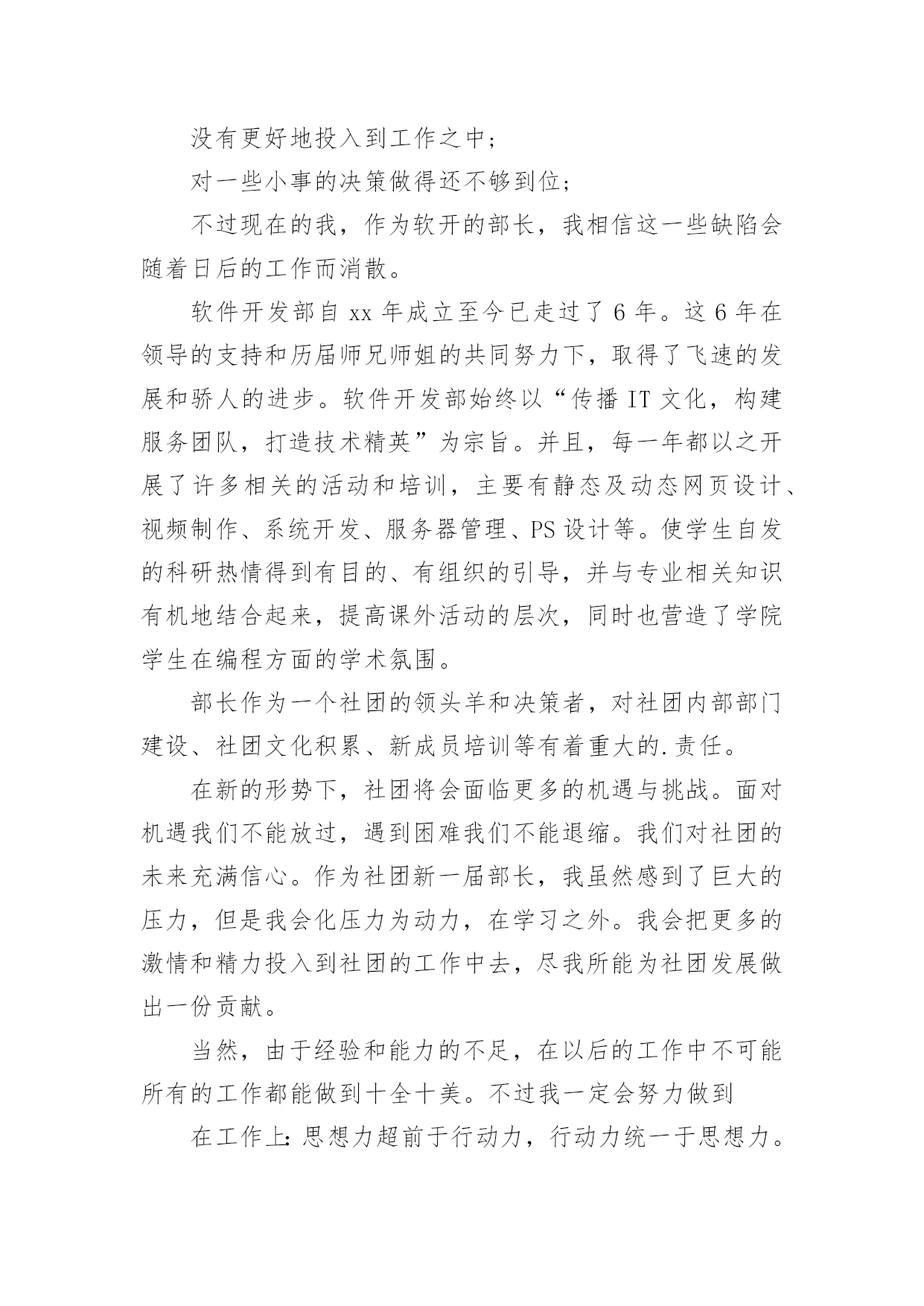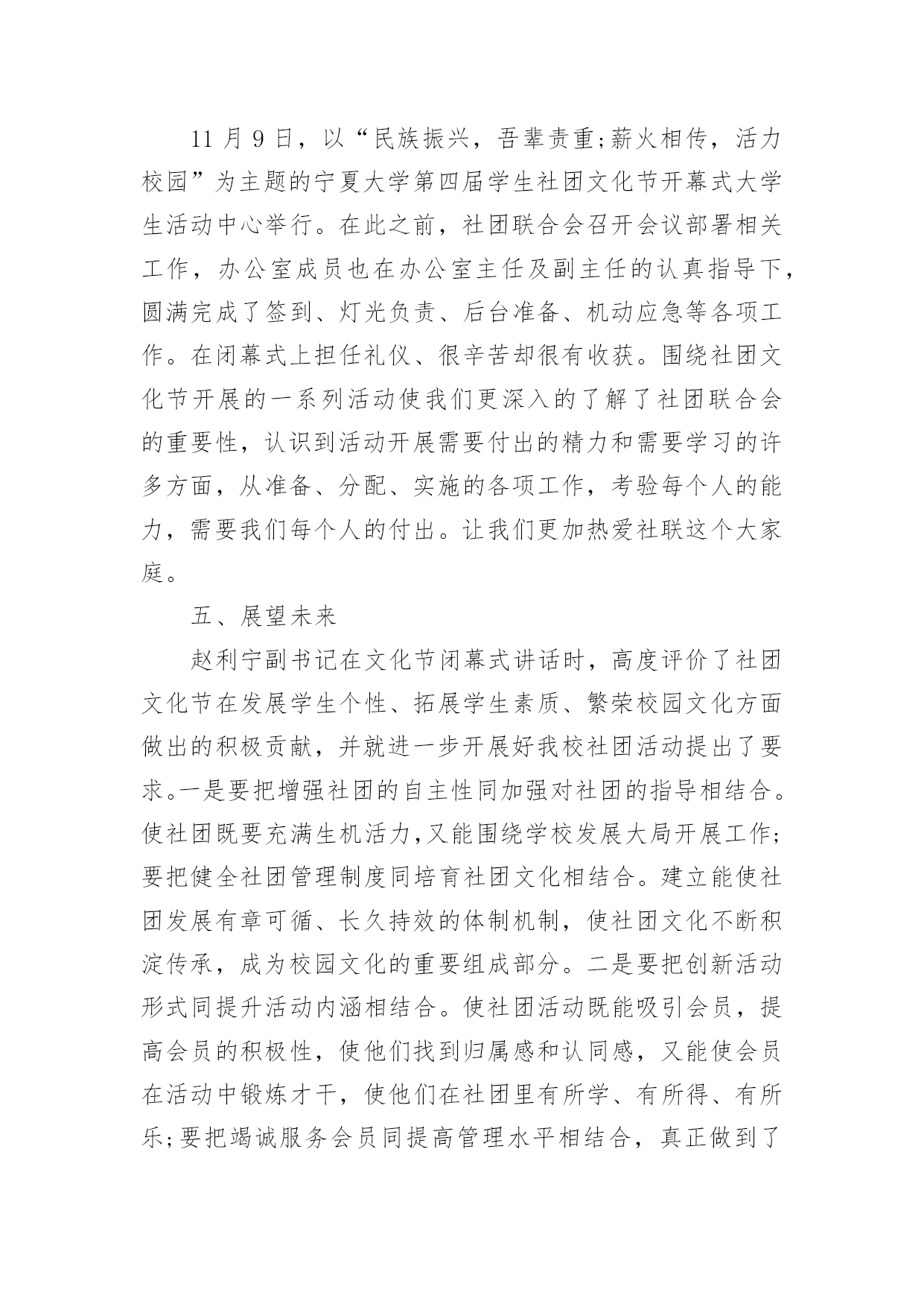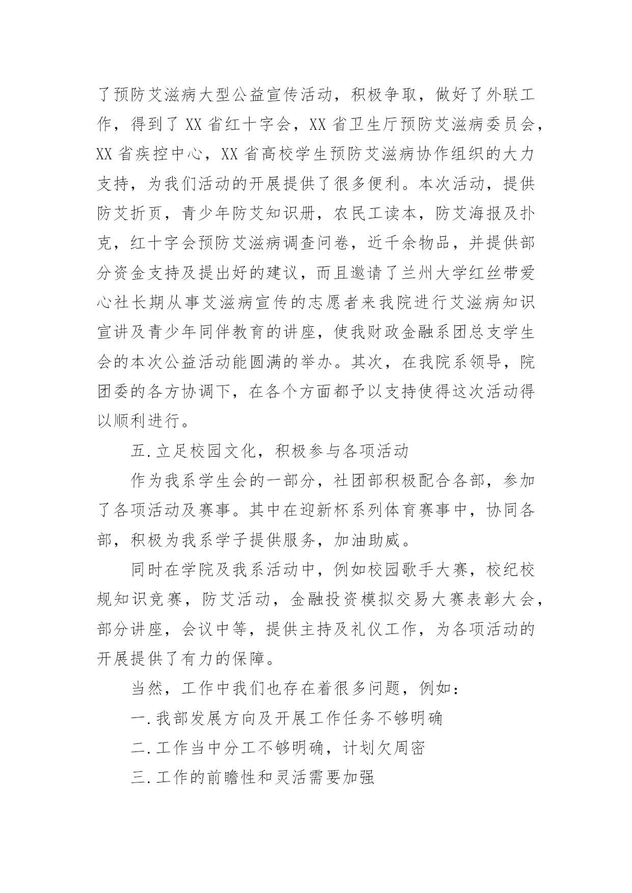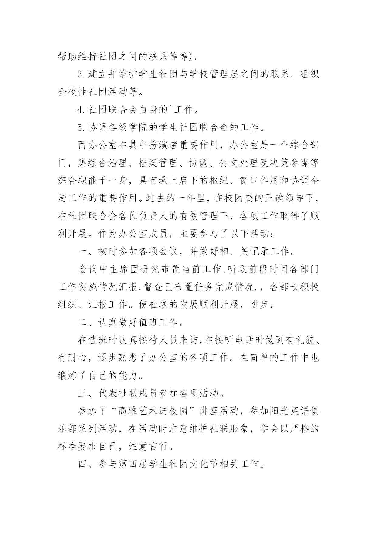 社团述职报告社团述职报告范文在人们越来越注重自身素养的今天,报告与我们愈发关系密切,不同的报告内容同样也是不同的。相信许多人会觉得报告很难写吧,以下是小编精心整理的社团述职报告范文,希望能够帮助到大家。社团述职报告范文1经过一学期的努力,本学期的团学工作也暂告段落,本学期经过全体学生会成员的共同努力,积极进取,锐意开拓,我系学生会工作取得了显著的成绩,得到了我院领导及广大师生的认可。社团部是XXXX——XXXX学年第一学期年由财政金融系党总支和团总支批准,财金系团总支学生会新组建的一个部门,社团部为我系广大同学提供了提升,锻炼自我的舞台,与此同时积极整合我系各组织资源,对各组织进行人性化的监管。并把握了各组织的发展方向以及日常工作,工作运行状况及其活动的性质,过程和结果。下面就社团部在本学期开展的工作,做总结性回顾:一.完善部门的建设。作为新组建的部门,在部长的努力下,完善部门内管理机制,合理协调同各部的合作及分工问题,积极研讨策划发展方案。同时选拔了一批合格的干事,严格要求每位社团部成员,部长带头,努力做好工作。二.组建并监管我系各组织经上级团总支领导及学生会主席团批准,社团部下设有主持组,礼仪组,裁判组为系内各活动培养并选拔主持,礼仪和裁判,并监督我系足球队,篮球队,排球队和监管辩论队。使之有组织,有纪律的开展活动,并积极争取系内学生会的'支持,为我系各组织的各项活动提供有保障服务。三.积极筹备成立新组织根据我系需要和我系学生的优势及特长,策划了新社团的方案,例如红丝带爱心社及新金融协会社团,为社团提供各方支持,并积极努力寻求支持。其中新金融协会社团正在批准中。四.积极开展外联工作结合我部外联资源,建立有关的信息档案,搜集外界资料为学生会各部门,各项活动的开展,及对外联工作提供信息服务。现同XX市12所高校已建立良好的合作,其中作为嘉宾参与乐兰大等5校开展的活动,取得了一定的经验。四.积极筹备开展特色活动社团部于10月积极与百事公司及和平四校洽谈,预与百事公司合作,同XX市39所高校联合举办百事首届校园职业经理人挑战赛,由于甲流的影响,我校封校的限制,活动最终未能得以实施。但我们社团部没有气馁,利用一月时间积极策划并筹备了预防艾滋病大型公益宣传活动,积极争取,做好了外联工作,得到了XX省红十字会,XX省卫生厅预防艾滋病委员会,XX省疾控中心,XX省高校学生预防艾滋病协作组织的大力支持,为我们活动的开展提供了很多便利。本次活动,提供防艾折页,青少年防艾知识册,农民工读本,防艾海报及扑克,红十字会预防艾滋病调查问卷,近千余物品,并提供部分资金支持及提出好的建议,而且邀请了兰州大学红丝带爱心社长期从事艾滋病宣传的志愿者来我院进行艾滋病知识宣讲及青少年同伴教育的讲座,使我财政金融系团总支学生会的本次公益活动能圆满的举办。其次,在我院系领导,院团委的各方协调下,在各个方面都予以支持使得这次活动得以顺利进行。五.立足校园文化,积极参与各项活动作为我系学生会的一部分,社团部积极配合各部,参加了各项活动及赛事。其中在迎新杯系列体育赛事中,协同各部,积极为我系学子提供服务,加油助威。同时在学院及我系活动中,例如校园歌手大赛,校纪校规知识竞赛,防艾活动,金融投资模拟交易大赛表彰大会,部分讲座,会议中等,提供主持及礼仪工作,为各项活动的开展提供了有力的保障。当然,工作中我们也存在着很多问题,例如:一.我部发展方向及开展工作任务不够明确二.工作当中分工不够明确,计划欠周密三.工作的前瞻性和灵活需要加强四.部内干事的培养有待加强五.干事的交流与合作意识有待提高。社团述职报告范文2尊敬的各位老师、来宾、亲爱的同学们:大家好!难忘的xx年已经过去,在那些崭新的、孕育着新鲜与希望的日子里,我担任了社团联合会办公室的一名干事。现将xx年工作与感受总结如下:通过了解,我认识了社团联合会的性质及其重要性。社团联合会是在校团委的指导下,管理社团工作、服务社团发展的学生组织,管辖着涵盖文学学术、实践服务、艺术文化、爱好兴趣、体育运动等功能丰富、类型兼备的各类学生社团组织。它以充分调动众多社团及其会员的积极性和创造性,全面开展有深度、有内涵、有品位、有价值、有意义的社团活动,不断丰富校园文化生活,提高当代大学生的学习能力、实践能力、组织能力和创新能力为目标。学生社团联合会以“三个代表”重要思想和科学发展观为指导,以繁荣校园文化为己任,以服务广大师生为出发点,以提高大学生创新能力和实践能力为目标,努力为广大学生搭建一个有助于其发挥个人能力、提高综合素质的有利平台。学生社团联合会的职能包括:1.管理社团相关事务(如社团招新、社团注册、社团财务、社团活动场地批准等)。2.为社团提供必要服务(包括帮助社团组织机构建设、帮助维持社团之间的联系等等)。3.建立并维护学生社团