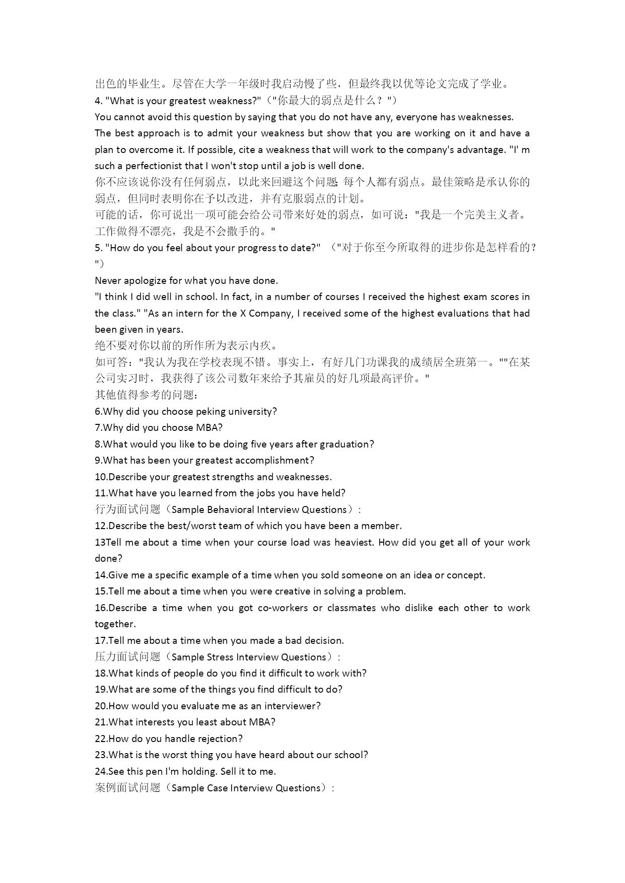 研究生复试面试中常见问题集合来源:刘斌的日志在每一年的面试中都会有很多相同的问题,这些问题看起来很平常,却有很多陷阱,一不小心就会被考官抓主小辫子了。回答这些常见的看起来很平常的问题,是很有艺术的。在这里一共提供了75个常见的各类问题,本书部分问题进行了详细的分析,其他的问题传统面试问题(SampleTraditionalInterviewQuestions)1、"Whatcanyoutellmeaboutyourself?"("关于你自己,你能告诉我些什么?")Thisisnotaninvitationtogiveyourlifehistory.Theinterviewerislookingforcluesaboutyourcharacter,qualifications,ambitions,andmotivations.这一问题如果面试没有安排自我介绍的时间的话。这是一个必问的问题。考官并不希望你大谈你的个人历史。是在寻找有关你性格、资历、志向和生活动力的线索。来判断你是否适合读MBA。Thefollowingisagoodexampleofapositiveresponse."InhighschoolIwasinvolvedincompetitivesportsandIalwaystriedtoimproveineachsportIparticipatedin.Asacollegestudent,Iworkedinaclothingstorepart-timeandfoundthatIcouldsellthingseasily.Thesalewasimportant,butforme,itwasevenmoreimportanttomakesurethatthecustomerwassatisfied.Itwasnotlongbeforecustomerscamebacktothestoreandspecificallyaskedformetohelpthem.I'mverycompetitiveanditmeansalottometobethebest."下面是一个积极正面回答的好例子:"在高中我参加各种竞争性体育活动,并一直努力提高各项运动的成绩。大学期间,我曾在一家服装店打工,我发现我能轻而易举地将东西推销出去。销售固然重要,但对我来说,更重要的是要确信顾客能够满意。不久便有顾客返回那家服装店点名让我为他们服务。我很有竞争意识,力求完美对我很重要。"2、"Whatwouldyouliketobedoingfiveyearsaftergraduation?"("在毕业以后5年内你想做些什么?")Knowwhatyoucanrealisticallyaccomplish.YoucanfindoutbytalkingtoothersMBAaboutwhattheyaccomplishedintheirfirstfiveyearswithaparticularcompanyaftergraduation."IhopetodomybestIcanbeatmyjobandbecausemanyinthislineofworkarepromotedtoareamanager,Iamplanningonthatalso."你要清楚你实际上能胜任什么。你可以事先和其他的MBA交流一番。问问他们在毕业后在公司的头5年都做了些什么。可以这样回答:"我希望能在我的职位上尽力做好工作,由于在同一领域工作的许多人都被提为区域负责人,所以我亦有此打算。"3."Whatisyourgreateststrength"?"("你最突出的优点是什么?")这是很多面试考官喜欢问的一个问题。Thisisarealopportunitytotootyourownhorn.Donotbragorgettooegotistical,butlettheemployerknowthatyoubelieveinyourselfandthatyouknowyourstrengths."Ifeelthatmystrongestassetismyabilitytosticktothingstogetthemdone.IfeelarealsenseofaccomplishmentwhenIfinishajobanditturnsoutjustasI'dplanned.I'vesetsomehighgoalsformyself.Forexample,Iwanttograduatewithhighestdistinction.AndeventhoughIhadaslowstartinmyfreshmanyear,Imadeupforitbydo