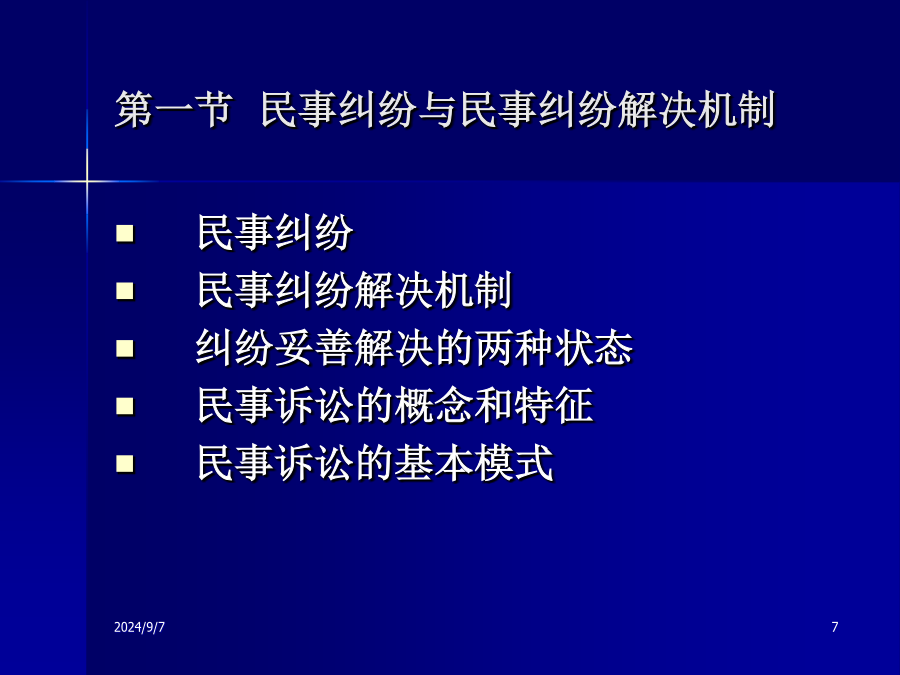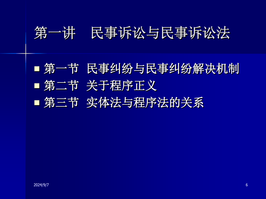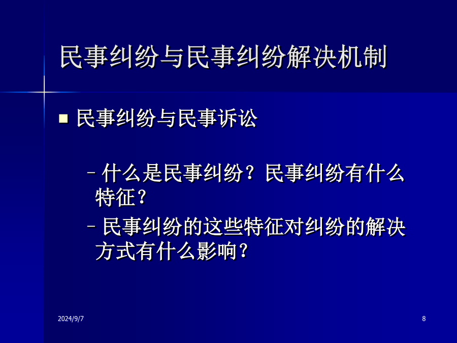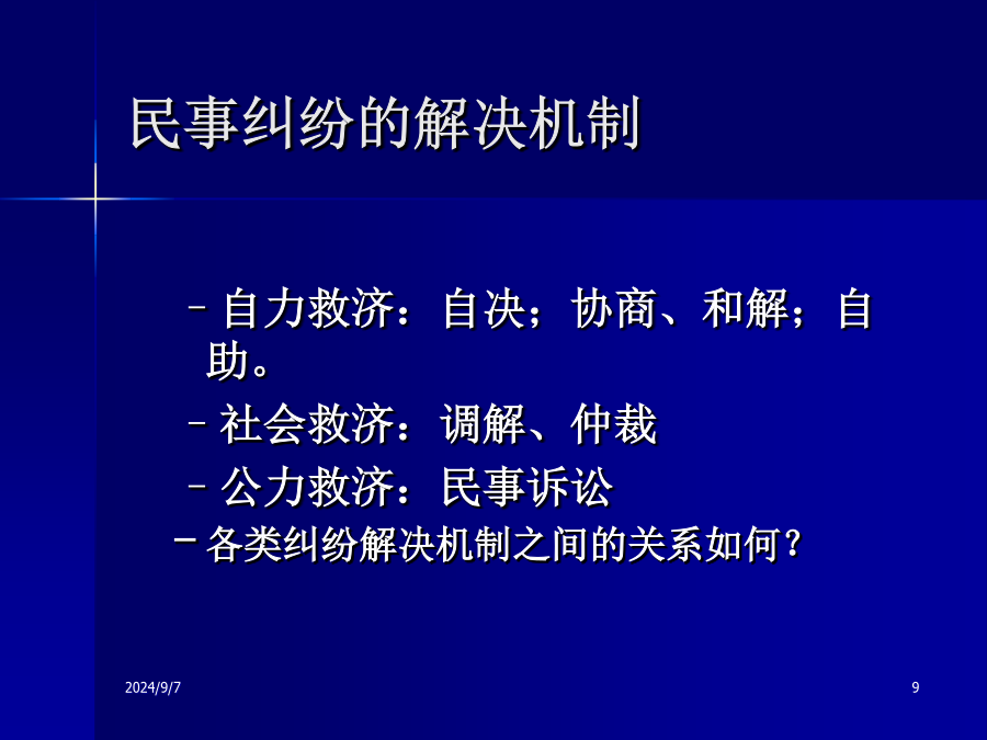 民事诉讼法讲座民事诉讼法的核心基本问题民事诉讼是否能容忍误判?北京地铁轧断腿案第一讲民事诉讼与民事诉讼法第一节民事纠纷与民事纠纷解决机制民事纠纷与民事纠纷解决机制民事纠纷的解决机制2009-07-24行政机关的调解与裁决规范和完善司法确认程序What’sADR?纠纷妥善解决的两种状态个性化解决个性化解决优点:集约化解决集约化解决民事诉讼程序正义实体法与程序法的关系