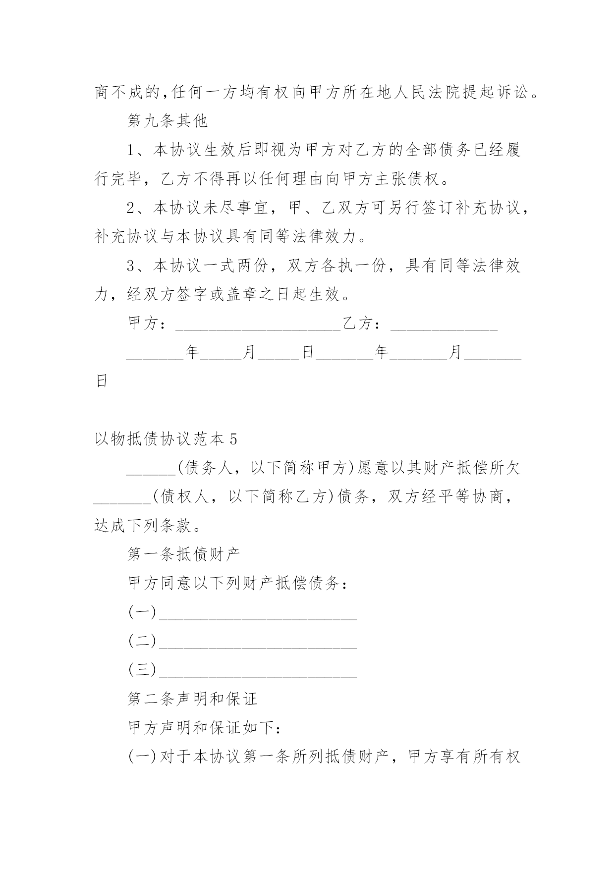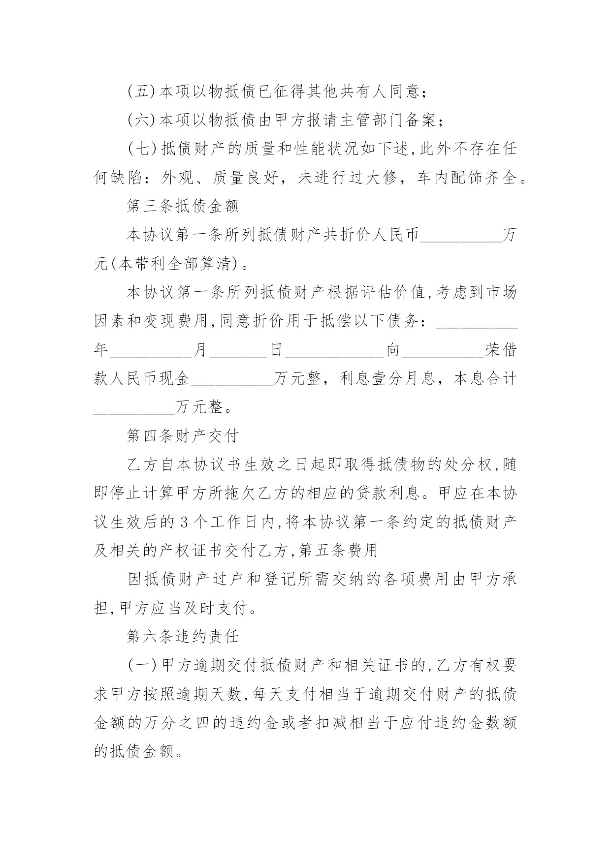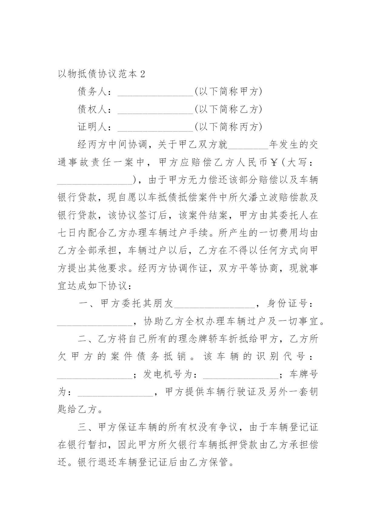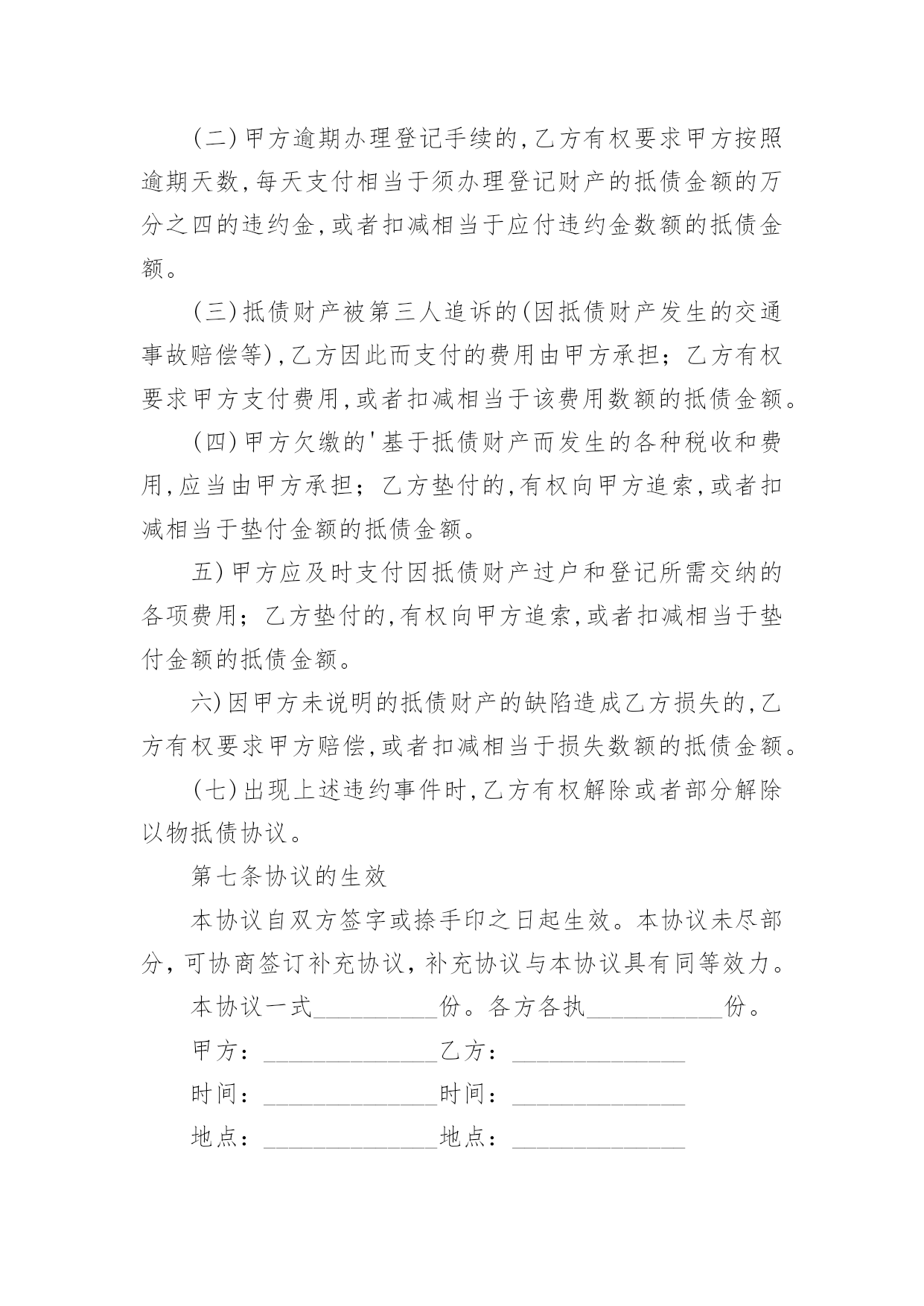 以物抵债协议以物抵债协议范本在社会发展不断提速的今天,越来越多人会去使用协议,协议对双方的事务履行起到积极作用。想必许多人都在为如何写好协议而烦恼吧,以下是小编为大家整理的以物抵债协议范本,欢迎大家分享。以物抵债协议范本1甲方:______________乙方:______________第一条抵债财产甲方同意以下列财产抵偿债务:第二条声明和保证甲方声明和保证如下:(一)对于本协议第一条所列抵债财产,甲方享有所有权或者合法的处分权;(二)在本协议第一条所列抵债财产上,没有设立任何担保物权(抵押权、质押权)或者用益物权等权利负担;(三)对于抵债财产的上述产权归属和权利负担问题,甲方目前没有卷入任何诉讼,也没有任何第三人提出异议;(四)基于抵债财产发生的各项税收和费用,甲方已经缴纳完毕,不存在任何拖欠;(五)本项以物抵债已征得其他共有人同意;(六)本项以物抵债由甲方报请主管部门备案;(七)抵债财产的质量和性能状况如下述,此外不存在任何缺陷:外观、质量良好,未进行过大修,车内配饰齐全。第三条抵债金额本协议第一条所列抵债财产共折价人民币__________万元(本带利全部算清)。本协议第一条所列抵债财产根据评估价值,考虑到市场因素和变现费用,同意折价用于抵偿以下债务:__________年__________月_______日____________向__________荣借款人民币现金__________万元整,利息壹分月息,本息合计__________万元整。第四条财产交付乙方自本协议书生效之日起即取得抵债物的处分权,随即停止计算甲方所拖欠乙方的相应的贷款利息。甲应在本协议生效后的3个工作日内,将本协议第一条约定的抵债财产及相关的产权证书交付乙方,第五条费用因抵债财产过户和登记所需交纳的各项费用由甲方承担,甲方应当及时支付。第六条违约责任(一)甲方逾期交付抵债财产和相关证书的,乙方有权要求甲方按照逾期天数,每天支付相当于逾期交付财产的抵债金额的万分之四的违约金或者扣减相当于应付违约金数额的抵债金额。(二)甲方逾期办理登记手续的,乙方有权要求甲方按照逾期天数,每天支付相当于须办理登记财产的抵债金额的万分之四的违约金,或者扣减相当于应付违约金数额的抵债金额。(三)抵债财产被第三人追诉的(因抵债财产发生的交通事故赔偿等),乙方因此而支付的费用由甲方承担;乙方有权要求甲方支付费用,或者扣减相当于该费用数额的抵债金额。(四)甲方欠缴的'基于抵债财产而发生的各种税收和费用,应当由甲方承担;乙方垫付的,有权向甲方追索,或者扣减相当于垫付金额的抵债金额。五)甲方应及时支付因抵债财产过户和登记所需交纳的各项费用;乙方垫付的,有权向甲方追索,或者扣减相当于垫付金额的抵债金额。六)因甲方未说明的抵债财产的缺陷造成乙方损失的,乙方有权要求甲方赔偿,或者扣减相当于损失数额的抵债金额。(七)出现上述违约事件时,乙方有权解除或者部分解除以物抵债协议。第七条协议的生效本协议自双方签字或捺手印之日起生效。本协议未尽部分,可协商签订补充协议,补充协议与本协议具有同等效力。本协议一式__________份。各方各执___________份。甲方:______________乙方:______________时间:______________时间:______________地点:______________地点:______________以物抵债协议范本2债务人:_______________(以下简称甲方)债权人:_______________(以下简称乙方)证明人:_______________(以下简称丙方)经丙方中间协调,关于甲乙双方就________年发生的交通事故责任一案中,甲方应赔偿乙方人民币¥(大写:_______________),由于甲方无力偿还该部分赔偿以及车辆银行贷款,现自愿以车抵债抵偿案件中所欠潘立波赔偿款及银行贷款,该协议签订后,该案件结案,甲方由其委托人在七日内配合乙方办理车辆过户手续。所产生的一切费用均由乙方全部承担,车辆过户以后,乙方在不得以任何方式向甲方提出其他要求。经丙方协调作证,双方平等协商,现就事宜达成如下协议:一、甲方委托其朋友________________,身份证号:_______________,协助乙方全权办理车辆过户及一切事宜。二、乙方将自己所有的理念牌轿车折抵给甲方,乙方所欠甲方的案件债务抵销。该车辆的识别代号:_______________;发电机号为:_______________;车牌号为:_______________,甲方提供车辆行驶证及另外一套钥匙给乙方。三、甲方保证车辆的所有权没有争议,由于车辆登记证在银行暂扣,因此甲方所欠银行车辆抵押贷款由乙方承担偿还。银行退还车辆登记证后由乙方保管。四、甲