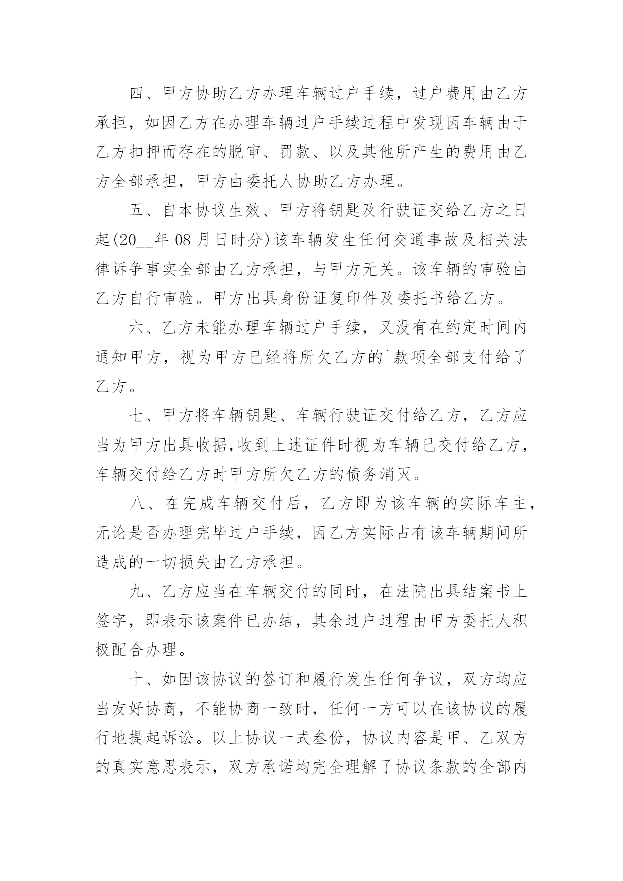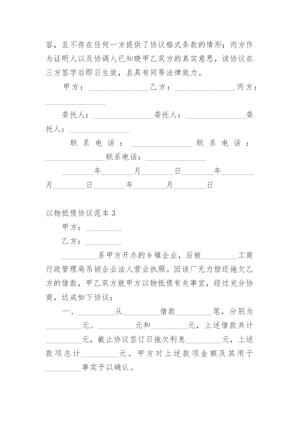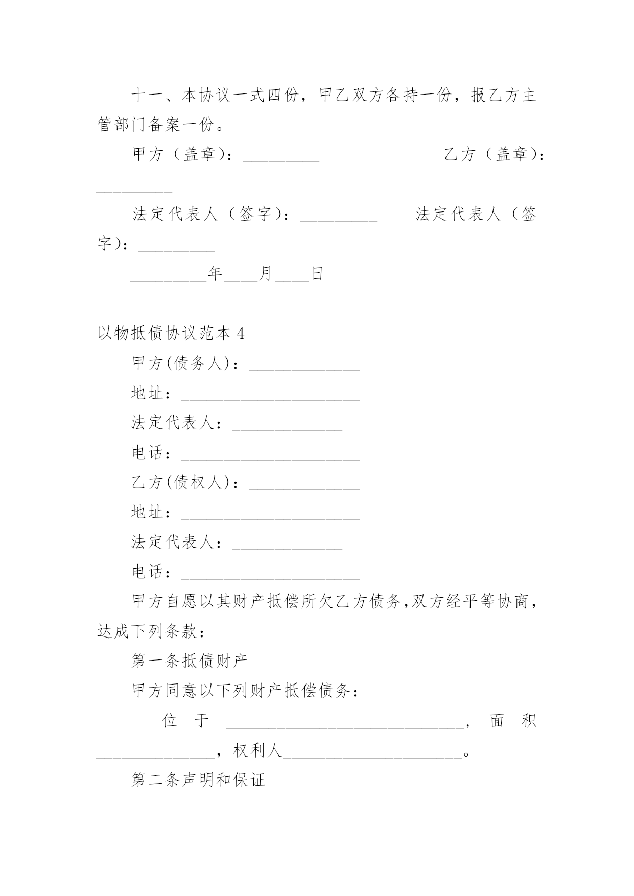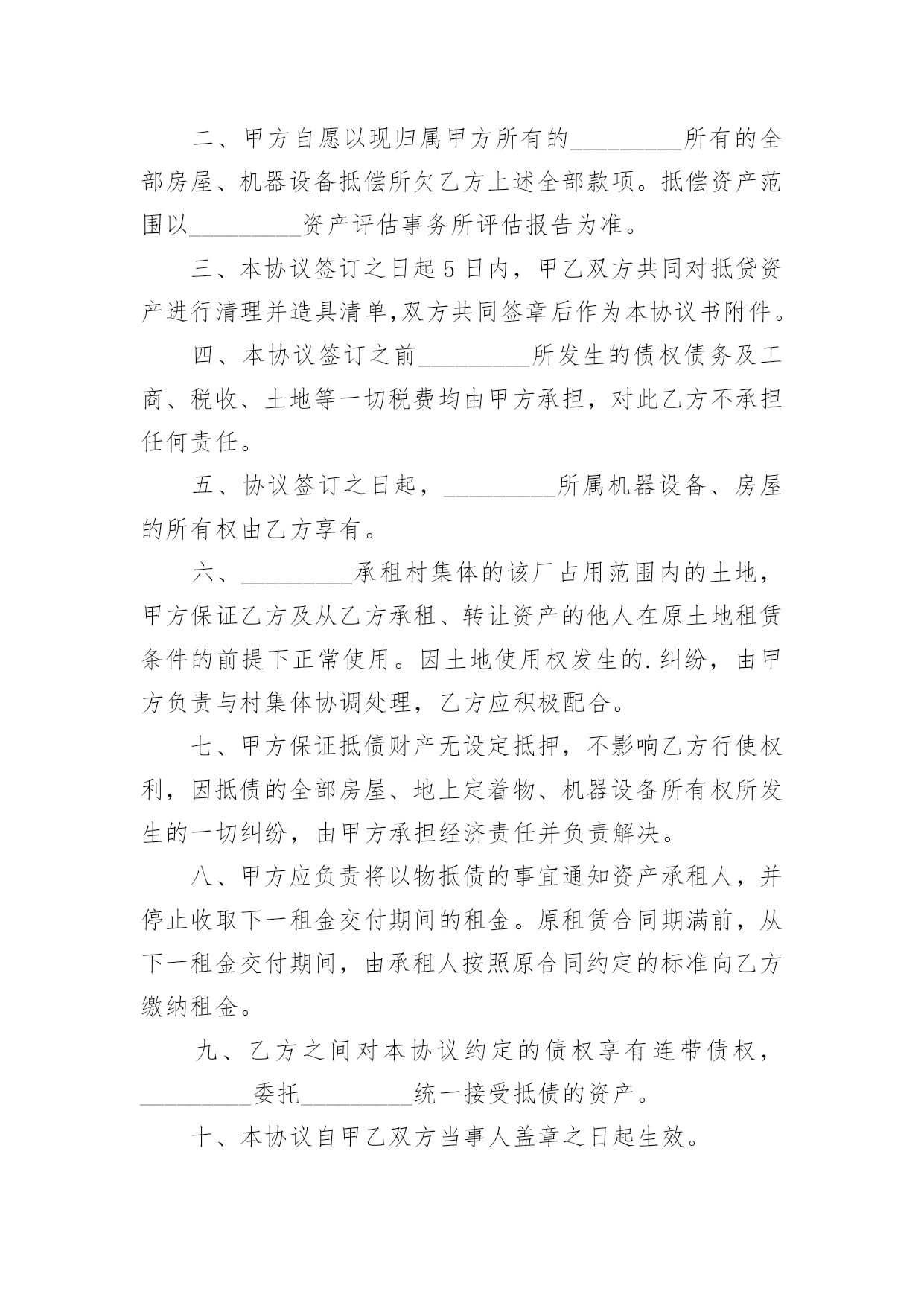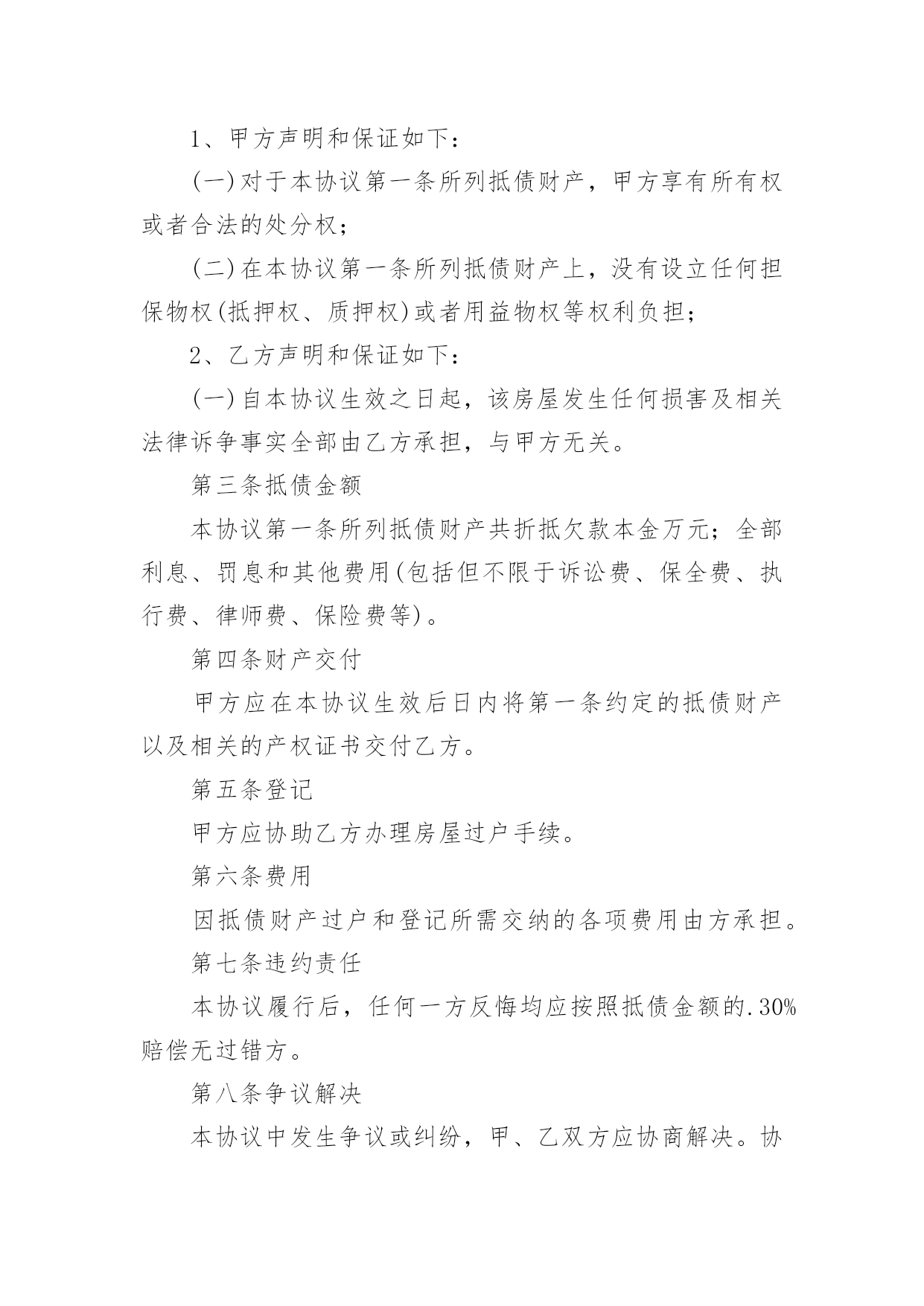 以物抵债协议以物抵债协议范本在社会发展不断提速的今天,越来越多人会去使用协议,协议对双方的事务履行起到积极作用。想必许多人都在为如何写好协议而烦恼吧,以下是小编为大家整理的以物抵债协议范本,欢迎大家分享。以物抵债协议范本1甲方:______________乙方:______________第一条抵债财产甲方同意以下列财产抵偿债务:第二条声明和保证甲方声明和保证如下:(一)对于本协议第一条所列抵债财产,甲方享有所有权或者合法的处分权;(二)在本协议第一条所列抵债财产上,没有设立任何担保物权(抵押权、质押权)或者用益物权等权利负担;(三)对于抵债财产的上述产权归属和权利负担问题,甲方目前没有卷入任何诉讼,也没有任何第三人提出异议;(四)基于抵债财产发生的各项税收和费用,甲方已经缴纳完毕,不存在任何拖欠;(五)本项以物抵债已征得其他共有人同意;(六)本项以物抵债由甲方报请主管部门备案;(七)抵债财产的质量和性能状况如下述,此外不存在任何缺陷:外观、质量良好,未进行过大修,车内配饰齐全。第三条抵债金额本协议第一条所列抵债财产共折价人民币__________万元(本带利全部算清)。本协议第一条所列抵债财产根据评估价值,考虑到市场因素和变现费用,同意折价用于抵偿以下债务:__________年__________月_______日____________向__________荣借款人民币现金__________万元整,利息壹分月息,本息合计__________万元整。第四条财产交付乙方自本协议书生效之日起即取得抵债物的处分权,随即停止计算甲方所拖欠乙方的相应的贷款利息。甲应在本协议生效后的3个工作日内,将本协议第一条约定的抵债财产及相关的产权证书交付乙方,第五条费用因抵债财产过户和登记所需交纳的各项费用由甲方承担,甲方应当及时支付。第六条违约责任(一)甲方逾期交付抵债财产和相关证书的,乙方有权要求甲方按照逾期天数,每天支付相当于逾期交付财产的抵债金额的万分之四的违约金或者扣减相当于应付违约金数额的抵债金额。(二)甲方逾期办理登记手续的,乙方有权要求甲方按照逾期天数,每天支付相当于须办理登记财产的抵债金额的万分之四的违约金,或者扣减相当于应付违约金数额的抵债金额。(三)抵债财产被第三人追诉的(因抵债财产发生的交通事故赔偿等),乙方因此而支付的费用由甲方承担;乙方有权要求甲方支付费用,或者扣减相当于该费用数额的抵债金额。(四)甲方欠缴的'基于抵债财产而发生的各种税收和费用,应当由甲方承担;乙方垫付的,有权向甲方追索,或者扣减相当于垫付金额的抵债金额。五)甲方应及时支付因抵债财产过户和登记所需交纳的各项费用;乙方垫付的,有权向甲方追索,或者扣减相当于垫付金额的抵债金额。六)因甲方未说明的抵债财产的缺陷造成乙方损失的,乙方有权要求甲方赔偿,或者扣减相当于损失数额的抵债金额。(七)出现上述违约事件时,乙方有权解除或者部分解除以物抵债协议。第七条协议的生效本协议自双方签字或捺手印之日起生效。本协议未尽部分,可协商签订补充协议,补充协议与本协议具有同等效力。本协议一式__________份。各方各执___________份。甲方:______________乙方:______________时间:______________时间:______________地点:______________地点:______________以物抵债协议范本2债务人:_______________(以下简称甲方)债权人:_______________(以下简称乙方)证明人:_______________(以下简称丙方)经丙方中间协调,关于甲乙双方就________年发生的交通事故责任一案中,甲方应赔偿乙方人民币¥(大写:_______________),由于甲方无力偿还该部分赔偿以及车辆银行贷款,现自愿以车抵债抵偿案件中所欠潘立波赔偿款及银行贷款,该协议签订后,该案件结案,甲方由其委托人在七日内配合乙方办理车辆过户手续。所产生的一切费用均由乙方全部承担,车辆过户以后,乙方在不得以任何方式向甲方提出其他要求。经丙方协调作证,双方平等协商,现就事宜达成如下协议:一、甲方委托其朋友________________,身份证号:_______________,协助乙方全权办理车辆过户及一切事宜。二、乙方将自己所有的理念牌轿车折抵给甲方,乙方所欠甲方的案件债务抵销。该车辆的识别代号:_______________;发电机号为:_______________;车牌号为:_______________,甲方提供车辆行驶证及另外一套钥匙给乙方。三、甲方保证车辆的所有权没有争议,由于车辆登记证在银行暂扣,因此甲方所欠银行车辆抵押贷款由乙方承担偿还。银行退还车辆登记证后由乙方保管。四、甲