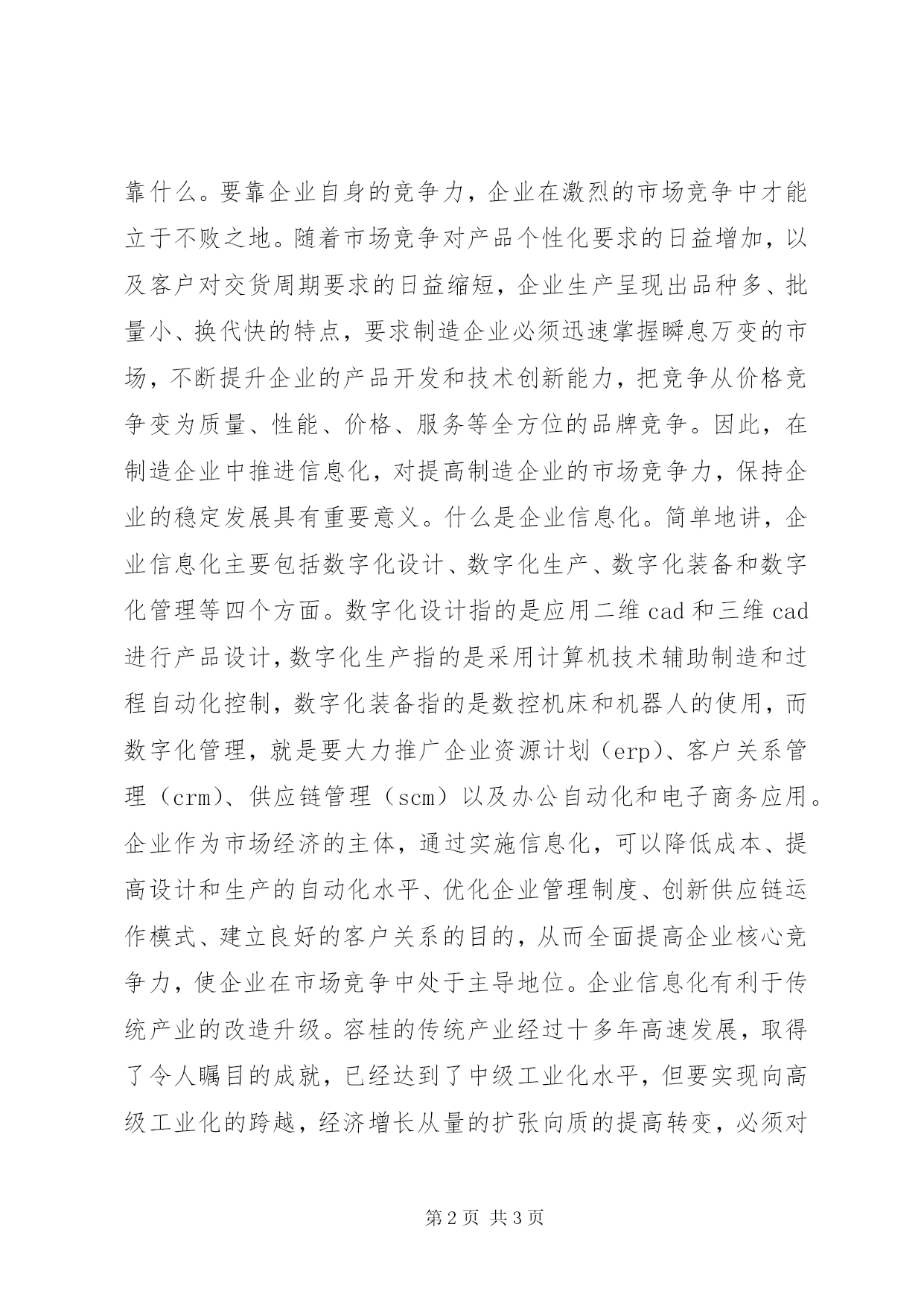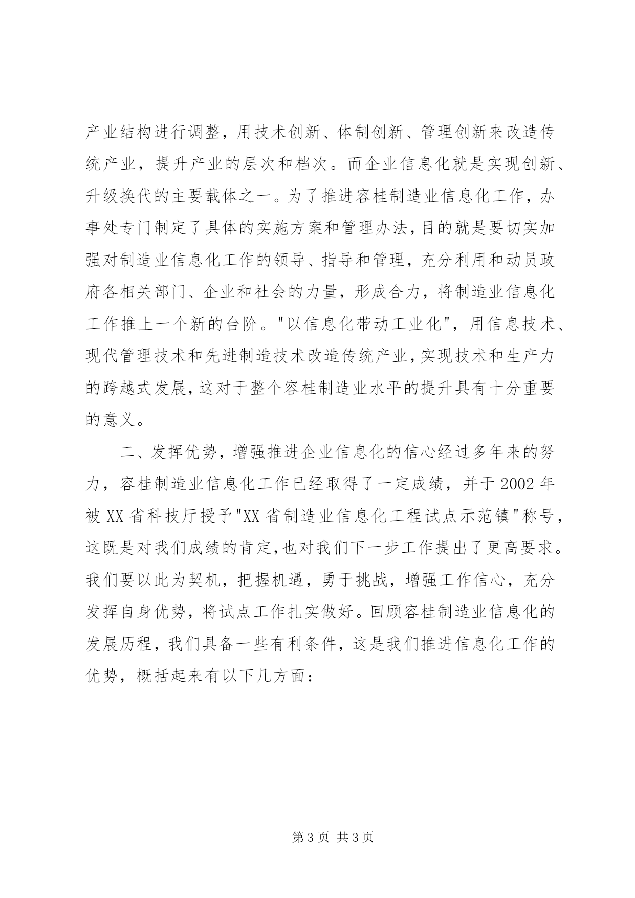 第PAGE\*Arabic\*MERGEFORMAT3页共NUMPAGES\*MERGEFORMAT3页在制造业信息化工作会议上的讲话各位领导、专家、企业代表:你们好。今天,党委、办事处在这里召开容桂制造业信息化工作会议,目的是进一步贯彻落实"XX省制造业信息化工程试点示范镇"工作,加快容桂制造业信息化发展进程。为了切实保证该项工作的开展,办事处专门制订了《容桂制造业信息化工作实施方案》。刚才,吴良艺同志还在会上重点宣读了办事处制订的容桂制造业信息化工程管理办法(试行)。这两份文件对容桂制造业信息化工作的具体实施步骤、方法和管理方面作了明确的规定,大家会后要认真加以学习和领会。根据会议安排,我代表街道办事处作一个发言,主要讲三方面:一、充分认识推进信息化的意义和作用人类社会已进入知识经济时代,信息技术在各个领域被广泛应用,并已成为促进社会经济持续发展的重要因素,信息化水平的高低也成为衡量一个国家综合国力的一个重要标志。温家宝总理在去年召开的国家信息化领导小组会议上指出:"大力推进信息化,是我国实现工业化、现代化的必然选择,是促进生产力跨越式发展、增强综合国力和国际竞争力、维护国家安全的关键环节,是覆盖现代化建设全局的战略举措",温家宝总理的讲话充分阐明了推进信息化的重要性和必要性。中国加入wto之后,企业面临的一个根本变化就是国内市场国际化。容桂的企业要与众多的国内外企业竞争,关键靠什么。要靠企业自身的竞争力,企业在激烈的市场竞争中才能立于不败之地。随着市场竞争对产品个性化要求的日益增加,以及客户对交货周期要求的日益缩短,企业生产呈现出品种多、批量小、换代快的特点,要求制造企业必须迅速掌握瞬息万变的市场,不断提升企业的产品开发和技术创新能力,把竞争从价格竞争变为质量、性能、价格、服务等全方位的品牌竞争。因此,在制造企业中推进信息化,对提高制造企业的市场竞争力,保持企业的稳定发展具有重要意义。什么是企业信息化。简单地讲,企业信息化主要包括数字化设计、数字化生产、数字化装备和数字化管理等四个方面。数字化设计指的是应用二维cad和三维cad进行产品设计,数字化生产指的是采用计算机技术辅助制造和过程自动化控制,数字化装备指的是数控机床和机器人的使用,而数字化管理,就是要大力推广企业资源计划(erp)、客户关系管理(crm)、供应链管理(scm)以及办公自动化和电子商务应用。企业作为市场经济的主体,通过实施信息化,可以降低成本、提高设计和生产的自动化水平、优化企业管理制度、创新供应链运作模式、建立良好的客户关系的目的,从而全面提高企业核心竞争力,使企业在市场竞争中处于主导地位。企业信息化有利于传统产业的改造升级。容桂的传统产业经过十多年高速发展,取得了令人瞩目的成就,已经达到了中级工业化水平,但要实现向高级工业化的跨越,经济增长从量的扩张向质的提高转变,必须对产业结构进行调整,用技术创新、体制创新、管理创新来改造传统产业,提升产业的层次和档次。而企业信息化就是实现创新、升级换代的主要载体之一。为了推进容桂制造业信息化工作,办事处专门制定了具体的实施方案和管理办法,目的就是要切实加强对制造业信息化工作的领导、指导和管理,充分利用和动员政府各相关部门、企业和社会的力量,形成合力,将制造业信息化工作推上一个新的台阶。"以信息化带动工业化",用信息技术、现代管理技术和先进制造技术改造传统产业,实现技术和生产力的跨越式发展,这对于整个容桂制造业水平的提升具有十分重要的意义。二、发挥优势,增强推进企业信息化的信心经过多年来的努力,容桂制造业信息化工作已经取得了一定成绩,并于2002年被XX省科技厅授予"XX省制造业信息化工程试点示范镇"称号,这既是对我们成绩的肯定,也对我们下一步工作提出了更高要求。我们要以此为契机,把握机遇,勇于挑战,增强工作信心,充分发挥自身优势,将试点工作扎实做好。回顾容桂制造业信息化的发展历程,我们具备一些有利条件,这是我们推进信息化工作的优势,概括起来有以下几方面: