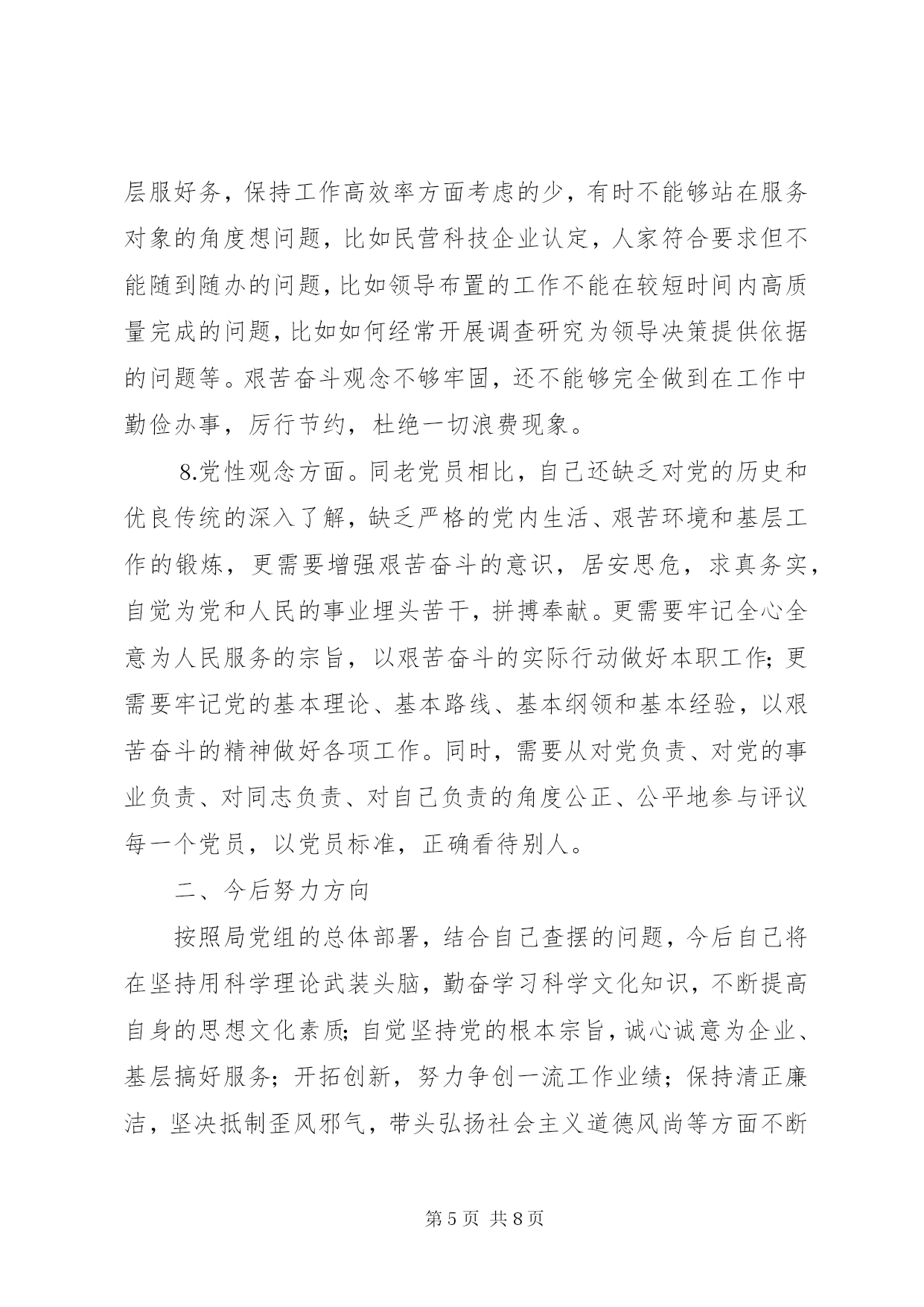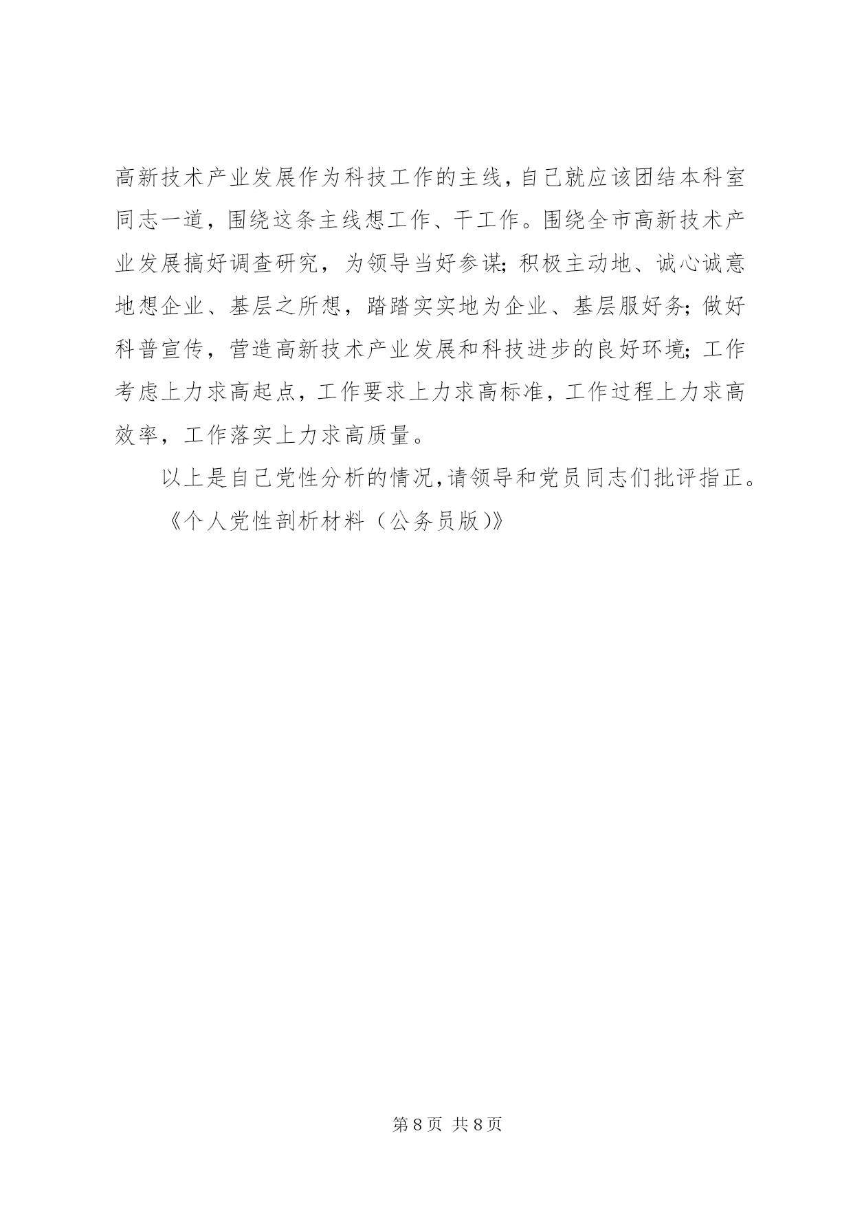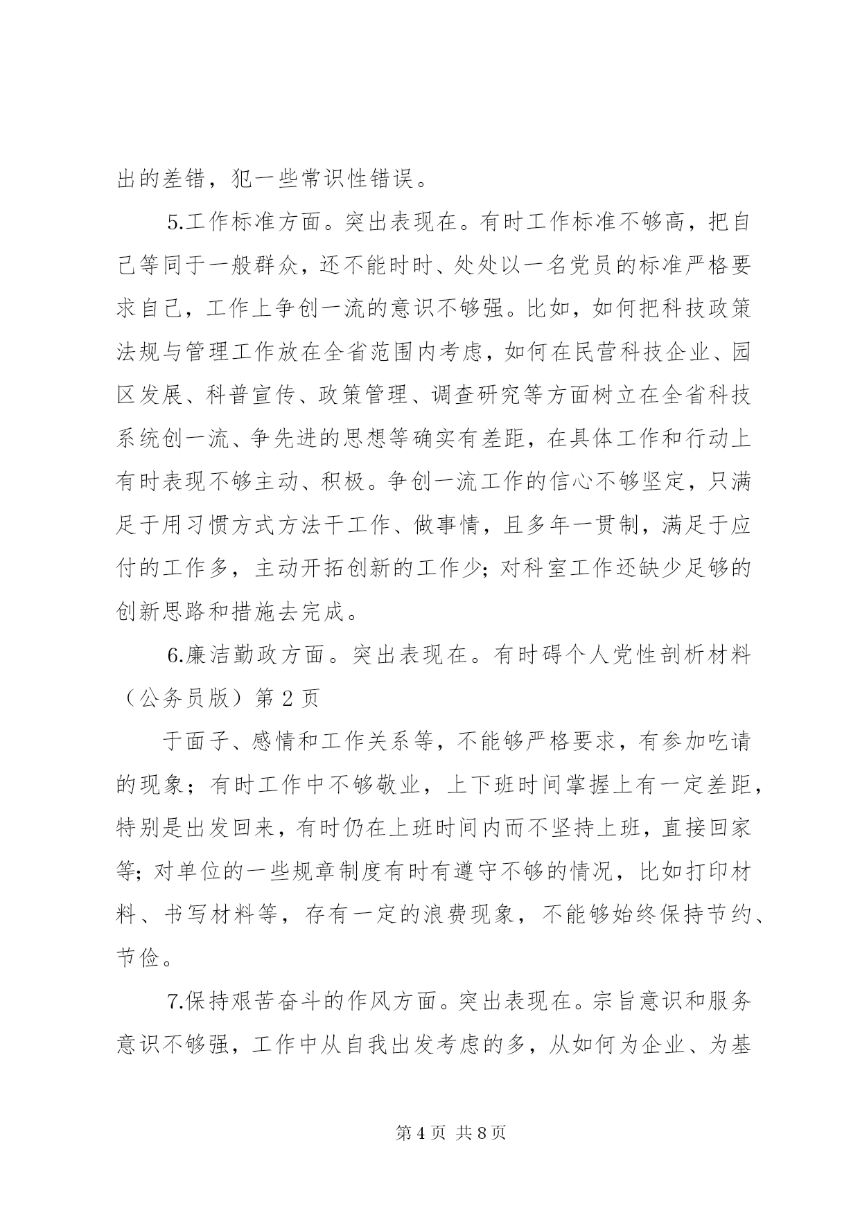 第PAGE\*Arabic\*MERGEFORMAT8页共NUMPAGES\*MERGEFORMAT8页个人党性剖析材料(公务员版)根据局保持共产党员先进性教育活动领导小组的要求,近段时间,我自己结合回头看过程中查摆的问题和不足,通过征求党员同志意见、建议、听取党小组和党组反馈意见,找出了自己在党性方面存在的突出问题和不足,并查找了根源。对存在的问题和不足,自己进行了认真反思,总觉着:党员同志们从爱护、帮助的角度提出的这些问题和不足,确实提到了点子上,对自己今后的工作、学习和做人具有非常重要的指导作用。自己从内心深处对党员同志们的关心和帮助表示感谢,并将在今后工作中努力加以改正。一、存在的主要问题和不足对存在的问题和不足,自己也从党性方面,对照党员先进性标准进行了深刻剖析,认为突出表现在八个方面:就是自身素质还需要不断提高,不能始终保持与时俱进的精神状态,中心意识不到位,工作标准太低,大局观念树立的不够牢固,服务水平、工作效率不高,工作的主动性和组织纪律性不强等方面。⒈自身素质方面。突出表现在。一是政治思想素质不够过硬。对党的一些大政方针只求学过为止,理解上不深不透,特别是对三个代表重要思想的学习领会还处在浅尝辄止的状态,一些关键点、创新点认真思考领会的非常不到位;对国家、省、市的一些科技政策法规、发展导向掌握的很不全面,理解上有相当大的误差,工作中常有解释不具体、不够准确的现象。二是学习的积极性、主动性不够强。还没有形成良好的学习习惯,学习的主动性不够强。政治学习满足于参与、学过,理解领会上对自己没有高标准、严要求;业务学习上不够专心、精心,特别是本职工作中涉及的政策、法律、法规的学习不够具体、系统和细致,对相关知识把握上不够深透;社会主义市场经济知识、法律知识、金融知识较为贫乏,学习满足一知半解,有时半途而废,不能持之以恒。⒉与时俱进的精神状态方面。突出表现在。对十六大确定的解放思想、实事求是、与时俱进的思想路线在把握上还不是很到位,有时不能及时地根据变化了的形势、任务和环境,以解放思想、实事求是为标准做好本职工作。比如,局党组从为建设经济强市提供强有力科技支撑的高度,制定了以高新技术产业发展为主线的科技工作思路,体现了与时俱进。而自己在工作中,如何团结科内同志一道,围绕高新技术产业发展这条主线考虑、安排、做好政策法规和管理工作方面,深入基层调查研究不足,思想还不够解放,工作不够大胆、不够细致,创新精神不够,还不能更好地为领导当好参谋和助手;不能够及时创新工作思路和方式方法,始终保持良好的精神状态做好工作。在科技政策管理上,还做不到把各种科技优惠政策学好弄懂,对国家、省、市的一些科技政策法规、发展导向掌握不够全面、理解不够透彻、解释有时不够全面。⒊实践三个代表重要思想的自觉性方面。突出表现在。自己作为科技局的一员,如何从科技第一生产力的组织者、实践者的角度,围绕市委、市政府确定的工业经济、民营经济、招商引资三大重点工作和局党组提出的高新技术产业发展这条主线开展工作上还有较大差距。不善于把科技政策管理工作放在全省的范围内评判和衡量,工作上开拓创新不够、重点还不够突出。在民营科技企业认定上,如何着眼于培植高新技术企业、促进民营科技发展,积极主动地、诚心诚意地想企业、基层之所想,踏踏实实地为企业、基层服好务上办法还不多;在调研上,如何摸清找准高新技术企业的所需所求,为领导当好参谋方面做得还不到位;在软科学管理上,突出高新技术产业发展、科技创新体系建设等方面缺乏力度;如何做好科普宣传,营造高新技术产业发展和科技进步的良好环境方面需要继续加强和深化。⒋党的政治纪律方面。突出表现在。有时大局观念还不够强,工作中有时存有急躁情绪,说话、发表议论有时不太注意场合,容易伤害同志,这是自己需要认真深刻剖析的。调查研究不够,经常凭主观推断办事;有时领导安排什么干什么,工作主动性较差;工作多时容易表现出急躁情绪,特别是对科室职责外的工作安排,有时认为不是份内工作凭什么干,有时流露出不满情绪,说牢骚话;有时工作中不能够精益求精,忙乱时经常出一些不该出的差错,犯一些常识性错误。⒌工作标准方面。突出表现在。有时工作标准不够高,把自己等同于一般群众,还不能时时、处处以一名党员的标准严格要求自己,工作上争创一流的意识不够强。比如,如何把科技政策法规与管理工作放在全省范围内考虑,如何在民营科技企业、园区发展、科普宣传、政策管理、调查研究等方面树立在全省科技系统创一流、争先进的思想等确实有差距,在具体工作和行动上有时表现不够主动、积极。争创一流工作的信心不够坚定,只满足于用习惯方式方法干工作、做事情,且多年一贯制,满足于应付的工作多,主动开拓创新的工作少;对科室工作还缺少足够的创新思路和措施去完成。⒍廉洁勤政方面。突出表现在。有时碍个