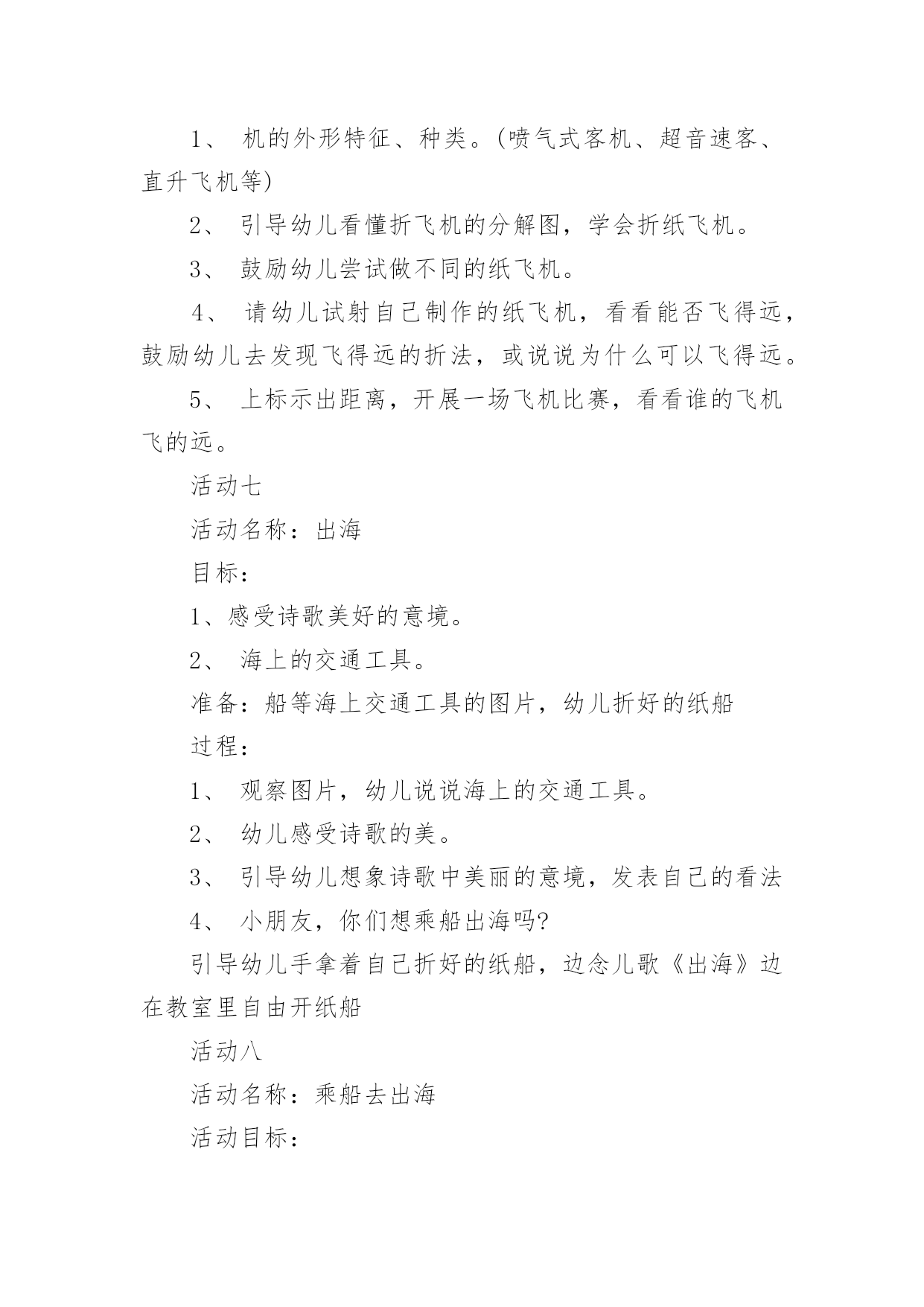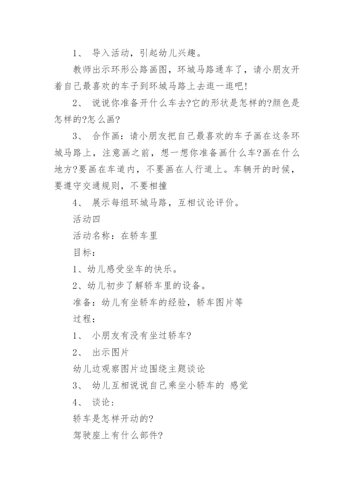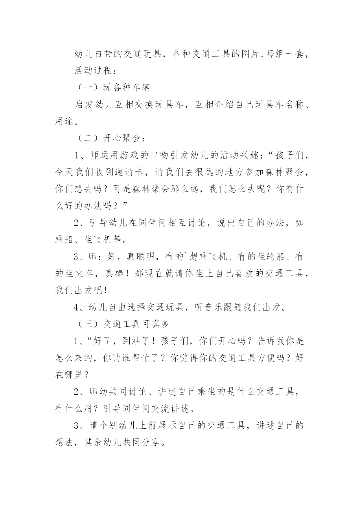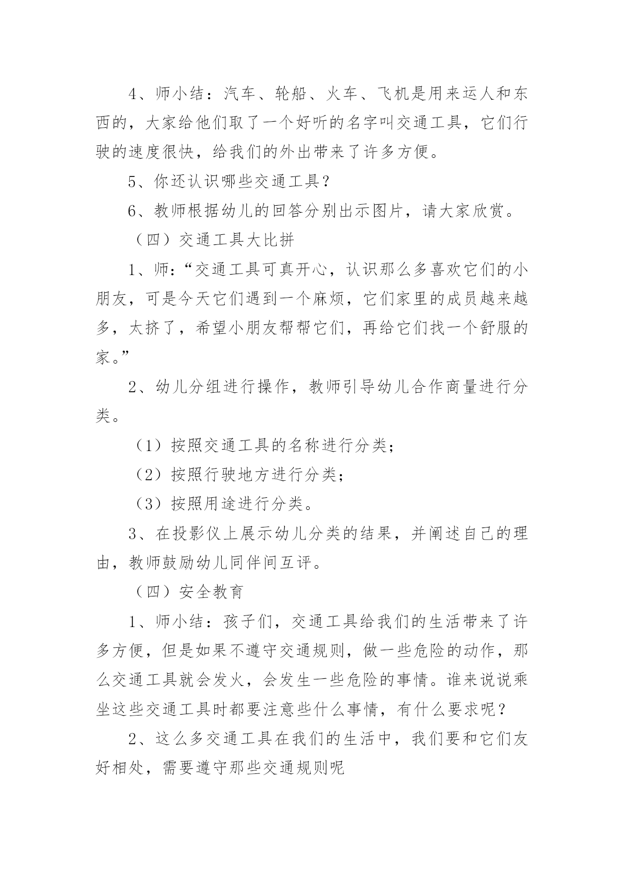 幼儿园交通工具的教案幼儿园交通工具的教案【优】在教学工作者开展教学活动前,通常需要准备好一份教案,借助教案可以提高教学质量,收到预期的教学效果。那么问题来了,教案应该怎么写?下面是小编为大家整理的幼儿园交通工具的教案,希望能够帮助到大家。幼儿园交通工具的教案1活动名称:交通工具的家活动目标:学习根据交通工具的不同特征和用途进行分类;了解交通工具的不同停靠点及交通规则;培养初步的创编儿歌的'兴趣,体验成就感。材料准备:各种交通工具模型,汽车站飞机场港口医院等各种背景图。指导要点:一、猜谜引题将各种交通工具编成谜语,幼儿猜对一种出示一种。二、经验讲述你乘过哪种交通工具?有什么感觉?乘座时应注意些什么?以上问题幼儿自由发挥想象。回忆讲述,使幼儿在互相交流中获得经验。三、交通工具的家现代交通工具给我们带来了巨大的方便,当它们工作累的时候也需要回家休息一下,它们有家吗?它们的家在哪里?四、游戏:儿歌对对碰《家》以教师讲上句,幼儿讲下句的形式,充分调动幼儿创编儿歌的积极性。五、送交通工具回家幼儿自选自己喜欢的交通工具,随音乐用肢体模仿各种交通工具的动作,将交通工具送回自己的家。六、活动延伸:幼儿每人一份《我认识的交通工具调查表》,总结已有知识,为下一步学习交通规则做准备。幼儿园交通工具的教案2活动目标:1、通过让幼儿观察、讨论、操作,激发幼儿对交通工具探索的兴趣;2、引导幼儿给交通工具分类,培养幼儿的分类能力;3、引导幼儿认识各种各样的交通工具,了解交通工具在日常生活中的重要作用,直到正确乘坐的方法,不做一些危险的动作。活动准备:幼儿自带的交通玩具,各种交通工具的图片,每组一套,活动过程:(一)玩各种车辆启发幼儿互相交换玩具车,互相介绍自己玩具车名称、用途。(二)开心聚会:1、师运用游戏的口吻引发幼儿的活动兴趣:“孩子们,今天我们收到邀请卡,请我们去很远的地方参加森林聚会,你们想去吗?可是森林聚会那么远,我们怎么去呢?你有什么好的办法吗?”2、引导幼儿在同伴间相互讨论,说出自己的办法,如乘船、坐飞机等。3、师:好,真聪明,有的`想乘飞机、有的坐轮船、有的坐火车,真棒!那现在就请你坐上自己喜欢的交通工具,我们出发吧!4、幼儿自由选择交通玩具,听音乐跟随我们出发。(三)交通工具可真多1、“好了,到站了!孩子们,你们开心吗?告诉我你是怎么来的,你请谁帮忙了?你觉得你的交通工具方便吗?好在哪里?2、师幼共同讨论、讲述自己乘坐的是什么交通工具,有什么用?引导同伴间交流讲述。3、请个别幼儿上前展示自己的交通工具,讲述自己的想法,其余幼儿共同分享。4、师小结:汽车、轮船、火车、飞机是用来运人和东西的,大家给他们取了一个好听的名字叫交通工具,它们行驶的速度很快,给我们的外出带来了许多方便。5、你还认识哪些交通工具?6、教师根据幼儿的回答分别出示图片,请大家欣赏。(四)交通工具大比拼1、师:“交通工具可真开心,认识那么多喜欢它们的小朋友,可是今天它们遇到一个麻烦,它们家里的成员越来越多,太挤了,希望小朋友帮帮它们,再给它们找一个舒服的家。”2、幼儿分组进行操作,教师引导幼儿合作商量进行分类。(1)按照交通工具的名称进行分类;(2)按照行驶地方进行分类;(3)按照用途进行分类。3、在投影仪上展示幼儿分类的结果,并阐述自己的理由,教师鼓励幼儿同伴间互评。(四)安全教育1、师小结:孩子们,交通工具给我们的生活带来了许多方便,但是如果不遵守交通规则,做一些危险的动作,那么交通工具就会发火,会发生一些危险的事情。谁来说说乘坐这些交通工具时都要注意些什么事情,有什么要求呢?2、这么多交通工具在我们的生活中,我们要和它们友好相处,需要遵守那些交通规则呢3、提供一些图片,请幼儿找出书中不正确的行为。(五)活动建议和延伸:活动结束后建议孩子们与老师并发动家长一起来陈列一个“交通工具博览会”。幼儿园交通工具的教案3活动一活动名称:马路上的车目标:1、引起幼儿观察车辆的兴趣。2、幼儿知道在马路上有许多车辆,说出其名称及主要特征。准备:外出前的各项准备工作过程:1、告诉幼儿活动名称,提出要求2、带领幼儿到马路边观察车辆3、观察重点:马路上有哪些车辆?车由哪些零件组成?哪些车是乘人的?哪些车是装货的?什么车乘人的多?什么车乘人的少?4、回教室,谈感受教师总结活动二活动名称:热闹的马路目标:幼儿通过粘贴“热闹的马路”,初步了解交通设施。准备:幼儿用书,剪刀,固体胶等过程:1、幼儿观察讨论图面说说马路上有些什么设施?各放置在什么地方?2、提出制作要求3、幼儿操作教师巡回观察,适当指导4、展示幼儿作品,介绍自己的成果互相表扬,鼓励活动三活动名称:画画马路上的车目标:1、鼓励幼儿大胆地在大型画面上作画,培养幼儿绘画的兴趣。2、引导幼儿体验集体合作绘画的乐趣,培养幼儿互相协作的精神。准备