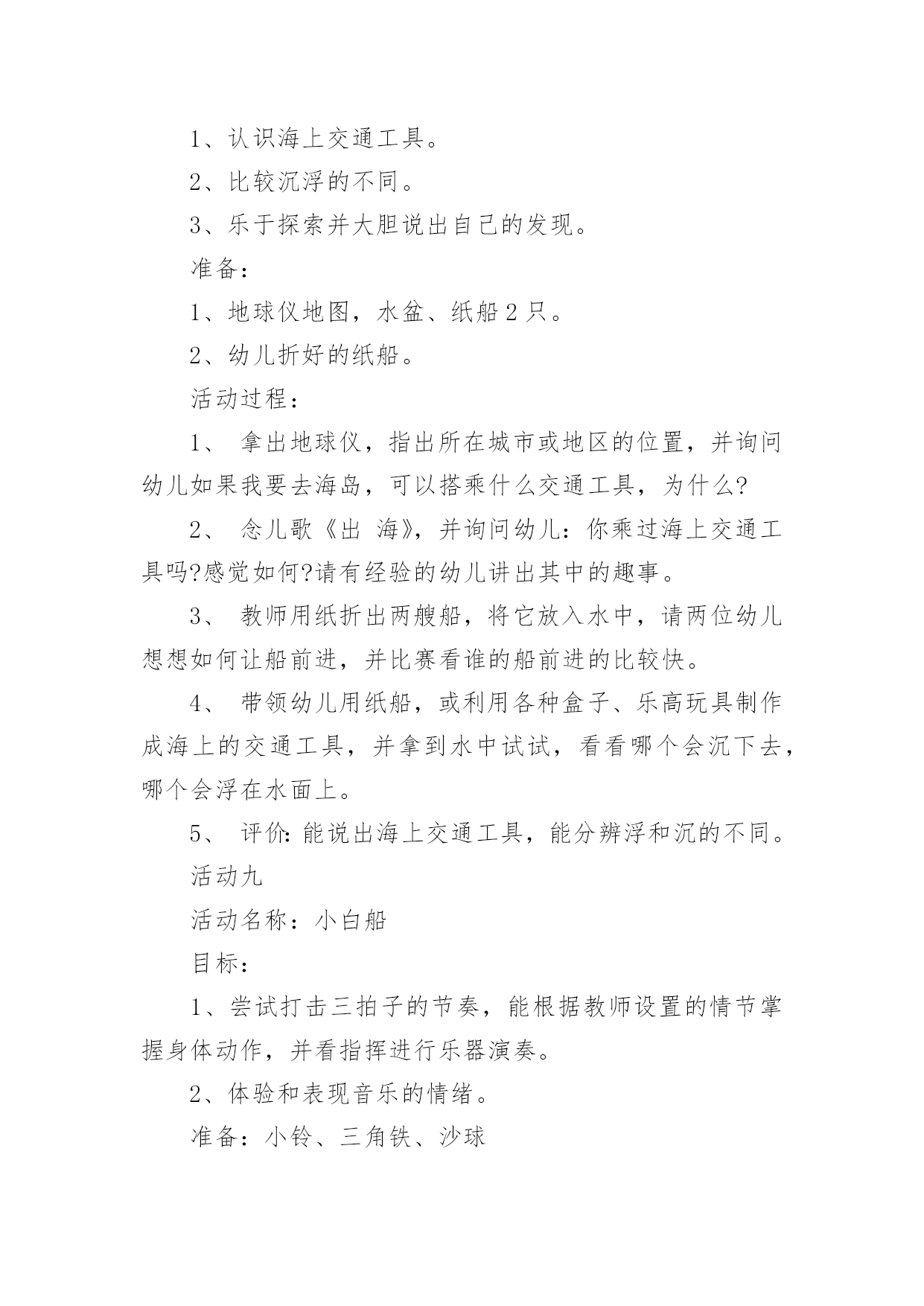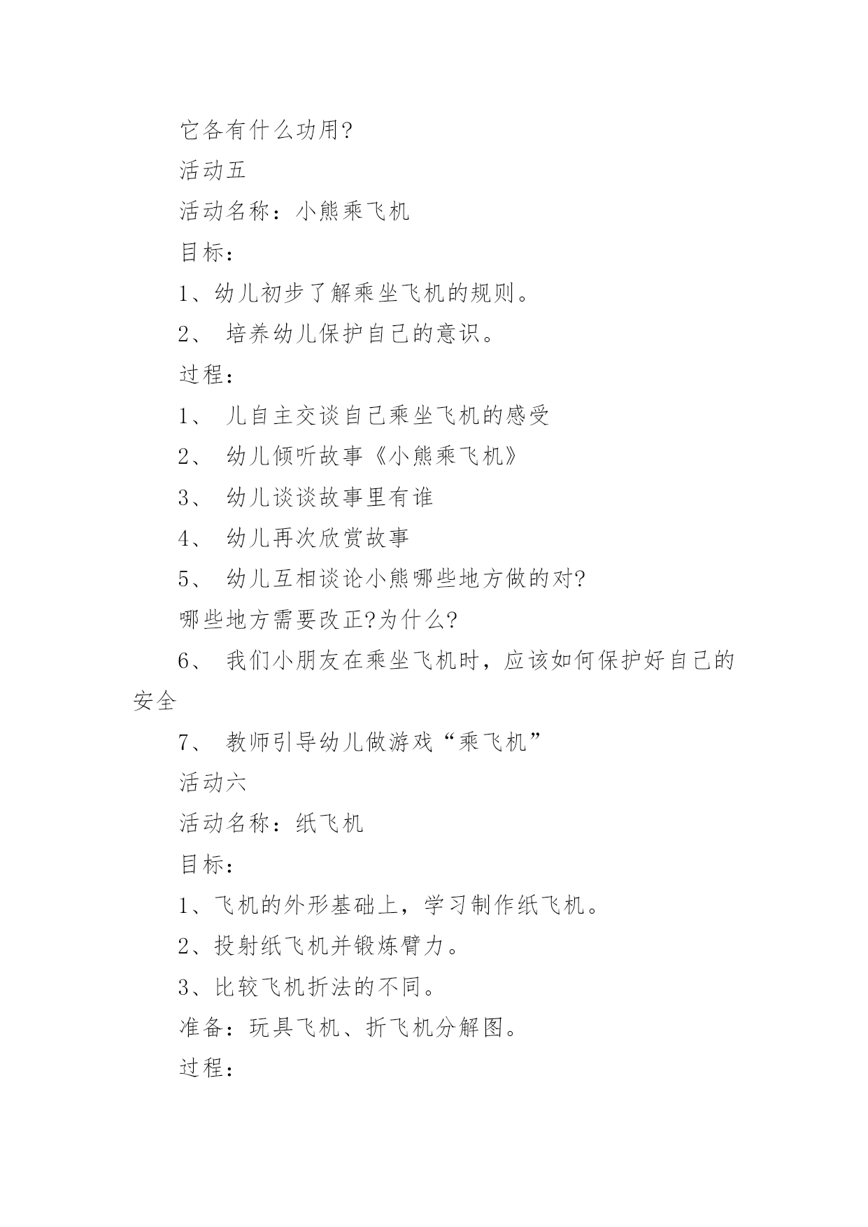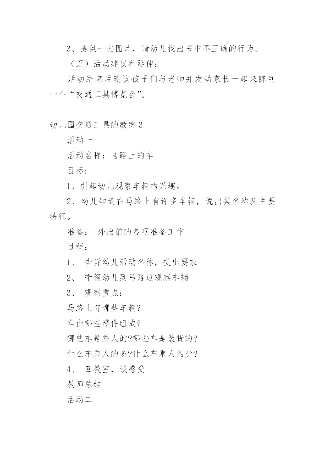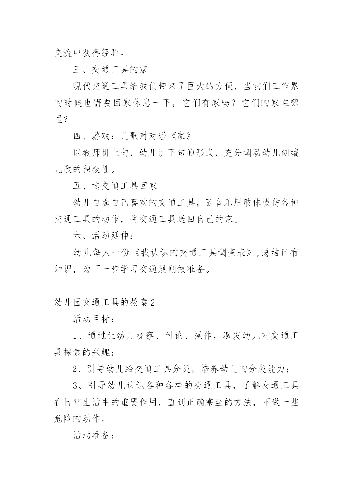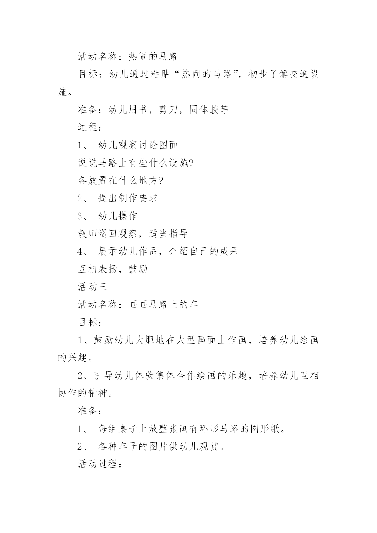 幼儿园交通工具的教案幼儿园交通工具的教案【优】在教学工作者开展教学活动前,通常需要准备好一份教案,借助教案可以提高教学质量,收到预期的教学效果。那么问题来了,教案应该怎么写?下面是小编为大家整理的幼儿园交通工具的教案,希望能够帮助到大家。幼儿园交通工具的教案1活动名称:交通工具的家活动目标:学习根据交通工具的不同特征和用途进行分类;了解交通工具的不同停靠点及交通规则;培养初步的创编儿歌的'兴趣,体验成就感。材料准备:各种交通工具模型,汽车站飞机场港口医院等各种背景图。指导要点:一、猜谜引题将各种交通工具编成谜语,幼儿猜对一种出示一种。二、经验讲述你乘过哪种交通工具?有什么感觉?乘座时应注意些什么?以上问题幼儿自由发挥想象。回忆讲述,使幼儿在互相交流中获得经验。三、交通工具的家现代交通工具给我们带来了巨大的方便,当它们工作累的时候也需要回家休息一下,它们有家吗?它们的家在哪里?四、游戏:儿歌对对碰《家》以教师讲上句,幼儿讲下句的形式,充分调动幼儿创编儿歌的积极性。五、送交通工具回家幼儿自选自己喜欢的交通工具,随音乐用肢体模仿各种交通工具的动作,将交通工具送回自己的家。六、活动延伸:幼儿每人一份《我认识的交通工具调查表》,总结已有知识,为下一步学习交通规则做准备。幼儿园交通工具的教案2活动目标:1、通过让幼儿观察、讨论、操作,激发幼儿对交通工具探索的兴趣;2、引导幼儿给交通工具分类,培养幼儿的分类能力;3、引导幼儿认识各种各样的交通工具,了解交通工具在日常生活中的重要作用,直到正确乘坐的方法,不做一些危险的动作。活动准备:幼儿自带的交通玩具,各种交通工具的图片,每组一套,活动过程:(一)玩各种车辆启发幼儿互相交换玩具车,互相介绍自己玩具车名称、用途。(二)开心聚会:1、师运用游戏的口吻引发幼儿的活动兴趣:“孩子们,今天我们收到邀请卡,请我们去很远的地方参加森林聚会,你们想去吗?可是森林聚会那么远,我们怎么去呢?你有什么好的办法吗?”2、引导幼儿在同伴间相互讨论,说出自己的办法,如乘船、坐飞机等。3、师:好,真聪明,有的`想乘飞机、有的坐轮船、有的坐火车,真棒!那现在就请你坐上自己喜欢的交通工具,我们出发吧!4、幼儿自由选择交通玩具,听音乐跟随我们出发。(三)交通工具可真多1、“好了,到站了!孩子们,你们开心吗?告诉我你是怎么来的,你请谁帮忙了?你觉得你的交通工具方便吗?好在哪里?2、师幼共同讨论、讲述自己乘坐的是什么交通工具,有什么用?引导同伴间交流讲述。3、请个别幼儿上前展示自己的交通工具,讲述自己的想法,其余幼儿共同分享。4、师小结:汽车、轮船、火车、飞机是用来运人和东西的,大家给他们取了一个好听的名字叫交通工具,它们行驶的速度很快,给我们的外出带来了许多方便。5、你还认识哪些交通工具?6、教师根据幼儿的回答分别出示图片,请大家欣赏。(四)交通工具大比拼1、师:“交通工具可真开心,认识那么多喜欢它们的小朋友,可是今天它们遇到一个麻烦,它们家里的成员越来越多,太挤了,希望小朋友帮帮它们,再给它们找一个舒服的家。”2、幼儿分组进行操作,教师引导幼儿合作商量进行分类。(1)按照交通工具的名称进行分类;(2)按照行驶地方进行分类;(3)按照用途进行分类。3、在投影仪上展示幼儿分类的结果,并阐述自己的理由,教师鼓励幼儿同伴间互评。(四)安全教育1、师小结:孩子们,交通工具给我们的生活带来了许多方便,但是如果不遵守交通规则,做一些危险的动作,那么交通工具就会发火,会发生一些危险的事情。谁来说说乘坐这些交通工具时都要注意些什么事情,有什么要求呢?2、这么多交通工具在我们的生活中,我们要和它们友好相处,需要遵守那些交通规则呢3、提供一些图片,请幼儿找出书中不正确的行为。(五)活动建议和延伸:活动结束后建议孩子们与老师并发动家长一起来陈列一个“交通工具博览会”。幼儿园交通工具的教案3活动一活动名称:马路上的车目标:1、引起幼儿观察车辆的兴趣。2、幼儿知道在马路上有许多车辆,说出其名称及主要特征。准备:外出前的各项准备工作过程:1、告诉幼儿活动名称,提出要求2、带领幼儿到马路边观察车辆3、观察重点:马路上有哪些车辆?车由哪些零件组成?哪些车是乘人的?哪些车是装货的?什么车乘人的多?什么车乘人的少?4、回教室,谈感受教师总结活动二活动名称:热闹的马路目标:幼儿通过粘贴“热闹的马路”,初步了解交通设施。准备:幼儿用书,剪刀,固体胶等过程:1、幼儿观察讨论图面说说马路上有些什么设施?各放置在什么地方?2、提出制作要求3、幼儿操作教师巡回观察,适当指导4、展示幼儿作品,介绍自己的成果互相表扬,鼓励活动三活动名称:画画马路上的车目标:1、鼓励幼儿大胆地在大型画面上作画,培养幼儿绘画的兴趣。2、引导幼儿体验集体合作绘画的乐趣,培养幼儿互相协作的精神。准备