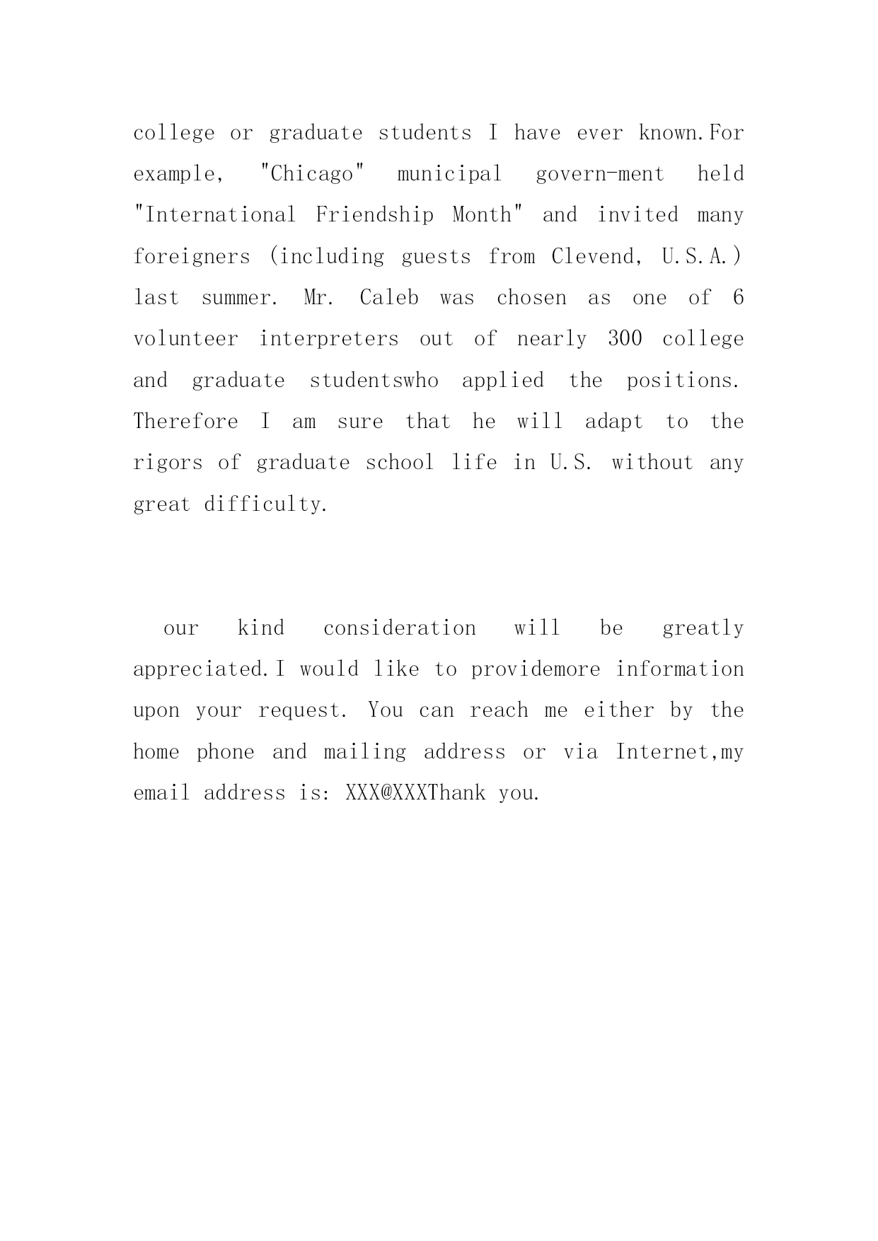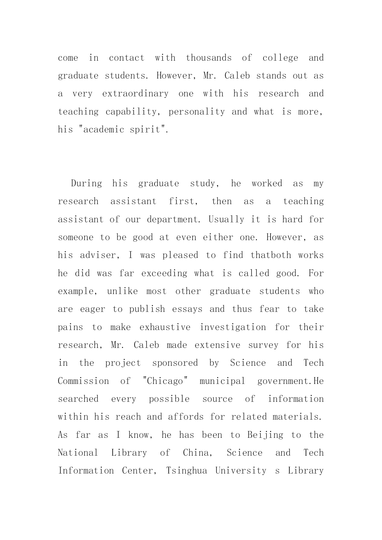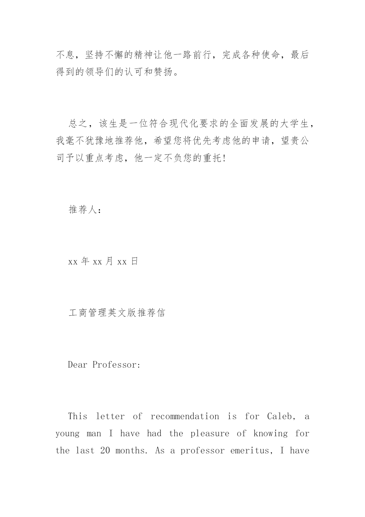 工商管理毕业生信工商管理毕业生推荐信工商管理是市场经济中最常见的一种管理专业,一般指工商企业管理。以下是CN人才网小编为大家精心搜集和整理的工商管理毕业生推荐信,欢迎大家阅读。工商管理毕业生推荐信尊敬的领导:您好!感谢您能在百忙之中翻阅我的推荐信!今向贵公司推荐我系毕业生xx同学。xx同学是一名xx管理学院工商管理专业的应届毕业生。大学四年可以说是他思想,知识和实践快速成长的四年。自从进入大学之后,他不断完善自我,积极奋斗,迎接新的挑战。在理论知识上,凭借自身扎实的基础和顽强拼搏的奋斗精神,经过几年不断的学习,在各方面都取得了不错的发展。除了课本知识以外,他还大量阅读课外知识,对其他非专业知识有浓厚的兴趣。他顺利地通过了全国计算机二级考试,并且还通过了大学英语四、六级考试。在校期间,他不仅注重文化知识的学习,还较注重身体素质,在多次学校举办的体育比赛中获得第一名的好成绩。该生长期担任班长一职,策划组织多项班级活动,有一定的组织能力,受到老师和学生的一直好评。在不断地学习和工作中养成的严谨、踏实的工作作风和团结协作的优秀品质,使我深信他完全可以在未来的工作岗位上守业、敬业!在思想方面,品质优秀,思想进步,在校期间,更光荣的`加入中国共产党。在社会实践上,他利用暑期进入企业实习,从小事做起,坚持以学习为主,将理论知识运用到企业管理当中。他自强不息,坚持不懈的精神让他一路前行,完成各种使命,最后得到的领导们的认可和赞扬。总之,该生是一位符合现代化要求的全面发展的大学生,我毫不犹豫地推荐他,希望您将优先考虑他的申请,望贵公司予以重点考虑,他一定不负您的重托!推荐人:xx年xx月xx日工商管理英文版推荐信DearProfessor:ThisletterofrecommendationisforCaleb,ayoungmanIhavehadthepleasureofknowingforthelast20months.Asaprofessoremeritus,Ihavecomeincontactwiththousandsofcollegeandgraduatestudents.However,Mr.Calebstandsoutasaveryextraordinaryonewithhisresearchandteachingcapability,personalityandwhatismore,his"academicspirit".Duringhisgraduatestudy,heworkedasmyresearchassistantfirst,thenasateachingassistantofourdepartment.Usuallyitishardforsomeonetobegoodateveneitherone.However,ashisadviser,Iwaspleasedtofindthatbothworkshedidwasfarexceedingwhatiscalledgood.Forexample,unlikemostothergraduatestudentswhoareeagertopublishessaysandthusfeartotakepainstomakeexhaustiveinvestigationfortheirresearch,Mr.CalebmadeextensivesurveyforhisintheprojectsponsoredbyScienceandTechCommissionof"Chicago"municipalgovernment.Hesearchedeverypossiblesourceofinformationwithinhisreachandaffordsforrelatedmaterials.AsfarasIknow,hehasbeentoBeijingtotheNationalLibraryofChina,ScienceandTechInformationCenter,TsinghuaUniversitysLibraryandmostpubliclibrariesof"Chicago".Hesearchedbothinlibraryandonweb,whichisatotallynewapproachtous.NeitherwasMr.Calebsatisfiedwithsecond-handinformationonly.Duringtheprocess,healsointerviewedwithsupervisorsofsomescientificinstitutesof"Chicago"toobtainfirst-handinformatio