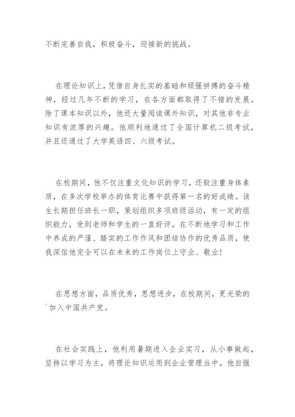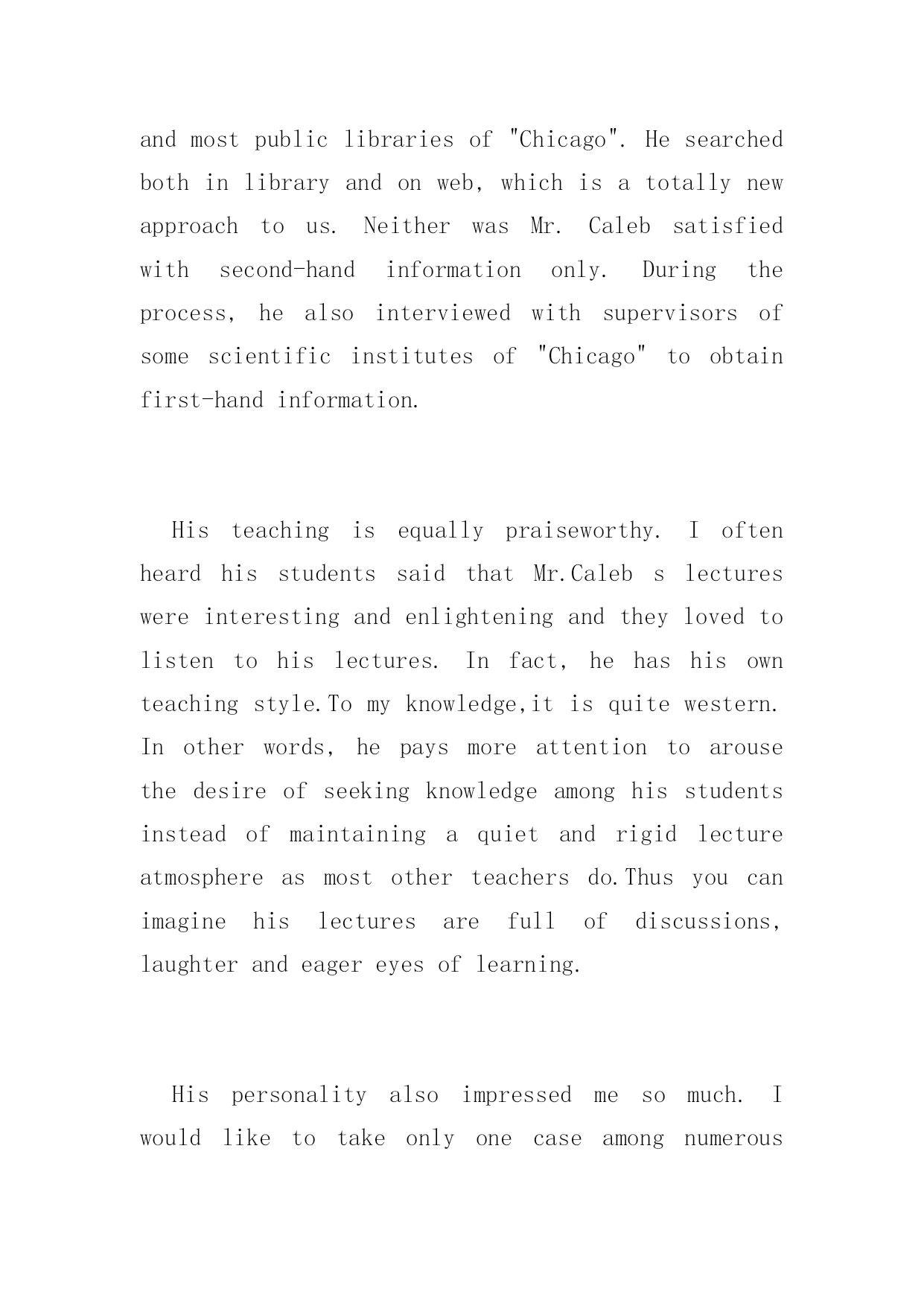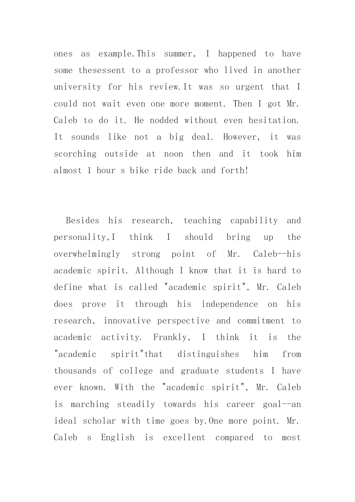 工商管理毕业生信工商管理毕业生推荐信工商管理是市场经济中最常见的一种管理专业,一般指工商企业管理。以下是CN人才网小编为大家精心搜集和整理的工商管理毕业生推荐信,欢迎大家阅读。工商管理毕业生推荐信尊敬的领导:您好!感谢您能在百忙之中翻阅我的推荐信!今向贵公司推荐我系毕业生xx同学。xx同学是一名xx管理学院工商管理专业的应届毕业生。大学四年可以说是他思想,知识和实践快速成长的四年。自从进入大学之后,他不断完善自我,积极奋斗,迎接新的挑战。在理论知识上,凭借自身扎实的基础和顽强拼搏的奋斗精神,经过几年不断的学习,在各方面都取得了不错的发展。除了课本知识以外,他还大量阅读课外知识,对其他非专业知识有浓厚的兴趣。他顺利地通过了全国计算机二级考试,并且还通过了大学英语四、六级考试。在校期间,他不仅注重文化知识的学习,还较注重身体素质,在多次学校举办的体育比赛中获得第一名的好成绩。该生长期担任班长一职,策划组织多项班级活动,有一定的组织能力,受到老师和学生的一直好评。在不断地学习和工作中养成的严谨、踏实的工作作风和团结协作的优秀品质,使我深信他完全可以在未来的工作岗位上守业、敬业!在思想方面,品质优秀,思想进步,在校期间,更光荣的`加入中国共产党。在社会实践上,他利用暑期进入企业实习,从小事做起,坚持以学习为主,将理论知识运用到企业管理当中。他自强不息,坚持不懈的精神让他一路前行,完成各种使命,最后得到的领导们的认可和赞扬。总之,该生是一位符合现代化要求的全面发展的大学生,我毫不犹豫地推荐他,希望您将优先考虑他的申请,望贵公司予以重点考虑,他一定不负您的重托!推荐人:xx年xx月xx日工商管理英文版推荐信DearProfessor:ThisletterofrecommendationisforCaleb,ayoungmanIhavehadthepleasureofknowingforthelast20months.Asaprofessoremeritus,Ihavecomeincontactwiththousandsofcollegeandgraduatestudents.However,Mr.Calebstandsoutasaveryextraordinaryonewithhisresearchandteachingcapability,personalityandwhatismore,his"academicspirit".Duringhisgraduatestudy,heworkedasmyresearchassistantfirst,thenasateachingassistantofourdepartment.Usuallyitishardforsomeonetobegoodateveneitherone.However,ashisadviser,Iwaspleasedtofindthatbothworkshedidwasfarexceedingwhatiscalledgood.Forexample,unlikemostothergraduatestudentswhoareeagertopublishessaysandthusfeartotakepainstomakeexhaustiveinvestigationfortheirresearch,Mr.CalebmadeextensivesurveyforhisintheprojectsponsoredbyScienceandTechCommissionof"Chicago"municipalgovernment.Hesearchedeverypossiblesourceofinformationwithinhisreachandaffordsforrelatedmaterials.AsfarasIknow,hehasbeentoBeijingtotheNationalLibraryofChina,ScienceandTechInformationCenter,TsinghuaUniversitysLibraryandmostpubliclibrariesof"Chicago".Hesearchedbothinlibraryandonweb,whichisatotallynewapproachtous.NeitherwasMr.Calebsatisfiedwithsecond-handinformationonly.Duringtheprocess,healsointerviewedwithsupervisorsofsomescientificinstitutesof"Chicago"toobtainfirst-handinformatio