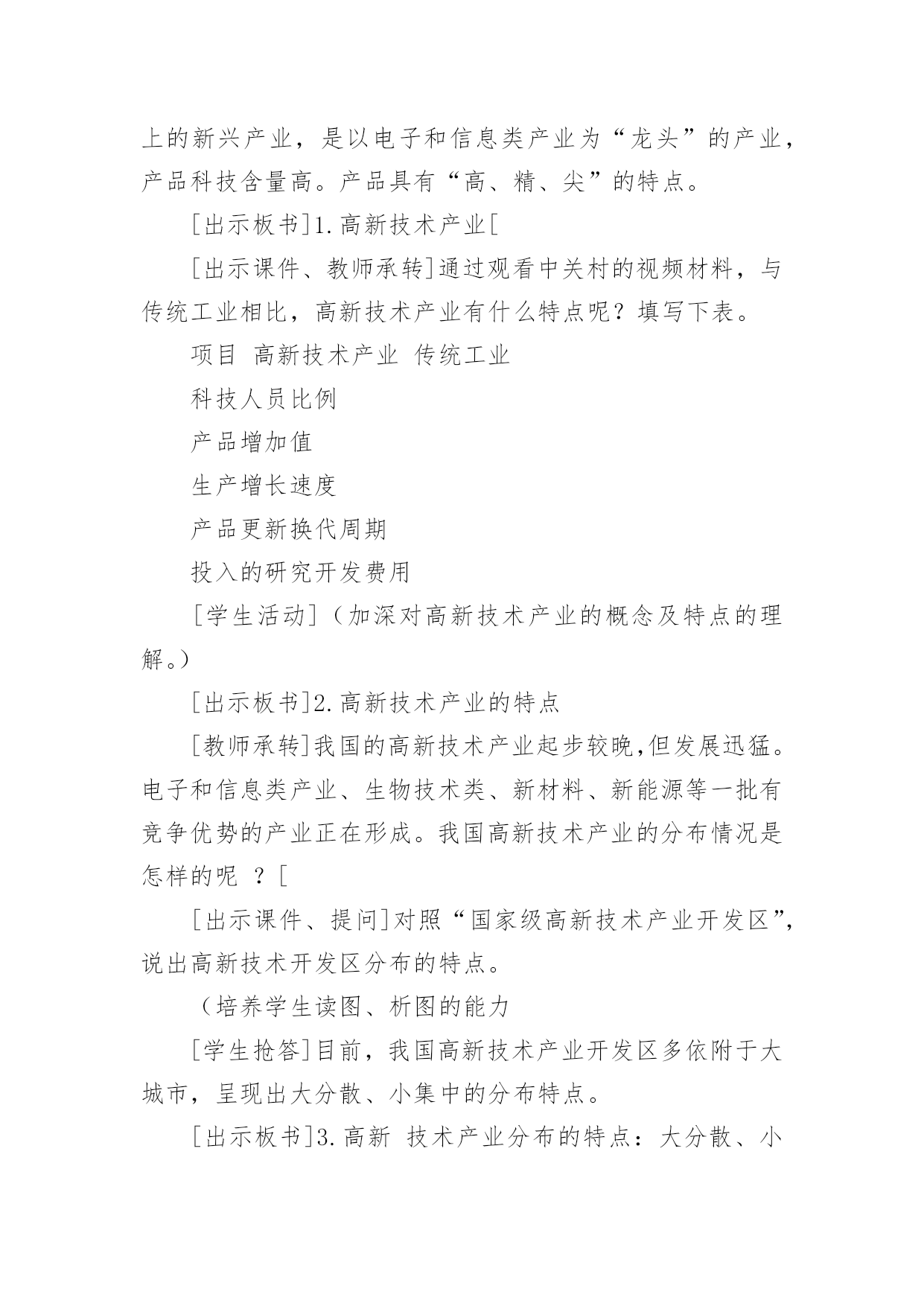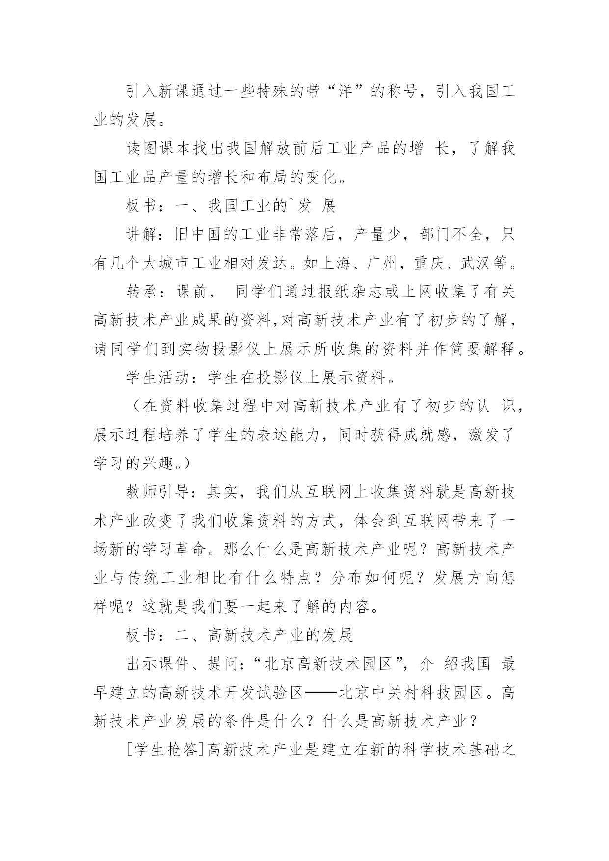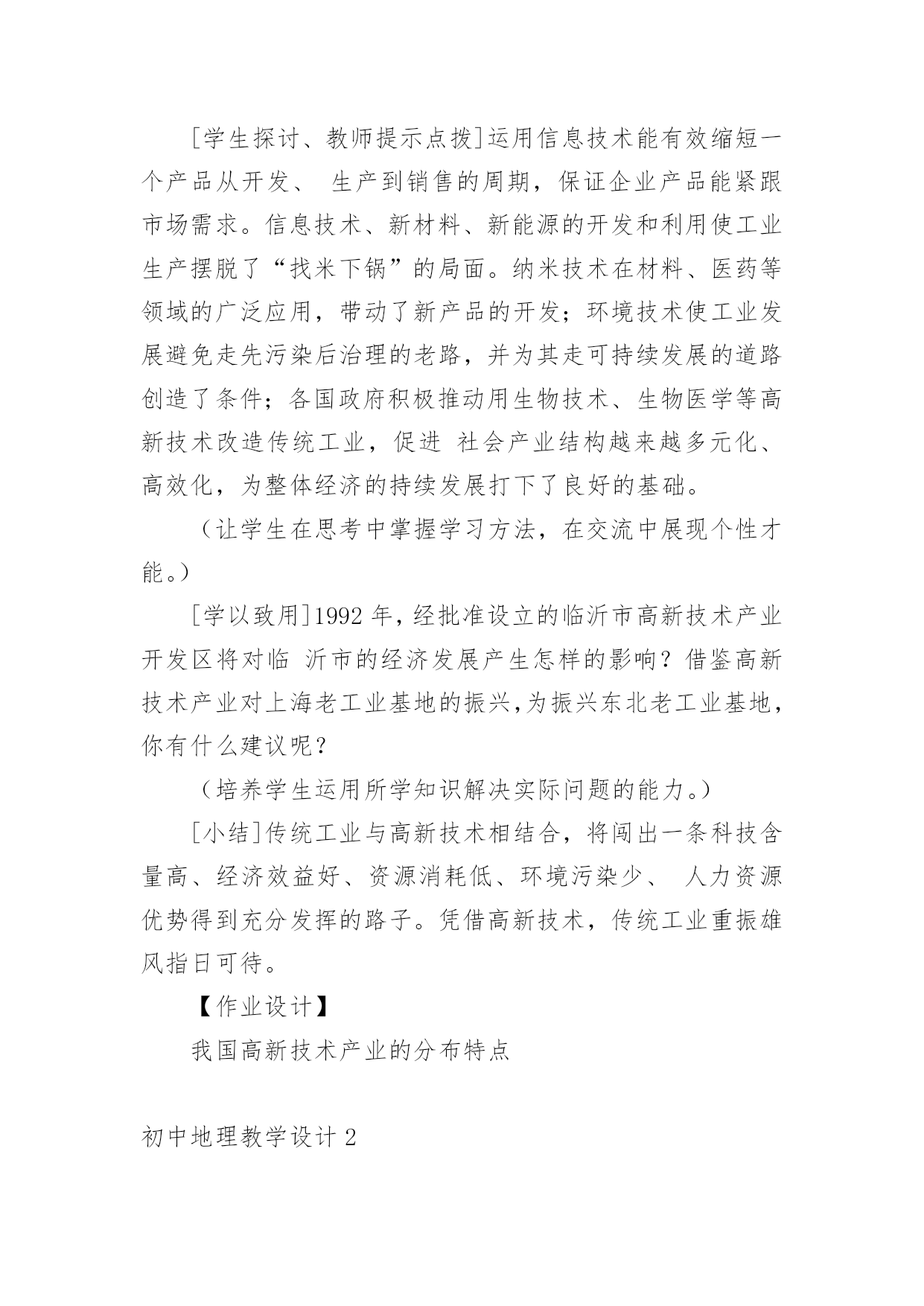 初中地理教学设计作为一名教学工作者,通常会被要求编写教学设计,借助教学设计可以提高教学质量,收到预期的教学效果。那么优秀的教学设计是什么样的呢?以下是小编帮大家整理的初中地理教学设计,仅供参考,欢迎大家阅读。初中地理教学设计1【教学目标】1、了解我国工业发展的成就。2、了解高新技术产业的概念、产业特点、分布及发展方向;收集资料加深理解高新技术产业的技能,读图、析图说明高新技术产业分布特点的技能。3、通过感知高新技术产业的成果,形成地理表象,根据收集到的信息,通过抽象、概括思维过程,形成、理解高新技术产业的概念,进而理解高新技术产业的特点及分布特点;举例说明高新技术产业在工业发展中的作用。【教学重点】高新技术产业的特点、分布特点及发展方向。【课前准备】教师:多媒体课件制作。学生:收集高新技术产业的成果的图片,“武汉光谷”的有关资料。【教学过程】引入新课通过一些特殊的带“洋”的称号,引入我国工业的发展。读图课本找出我国解放前后工业产品的增长,了解我国工业品产量的增长和布局的变化。板书:一、我国工业的`发展讲解:旧中国的工业非常落后,产量少,部门不全,只有几个大城市工业相对发达。如上海、广州,重庆、武汉等。转承:课前,同学们通过报纸杂志或上网收集了有关高新技术产业成果的资料,对高新技术产业有了初步的了解,请同学们到实物投影仪上展示所收集的资料并作简要解释。学生活动:学生在投影仪上展示资料。(在资料收集过程中对高新技术产业有了初步的认识,展示过程培养了学生的表达能力,同时获得成就感,激发了学习的兴趣。)教师引导:其实,我们从互联网上收集资料就是高新技术产业改变了我们收集资料的方式,体会到互联网带来了一场新的学习革命。那么什么是高新技术产业呢?高新技术产业与传统工业相比有什么特点?分布如何呢?发展方向怎样呢?这就是我们要一起来了解的内容。板书:二、高新技术产业的发展出示课件、提问:“北京高新技术园区”,介绍我国最早建立的高新技术开发试验区──北京中关村科技园区。高新技术产业发展的条件是什么?什么是高新技术产业?[学生抢答]高新技术产业是建立在新的科学技术基础之上的新兴产业,是以电子和信息类产业为“龙头”的产业,产品科技含量高。产品具有“高、精、尖”的特点。[出示板书]1.高新技术产业[[出示课件、教师承转]通过观看中关村的视频材料,与传统工业相比,高新技术产业有什么特点呢?填写下表。项目高新技术产业传统工业科技人员比例产品增加值生产增长速度产品更新换代周期投入的研究开发费用[学生活动](加深对高新技术产业的概念及特点的理解。)[出示板书]2.高新技术产业的特点[教师承转]我国的高新技术产业起步较晚,但发展迅猛。电子和信息类产业、生物技术类、新材料、新能源等一批有竞争优势的产业正在形成。我国高新技术产业的分布情况是怎样的呢?[[出示课件、提问]对照“国家级高新技术产业开发区”,说出高新技术开发区分布的特点。(培养学生读图、析图的能力[学生抢答]目前,我国高新技术产业开发区多依附于大城市,呈现出大分散、小集中的分布特点。[出示板书]3.高新技术产业分布的特点:大分散、小集中。[教师承转]我国高新技术开发区因地理位置不同,就具有不同的开发重点。沿海、沿边、内地地区高新技术产业开发的重点有什么不同?[学生抢答]──沿海地区以智力资源和技术力量为依托,侧重科技园区型高新技术产业;──沿边地区以国家的开放政策和沿边的地理优势,开发以贸易导向型的产业;──内地以优势资源和工业基础,多发展与军工有密切关系的产业。[教师承转]高新技术产业对经济的发展会起到怎样的作用呢?请阅读P115活动1的三则短文,然后回答活动2的(1)(2)(3)小题。[学生讨论][教师指导]问题(1)高新技术产业对上海老工业基地的振兴所起的作用;问题(2)北京中关村高科技园对北京市的经济发展所起到的推动和促进作用;问题(3)国际互联网快捷的信息传递方式将会改变企业的传统生产方式。[实例分析讨论]最近几年,电子通讯、生物工程、软件行业成了各路求职人员眼中的“香饽饽”,相比之下,钢铁、纺织、机械制造等传统工业的吸引力就小多了。在不少人眼中,传统工业“老气横秋”,不如所谓“朝阳产业”的高新技术产业有前途。你有什么看法?[学生探讨、教师提示点拨]运用信息技术能有效缩短一个产品从开发、生产到销售的周期,保证企业产品能紧跟市场需求。信息技术、新材料、新能源的开发和利用使工业生产摆脱了“找米下锅”的局面。纳米技术在材料、医药等领域的广泛应用,带动了新产品的开发;环境技术使工业发展避免走先污染后治理的老路,并为其走可持续发展的道路创造了条件;各国政府积极推动用生物技术、生物医学等高新技术改造传统工业,促进社会产业结构越来越多元化、高效化,为整体经济的持续发展打下了良好的基础。(让学生在思考中掌