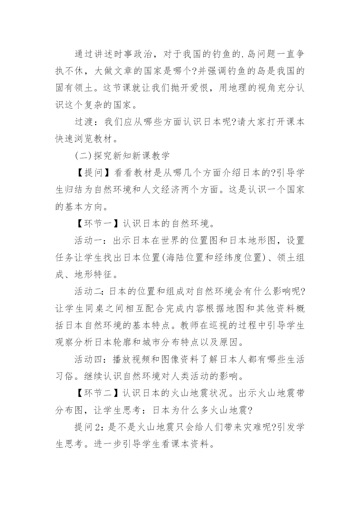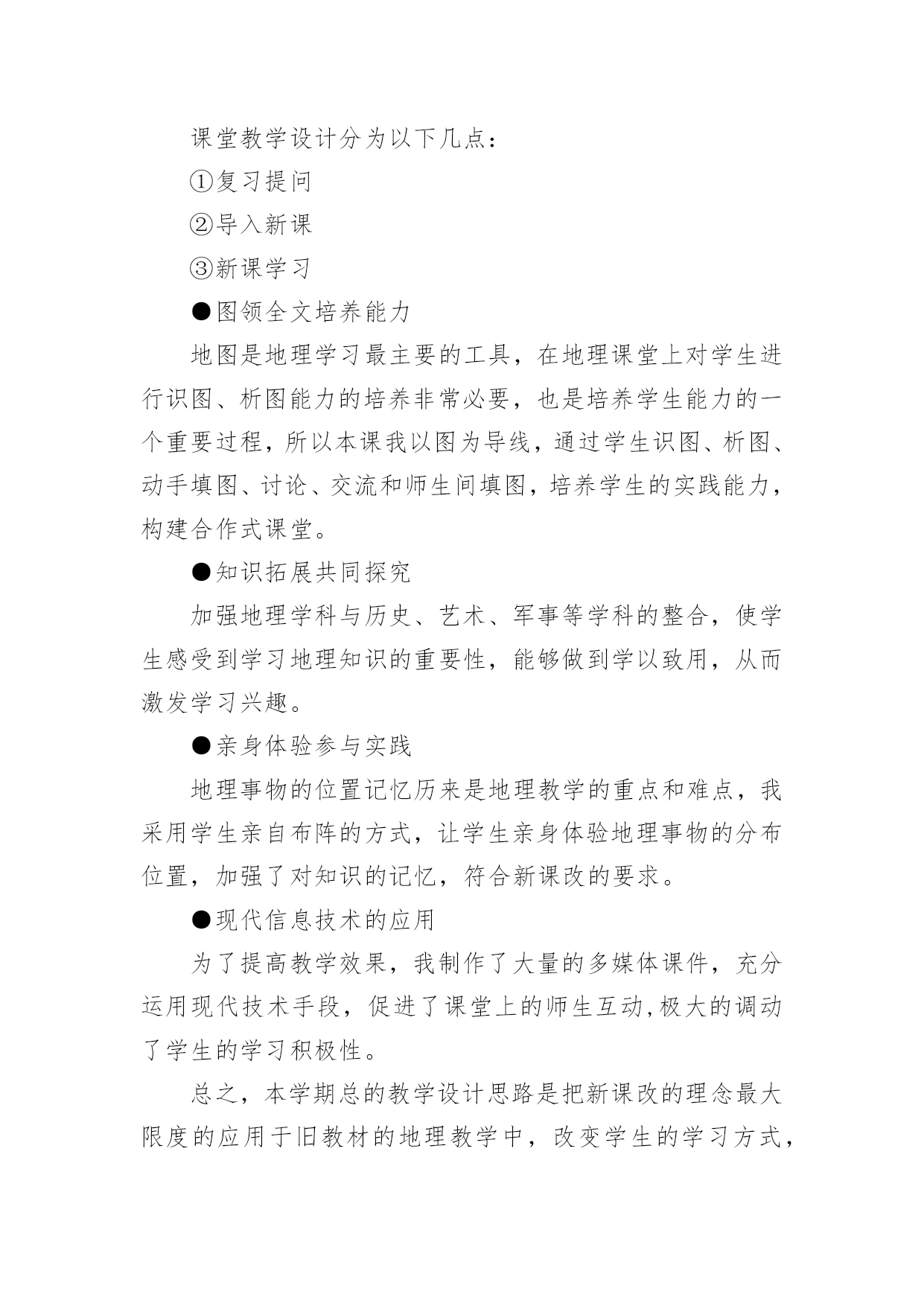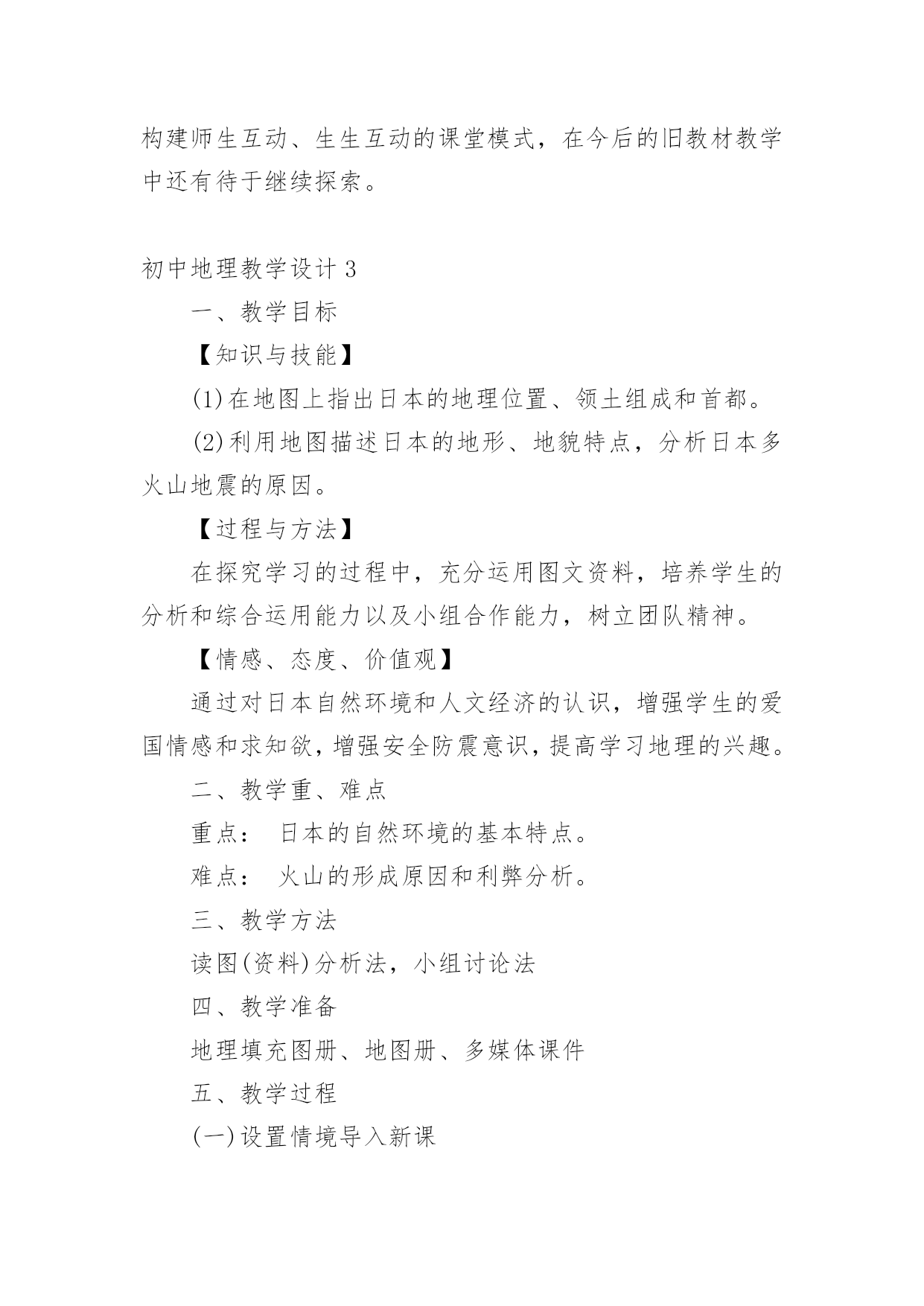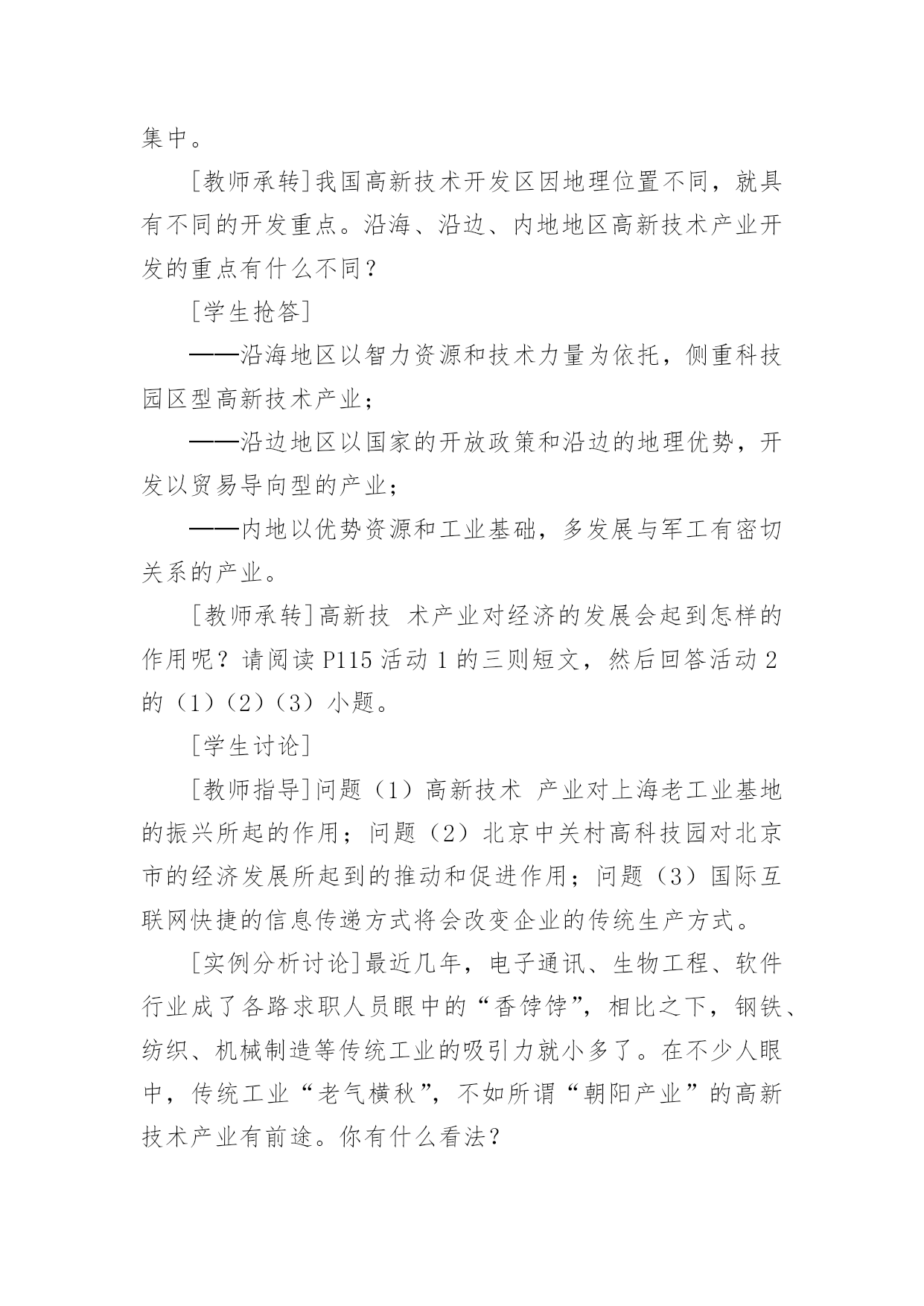 初中地理教学设计作为一名教学工作者,通常会被要求编写教学设计,借助教学设计可以提高教学质量,收到预期的教学效果。那么优秀的教学设计是什么样的呢?以下是小编帮大家整理的初中地理教学设计,仅供参考,欢迎大家阅读。初中地理教学设计1【教学目标】1、了解我国工业发展的成就。2、了解高新技术产业的概念、产业特点、分布及发展方向;收集资料加深理解高新技术产业的技能,读图、析图说明高新技术产业分布特点的技能。3、通过感知高新技术产业的成果,形成地理表象,根据收集到的信息,通过抽象、概括思维过程,形成、理解高新技术产业的概念,进而理解高新技术产业的特点及分布特点;举例说明高新技术产业在工业发展中的作用。【教学重点】高新技术产业的特点、分布特点及发展方向。【课前准备】教师:多媒体课件制作。学生:收集高新技术产业的成果的图片,“武汉光谷”的有关资料。【教学过程】引入新课通过一些特殊的带“洋”的称号,引入我国工业的发展。读图课本找出我国解放前后工业产品的增长,了解我国工业品产量的增长和布局的变化。板书:一、我国工业的`发展讲解:旧中国的工业非常落后,产量少,部门不全,只有几个大城市工业相对发达。如上海、广州,重庆、武汉等。转承:课前,同学们通过报纸杂志或上网收集了有关高新技术产业成果的资料,对高新技术产业有了初步的了解,请同学们到实物投影仪上展示所收集的资料并作简要解释。学生活动:学生在投影仪上展示资料。(在资料收集过程中对高新技术产业有了初步的认识,展示过程培养了学生的表达能力,同时获得成就感,激发了学习的兴趣。)教师引导:其实,我们从互联网上收集资料就是高新技术产业改变了我们收集资料的方式,体会到互联网带来了一场新的学习革命。那么什么是高新技术产业呢?高新技术产业与传统工业相比有什么特点?分布如何呢?发展方向怎样呢?这就是我们要一起来了解的内容。板书:二、高新技术产业的发展出示课件、提问:“北京高新技术园区”,介绍我国最早建立的高新技术开发试验区──北京中关村科技园区。高新技术产业发展的条件是什么?什么是高新技术产业?[学生抢答]高新技术产业是建立在新的科学技术基础之上的新兴产业,是以电子和信息类产业为“龙头”的产业,产品科技含量高。产品具有“高、精、尖”的特点。[出示板书]1.高新技术产业[[出示课件、教师承转]通过观看中关村的视频材料,与传统工业相比,高新技术产业有什么特点呢?填写下表。项目高新技术产业传统工业科技人员比例产品增加值生产增长速度产品更新换代周期投入的研究开发费用[学生活动](加深对高新技术产业的概念及特点的理解。)[出示板书]2.高新技术产业的特点[教师承转]我国的高新技术产业起步较晚,但发展迅猛。电子和信息类产业、生物技术类、新材料、新能源等一批有竞争优势的产业正在形成。我国高新技术产业的分布情况是怎样的呢?[[出示课件、提问]对照“国家级高新技术产业开发区”,说出高新技术开发区分布的特点。(培养学生读图、析图的能力[学生抢答]目前,我国高新技术产业开发区多依附于大城市,呈现出大分散、小集中的分布特点。[出示板书]3.高新技术产业分布的特点:大分散、小集中。[教师承转]我国高新技术开发区因地理位置不同,就具有不同的开发重点。沿海、沿边、内地地区高新技术产业开发的重点有什么不同?[学生抢答]──沿海地区以智力资源和技术力量为依托,侧重科技园区型高新技术产业;──沿边地区以国家的开放政策和沿边的地理优势,开发以贸易导向型的产业;──内地以优势资源和工业基础,多发展与军工有密切关系的产业。[教师承转]高新技术产业对经济的发展会起到怎样的作用呢?请阅读P115活动1的三则短文,然后回答活动2的(1)(2)(3)小题。[学生讨论][教师指导]问题(1)高新技术产业对上海老工业基地的振兴所起的作用;问题(2)北京中关村高科技园对北京市的经济发展所起到的推动和促进作用;问题(3)国际互联网快捷的信息传递方式将会改变企业的传统生产方式。[实例分析讨论]最近几年,电子通讯、生物工程、软件行业成了各路求职人员眼中的“香饽饽”,相比之下,钢铁、纺织、机械制造等传统工业的吸引力就小多了。在不少人眼中,传统工业“老气横秋”,不如所谓“朝阳产业”的高新技术产业有前途。你有什么看法?[学生探讨、教师提示点拨]运用信息技术能有效缩短一个产品从开发、生产到销售的周期,保证企业产品能紧跟市场需求。信息技术、新材料、新能源的开发和利用使工业生产摆脱了“找米下锅”的局面。纳米技术在材料、医药等领域的广泛应用,带动了新产品的开发;环境技术使工业发展避免走先污染后治理的老路,并为其走可持续发展的道路创造了条件;各国政府积极推动用生物技术、生物医学等高新技术改造传统工业,促进社会产业结构越来越多元化、高效化,为整体经济的持续发展打下了良好的基础。(让学生在思考中掌