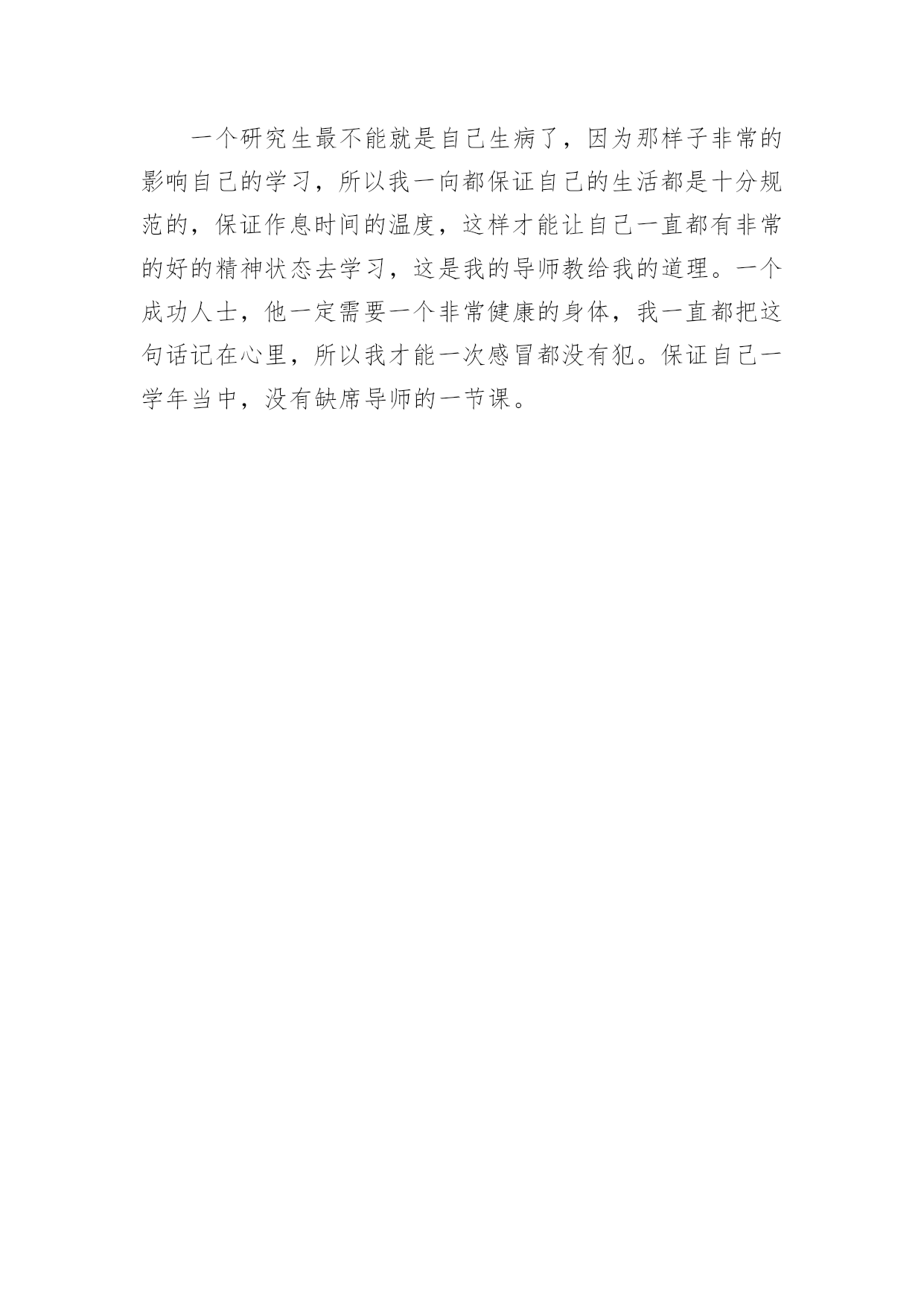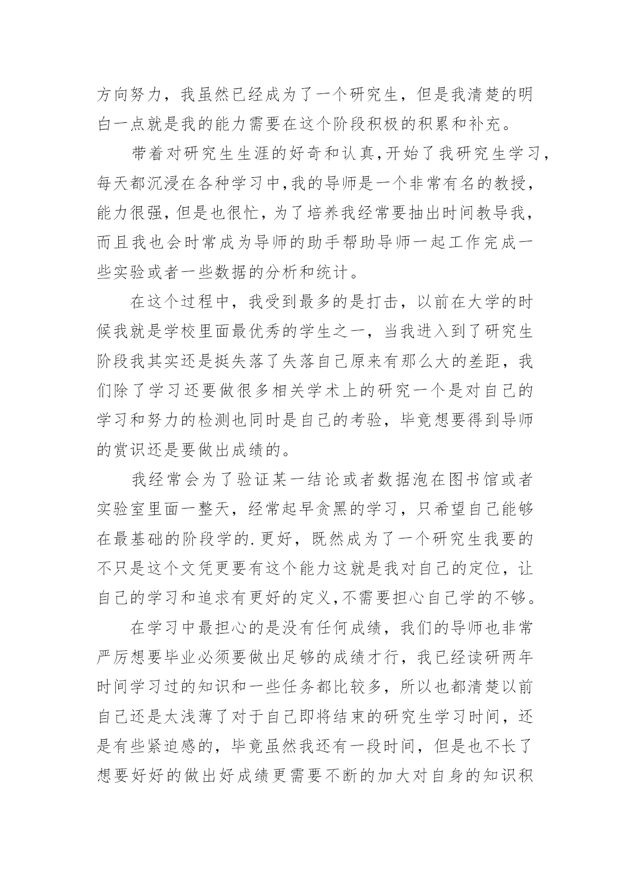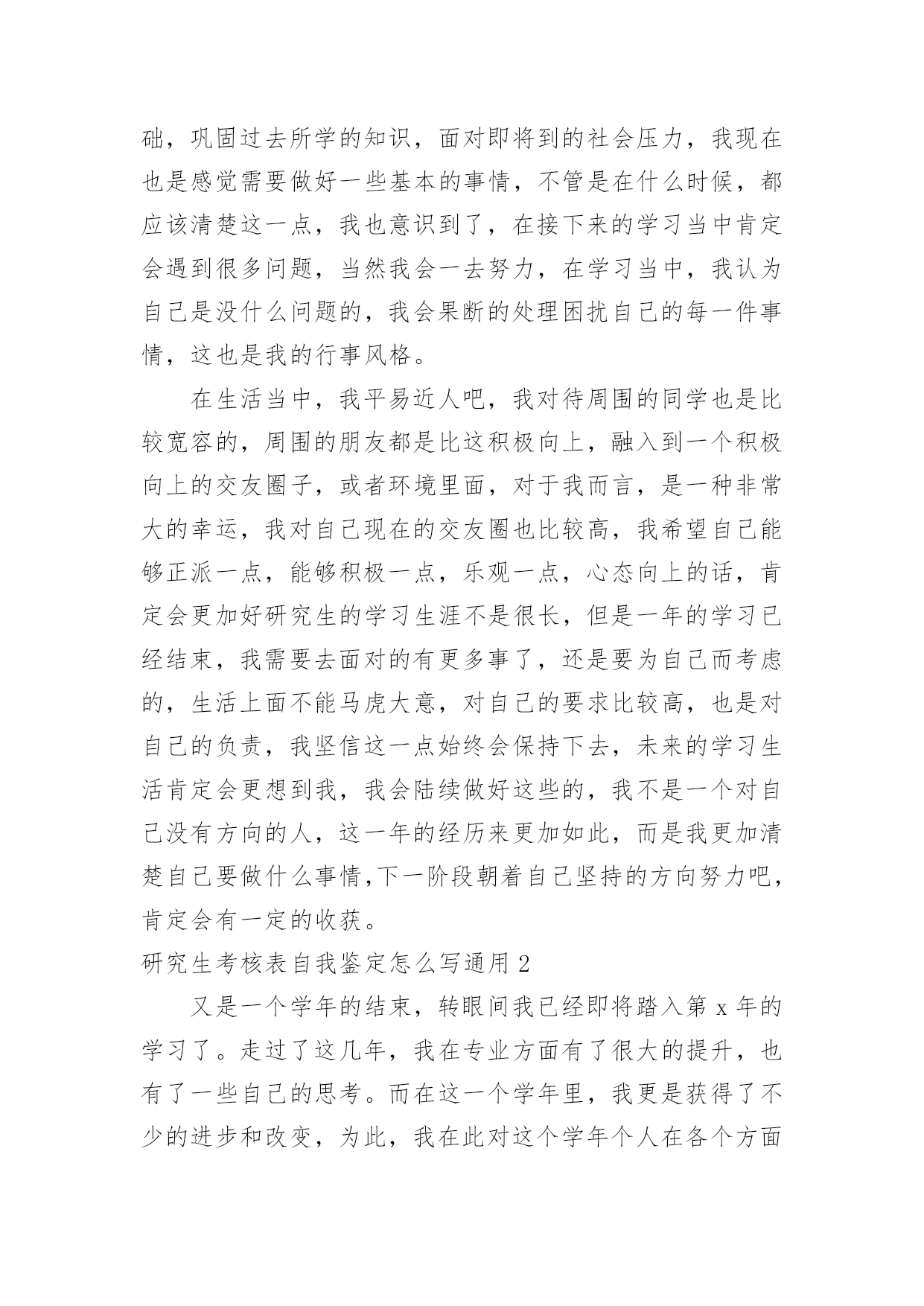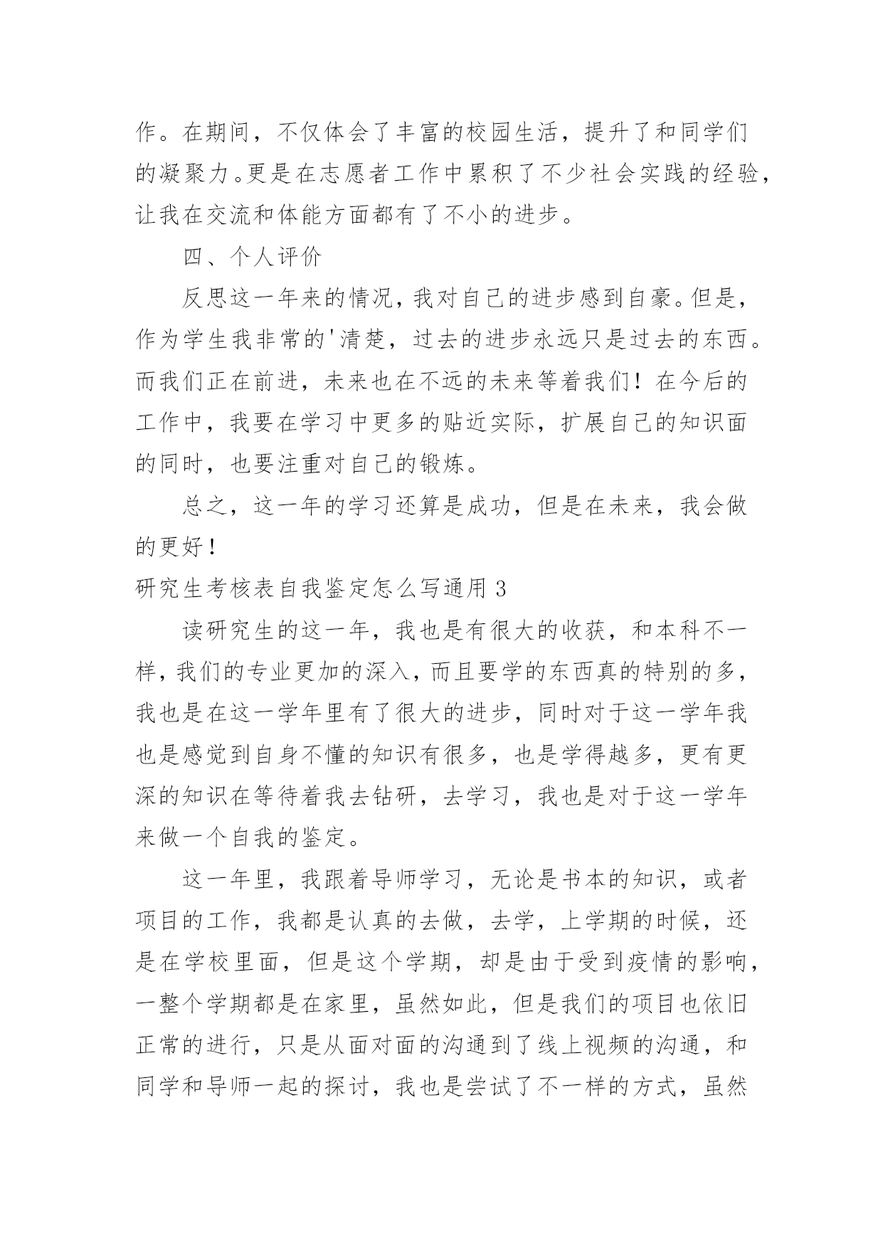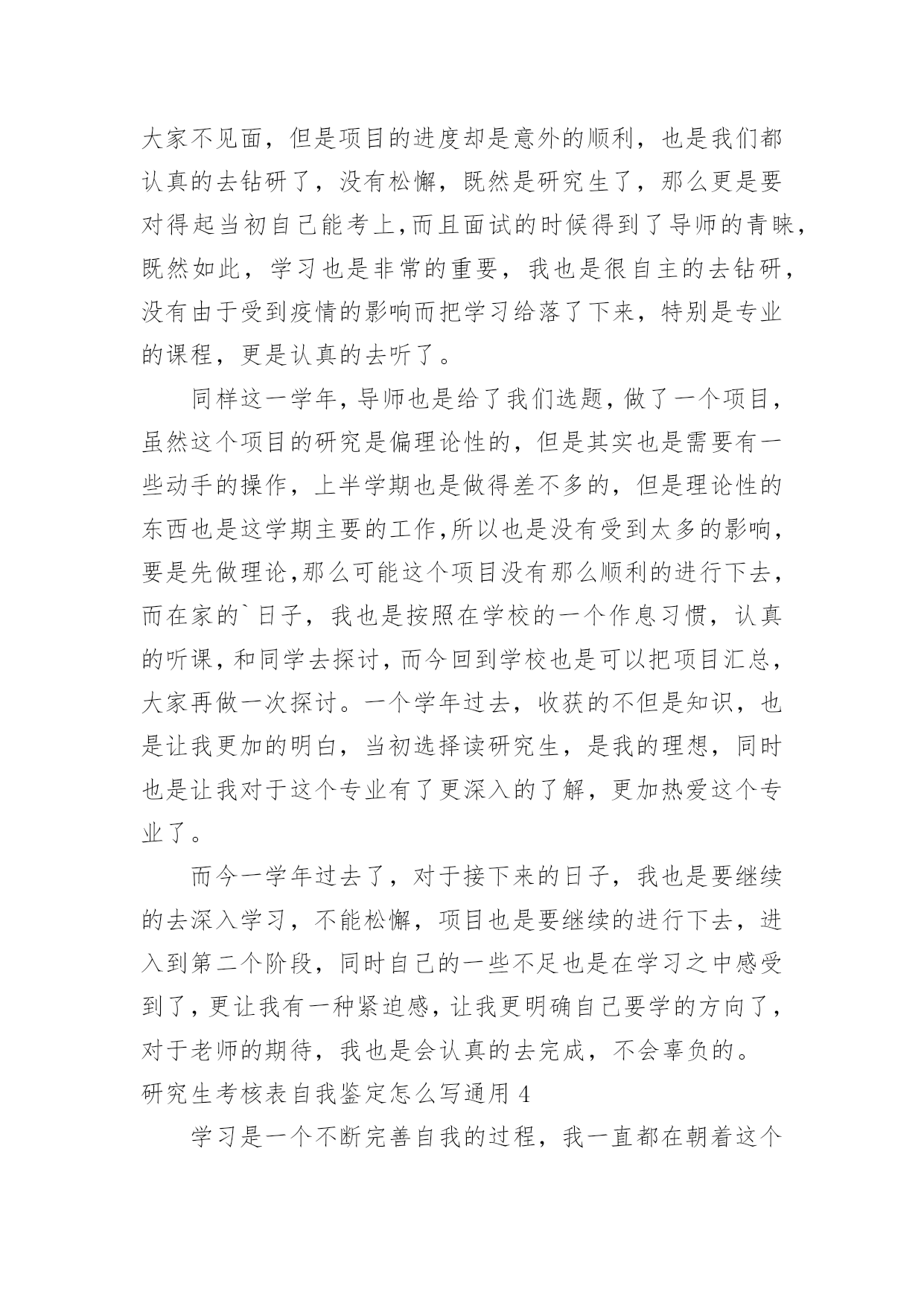 研究生考核表自我鉴定怎么写研究生考核表自我鉴定怎么写通用自我鉴定是一个人在某个阶段的学习和工作生活等表现的一个自我总结,自我鉴定可以总结以往思想,发扬成绩,因此我们要做好总结,写好自我鉴定。那么自我鉴定应该包括什么内容呢?以下是小编帮大家整理的研究生考核表自我鉴定怎么写通用,仅供参考,大家一起来看看吧。研究生考核表自我鉴定怎么写通用1这一年来的学习已然结束了,研究生学习阶段已经过去一年的时间,我对自己还是非常肯定的,这一年来,我积极认真端正心态,什么时候都秉着积极向上的状态,不会因为自己做了什么事情而感到内疚,更多的时候,我需要端正好态度,现在想了想,这些还是会努力去做好自己的,作为一名研究生,我对自己的要求也比较高,深刻地感受到学习当中的一些难题所在,不能够马虎,不能够忽视,一定要重视起来,今后的学习当中,肯定会有更多的挑战,等着我,我会一一克服,这是自己的一个提高,对于这一年来的研究生学习状态,我也做一个客观评价。我不是一个特别喜欢去说的人,一直以来,这也是我行事准则吧!有什么事情就会去行动,在学习上面,我现在更加清楚了,自己应该要如何去行动了,学习本身就是一个很重要的.事情,与我而言,现阶段就是需要去悟实自己的基础,巩固过去所学的知识,面对即将到的社会压力,我现在也是感觉需要做好一些基本的事情,不管是在什么时候,都应该清楚这一点,我也意识到了,在接下来的学习当中肯定会遇到很多问题,当然我会一去努力,在学习当中,我认为自己是没什么问题的,我会果断的处理困扰自己的每一件事情,这也是我的行事风格。在生活当中,我平易近人吧,我对待周围的同学也是比较宽容的,周围的朋友都是比这积极向上,融入到一个积极向上的交友圈子,或者环境里面,对于我而言,是一种非常大的幸运,我对自己现在的交友圈也比较高,我希望自己能够正派一点,能够积极一点,乐观一点,心态向上的话,肯定会更加好研究生的学习生涯不是很长,但是一年的学习已经结束,我需要去面对的有更多事了,还是要为自己而考虑的,生活上面不能马虎大意,对自己的要求比较高,也是对自己的负责,我坚信这一点始终会保持下去,未来的学习生活肯定会更想到我,我会陆续做好这些的,我不是一个对自己没有方向的人,这一年的经历来更加如此,而是我更加清楚自己要做什么事情,下一阶段朝着自己坚持的方向努力吧,肯定会有一定的收获。研究生考核表自我鉴定怎么写通用2又是一个学年的结束,转眼间我已经即将踏入第x年的学习了。走过了这几年,我在专业方面有了很大的提升,也有了一些自己的思考。而在这一个学年里,我更是获得了不少的进步和改变,为此,我在此对这个学年个人在各个方面的变化做自我鉴定如下:一、思想方面在这一年的学习中,我并没有落下自己对思想的学习。尤其是在个人的道德上,我更是不断的反省,让自己能得到提升。这一年里,我常在空闲的午后阅读,提升个人修养的同时,也在关注着身边的国家大事。并在这个学年积极的去参加过志愿者活动,为社区贡献自己的力量。而在这些体会中,我也更是进一步抓住了自己的想法,对自己的不足和缺点,也有了更深刻的认识。当然,在空闲的时候,我也常常会关注企业和市场的发展,通过情况的变动对自己的发展进步做出一定的调整,更是为了将来做打算和计划。二、学习方面在学习上,我专心与自己的学业,并在学习中检讨自己,发信啊自己的优势和不足。并且在这一学年通过对自己规定的计划,积极的发展自己在专业上的优势,但也不忘弥补自己的不足,让自己的优点更加明显、出色。此外,我也没有忘记其他的知识的累积,争取让自己想着全方面人才发展,但主要还是会着重于优势的培养。并且在学习期间,我还按照计划参加了专业证书的考试,顺利的取得了一些成绩。三、生活方面生活中,我尊敬师长,热爱和同学们交流学习,并且在这一学年我积极的参与了各种校园活动以及社区志愿者工作。在期间,不仅体会了丰富的校园生活,提升了和同学们的凝聚力。更是在志愿者工作中累积了不少社会实践的经验,让我在交流和体能方面都有了不小的进步。四、个人评价反思这一年来的情况,我对自己的进步感到自豪。但是,作为学生我非常的'清楚,过去的进步永远只是过去的东西。而我们正在前进,未来也在不远的未来等着我们!在今后的工作中,我要在学习中更多的贴近实际,扩展自己的知识面的同时,也要注重对自己的锻炼。总之,这一年的学习还算是成功,但是在未来,我会做的更好!研究生考核表自我鉴定怎么写通用3读研究生的这一年,我也是有很大的收获,和本科不一样,我们的专业更加的深入,而且要学的东西真的特别的多,我也是在这一学年里有了很大的进步,同时对于这一学年我也是感觉到自身不懂的知识有很多,也是学得越多,更有更深的知识在等待着我去钻研,去学习,我也是对于这一学年来做一个自我的鉴定。这一年里,我跟着导师学习,无论是书本的知识,或者项目的工作,我都是认