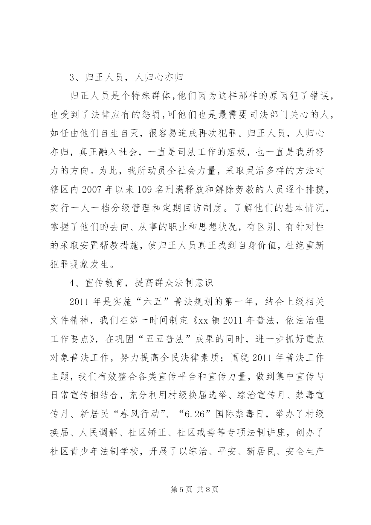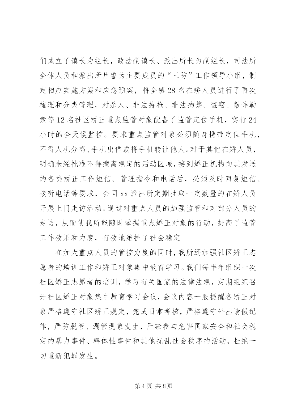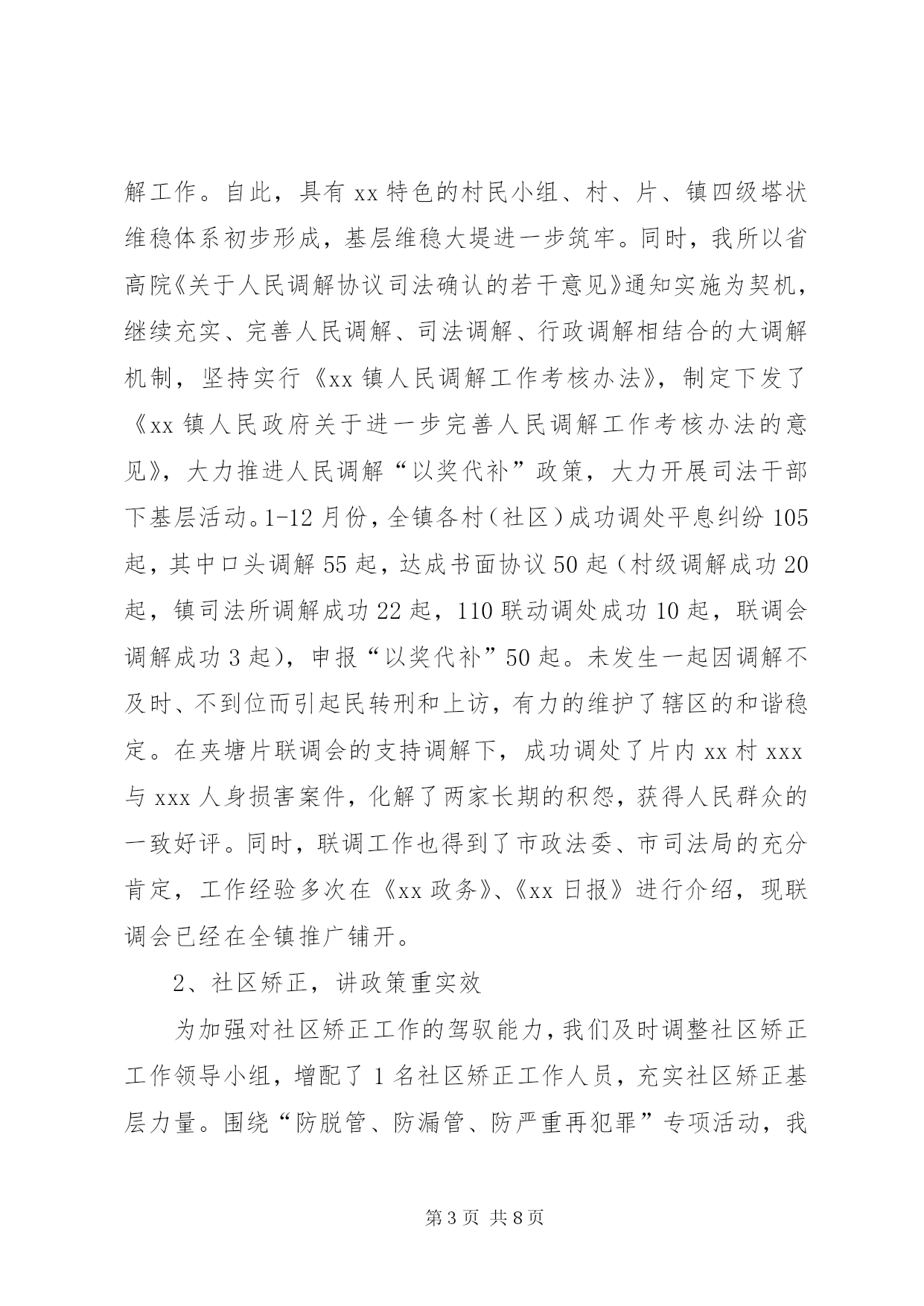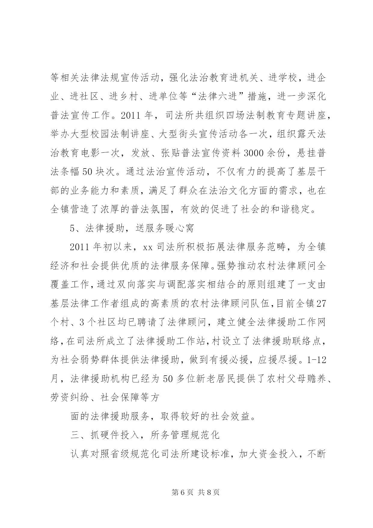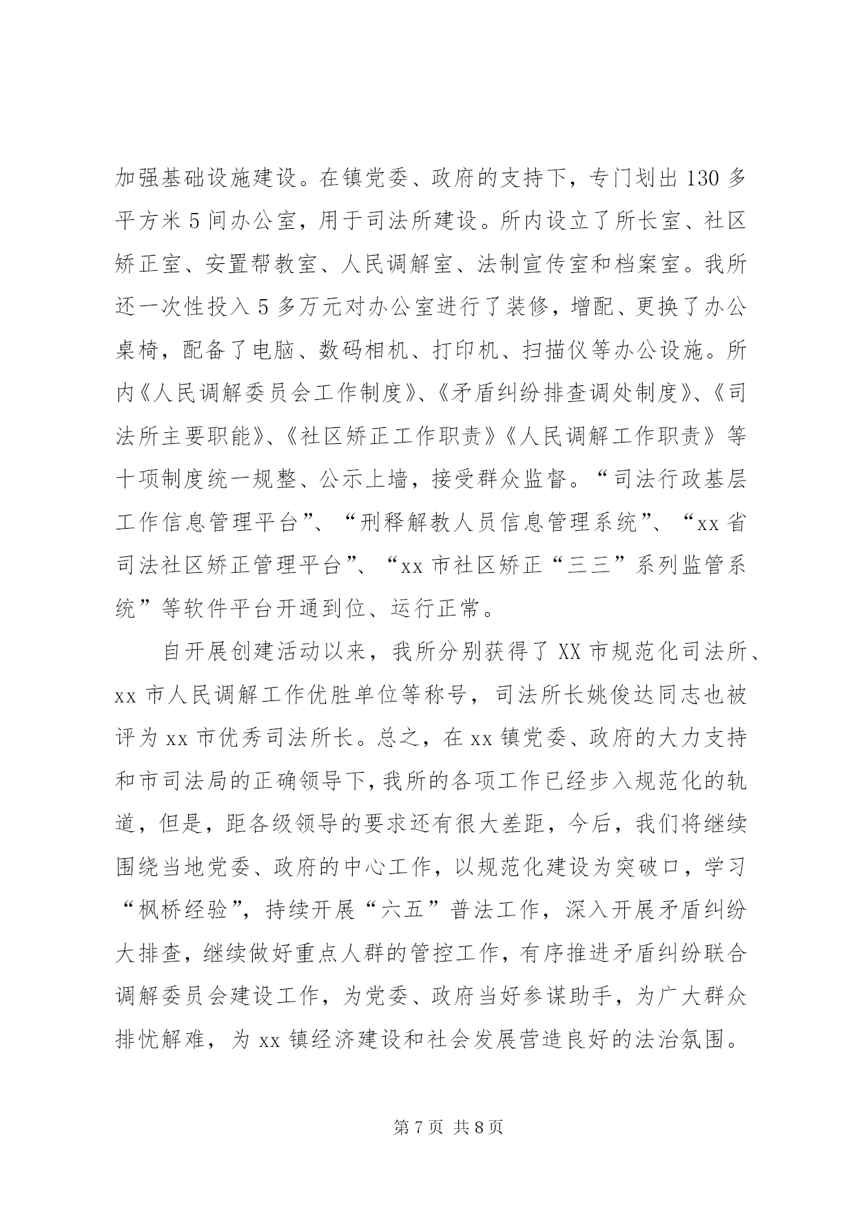 第PAGE\*Arabic\*MERGEFORMAT8页共NUMPAGES\*MERGEFORMAT8页XX司法所规范化司法所创建工作汇报材料xx司法所规范化司法所创建工作汇报材料尊敬的各位领导:xx镇位于xx市东南部,总面积118平方公里,辖27个行政村、3个社区,常住人口5.7万人,是一个集贸工农为一体,以历史文化和自然风光为特色的省级中心镇。全镇旅游三产资源丰富,有xx故里、xx仙景、红色之旅等特色旅游产品,是全国亿万农民健身活动先进镇、全国文明镇、全国千强镇、国家级生态镇、省卫生镇、省教育强镇、省旅游名镇。2011年伊始,我们按照《xx省星级规范化司法所考评标准》要求,在镇党委、政府的正确领导下,在市司法局的指业务导下,内修素质,外树形象,大力开展以组织机构建设、队伍建设、业务建设、基础设施建设和制度建设为主要内容的司法所规范化建设工作,作用显著,成效明显,符合省级规范化司法所创建工作标准。下面就xx司法所规范化创建工作汇报如下:一、抓内部建制,队伍建设规划化2011年初,我们牢牢把握省级规范化司法所创建活动的契机,在镇党委政府和市司法局的帮助指导下,有重点分批次对司法所成员进行了适当调整。如今的xx司法所拥有专职工作人员7名,其中司法行政编制2人,全部为大专以上学历,其中一人具备硕士研究生学历。所内设有人民调解、社区矫正、安置帮教、普法依法治理等一系列专项工作小组和队伍,司法所实行所长负责制,人员分工明确,任务到位,职责清晰,基本实现专人专管。所内办公经费实行无障碍审批,社区矫正资金实行专款专用,岗位津贴足额发放到位。司法所是面向群众的最基层,是维护社会稳定的第一线。为使司法工作不断贴近农村实际,不断符合群众需求,我所每年都组织人员参加省、市司法局组织的业务培训并及时做好政策法规的落地消化工作。通过长时间的培训积累,我所工作人员各项业务精通、工作熟练,能够制作规范的调解协议书和常用的法律文书,特别是在一些重大、疑难矛盾纠纷中,善于抓住问题的关键,及时有效地化解和调处矛盾,起到“调解一件,教育一片”的效果,得到了人民群众的信任和党委、政府的好评。二、抓业务建设,业务工作规范化1、人民调解,创新工作思路按照“小事不出村,大事不出镇,矛盾不上交”的调处工作目标,我所经过大量的走访调研,决定充分利用社会资源,探索人民调解社会化发展之路,6月,制定下发了《xx镇关于组织实施联合调解组织的实施意见》,并以xx、xx、xxx等三村为中心的试点成立夹塘片矛盾纠纷联合调解委员会。通过推荐、自荐等方式从片内各村选派1-2名具有一定影响力、能够为群众办事、愿意为群众办事的“老娘舅”式的人员专门从事片内矛盾纠纷调解工作。自此,具有xx特色的村民小组、村、片、镇四级塔状维稳体系初步形成,基层维稳大堤进一步筑牢。同时,我所以省高院《关于人民调解协议司法确认的若干意见》通知实施为契机,继续充实、完善人民调解、司法调解、行政调解相结合的大调解机制,坚持实行《xx镇人民调解工作考核办法》,制定下发了《xx镇人民政府关于进一步完善人民调解工作考核办法的意见》,大力推进人民调解“以奖代补”政策,大力开展司法干部下基层活动。1-12月份,全镇各村(社区)成功调处平息纠纷105起,其中口头调解55起,达成书面协议50起(村级调解成功20起,镇司法所调解成功22起,110联动调处成功10起,联调会调解成功3起),申报“以奖代补”50起。未发生一起因调解不及时、不到位而引起民转刑和上访,有力的维护了辖区的和谐稳定。在夹塘片联调会的支持调解下,成功调处了片内xx村xxx与xxx人身损害案件,化解了两家长期的积怨,获得人民群众的一致好评。同时,联调工作也得到了市政法委、市司法局的充分肯定,工作经验多次在《xx政务》、《xx日报》进行介绍,现联调会已经在全镇推广铺开。2、社区矫正,讲政策重实效为加强对社区矫正工作的驾驭能力,我们及时调整社区矫正工作领导小组,增配了1名社区矫正工作人员,充实社区矫正基层力量。围绕“防脱管、防漏管、防严重再犯罪”专项活动,我们成立了镇长为组长,政法副镇长、派出所长为副组长,司法所全体人员和派出所片警为主要成员的“三防”工作领导小组,制定相应实施方案和应急预案,将全镇28名在矫人员进行了再次梳理和分类管理,对杀人、非法持枪、非法拘禁、盗窃、敲诈勒索等12名社区矫正重点监管对象配备了监管定位手机,实行24小时的全天候监控。要求重点监管对象必须随身携带定位手机,不得人机分离、手机出借或将手机转让他人。对于其他在矫人员,明确未经批准不得擅离规定的活动区域,接到矫正机构向其发送的各类矫正工作短信、管理指令和电话后,必须及时回复短信、接听电话等要求,会同xx派出所定期抽取一定数量的在矫人员开展上门走访活动。通过对重点人员的加
