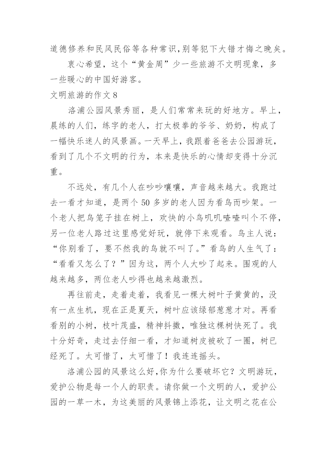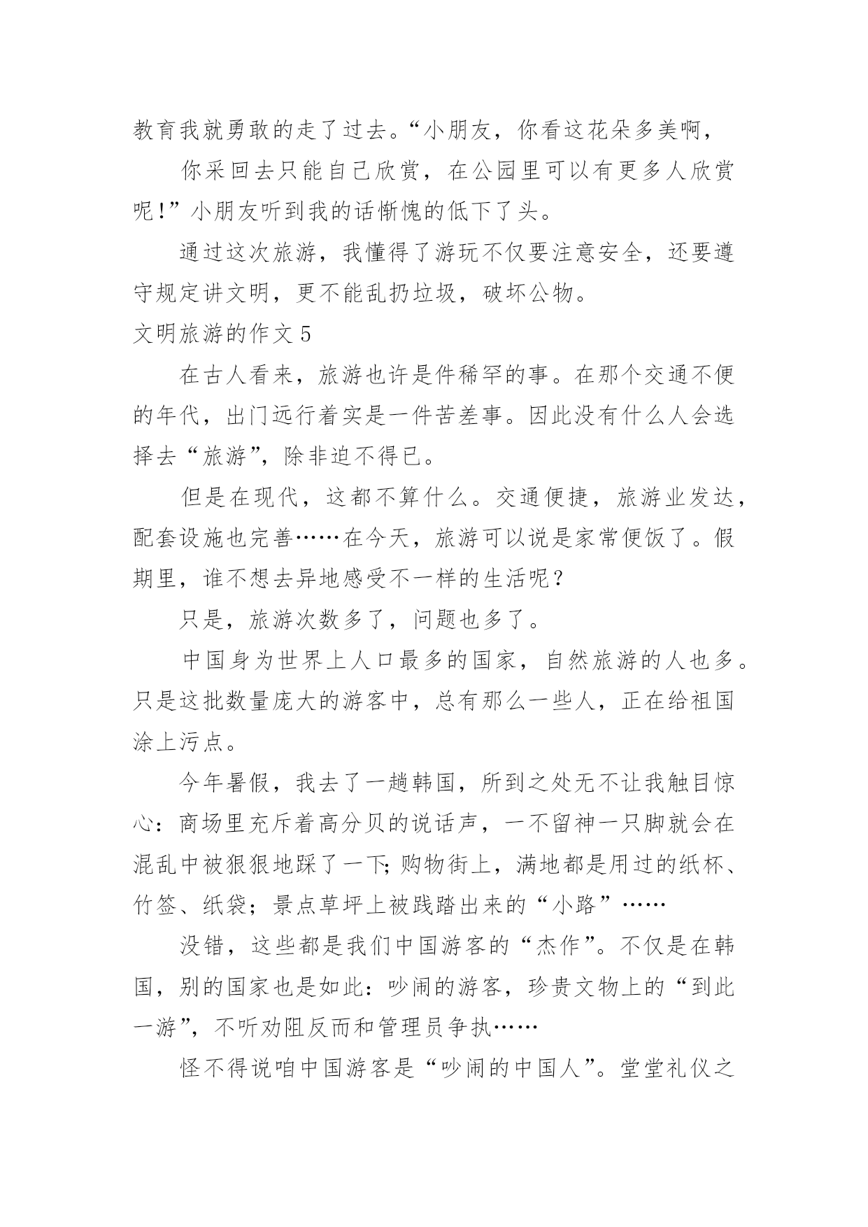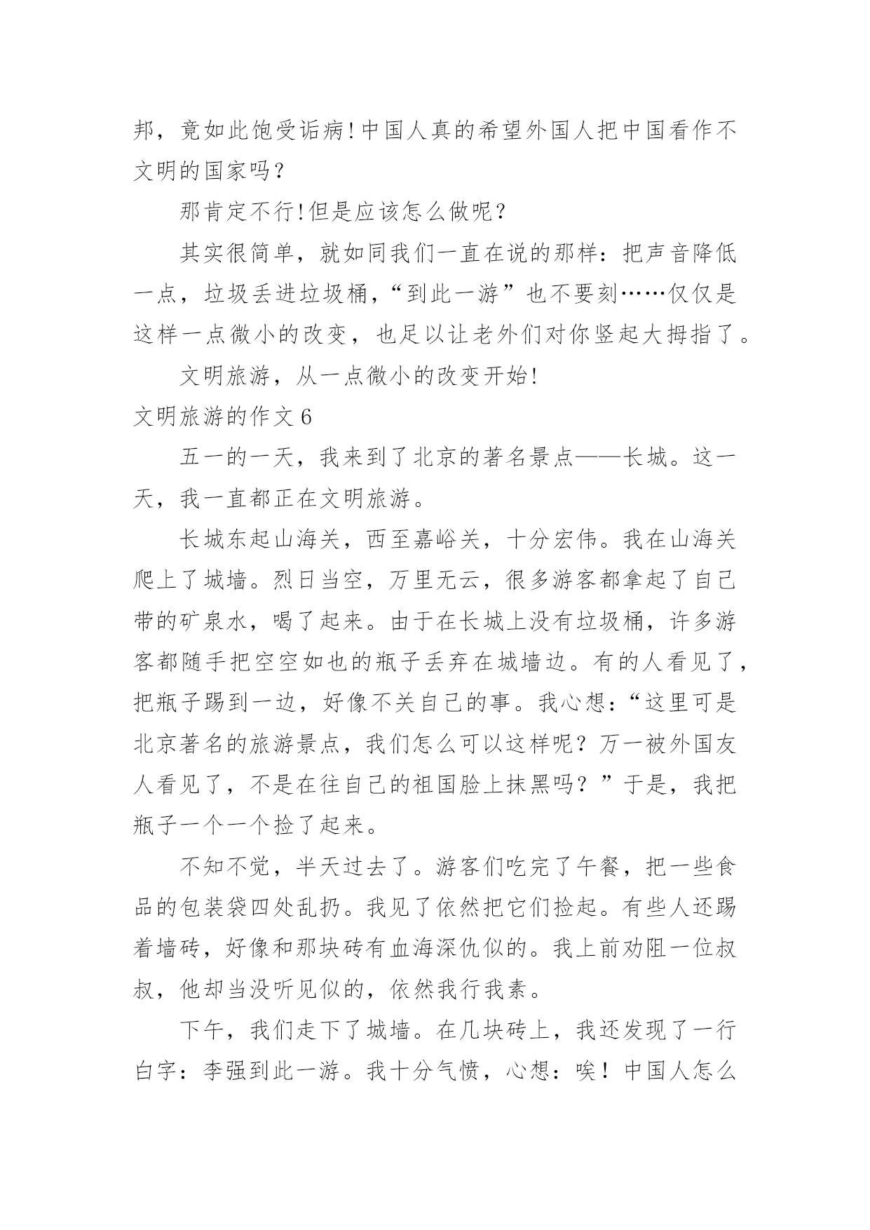 文明旅游的作文文明旅游的作文8篇在我们平凡的日常里,大家都写过作文吧,借助作文可以提高我们的语言组织能力。你所见过的作文是什么样的呢?以下是小编精心整理的文明旅游的作文,希望能够帮助到大家。文明旅游的作文1碧绿的草地上,一个塑料瓶子随风滚动,你是否会将它捡起扔进不远的垃圾桶?清澈的小溪边,一个易拉罐格外惹眼,你是将它踢进河里还是捡起来?在十一黄金周里,我在千岛湖和炮台山就遇到了这两件事情,结果真的很让人痛心,国人的素质应该在此也可见一斑了。千岛湖边的游步道上,一个小女孩随手将一个昆仑山矿泉水瓶扔进了草坪里。我捡了起来,跑到小女孩跟前:“小朋友,乱扔垃圾是不对的。”这时,她的父亲——一个带着墨镜的中年男子——鄙视地看了我一眼,拉着小女孩的手迅速走掉了。很显然,他想逃避这个问题。或者,在他的眼里“这不是我的家”——子不教,父之过,你说这个人猥琐吗?如果每个人都往草坪上扔一个饮料瓶,后果会总是可想而知的。炮台山的农家乐旁,潺潺的溪水掩映着连绵起伏的群山,多好的景致啊!突然,传来一个瓶子落水的声音——一个男孩子在踢易拉罐。我没作声,下水将易拉罐捞了上来。可没多久,他又将易拉罐踢下了水去。我有些生气:“大自然是我们自己的,你干嘛要破坏环境?”他也没好气的说:“你想挨揍吗?”这种语气,我恨不得一块板砖敲死他!真是没教养!虽然中国文明旅游的风气比前两年好了很多,但是还有很大的提升空间。政府应该加大宣传力度,才能让人们的行为更加文明,更有素养。真心希望以后再也看不到乱扔垃圾这些与文明背道而驰的事情!文明旅游的作文2中国是一个历史悠久的文明古国,可如今,进入了21世纪,人们的文明意识越来越差,那么,我们现在就来谈一谈文明这个话题吧!同学们,如果你走在路上,突然发现一个外国人随手把一张废纸往地下一扔,你会不会觉得,这个人的素质很差,而且这个外国人所在的国家素质也好不到哪儿去?没错,我和你的感觉一样,所以说,“在国内扔一张纸不算什么,在国外丢了十四亿人的脸哪!”我们常常将维护周边的环境卫生挂在嘴边,可是又有多少人能够实实在在的从自己做起,从自己身边的一张废纸做起呢?俗话说“恶语一句三冬寒,好言好语暖人心”。这,就是使用文明语言会产生的魔力。对个人而言,礼仪体现了人的教养、风度和魅力,还体现出一个人对社会的认知水准、个人学识、修养和价值。所以,德国著名的思想家,歌德,曾说——一个人的礼貌是一面照出它肖像的镜子。微笑是一种无声的语言,是不用翻译的全世界通用的语言。当你在学校的走廊穿梭,见到老师时,伴着微笑对老师说:“老师您好!”老师会觉得这位老师教出来得学生很有礼貌;当你在国外对一个外国人一个微笑,他会觉得这个国家的人民很有礼貌,很有修养……所以做一个讲文明的人是社会的需要、也是做人的需要、更是国际形势的需要!中华民族是文明之邦,今天的中国人走出国门更要让人刮目相看!让人肃然起敬!文明旅游的作文3文明在我们身边,文明在我们生活中;文明,无处不在,一个小小的举动便可看出你是否是个文明公民;文明,随时随般出现在你的身边,只要你只是个细心人,就会发现文明的存在,既然有文明的存在,那也有不文明的存在。有一次,我便见到这样一幕情景。在一个晴朗的一天,我出去玩,路上走着走着看见一个人随地乱扔垃圾,一旁好多个人看见想去斥责那个年轻人,但又欲言又止,似乎在顾虑着什么,埋怨几句便走了,脸上十分地气愤。见此情景,是一个人便会十分地气愤,也许都会想,这个人怎么这样,不讲公德心,随便丢垃圾,可真是没有教养!这是我们大家共同的环境家园,怎么能如此破坏呢?真是的!让人怎么能忍下去。相信许多人都会有这样的共鸣,那么就请您从身边的小事做起爱环境。虽然有这不文明的举止,但在社会上人民体现最多的事是文明。其实,在社会上,经常能见到许多文明的事。有个人见到地上的垃圾弯腰捡起,有了垃圾也丢进垃圾桶,按垃圾分类将垃圾丢入垃圾桶……这样微不足道的小事,微小到不能再小,根本不足挂齿,但这些小事是却体现了文明,体现出中国是个礼仪之邦,是个文明大国。为了创造文明的.气氛,让大家一起来行动吧!文明旅游的作文4今天是5月1日劳动节,天气十分晴朗。我和妈妈一起去公园玩。在去的路上,妈妈告诉我说:“今天外面人和车都特别多一定要注意安!。”“知道了”我开心地说。我们坐了很长时间的车,终于到公园了。妈妈连忙牵着我的手说:“在公园里人太多,可不能乱跑。”“我明白了”我小声地说。我们走着走着来到了一个草坪上,我把垃圾随手一扔。妈妈连忙说:“不能把垃圾扔在草坪上。”“噢!”我惭愧的把垃圾捡了起来。一路上走走停停,玩了很多我想玩的地方。这时我看见花园里有好多美丽、娇艳的花朵。有一朵特别漂亮,我想:如果把它摘下来插到家里的花盆里一定非常漂亮!正当我异想天开时,只见一个小朋友伸手在采摘那朵花,妈妈说:“好花留给大家看,怎