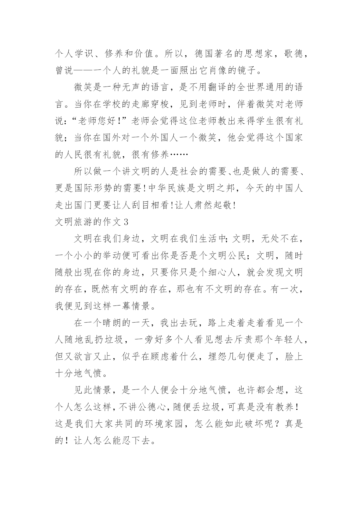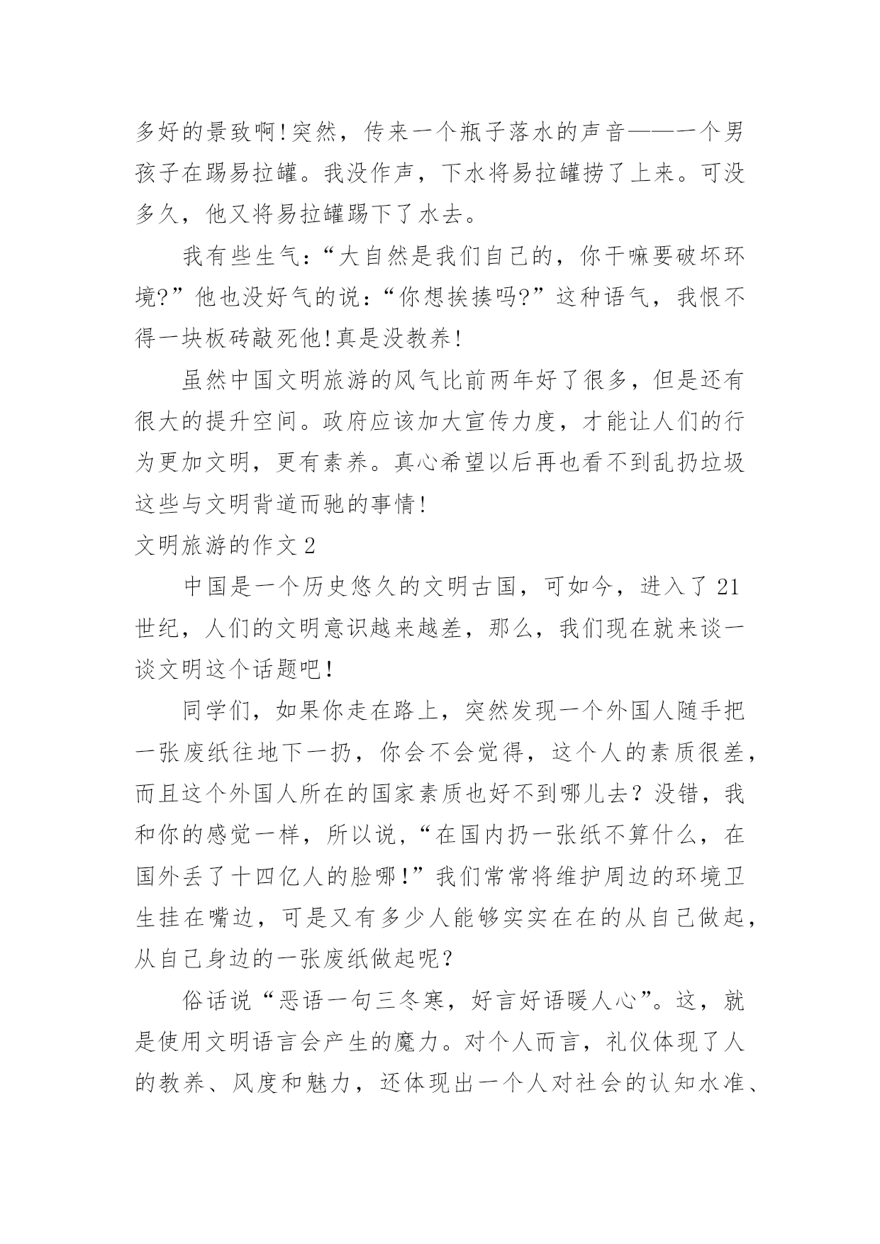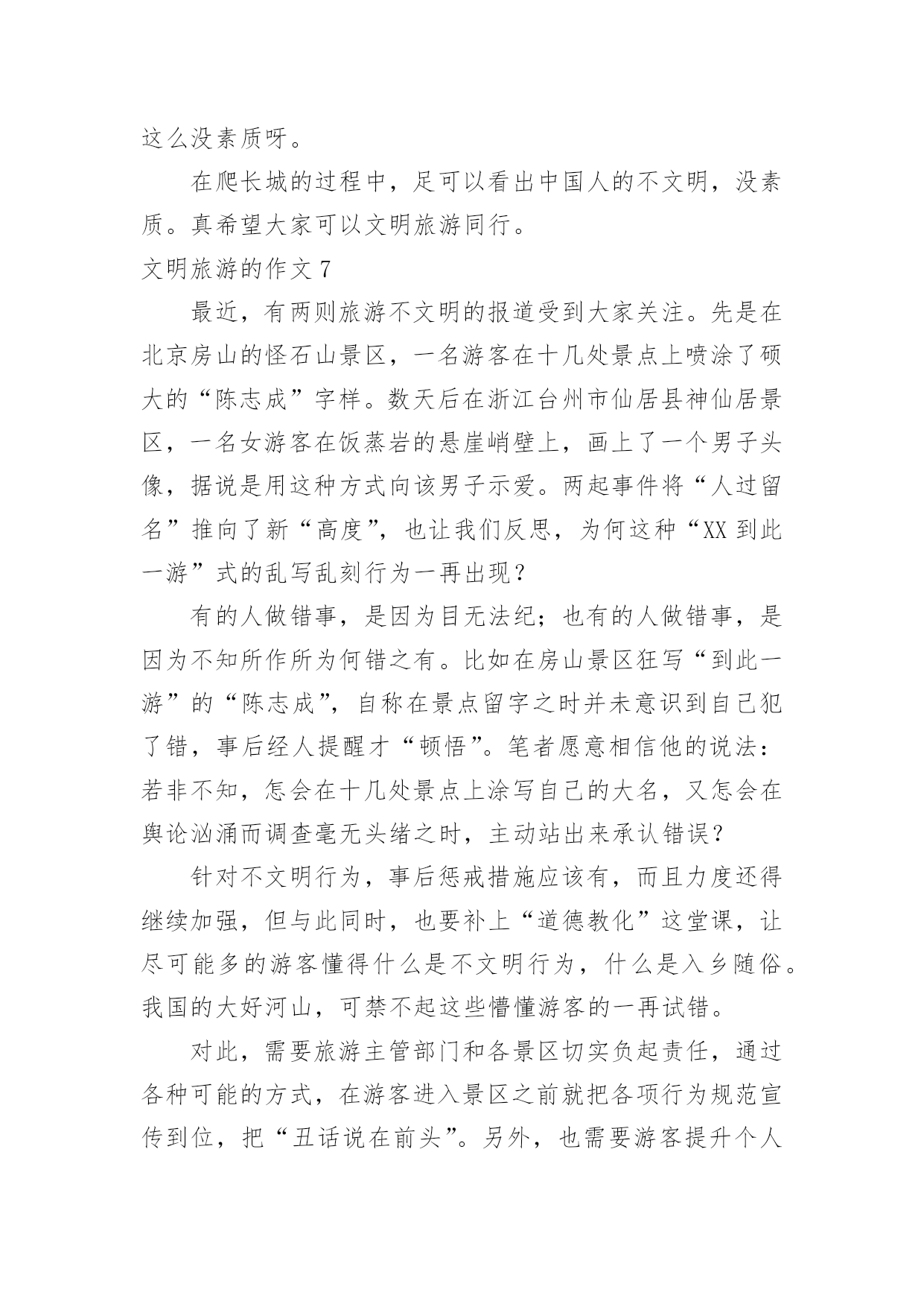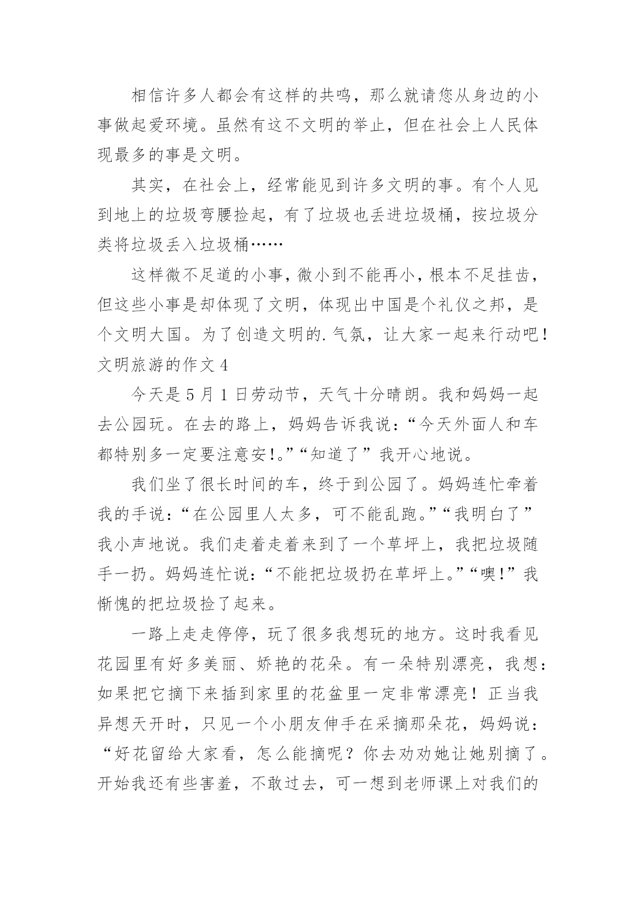文明旅游的作文文明旅游的作文8篇在我们平凡的日常里,大家都写过作文吧,借助作文可以提高我们的语言组织能力。你所见过的作文是什么样的呢?以下是小编精心整理的文明旅游的作文,希望能够帮助到大家。文明旅游的作文1碧绿的草地上,一个塑料瓶子随风滚动,你是否会将它捡起扔进不远的垃圾桶?清澈的小溪边,一个易拉罐格外惹眼,你是将它踢进河里还是捡起来?在十一黄金周里,我在千岛湖和炮台山就遇到了这两件事情,结果真的很让人痛心,国人的素质应该在此也可见一斑了。千岛湖边的游步道上,一个小女孩随手将一个昆仑山矿泉水瓶扔进了草坪里。我捡了起来,跑到小女孩跟前:“小朋友,乱扔垃圾是不对的。”这时,她的父亲——一个带着墨镜的中年男子——鄙视地看了我一眼,拉着小女孩的手迅速走掉了。很显然,他想逃避这个问题。或者,在他的眼里“这不是我的家”——子不教,父之过,你说这个人猥琐吗?如果每个人都往草坪上扔一个饮料瓶,后果会总是可想而知的。炮台山的农家乐旁,潺潺的溪水掩映着连绵起伏的群山,多好的景致啊!突然,传来一个瓶子落水的声音——一个男孩子在踢易拉罐。我没作声,下水将易拉罐捞了上来。可没多久,他又将易拉罐踢下了水去。我有些生气:“大自然是我们自己的,你干嘛要破坏环境?”他也没好气的说:“你想挨揍吗?”这种语气,我恨不得一块板砖敲死他!真是没教养!虽然中国文明旅游的风气比前两年好了很多,但是还有很大的提升空间。政府应该加大宣传力度,才能让人们的行为更加文明,更有素养。真心希望以后再也看不到乱扔垃圾这些与文明背道而驰的事情!文明旅游的作文2中国是一个历史悠久的文明古国,可如今,进入了21世纪,人们的文明意识越来越差,那么,我们现在就来谈一谈文明这个话题吧!同学们,如果你走在路上,突然发现一个外国人随手把一张废纸往地下一扔,你会不会觉得,这个人的素质很差,而且这个外国人所在的国家素质也好不到哪儿去?没错,我和你的感觉一样,所以说,“在国内扔一张纸不算什么,在国外丢了十四亿人的脸哪!”我们常常将维护周边的环境卫生挂在嘴边,可是又有多少人能够实实在在的从自己做起,从自己身边的一张废纸做起呢?俗话说“恶语一句三冬寒,好言好语暖人心”。这,就是使用文明语言会产生的魔力。对个人而言,礼仪体现了人的教养、风度和魅力,还体现出一个人对社会的认知水准、个人学识、修养和价值。所以,德国著名的思想家,歌德,曾说——一个人的礼貌是一面照出它肖像的镜子。微笑是一种无声的语言,是不用翻译的全世界通用的语言。当你在学校的走廊穿梭,见到老师时,伴着微笑对老师说:“老师您好!”老师会觉得这位老师教出来得学生很有礼貌;当你在国外对一个外国人一个微笑,他会觉得这个国家的人民很有礼貌,很有修养……所以做一个讲文明的人是社会的需要、也是做人的需要、更是国际形势的需要!中华民族是文明之邦,今天的中国人走出国门更要让人刮目相看!让人肃然起敬!文明旅游的作文3文明在我们身边,文明在我们生活中;文明,无处不在,一个小小的举动便可看出你是否是个文明公民;文明,随时随般出现在你的身边,只要你只是个细心人,就会发现文明的存在,既然有文明的存在,那也有不文明的存在。有一次,我便见到这样一幕情景。在一个晴朗的一天,我出去玩,路上走着走着看见一个人随地乱扔垃圾,一旁好多个人看见想去斥责那个年轻人,但又欲言又止,似乎在顾虑着什么,埋怨几句便走了,脸上十分地气愤。见此情景,是一个人便会十分地气愤,也许都会想,这个人怎么这样,不讲公德心,随便丢垃圾,可真是没有教养!这是我们大家共同的环境家园,怎么能如此破坏呢?真是的!让人怎么能忍下去。相信许多人都会有这样的共鸣,那么就请您从身边的小事做起爱环境。虽然有这不文明的举止,但在社会上人民体现最多的事是文明。其实,在社会上,经常能见到许多文明的事。有个人见到地上的垃圾弯腰捡起,有了垃圾也丢进垃圾桶,按垃圾分类将垃圾丢入垃圾桶……这样微不足道的小事,微小到不能再小,根本不足挂齿,但这些小事是却体现了文明,体现出中国是个礼仪之邦,是个文明大国。为了创造文明的.气氛,让大家一起来行动吧!文明旅游的作文4今天是5月1日劳动节,天气十分晴朗。我和妈妈一起去公园玩。在去的路上,妈妈告诉我说:“今天外面人和车都特别多一定要注意安!。”“知道了”我开心地说。我们坐了很长时间的车,终于到公园了。妈妈连忙牵着我的手说:“在公园里人太多,可不能乱跑。”“我明白了”我小声地说。我们走着走着来到了一个草坪上,我把垃圾随手一扔。妈妈连忙说:“不能把垃圾扔在草坪上。”“噢!”我惭愧的把垃圾捡了起来。一路上走走停停,玩了很多我想玩的地方。这时我看见花园里有好多美丽、娇艳的花朵。有一朵特别漂亮,我想:如果把它摘下来插到家里的花盆里一定非常漂亮!正当我异想天开时,只见一个小朋友伸手在采摘那朵花,妈妈说:“好花留给大家看,怎