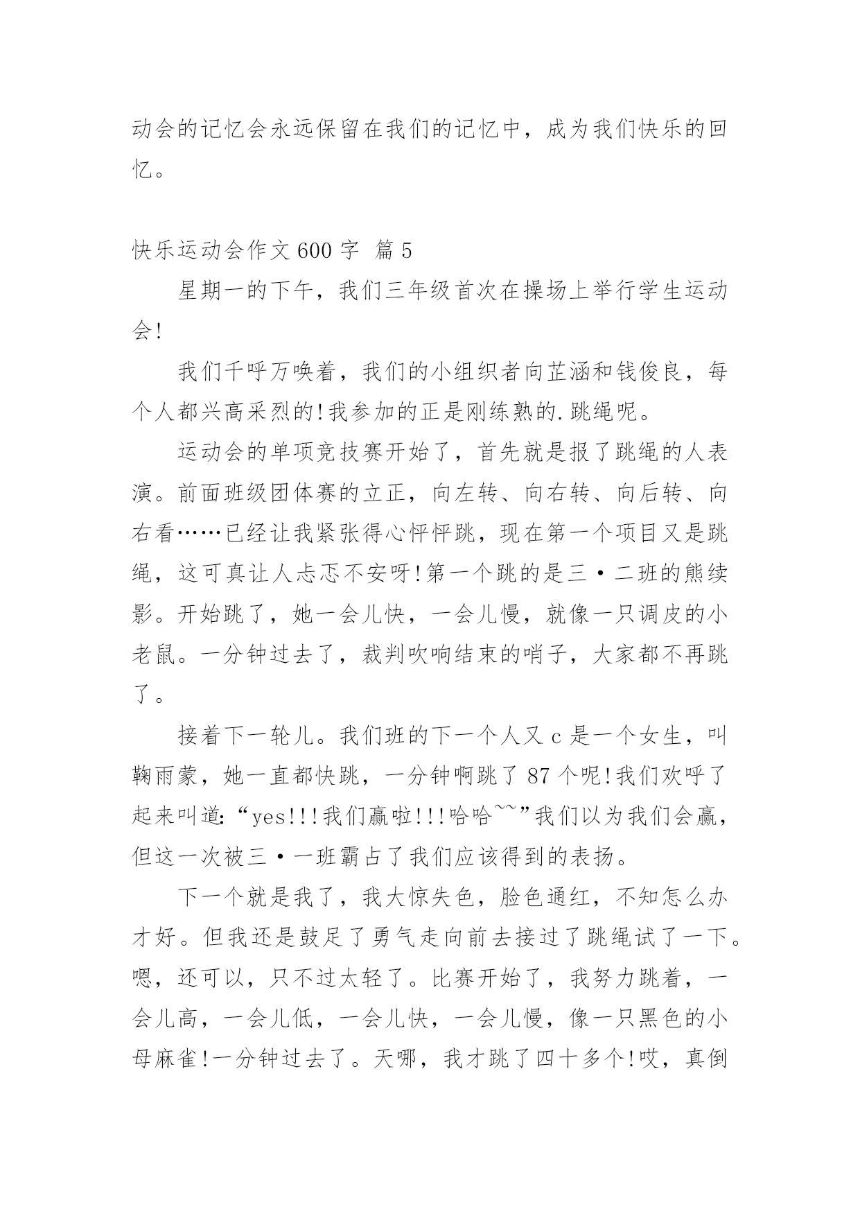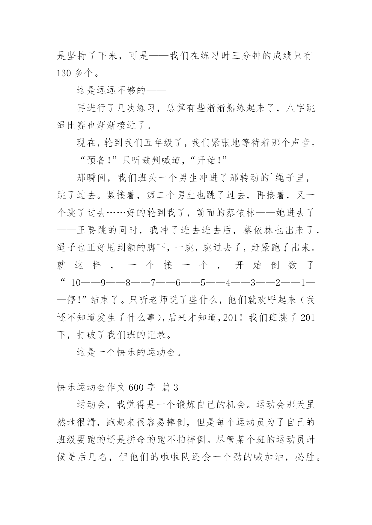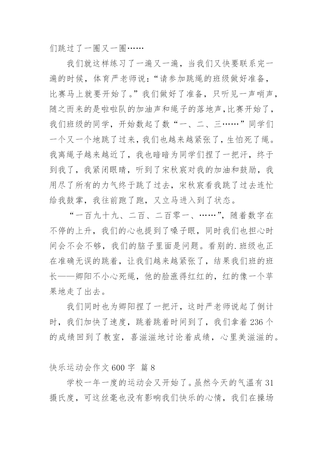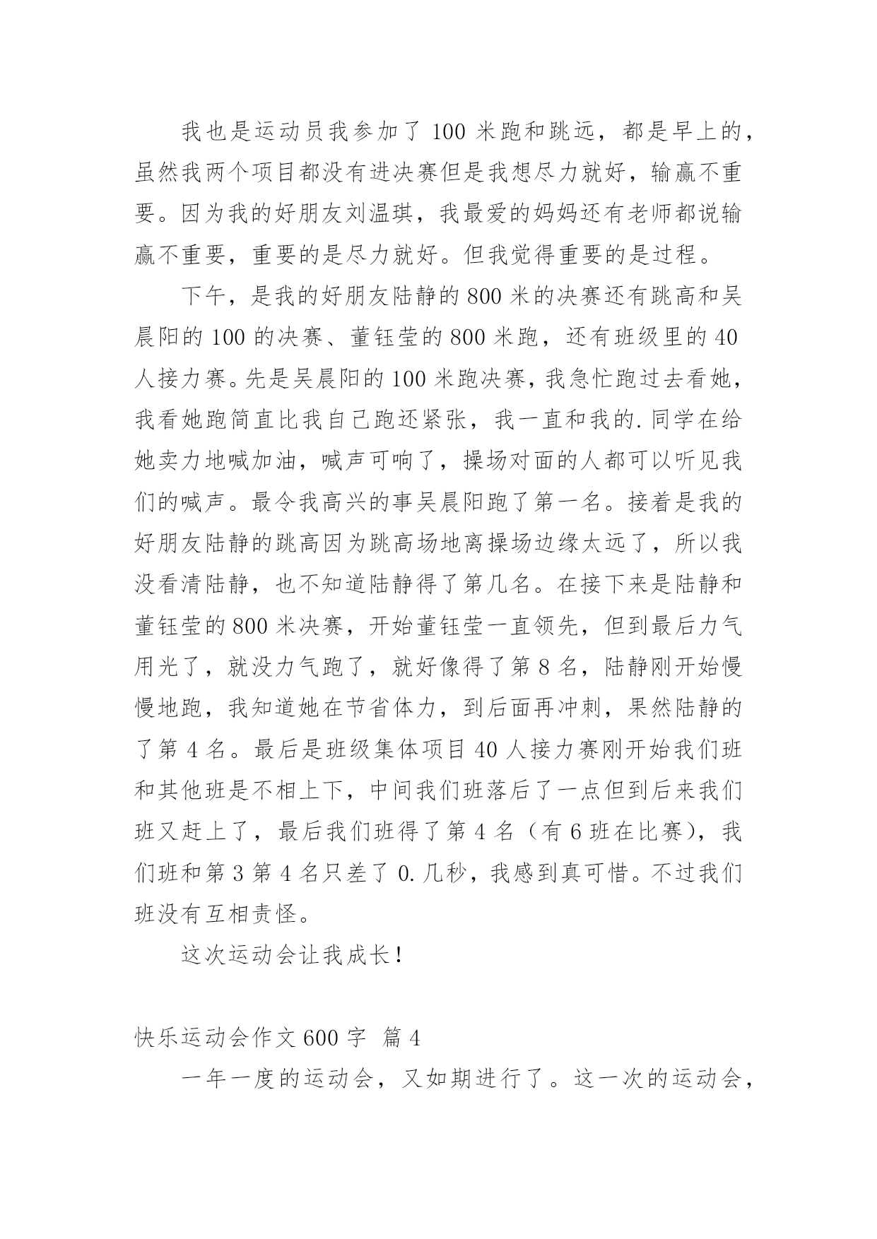 快乐运动会作文600字在我们平凡的日常里,大家都经常接触到作文吧,作文可分为小学作文、中学作文、大学作文(论文)。为了让您在写作文时更加简单方便,以下是小编整理的快乐运动会作文600字8篇,希望能够帮助到大家。快乐运动会作文600字篇1今天是我最期待的日子,你知道是什么日子啊?告诉你吧,今天可是我们学校第二届运动会啊!我早早的来到学校,发现其他同学比我来得更早,原来同学们都很期待今天的运动会啊!首先是开幕式表演,每个班级都表演一个节目。终于轮到我们班了,我们班表演的是古诗韵律操。随着《草》的音乐声响起,我们班开演表演了。我站在第一排看着那么多老师同学和家长,紧张得差点忘记动作了。我赶紧深呼吸一口气,让自己平静下来,好好的表演,我可不想给班级丢脸啊!开幕式完了以后就是太极功夫扇比赛,我们班表演的可认真了,大家都想为班级争光!紧接着就是各种单项比赛了,大家都很努力。加油声,呐喊声响成一片,很是振奋人心啊!同学们都忘记了火热的太阳,任凭汗水直流。我参加了投实心球的`比赛,由于平常在家没怎么练过,再加上心里紧张没有发挥最好的水平,成绩不是很好,我真是很沮丧!以后我得在家好好练习,争取下次能投得更好!最激动人心的时刻到了,那就是拔河比赛。每次拔河我们班都是输,真希望这次来赢啊!这次抽签又是抽到了三四班,她们班的家长全是重量级的,我真期待奇迹出现。拔河开始了,我使出了吃奶的力气在班上其他同学的加油声啊,我们都拼尽全力,可是最后还是输给了三四班。大家都很沮丧,还有同学伤心得哭了,我也在默默流眼泪。这次运动会虽然我们没有取得好的成绩,但是我们都努力过了,也就没有遗憾!期待下届运动会我班能拿第一!快乐运动会作文600字篇2我们学校在五月举行了运动会。我和我的好朋友许素非常轻松,只有一个趣味的八字跳绳,当然,参加“8字”跳绳的还有叶依非,蔡依林等人,加上甩绳的两人,总共有22人,几天的努力,在这个星期四,就要大展辉煌了!因为这几天是雨天,我们也好久都没有练习了,当然就很不熟练,早晨练习时,我就觉得双脚不如以前那样轻巧灵活了,就像绑着一个千斤铁环似的,沉重极了!当然跳起来也不咋地,许素的脚在前几天扭到了,叶依非的手在前几天练习时受伤了,包起了绷带,行动非常不方便。不过她们还是坚持了下来,可是——我们在练习时三分钟的成绩只有130多个。这是远远不够的——再进行了几次练习,总算有些渐渐熟练起来了,八字跳绳比赛也渐渐接近了。现在,轮到我们五年级了,我们紧张地等待着那个声音。“预备!”只听裁判喊道,“开始!”那瞬间,我们班头一个男生冲进了那转动的`绳子里,跳了过去。紧接着,第二个男生也跳了过去,再接着,又一个跳了过去……好的轮到我了,前面的蔡依林——她进去了——正要跳的同时,我冲了进去进去后,蔡依林也出来了,绳子也正好甩到额的脚下,一跳,跳过去了,赶紧跑了出来。就这样,一个接一个,开始倒数了“10——9——8——7——6——5——4——3——2——1——停!”结束了。只听老师说了些什么,他们就欢呼起来(我还不知道发生了什么事),后来才知道,201!我们班跳了201下,打破了我们班的记录。这是一个快乐的运动会。快乐运动会作文600字篇3运动会,我觉得是一个锻炼自己的机会。运动会那天虽然地很滑,跑起来很容易摔倒,但是每个运动员为了自己的班级要跑的还是拼命的跑不拍摔倒。尽管某个班的运动员时候是后几名,但他们的啦啦队还会一个劲的喊加油,必胜。我也是运动员我参加了100米跑和跳远,都是早上的,虽然我两个项目都没有进决赛但是我想尽力就好,输赢不重要。因为我的好朋友刘温琪,我最爱的妈妈还有老师都说输赢不重要,重要的是尽力就好。但我觉得重要的是过程。下午,是我的好朋友陆静的800米的决赛还有跳高和吴晨阳的100的决赛、董钰莹的800米跑,还有班级里的40人接力赛。先是吴晨阳的100米跑决赛,我急忙跑过去看她,我看她跑简直比我自己跑还紧张,我一直和我的.同学在给她卖力地喊加油,喊声可响了,操场对面的人都可以听见我们的喊声。最令我高兴的事吴晨阳跑了第一名。接着是我的好朋友陆静的跳高因为跳高场地离操场边缘太远了,所以我没看清陆静,也不知道陆静得了第几名。在接下来是陆静和董钰莹的800米决赛,开始董钰莹一直领先,但到最后力气用光了,就没力气跑了,就好像得了第8名,陆静刚开始慢慢地跑,我知道她在节省体力,到后面再冲刺,果然陆静的了第4名。最后是班级集体项目40人接力赛刚开始我们班和其他班是不相上下,中间我们班落后了一点但到后来我们班又赶上了,最后我们班得了第4名(有6班在比赛),我们班和第3第4名只差了0.几秒,我感到真可惜。不过我们班没有互相责怪。这次运动会让我成长!快乐运动会作文600字篇4一年一度的运动会,又如期进行了。这一次的运动会,因为我自己也加入了进去,使得这一次的