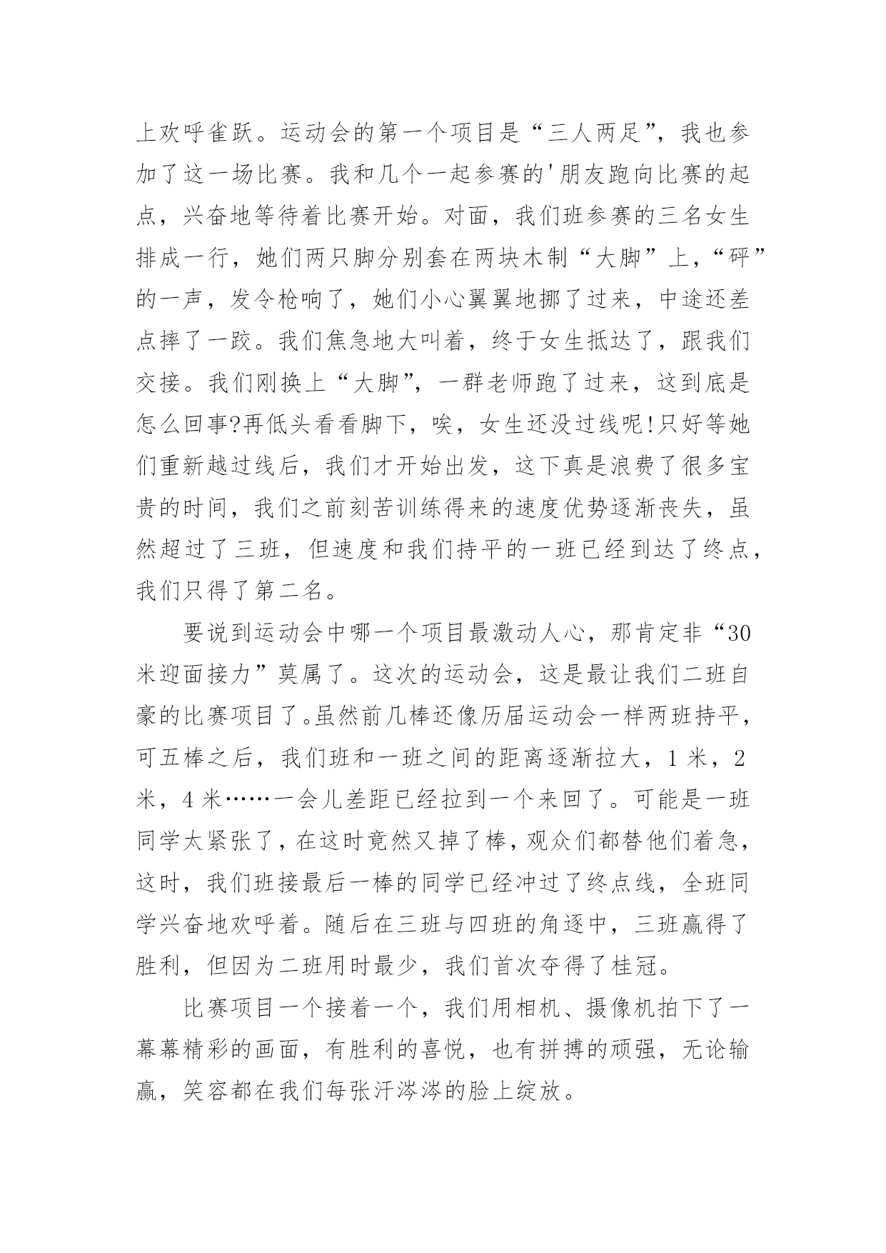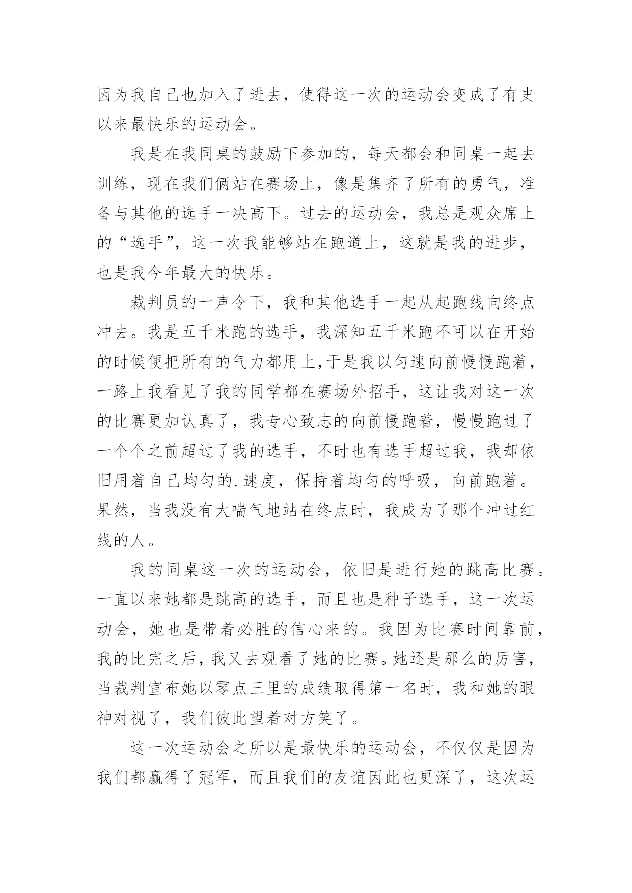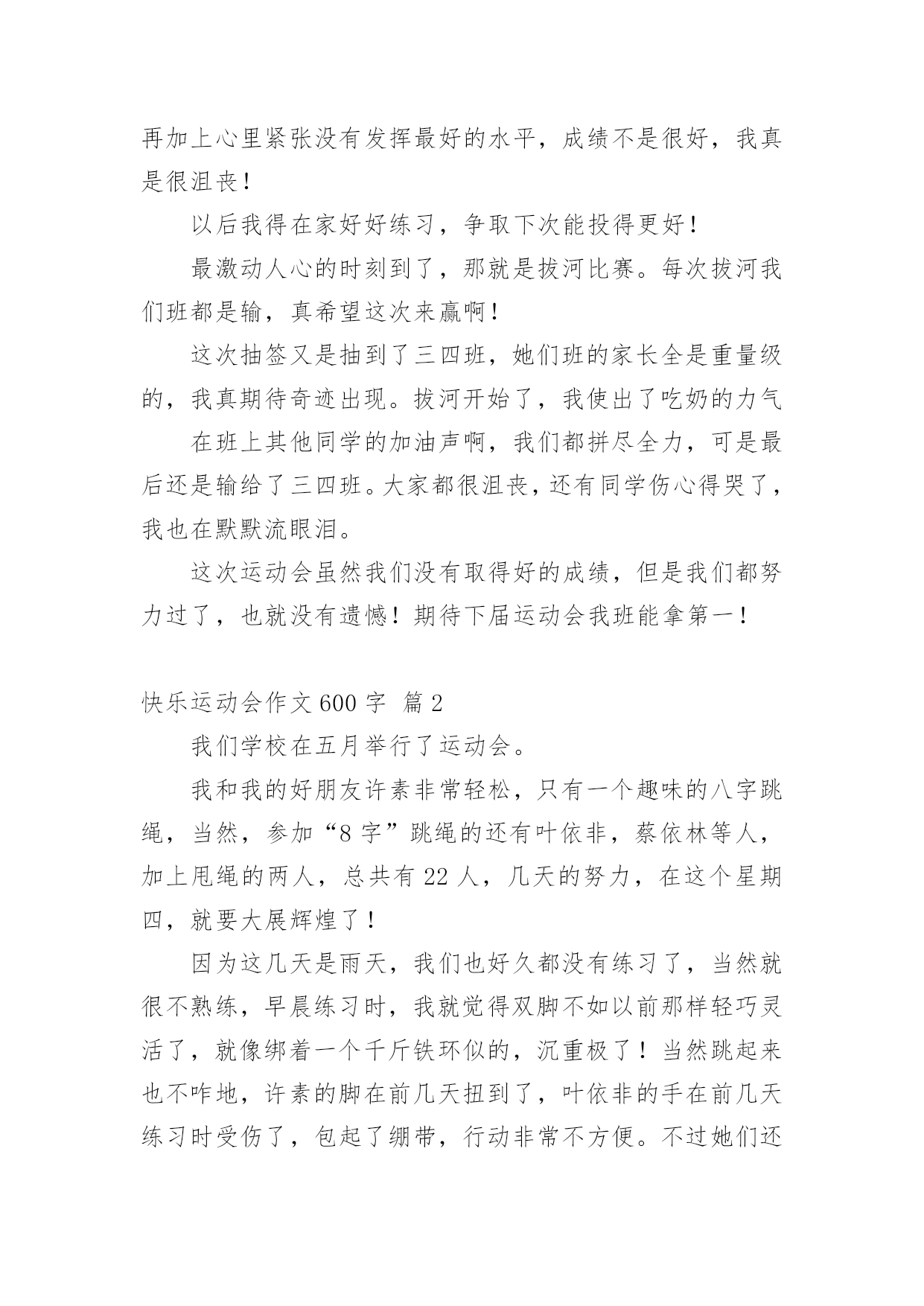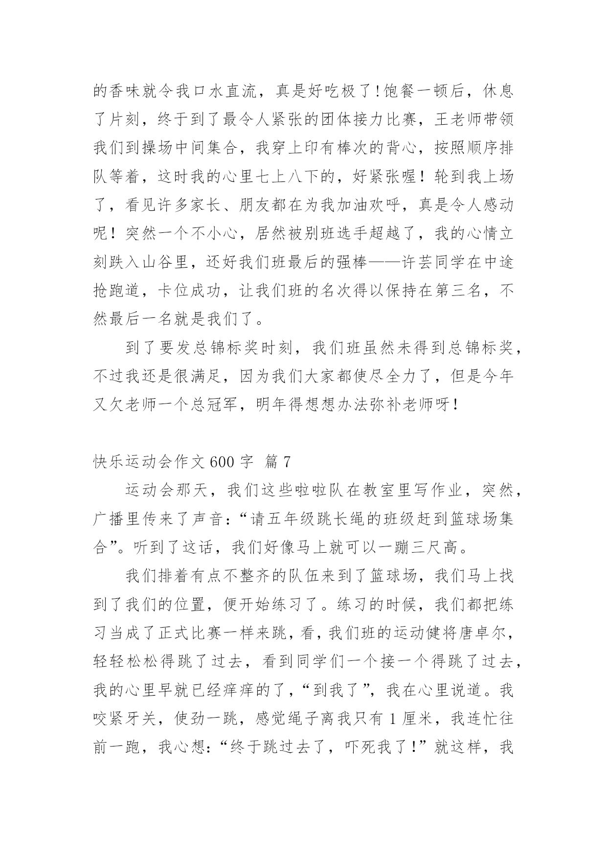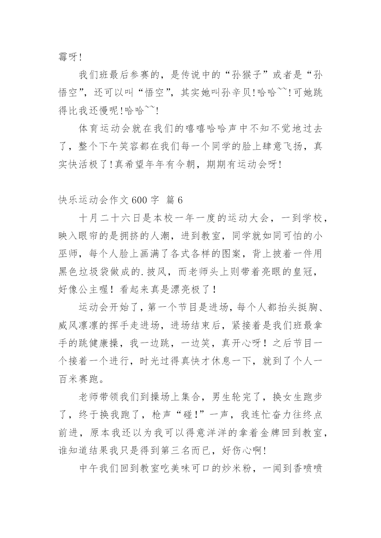 快乐运动会作文600字在我们平凡的日常里,大家都经常接触到作文吧,作文可分为小学作文、中学作文、大学作文(论文)。为了让您在写作文时更加简单方便,以下是小编整理的快乐运动会作文600字8篇,希望能够帮助到大家。快乐运动会作文600字篇1今天是我最期待的日子,你知道是什么日子啊?告诉你吧,今天可是我们学校第二届运动会啊!我早早的来到学校,发现其他同学比我来得更早,原来同学们都很期待今天的运动会啊!首先是开幕式表演,每个班级都表演一个节目。终于轮到我们班了,我们班表演的是古诗韵律操。随着《草》的音乐声响起,我们班开演表演了。我站在第一排看着那么多老师同学和家长,紧张得差点忘记动作了。我赶紧深呼吸一口气,让自己平静下来,好好的表演,我可不想给班级丢脸啊!开幕式完了以后就是太极功夫扇比赛,我们班表演的可认真了,大家都想为班级争光!紧接着就是各种单项比赛了,大家都很努力。加油声,呐喊声响成一片,很是振奋人心啊!同学们都忘记了火热的太阳,任凭汗水直流。我参加了投实心球的`比赛,由于平常在家没怎么练过,再加上心里紧张没有发挥最好的水平,成绩不是很好,我真是很沮丧!以后我得在家好好练习,争取下次能投得更好!最激动人心的时刻到了,那就是拔河比赛。每次拔河我们班都是输,真希望这次来赢啊!这次抽签又是抽到了三四班,她们班的家长全是重量级的,我真期待奇迹出现。拔河开始了,我使出了吃奶的力气在班上其他同学的加油声啊,我们都拼尽全力,可是最后还是输给了三四班。大家都很沮丧,还有同学伤心得哭了,我也在默默流眼泪。这次运动会虽然我们没有取得好的成绩,但是我们都努力过了,也就没有遗憾!期待下届运动会我班能拿第一!快乐运动会作文600字篇2我们学校在五月举行了运动会。我和我的好朋友许素非常轻松,只有一个趣味的八字跳绳,当然,参加“8字”跳绳的还有叶依非,蔡依林等人,加上甩绳的两人,总共有22人,几天的努力,在这个星期四,就要大展辉煌了!因为这几天是雨天,我们也好久都没有练习了,当然就很不熟练,早晨练习时,我就觉得双脚不如以前那样轻巧灵活了,就像绑着一个千斤铁环似的,沉重极了!当然跳起来也不咋地,许素的脚在前几天扭到了,叶依非的手在前几天练习时受伤了,包起了绷带,行动非常不方便。不过她们还是坚持了下来,可是——我们在练习时三分钟的成绩只有130多个。这是远远不够的——再进行了几次练习,总算有些渐渐熟练起来了,八字跳绳比赛也渐渐接近了。现在,轮到我们五年级了,我们紧张地等待着那个声音。“预备!”只听裁判喊道,“开始!”那瞬间,我们班头一个男生冲进了那转动的`绳子里,跳了过去。紧接着,第二个男生也跳了过去,再接着,又一个跳了过去……好的轮到我了,前面的蔡依林——她进去了——正要跳的同时,我冲了进去进去后,蔡依林也出来了,绳子也正好甩到额的脚下,一跳,跳过去了,赶紧跑了出来。就这样,一个接一个,开始倒数了“10——9——8——7——6——5——4——3——2——1——停!”结束了。只听老师说了些什么,他们就欢呼起来(我还不知道发生了什么事),后来才知道,201!我们班跳了201下,打破了我们班的记录。这是一个快乐的运动会。快乐运动会作文600字篇3运动会,我觉得是一个锻炼自己的机会。运动会那天虽然地很滑,跑起来很容易摔倒,但是每个运动员为了自己的班级要跑的还是拼命的跑不拍摔倒。尽管某个班的运动员时候是后几名,但他们的啦啦队还会一个劲的喊加油,必胜。我也是运动员我参加了100米跑和跳远,都是早上的,虽然我两个项目都没有进决赛但是我想尽力就好,输赢不重要。因为我的好朋友刘温琪,我最爱的妈妈还有老师都说输赢不重要,重要的是尽力就好。但我觉得重要的是过程。下午,是我的好朋友陆静的800米的决赛还有跳高和吴晨阳的100的决赛、董钰莹的800米跑,还有班级里的40人接力赛。先是吴晨阳的100米跑决赛,我急忙跑过去看她,我看她跑简直比我自己跑还紧张,我一直和我的.同学在给她卖力地喊加油,喊声可响了,操场对面的人都可以听见我们的喊声。最令我高兴的事吴晨阳跑了第一名。接着是我的好朋友陆静的跳高因为跳高场地离操场边缘太远了,所以我没看清陆静,也不知道陆静得了第几名。在接下来是陆静和董钰莹的800米决赛,开始董钰莹一直领先,但到最后力气用光了,就没力气跑了,就好像得了第8名,陆静刚开始慢慢地跑,我知道她在节省体力,到后面再冲刺,果然陆静的了第4名。最后是班级集体项目40人接力赛刚开始我们班和其他班是不相上下,中间我们班落后了一点但到后来我们班又赶上了,最后我们班得了第4名(有6班在比赛),我们班和第3第4名只差了0.几秒,我感到真可惜。不过我们班没有互相责怪。这次运动会让我成长!快乐运动会作文600字篇4一年一度的运动会,又如期进行了。这一次的运动会,因为我自己也加入了进去,使得这一次的