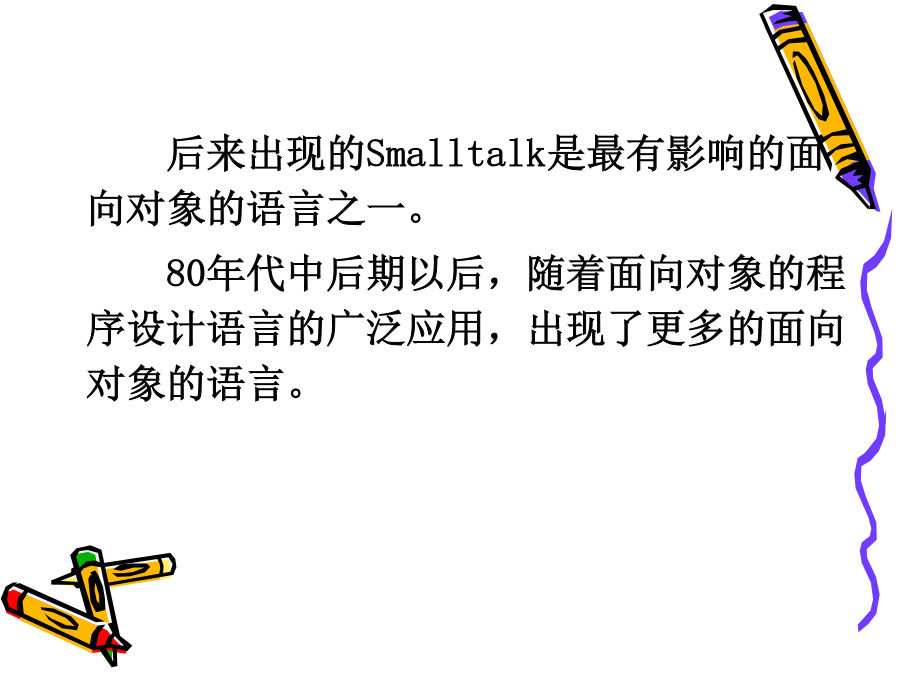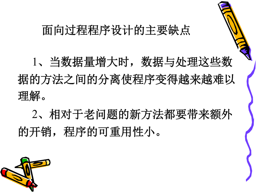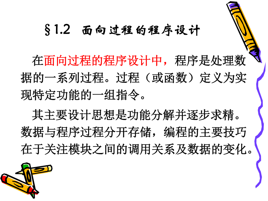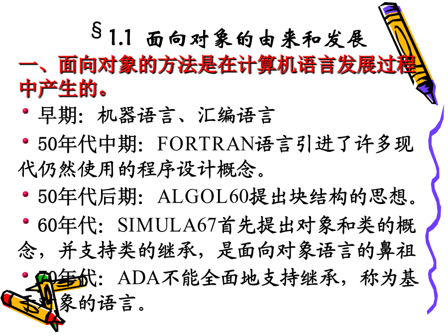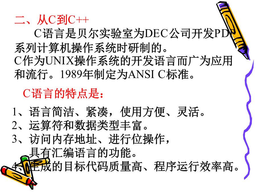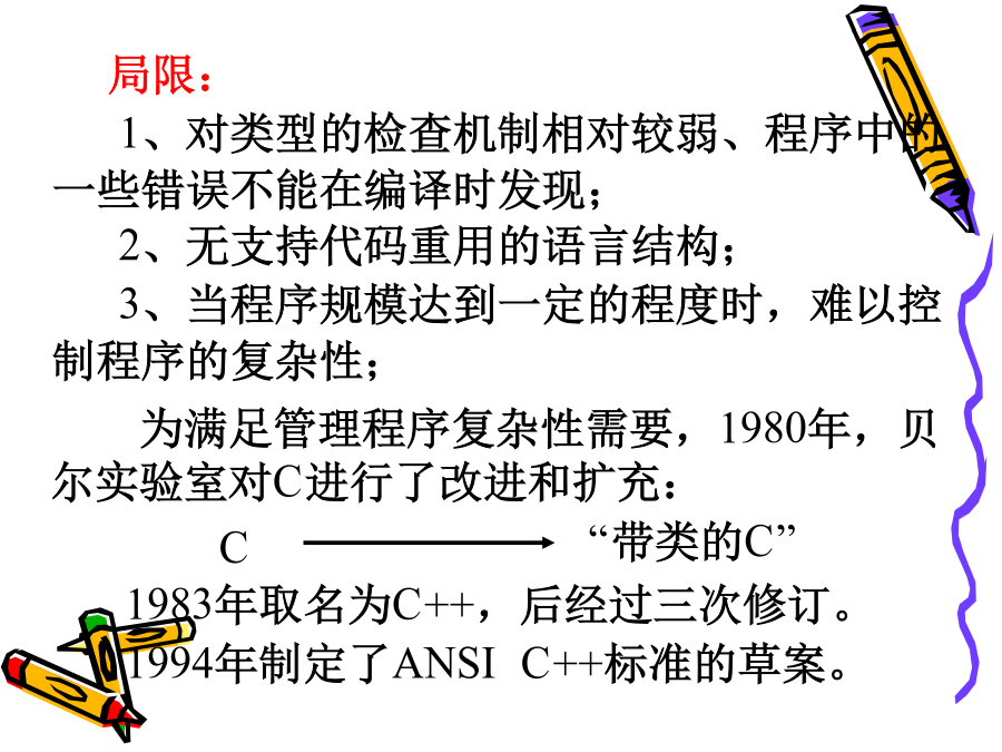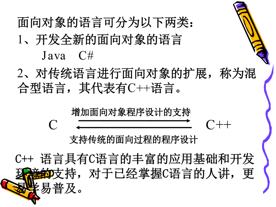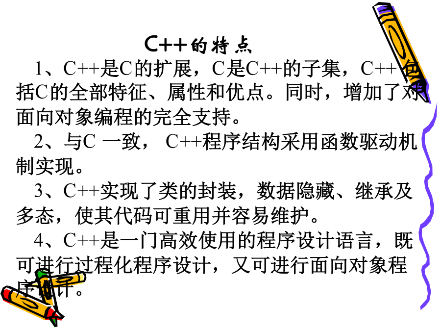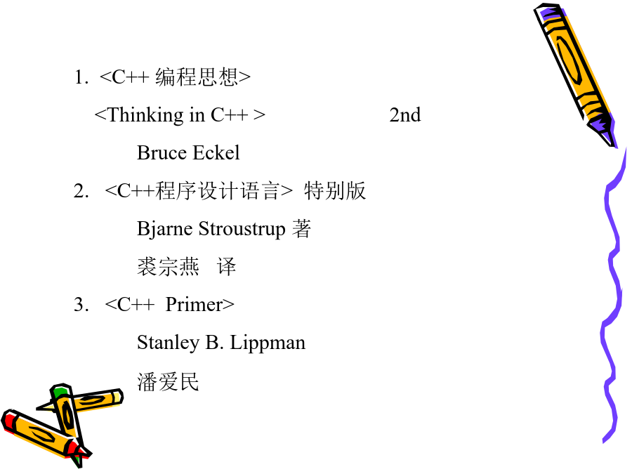 C++程序设计教程1.<C++编程思想><ThinkinginC++>2ndBruceEckel<C++程序设计语言>特别版BjarneStroustrup著裘宗燕译<C++Primer>StanleyB.Lippman潘爱民一、面向对象的方法是在计算机语言发展过程中产生的。早期:机器语言、汇编语言50年代中期:FORTRAN语言引进了许多现代仍然使用的程序设计概念。50年代后期:ALGOL60提出块结构的思想。60年代:SIMULA67首先提出对象和类的概念,并支持类的继承,是面向对象语言的鼻祖70年代:ADA不能全面地支持继承,称为基于对象的语言。二、从C到C++C语言是贝尔实验室为DEC公司开发PDP系列计算机操作系统时研制的。C作为UNIX操作系统的开发语言而广为应用和流行。1989年制定为ANSIC标准。局限:1、对类型的检查机制相对较弱、程序中的一些错误不能在编译时发现;2、无支持代码重用的语言结构;3、当程序规模达到一定的程度时,难以控制程序的复杂性;1、C++是C的扩展,C是C++的子集,C++包括C的全部特征、属性和优点。同时,增加了对面向对象编程的完全支持。2、与C一致,C++程序结构采用函数驱动机制实现。3、C++实现了类的封装,数据隐藏、继承及多态,使其代码可重用并容易维护。4、C++是一门高效使用的程序设计语言,既可进行过程化程序设计,又可进行面向对象程序设计。在面向过程的程序设计中,程序是处理数据的一系列过程。过程(或函数)定义为实现特定功能的一组指令。其主要设计思想是功能分解并逐步求精。数据与程序过程分开存储,编程的主要技巧在于关注模块之间的调用关系及数据的变化。1、当数据量增大时,数据与处理这些数据的方法之间的分离使程序变得越来越难以理解。2、相对于老问题的新方法都要带来额外的开销,程序的可重用性小。面向对象程序设计OOP(Object-OrientedProgramming):对象、类和继承面向对象程序设计的实现需要:封装和数据隐藏技术继承和多态性技术例如:电脑装配声卡,早点销售点无须知道封装体内部是如何工作就能使用的思想称为数据隐藏。对象实现了信息隐藏;对象与外部通过操作接口联系,操作接口提供了对象的功能,操作的具体实现外部是不可见的。对象之间是通过消息传递信息。对象是由特定的类创造的,什么是类?类是创建对象的样板,它包含着所创建对象的状态描述和方法的定义。由一个特定的类所创建的的对象也称为这个类的实例。一个类的所有对象都有相同的数据结构,并且共享相同的实现操作的代码,而各个对象又有具体的不同的状态。类和对象类似于面向过程语言中数据类型和变量。例如:学生类和某个学生对象。2、继承和重用制造一种新型号的电视机可以有两种选择:1)从草图开始重新设计2)对现有型号加以改进(继承和重用)C++采用继承机制支持重用,不仅可重用具有特定功能的类,而且继承可以由已有的类创造新的类。新类共享已有类的属性,自己还具有额外添加的属性,新类是从已有类派生的,称为派生类或子类,已有类称为父类或基类。在客观世界中,存在着整体和部分的关系、一般和特殊的关系,继承将后者模型化。汽车类,各类汽车昆虫类,各类昆虫3、多态性封装性、继承性、多态性是构成面向对象程序设计的三大特征。封装性是基础继承性是关键多态性是补充什么是多态性?多态是指一个名字有多种语义,或一个相同界面有多种实现;或是指发出同样的消息被不同类型的对象接受而导致完全不同的行为。即对象根据所接收到的消息做出相应的操作。又如:在绘图系统中使用的多态性。函数重载和运算符重载表现了最简单的多态性。函数重载:Voidf(int,int,char);Voidf(char,float);Voidf(int,int);Voidf(int,float);运算符重载:为运算符+-*/等赋以新的含义,以实现类对象的运算。编译错学习本课程目的