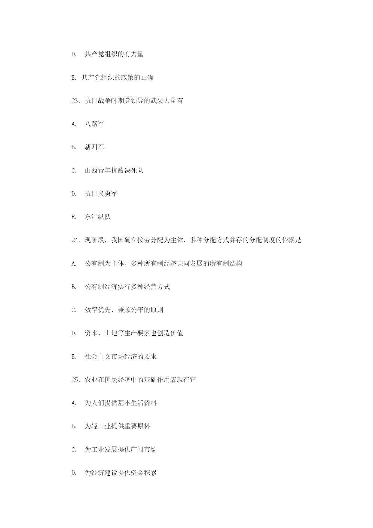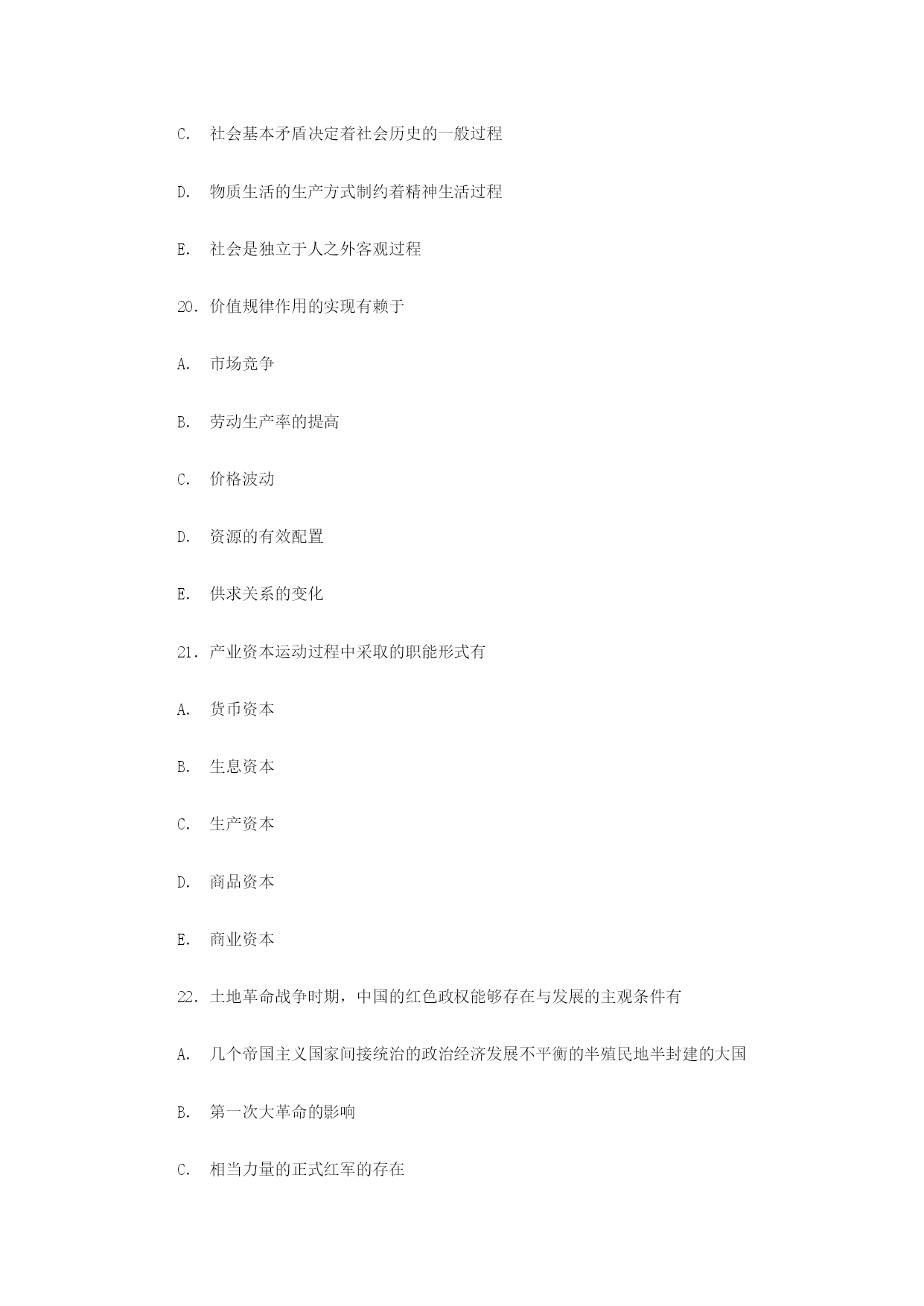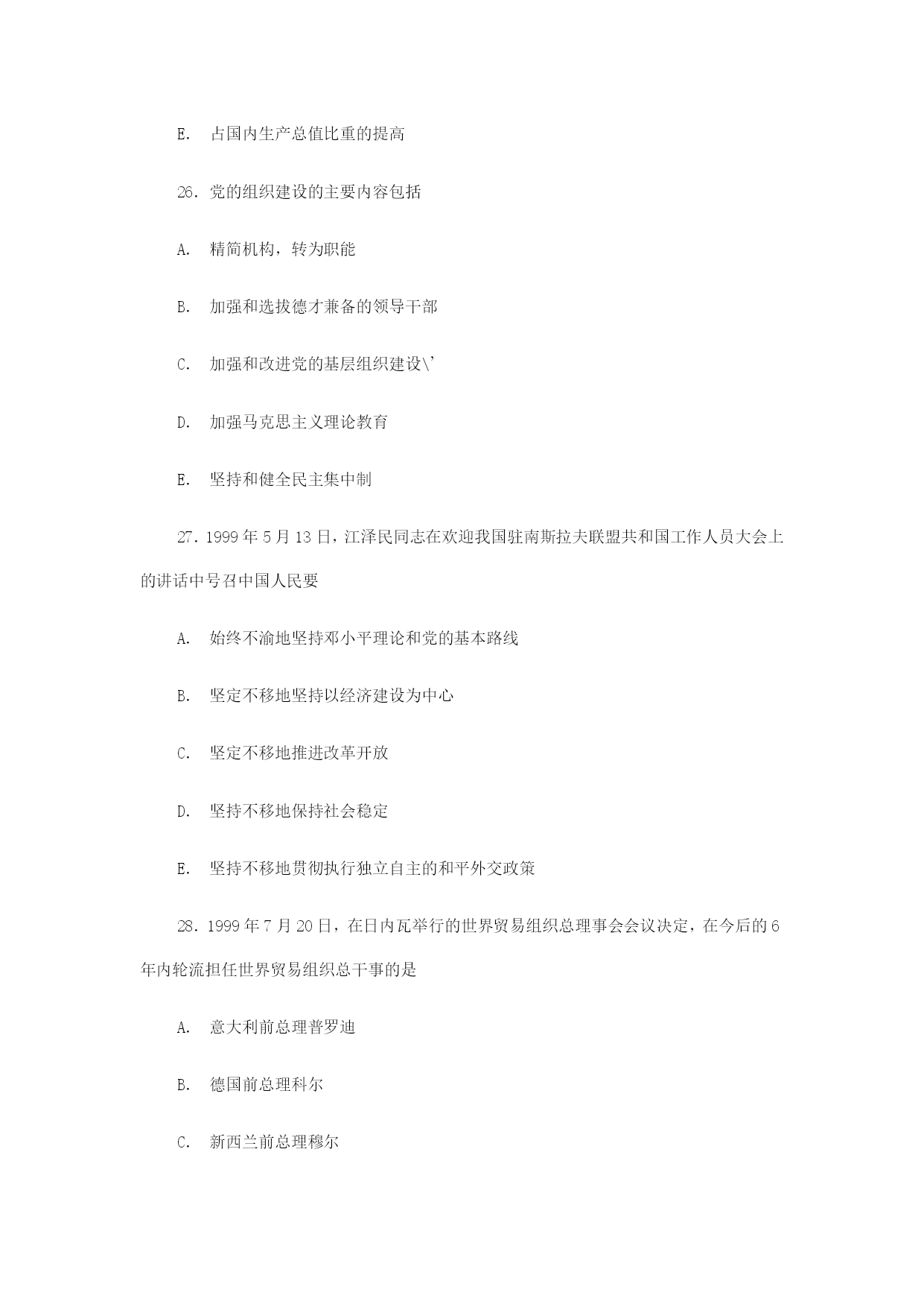 2000年研究生入学考试政治试卷和答案(理科)二、下列每题的选项中,至少有一项是符合题意的。请在答题纸上将所选项的字母黑。少选、多选、错选,该题不得分。(每小题2分,共24分)17.对于同一棵大树,在木匠的眼中是木材,画家看到的是色彩和色调,植物学家看到的是它的形态特征,这是由于A.人的感觉受理性指导B.人的认识具有能动性C.理性认识是感性认识的基础D.已有的认识影响感觉活动E.意识建构认识对象18.马克思主义认识论与唯心主义认识论的区别在于是否承认A.世界的可知性B.客观事物是认识的对象C.认识起源于经验D.社会实践是认识的基础E.认识发展的辩证过程19.社会的物质性表现为A.社会形态的发展是自然历史过程B.生产方式是社会发展的决定力量C.社会基本矛盾决定着社会历史的一般过程D.物质生活的生产方式制约着精神生活过程E.社会是独立于人之外客观过程20.价值规律作用的实现有赖于A.市场竞争B.劳动生产率的提高C.价格波动D.资源的有效配置E.供求关系的变化21.产业资本运动过程中采取的职能形式有A.货币资本B.生息资本C.生产资本D.商品资本E.商业资本22.土地革命战争时期,中国的红色政权能够存在与发展的主观条件有A.几个帝国主义国家间接统治的政治经济发展不平衡的半殖民地半封建的大国B.第一次大革命的影响C.相当力量的正式红军的存在D.共产党组织的有力量E.共产党组织的政策的正确23.抗日战争时期党领导的武装力量有A.八路军B.新四军C.山西青年抗敌决死队D.抗日义勇军E.东江纵队24.现阶段,我国确立按劳分配为主体、多种分配方式并存的分配制度的依据是A.公有制为主体、多种所有制经济共同发展的所有制结构B.公有制经济实行多种经营方式C.效率优先、兼顾公平的原则D.资本、土地等生产要素也创造价值E.社会主义市场经济的要求25.农业在国民经济中的基础作用表现在它A.为人们提供基本生活资料B.为轻工业提供重要原料C.为工业发展提供广阔市场D.为经济建设提供资金积累E.占国内生产总值比重的提高26.党的组织建设的主要内容包括A.精简机构,转为职能B.加强和选拔德才兼备的领导干部C.加强和改进党的基层组织建设\'D.加强马克思主义理论教育E.坚持和健全民主集中制27.1999年5月13日,江泽民同志在欢迎我国驻南斯拉夫联盟共和国工作人员大会上的讲话中号召中国人民要A.始终不渝地坚持邓小平理论和党的基本路线B.坚定不移地坚持以经济建设为中心C.坚定不移地推进改革开放D.坚持不移地保持社会稳定E.坚持不移地贯彻执行独立自主的和平外交政策28.1999年7月20日,在日内瓦举行的世界贸易组织总理事会会议决定,在今后的6年内轮流担任世界贸易组织总干事的是A.意大利前总理普罗迪B.德国前总理科尔C.新西兰前总理穆尔D.以色列前总理佩雷斯E.泰国总理素帕猜