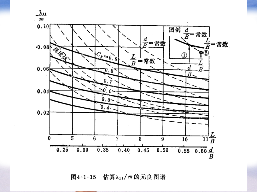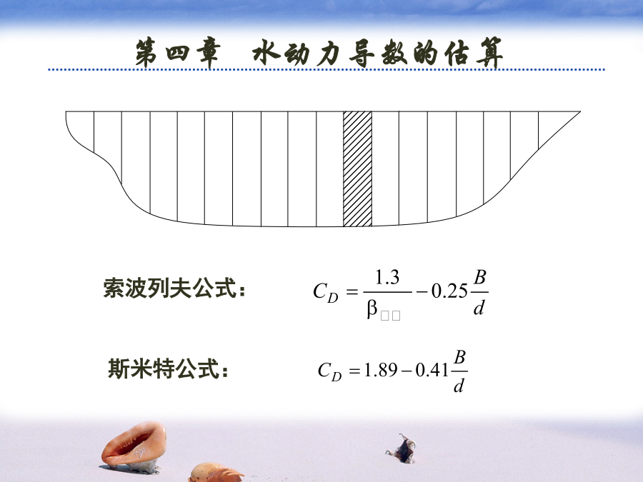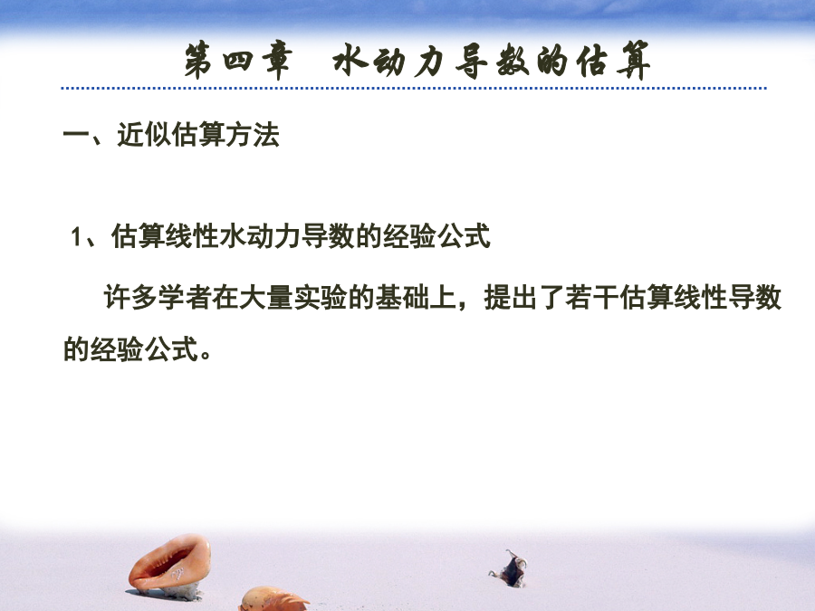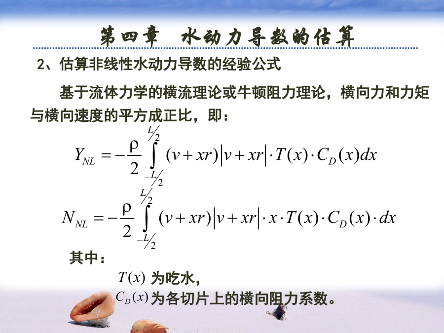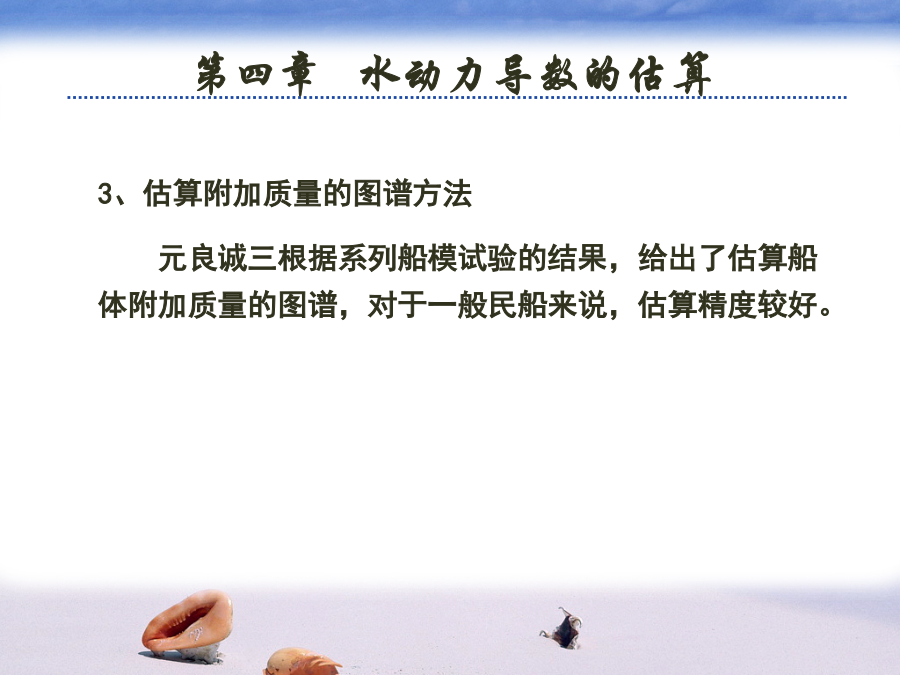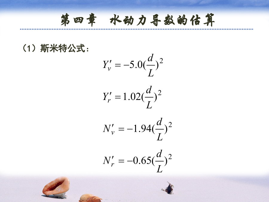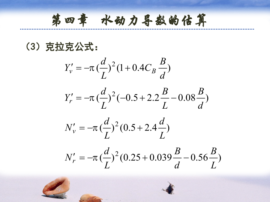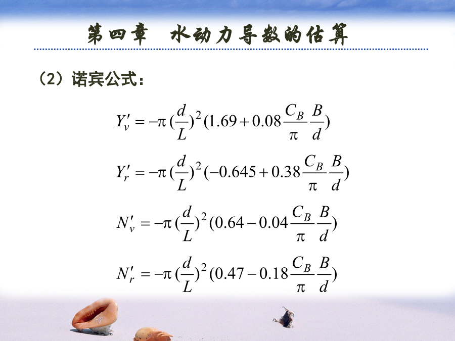 第四章水动力导数的估算水动力导数的估算方法有两种:(2)诺宾公式:(3)克拉克公式:其中:为吃水,为各切片上的横向阻力系数。索波列夫公式:3、估算附加质量的图谱方法元良诚三根据系列船模试验的结果,给出了估算船体附加质量的图谱,对于一般民船来说,估算精度较好。为了便于计算机计算,以将上述图谱回归成如下多项式:二、理论计算方法目前,理论计算方法主要用于利用理想流体理论计算物体的附加质量等水动力导数,对于与粘性有关的水动力导数还没有较好的理论计算方法。1、简单几何形体的附加质量(1)椭球兰伯用势流理论导出了长轴为2a,短轴为2b和2c的椭球的附加质量和附加转动惯量:兰伯将船体看成是三轴为L,B,2d的椭球,并结果整理成曲线,其中:例:球体附加质量的计算:(2)二维椭圆柱体对于如左上图的二维椭圆柱体,有:(3)二维平板对于如左下图的二维平板,有:椭圆、平板的附加质量公式可用来近似估算舵、托架和舭龙骨等附体的附加质量。但于船体的附加级两相比较,附体的附加质量较小,在操纵性计算中一般常略去机器人在无界水域中的附加质量1.主体部分的附加质量:小机器人采用Gambit2.0进行建模,并根据实际情况,做一些简化,省去了水平翼、垂直翼、推力器等一些部件,简化后的模型网格如下图所示。在其表面不等距地划分了1158个网格,中部曲率变化缓慢,网格分得较疏,而在首尾部,曲率变化大的地方,分得较密。代入面元法程序得,可得机器人主体部分平动时的附加质量。2.附体部分的附加质量:1)前水平翼:(左右各一个)2)后水平翼:(左右各一个)3)后垂直翼:(上下各一个)4)推进器及其它一些附件。因尺度较小且形状复杂,很难精确地算出附加质量,这里略去它们对整体的影响。综上所述,将它们叠加起来即可算出机器人在无界水域中运动(仅平动)的附加质量。