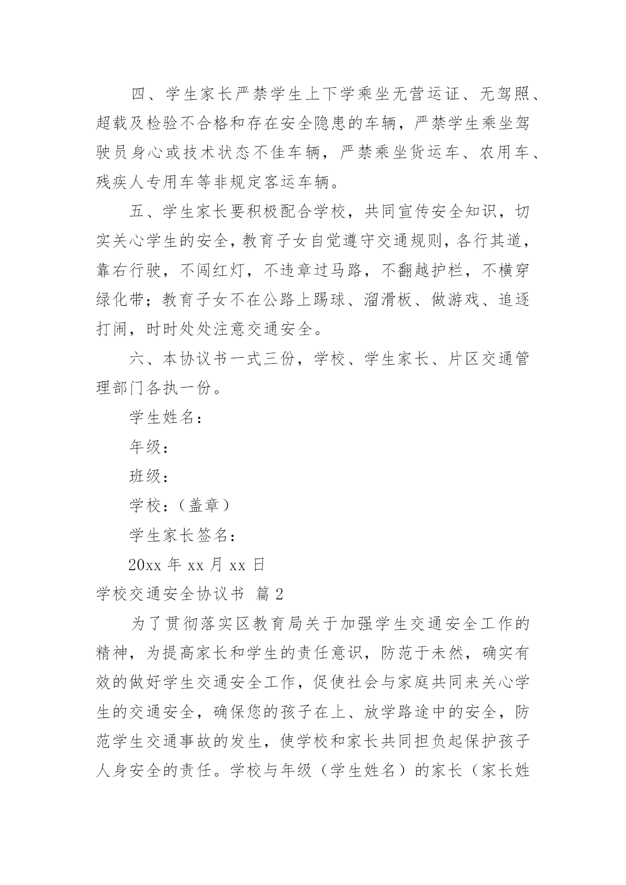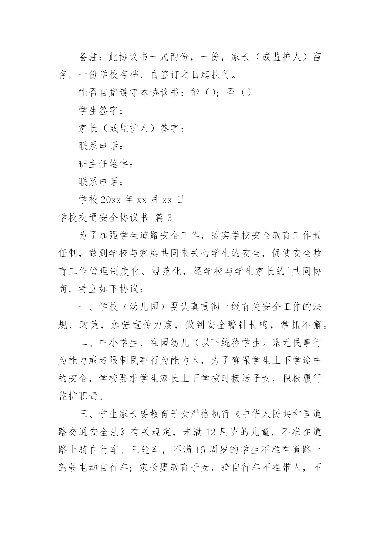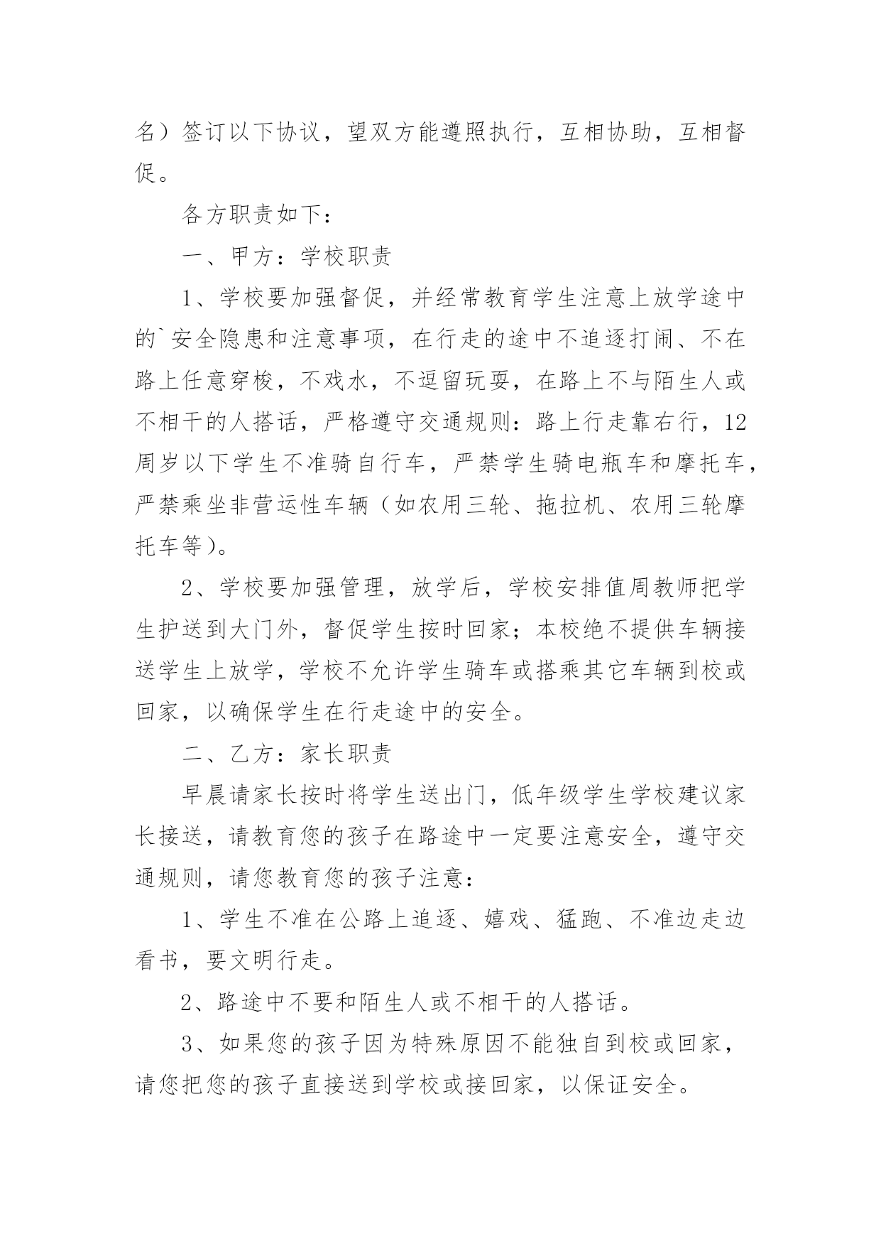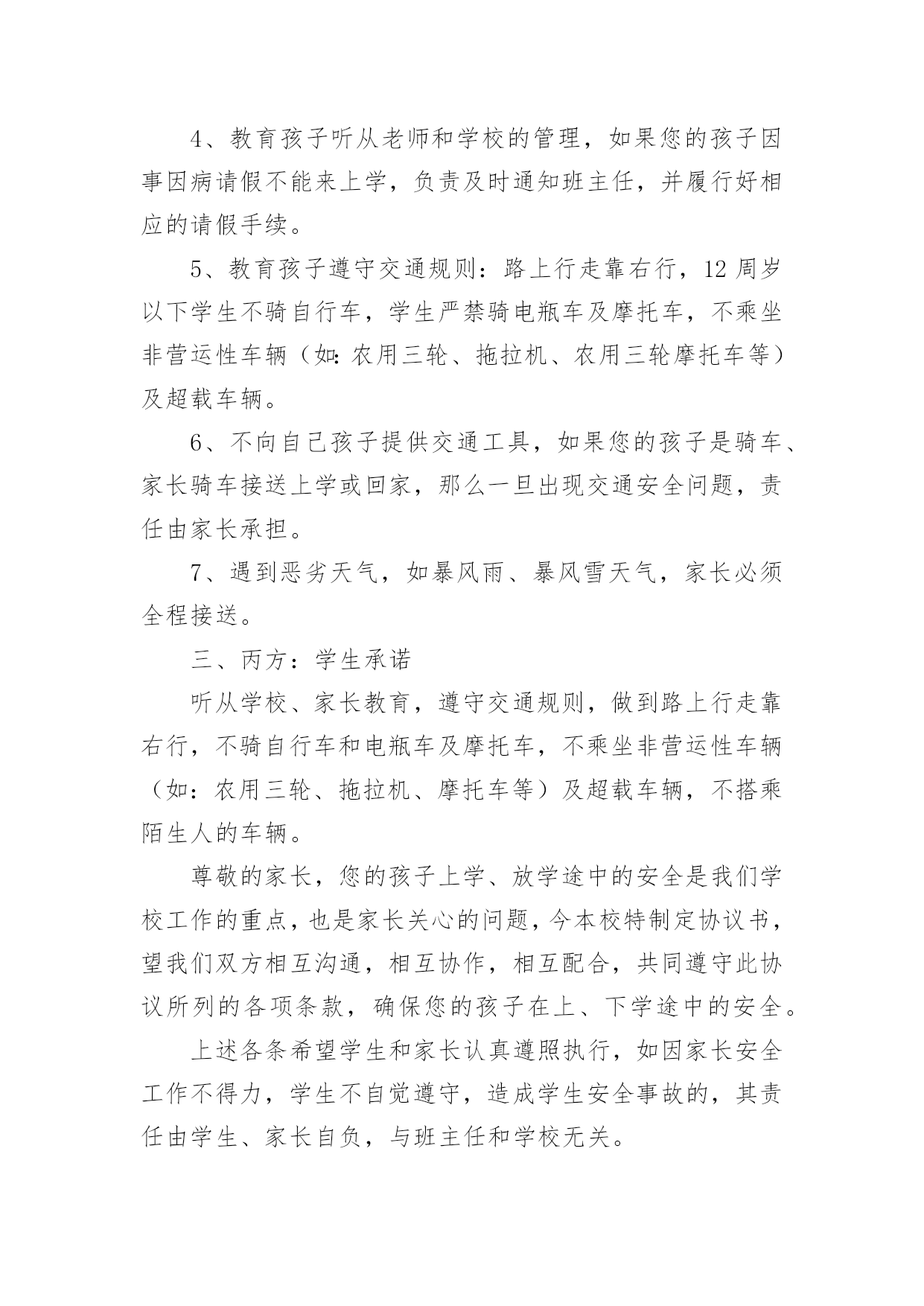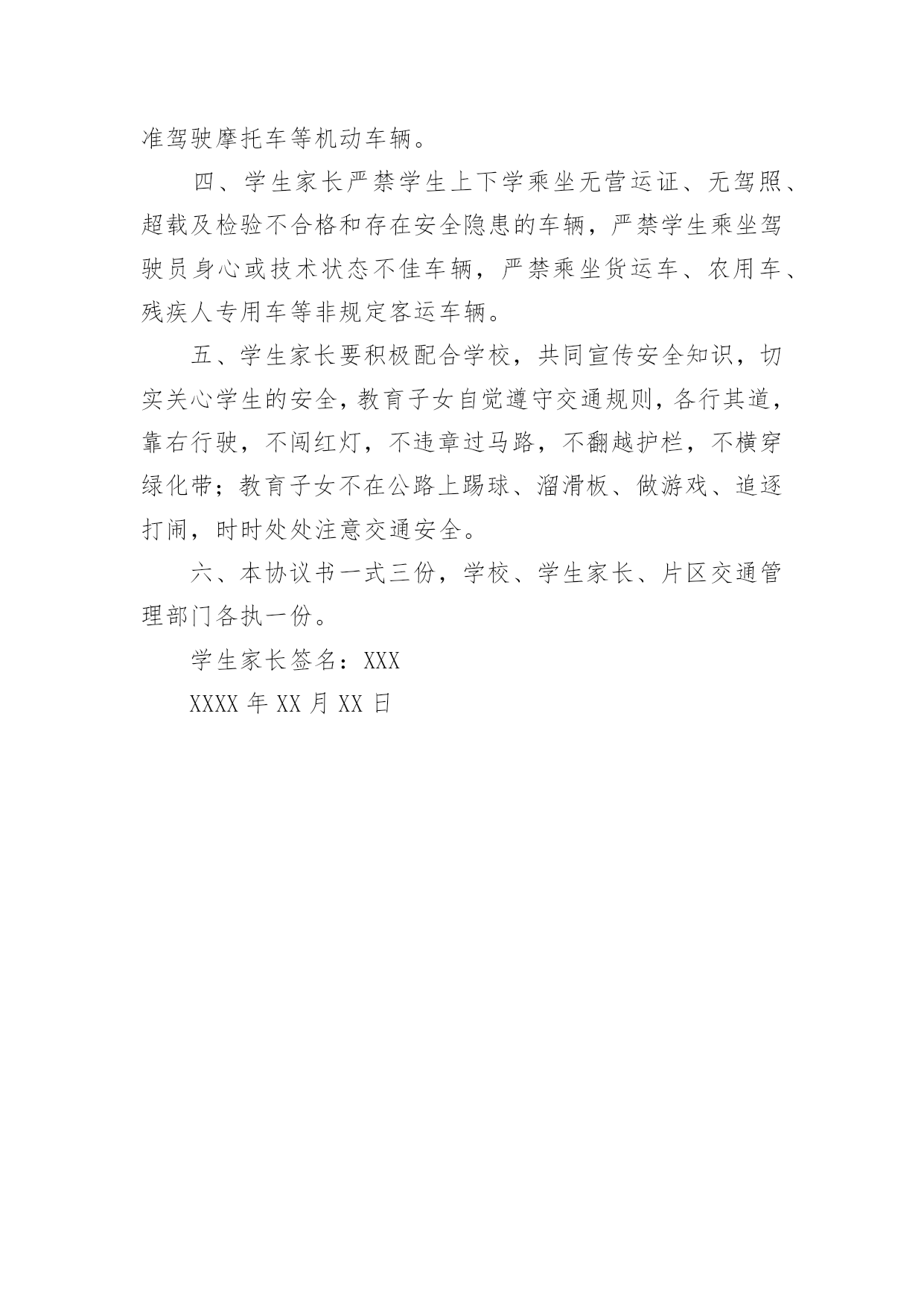 学校交通安全协议书【精品】学校交通安全协议书3篇在我们平凡的日常里,用到协议的地方越来越多,协议具有法律效力,确立某种法律关系。到底应如何拟定协议呢?下面是小编收集整理的学校交通安全协议书3篇,欢迎阅读与收藏。学校交通安全协议书篇1为了加强学生道路安全工作,落实学校安全教育工作责任制,做到学校与家庭共同来关心学生的安全,促使安全教育工作管理制度化、规范化,经学校与学生家长的共同协商,特立如下协议:一、学校(幼儿园)要认真贯彻上级有关安全工作的`法规、政策,加强宣传力度,做到安全警钟长鸣,常抓不懈。二、中小学生、在园幼儿(以下统称学生)系无民事行为能力或者限制民事行为能力人,为了确保学生上下学途中的安全,学校要求学生家长上下学按时接送子女,积极履行监护职责。三、学生家长要教育子女严格执行《中华人民共和国道路交通安全法》有关规定,未满12周岁的儿童,不准在道路上骑自行车、三轮车,不满16周岁的学生不准在道路上驾驶电动自行车;家长要教育子女,骑自行车不准带人,不准驾驶摩托车等机动车辆。四、学生家长严禁学生上下学乘坐无营运证、无驾照、超载及检验不合格和存在安全隐患的车辆,严禁学生乘坐驾驶员身心或技术状态不佳车辆,严禁乘坐货运车、农用车、残疾人专用车等非规定客运车辆。五、学生家长要积极配合学校,共同宣传安全知识,切实关心学生的安全,教育子女自觉遵守交通规则,各行其道,靠右行驶,不闯红灯,不违章过马路,不翻越护栏,不横穿绿化带;教育子女不在公路上踢球、溜滑板、做游戏、追逐打闹,时时处处注意交通安全。六、本协议书一式三份,学校、学生家长、片区交通管理部门各执一份。学生姓名:年级:班级:学校:(盖章)学生家长签名:20xx年xx月xx日学校交通安全协议书篇2为了贯彻落实区教育局关于加强学生交通安全工作的精神,为提高家长和学生的责任意识,防范于未然,确实有效的做好学生交通安全工作,促使社会与家庭共同来关心学生的交通安全,确保您的孩子在上、放学路途中的安全,防范学生交通事故的发生,使学校和家长共同担负起保护孩子人身安全的责任。学校与年级(学生姓名)的家长(家长姓名)签订以下协议,望双方能遵照执行,互相协助,互相督促。各方职责如下:一、甲方:学校职责1、学校要加强督促,并经常教育学生注意上放学途中的`安全隐患和注意事项,在行走的途中不追逐打闹、不在路上任意穿梭,不戏水,不逗留玩耍,在路上不与陌生人或不相干的人搭话,严格遵守交通规则:路上行走靠右行,12周岁以下学生不准骑自行车,严禁学生骑电瓶车和摩托车,严禁乘坐非营运性车辆(如农用三轮、拖拉机、农用三轮摩托车等)。2、学校要加强管理,放学后,学校安排值周教师把学生护送到大门外,督促学生按时回家;本校绝不提供车辆接送学生上放学,学校不允许学生骑车或搭乘其它车辆到校或回家,以确保学生在行走途中的安全。二、乙方:家长职责早晨请家长按时将学生送出门,低年级学生学校建议家长接送,请教育您的孩子在路途中一定要注意安全,遵守交通规则,请您教育您的孩子注意:1、学生不准在公路上追逐、嬉戏、猛跑、不准边走边看书,要文明行走。2、路途中不要和陌生人或不相干的人搭话。3、如果您的孩子因为特殊原因不能独自到校或回家,请您把您的孩子直接送到学校或接回家,以保证安全。4、教育孩子听从老师和学校的管理,如果您的孩子因事因病请假不能来上学,负责及时通知班主任,并履行好相应的请假手续。5、教育孩子遵守交通规则:路上行走靠右行,12周岁以下学生不骑自行车,学生严禁骑电瓶车及摩托车,不乘坐非营运性车辆(如:农用三轮、拖拉机、农用三轮摩托车等)及超载车辆。6、不向自己孩子提供交通工具,如果您的孩子是骑车、家长骑车接送上学或回家,那么一旦出现交通安全问题,责任由家长承担。7、遇到恶劣天气,如暴风雨、暴风雪天气,家长必须全程接送。三、丙方:学生承诺听从学校、家长教育,遵守交通规则,做到路上行走靠右行,不骑自行车和电瓶车及摩托车,不乘坐非营运性车辆(如:农用三轮、拖拉机、摩托车等)及超载车辆,不搭乘陌生人的车辆。尊敬的家长,您的孩子上学、放学途中的安全是我们学校工作的重点,也是家长关心的问题,今本校特制定协议书,望我们双方相互沟通,相互协作,相互配合,共同遵守此协议所列的各项条款,确保您的孩子在上、下学途中的安全。上述各条希望学生和家长认真遵照执行,如因家长安全工作不得力,学生不自觉遵守,造成学生安全事故的,其责任由学生、家长自负,与班主任和学校无关。备注:此协议书一式两份,一份,家长(或监护人)留存,一份学校存档,自签订之日起执行。能否自觉遵守本协议书:能();否()学生签字:家长(或监护人)签字:联系电话:班主任签字:联系电话:学校20xx年xx月xx日学校交通安全协议书篇3为了加强学生道路安全工作,落实学校安全教育工作责任制,做到学校
