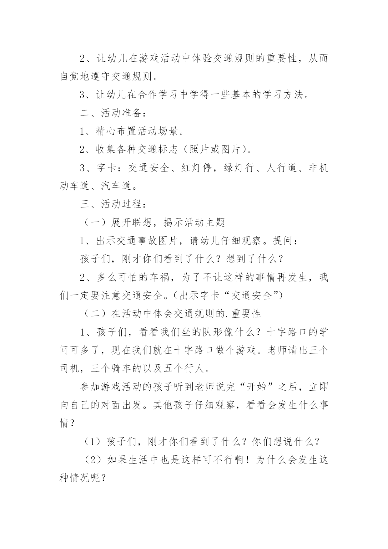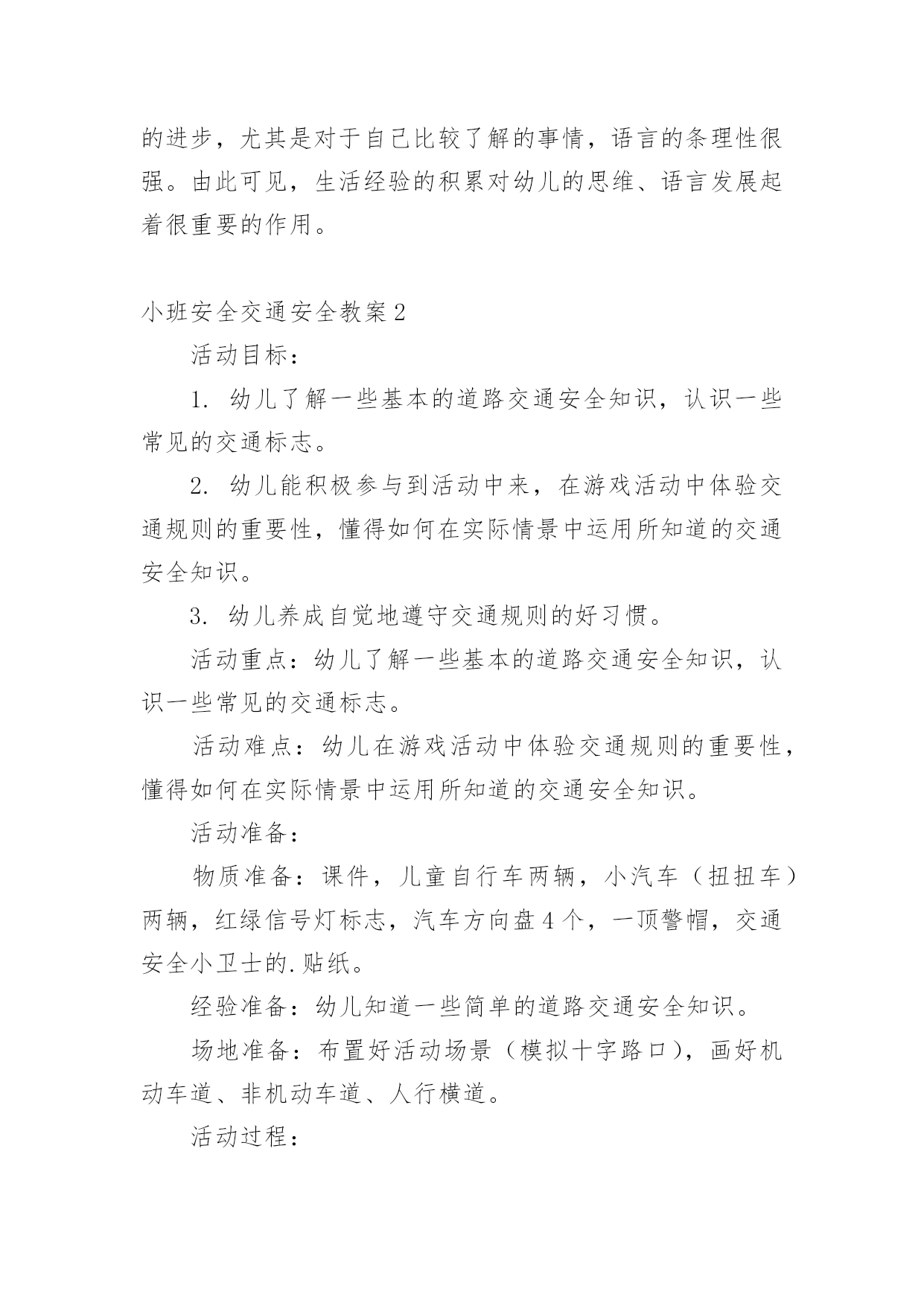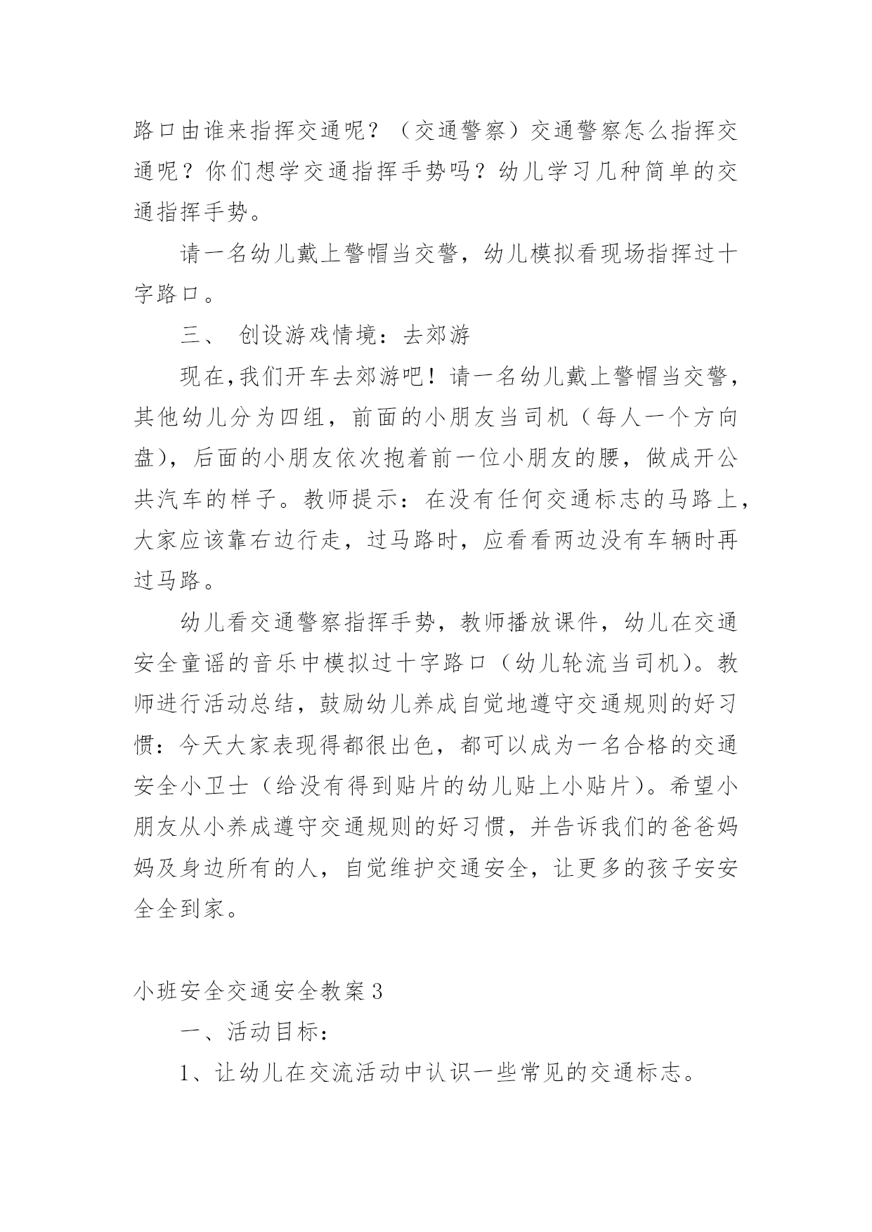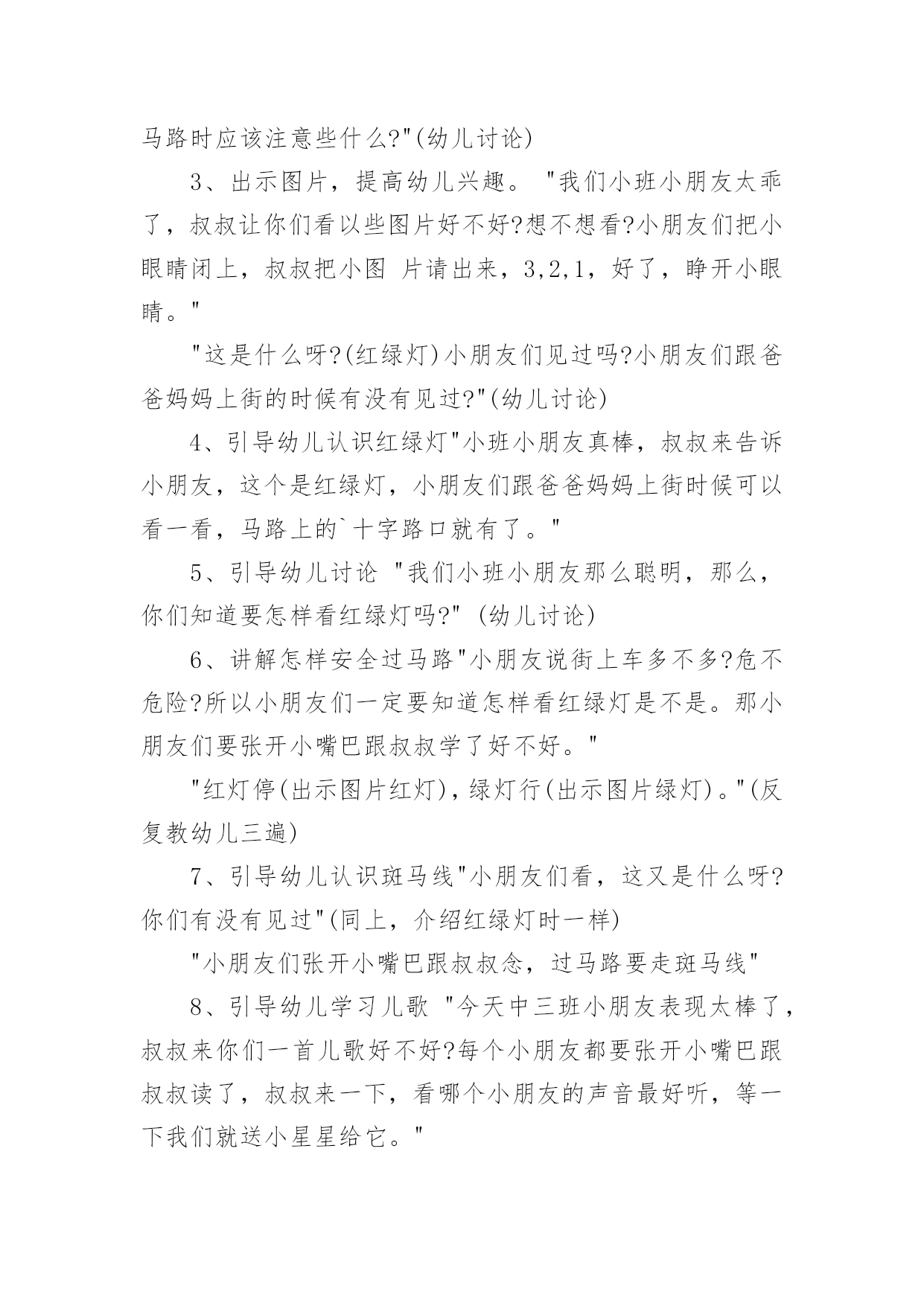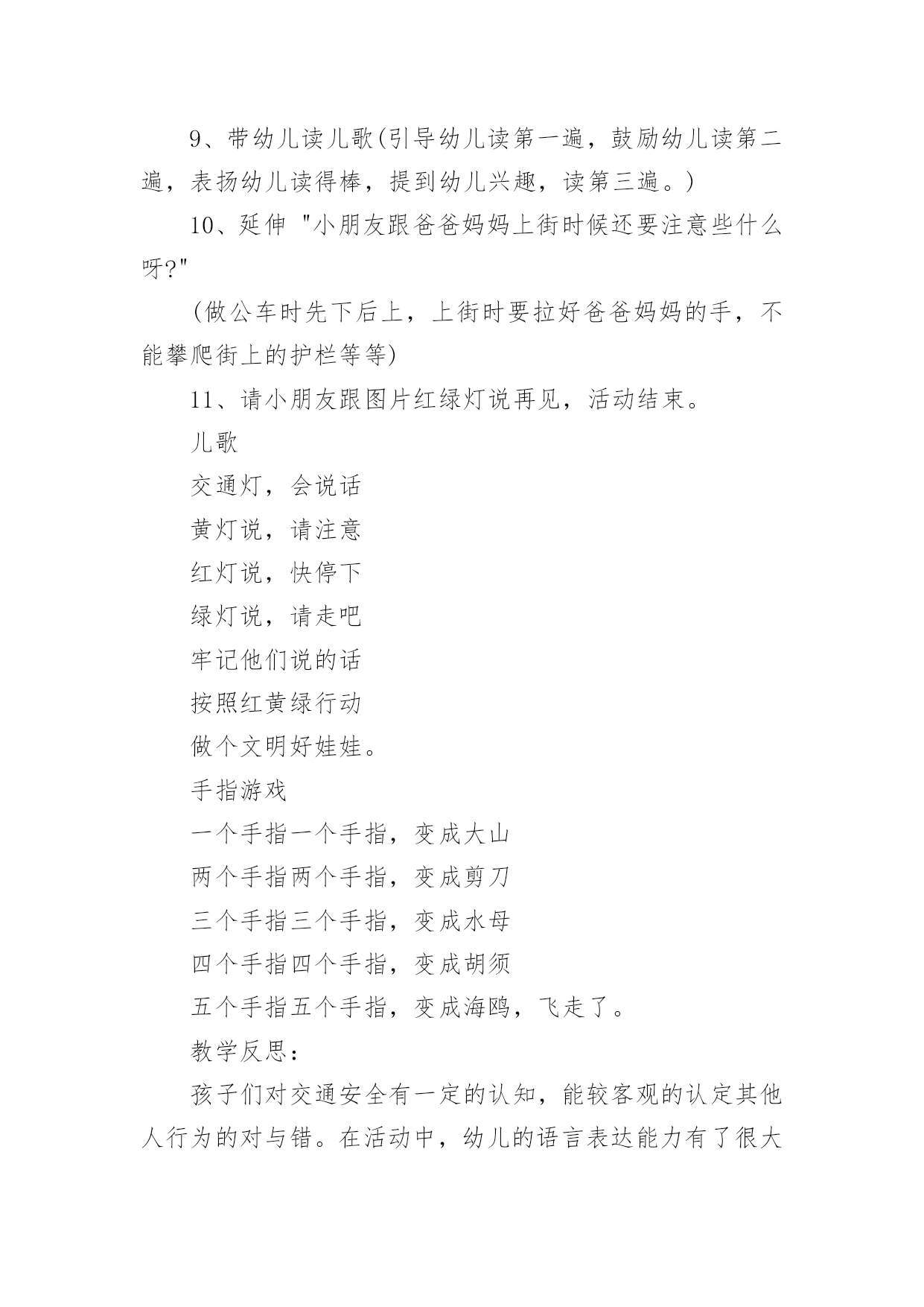 小班安全交通安全教案作为一名教职工,总归要编写教案,教案是保证教学取得成功、提高教学质量的基本条件。那要怎么写好教案呢?下面是小编帮大家整理的小班安全交通安全教案,希望对大家有所帮助。小班安全交通安全教案1活动目标:1、让幼儿了解一些基本的交通安全知识,知道红灯停,绿灯行的道理。2、知道过马路时要注意自己的安全,让幼儿知道不走斑马线的危险性。3、让幼儿学会念儿歌,进一步培养幼儿的幼儿的语言表达能力。4、培养幼儿敏锐的观察能力。5、加强幼儿的安全意识。活动准备:1、图片红绿灯、斑马线2、儿歌《交通灯》活动过程:1、手指游戏,稳定幼儿情绪。"小朋友们伸出小手,跟叔叔一起玩个手指游戏好不好?"2、谈话,引入主题。"小朋友们知道怎样过马路吗?过马路时应该注意些什么?"(幼儿讨论)3、出示图片,提高幼儿兴趣。"我们小班小朋友太乖了,叔叔让你们看以些图片好不好?想不想看?小朋友们把小眼睛闭上,叔叔把小图片请出来,3,2,1,好了,睁开小眼睛。""这是什么呀?(红绿灯)小朋友们见过吗?小朋友们跟爸爸妈妈上街的时候有没有见过?"(幼儿讨论)4、引导幼儿认识红绿灯"小班小朋友真棒,叔叔来告诉小朋友,这个是红绿灯,小朋友们跟爸爸妈妈上街时候可以看一看,马路上的`十字路口就有了。"5、引导幼儿讨论"我们小班小朋友那么聪明,那么,你们知道要怎样看红绿灯吗?"(幼儿讨论)6、讲解怎样安全过马路"小朋友说街上车多不多?危不危险?所以小朋友们一定要知道怎样看红绿灯是不是。那小朋友们要张开小嘴巴跟叔叔学了好不好。""红灯停(出示图片红灯),绿灯行(出示图片绿灯)。"(反复教幼儿三遍)7、引导幼儿认识斑马线"小朋友们看,这又是什么呀?你们有没有见过"(同上,介绍红绿灯时一样)"小朋友们张开小嘴巴跟叔叔念,过马路要走斑马线"8、引导幼儿学习儿歌"今天中三班小朋友表现太棒了,叔叔来你们一首儿歌好不好?每个小朋友都要张开小嘴巴跟叔叔读了,叔叔来一下,看哪个小朋友的声音最好听,等一下我们就送小星星给它。"9、带幼儿读儿歌(引导幼儿读第一遍,鼓励幼儿读第二遍,表扬幼儿读得棒,提到幼儿兴趣,读第三遍。)10、延伸"小朋友跟爸爸妈妈上街时候还要注意些什么呀?"(做公车时先下后上,上街时要拉好爸爸妈妈的手,不能攀爬街上的护栏等等)11、请小朋友跟图片红绿灯说再见,活动结束。儿歌交通灯,会说话黄灯说,请注意红灯说,快停下绿灯说,请走吧牢记他们说的话按照红黄绿行动做个文明好娃娃。手指游戏一个手指一个手指,变成大山两个手指两个手指,变成剪刀三个手指三个手指,变成水母四个手指四个手指,变成胡须五个手指五个手指,变成海鸥,飞走了。教学反思:孩子们对交通安全有一定的认知,能较客观的认定其他人行为的对与错。在活动中,幼儿的语言表达能力有了很大的进步,尤其是对于自己比较了解的事情,语言的条理性很强。由此可见,生活经验的积累对幼儿的思维、语言发展起着很重要的作用。小班安全交通安全教案2活动目标:1.幼儿了解一些基本的道路交通安全知识,认识一些常见的交通标志。2.幼儿能积极参与到活动中来,在游戏活动中体验交通规则的重要性,懂得如何在实际情景中运用所知道的交通安全知识。3.幼儿养成自觉地遵守交通规则的好习惯。活动重点:幼儿了解一些基本的道路交通安全知识,认识一些常见的交通标志。活动难点:幼儿在游戏活动中体验交通规则的重要性,懂得如何在实际情景中运用所知道的交通安全知识。活动准备:物质准备:课件,儿童自行车两辆,小汽车(扭扭车)两辆,红绿信号灯标志,汽车方向盘4个,一顶警帽,交通安全小卫士的.贴纸。经验准备:幼儿知道一些简单的道路交通安全知识。场地准备:布置好活动场景(模拟十字路口),画好机动车道、非机动车道、人行横道。活动过程:一、幼儿观看课件,教师引导幼儿讨论:1.幼儿观看课件1――《上学路上》,教师提问:刚才的动画片告诉我们上学路上应该注意些什么?哪些行为是违反交通规则的?正确的应该怎么做?对回答问题的小朋友进行鼓励,把交通安全小卫士的贴片贴在小朋友的胸前。2.幼儿观看课件2――认识一些常见的交通标志,教师提问:你认识这些标志吗?你知道它们是什么意思吗?(禁止非机动车行驶,行人走道,禁止行人通过,减速慢行、注意行人)二、设置情境,幼儿模拟过十字路口:1.组织幼儿按十字型分组坐在画好的场地上。幼儿认识斑马线、非机动车道,机动车道。2.幼儿游戏,模拟看信号灯过马路:两个小朋友开扭扭车当司机,两个小朋友骑单车以及四个行人模拟过十字路口。幼儿在没有指挥的情况下过十字路口,车辆和行人任意穿行。引导幼儿讨论:小朋友,刚才你们看到了什么?他们做得对吗?他们应该怎么做?教师小结幼儿讲述,出示红绿信号灯,请出一位幼儿来当指挥,幼儿再次有序地过马路。3.幼儿模拟看现场指挥过十字路口刚才我们认识的红绿灯和交通标