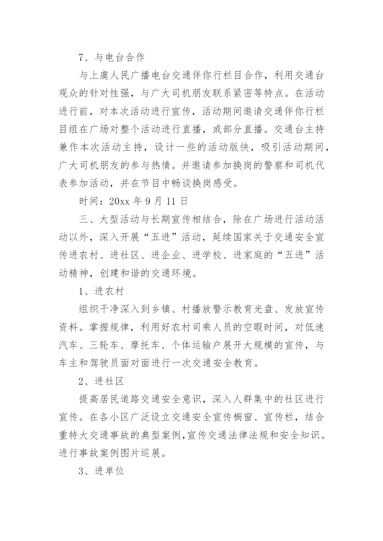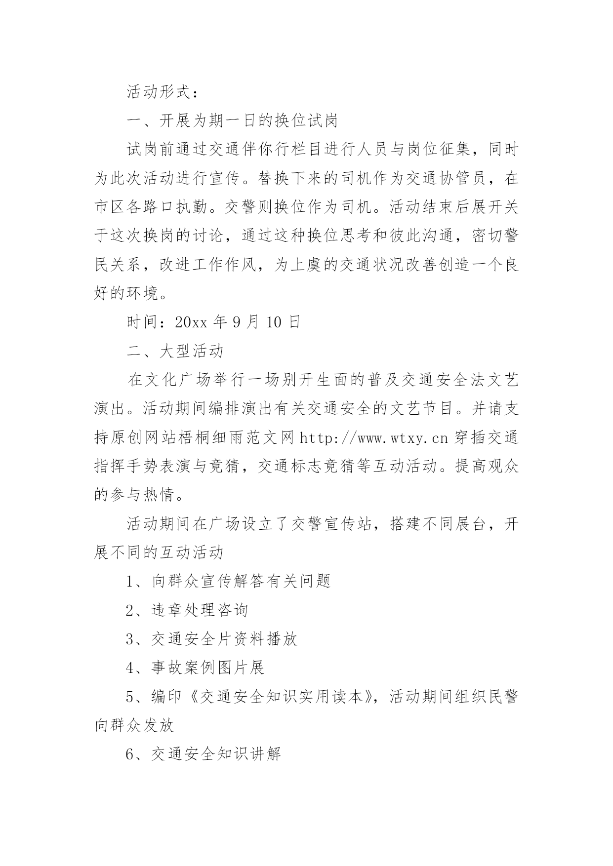 交通安全宣传周策划方案交通安全宣传周策划方案为了确保工作或事情有序地进行,常常需要提前制定一份优秀的方案,方案一般包括指导思想、主要目标、工作重点、实施步骤、政策措施、具体要求等项目。那么你有了解过方案吗?以下是小编帮大家整理的交通安全宣传周策划方案,希望能够帮助到大家。道路交通安全关系着每个市民的日常生活甚至生命安全,关系到企业正常的经营秩序。在维护交通安全,宣传交通法规,妥善处理事故等方面,上虞交警大队付出了辛勤的劳动,也取得了让人振奋的成绩。为了尽一步的开展交通安全工作,动员社会各方面力量来关注交通安全,切实把交通法规宣传教育深入人心。提高广大群众的交通安全意识和自我保护意识,充分发挥交通安全宣传工作在预防和减少道路交通事故中的重要作用,最大限度地减少道路交通事故造成的危害,减少违章行为,我们虞舜文化传播策划这次以“珍惜生命,平安是福”为主题的交通安全宣传周活动。对广大群众深入开展交通安全的教育,希望能为交警大队的工作以及安全交通环境的创造等等方面起到一点参考作用,不当之处请多多指正。活动时间:20xx年9月5日——11日活动形式:一、开展为期一日的换位试岗试岗前通过交通伴你行栏目进行人员与岗位征集,同时为此次活动进行宣传。替换下来的司机作为交通协管员,在市区各路口执勤。交警则换位作为司机。活动结束后展开关于这次换岗的讨论,通过这种换位思考和彼此沟通,密切警民关系,改进工作作风,为上虞的交通状况改善创造一个良好的环境。时间:20xx年9月10日二、大型活动在文化广场举行一场别开生面的普及交通安全法文艺演出。活动期间编排演出有关交通安全的文艺节目。并请支持原创网站梧桐细雨范文网http://www.wtxy.cn穿插交通指挥手势表演与竟猜,交通标志竟猜等互动活动。提高观众的参与热情。活动期间在广场设立了交警宣传站,搭建不同展台,开展不同的互动活动1、向群众宣传解答有关问题2、违章处理咨询3、交通安全片资料播放4、事故案例图片展5、编印《交通安全知识实用读本》,活动期间组织民警向群众发放6、交通安全知识讲解7、与电台合作与上虞人民广播电台交通伴你行栏目合作,利用交通台观众的针对性强,与广大司机朋友联系紧密等特点。在活动进行前,对本次活动进行宣传,活动期间邀请交通伴你行栏目组在广场对整个活动进行直播,或部分直播。交通台主持兼作本次活动主持,设计一些的活动版快,吸引活动期间,广大司机朋友的参与热情。并邀请参加换岗的警察和司机代表参加活动,并在节目中畅谈换岗感受。时间:20xx年9月11日三、大型活动与长期宣传相结合,除在广场进行活动活动以外,深入开展“五进”活动,延续国家关于交通安全宣传进农村、进社区、进企业、进学校、进家庭的“五进”活动精神,创建和谐的交通环境。1、进农村组织干净深入到乡镇、村播放警示教育光盘、发放宣传资料。掌握规律,利用好农村司乘人员的空暇时间,对低速汽车、三轮车、摩托车、个体运输户展开大规模的宣传,与车主和驾驶员面对面进行一次交通安全教育。2、进社区提高居民道路交通安全意识,深入人群集中的社区进行宣传。在各小区广泛设立交通安全宣传橱窗、宣传栏,结合重特大交通事故的典型案例,宣传交通法律法规和安全知识。进行事故案例图片巡展。3、进单位深入本市各公司、企事业单位等部门组织全体干部、职工观看交通安全宣传挂图和光盘,提高了职工特别是司乘人员的安全意识。4、进学校通过交通安全宣传进学校活动,培养中小学生自觉遵守交通法规的良好习惯。到学校给师生上交通安全的宣传课,举办安全讲座。与教育局合作,在中小学举行全市交通知识竞赛。分小组赛与决赛。其中6——8只代表队进入决赛。决赛争取协调由上虞电视台进行直播或录播。通过这种形式在参赛选手以及电视观众中扩大影响,加强交通安全教育。5、进家庭通过广播、电视、报纸等媒体,把交通安全宣传延伸到每一个家庭,使其受到深刻的交通安全教育。活动时间:20xx年9月5日——11日考虑到交警大队本身工作任务较重,开展这类活动人力、精力不足等具体情况,虞舜文化传播可以协助交警大队全程策划、承办上述活动。具体经费由交警大队与虞舜文化协商,采用赞助、收费等形式筹措。虞舜文化传播愿为宏扬上虞的地域文化,推进上虞的精神文明建设,创建和谐、平安的交通环境做出自己应尽的努力。