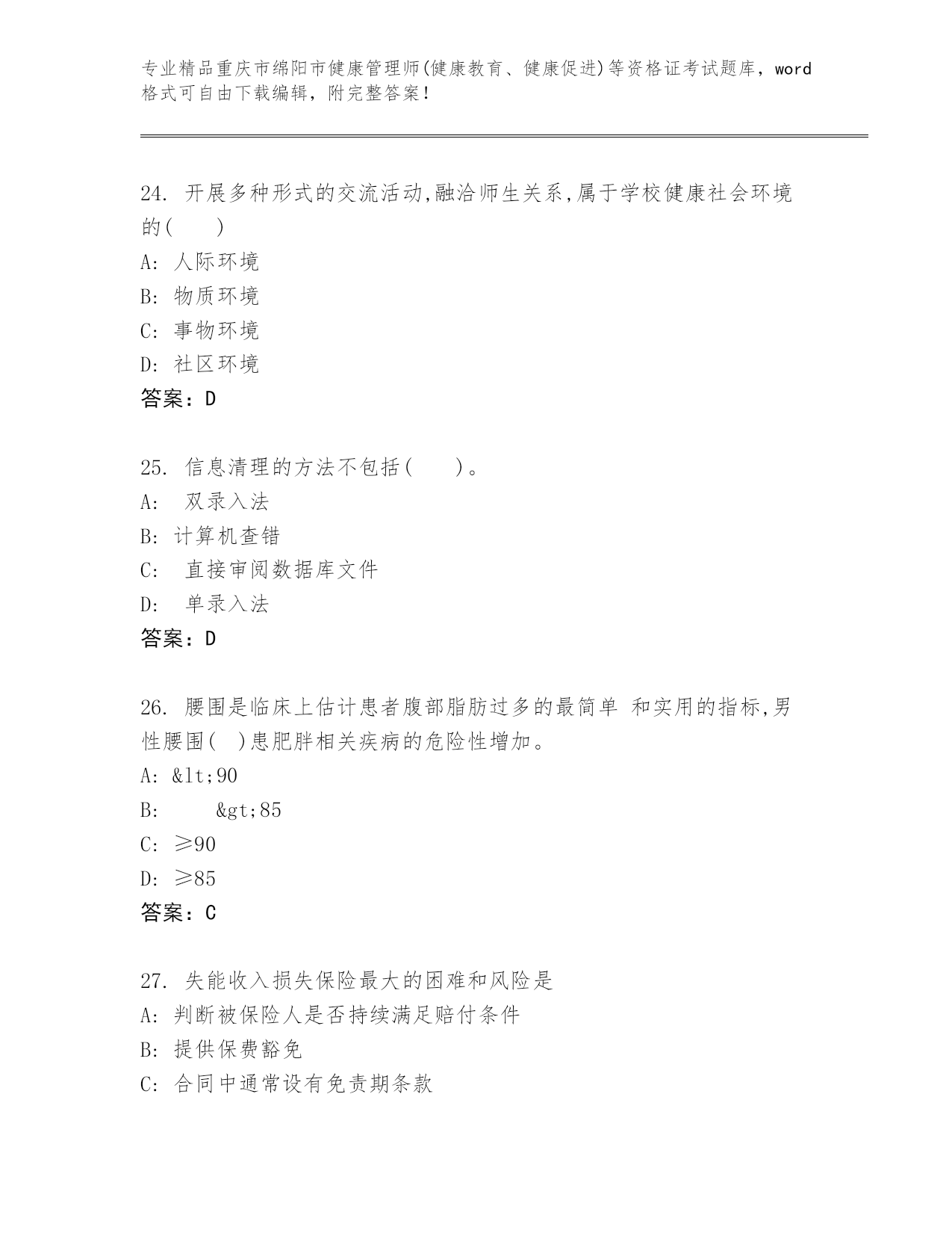 精品重庆市绵阳市健康管理师(健康教育、健康促进)等资格证考试优选题库通用.docx