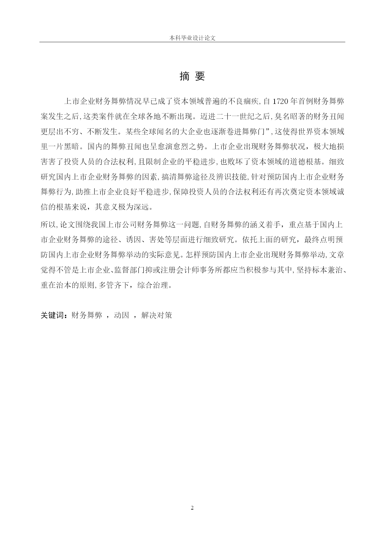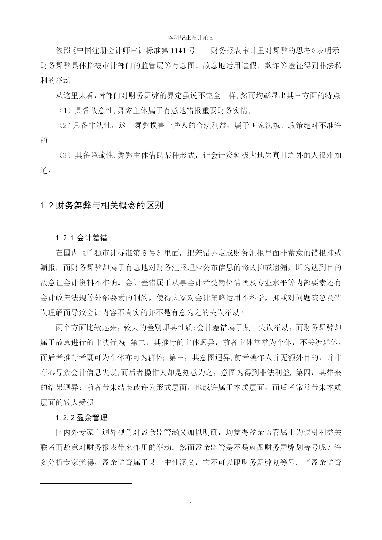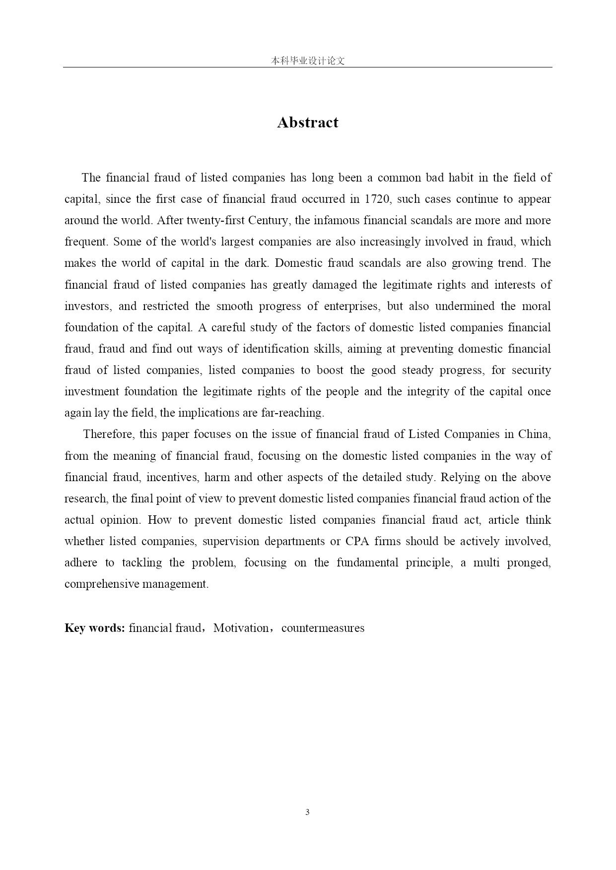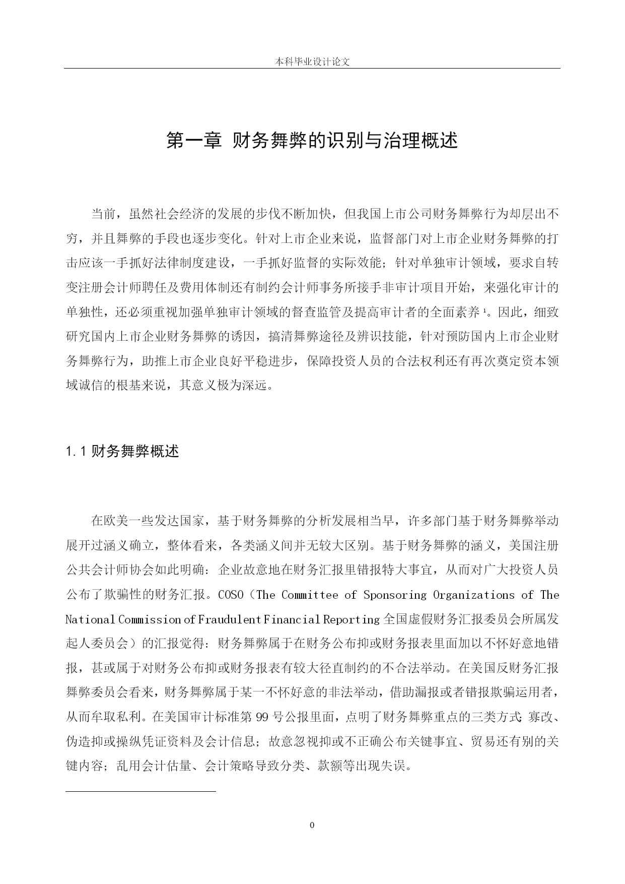本科毕业设计论文2017年上(下)半年申请学士学位毕业设计(论文)封面学生姓名:丁斌论文题目:我国上市公司财务舞弊识别与治理教学单位:河南高等教育自学考试办公室河南科技大学继续教育学院2017年3月PAGE\*MERGEFORMAT5摘要上市企业财务舞弊情况早已成了资本领域普遍的不良痼疾,自1720年首例财务舞弊案发生之后,这类案件就在全球各地不断出现。迈进二十一世纪之后,臭名昭著的财务丑闻更层出不穷、不断发生。某些全球闻名的大企业也逐渐卷进舞弊门”,这使得世界资本领域里一片黑暗。国内的舞弊丑闻也呈愈演愈烈之势。上市企业出现财务舞弊状况,极大地损害害了投资人员的合法权利,且限制企业的平稳进步,也败坏了资本领域的道德根基。细致研究国内上市企业财务舞弊的因素,搞清舞弊途径及辨识技能,针对预防国内上市企业财务舞弊行为,助推上市企业良好平稳进步,保障投资人员的合法权利还有再次奠定资本领域诚信的根基来说,其意义极为深远。所以,论文围绕我国上市公司财务舞弊这一问题,自财务舞弊的涵义着手,重点基于国内上市企业财务舞弊的途径、诱因、害处等层面进行细致研究。依托上面的研究,最终点明预防国内上市企业财务舞弊举动的实际意见。怎样预防国内上市企业出现财务舞弊举动,文章觉得不管是上市企业、监督部门抑或注册会计师事务所都应当积极参与其中,坚持标本兼治、重在治本的原则,多管齐下,综合治理。关键词:财务舞弊,动因,解决对策AbstractThefinancialfraudoflistedcompanieshaslongbeenacommonbadhabitinthefieldofcapital,sincethefirstcaseoffinancialfraudoccurredin1720,suchcasescontinuetoappeararoundtheworld.Aftertwenty-firstCentury,theinfamousfinancialscandalsaremoreandmorefrequent.Someoftheworld'slargestcompaniesarealsoincreasinglyinvolvedinfraud,whichmakestheworldofcapitalinthedark.Domesticfraudscandalsarealsogrowingtrend.Thefinancialfraudoflistedcompanieshasgreatlydamagedthelegitimaterightsandinterestsofinvestors,andrestrictedthesmoothprogressofenterprises,butalsounderminedthemoralfoundationofthecapital.Acarefulstudyofthefactorsofdomesticlistedcompaniesfinancialfraud,fraudandfindoutwaysofidentificationskills,aimingatpreventingdomesticfinancialfraudoflistedcompanies,listedcompaniestoboostthegoodsteadyprogress,forsecurityinvestmentfoundationthelegitimaterightsofthepeopleandtheintegrityofthecapitalonceagainlaythefield,theimplicationsarefar-reaching.Therefore,thispaperfocusesontheissueoffinancialfraudofListedCompaniesinChina,fromthemeaningoffinancialfraud,focusingonthedomesticlistedcompaniesinthewayoffinancialfraud,incentives,harmandotheraspectsofthedetailedstudy.Relyingontheaboveresearch,thefinalpointofviewtopreventdomesticlistedcompaniesfinancialfraudactionoftheactualopinion.Howtopreventdomesticlistedcompaniesfinancialfraudact,articlethinkwhetherlistedcom