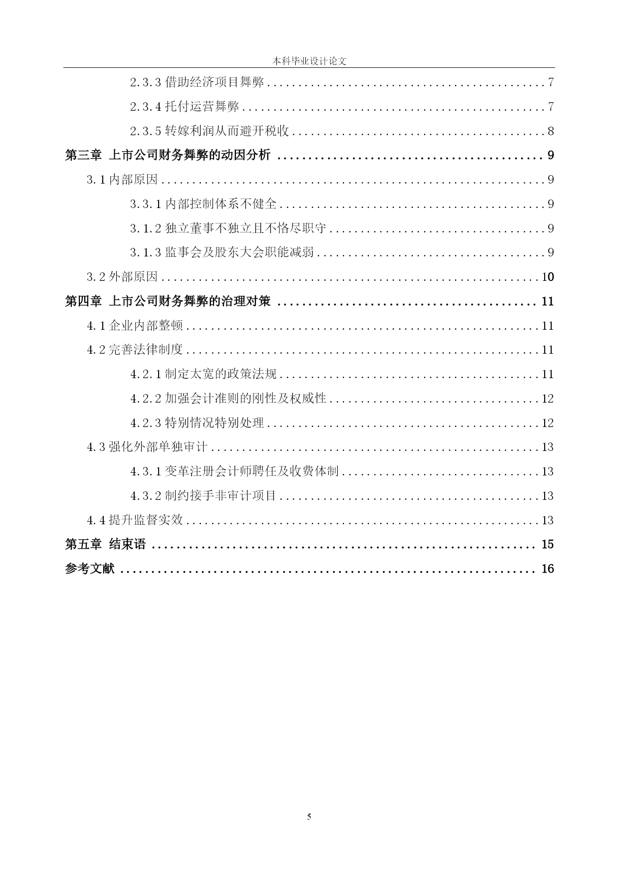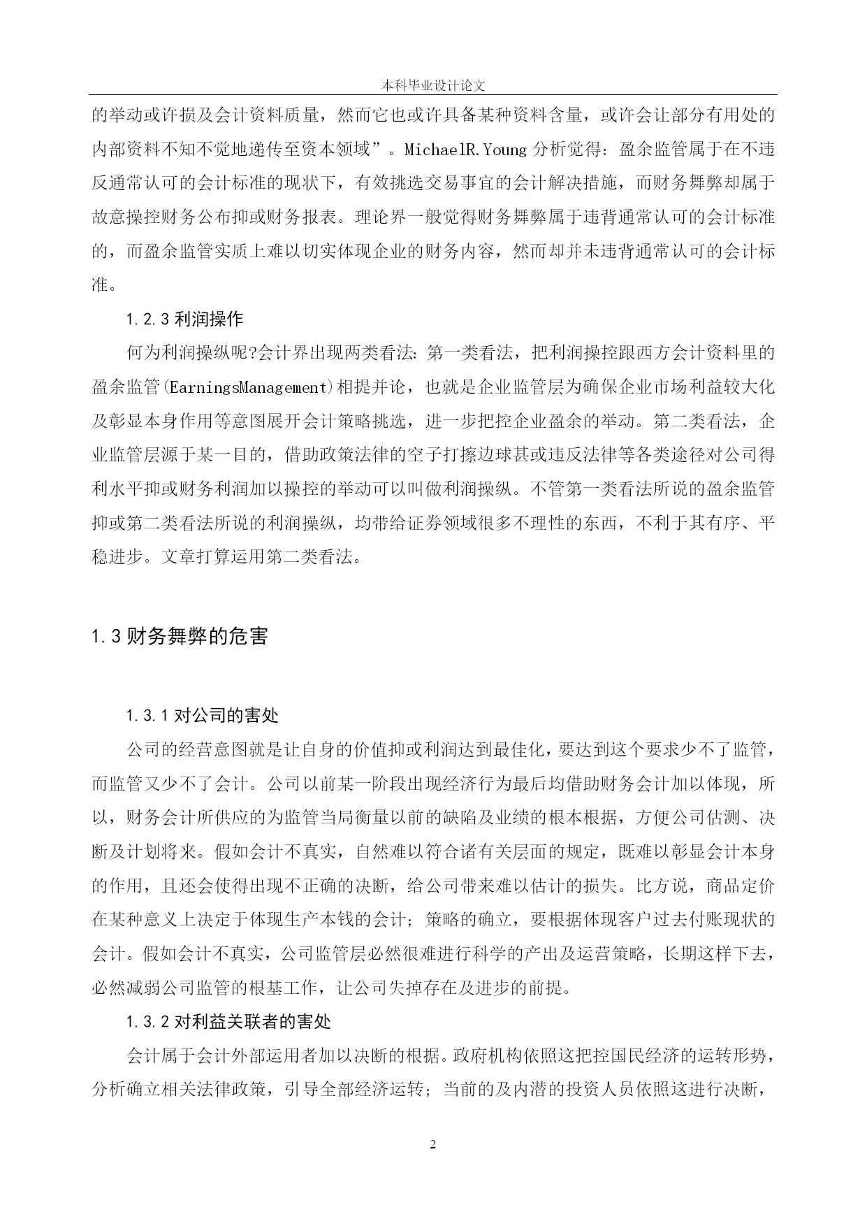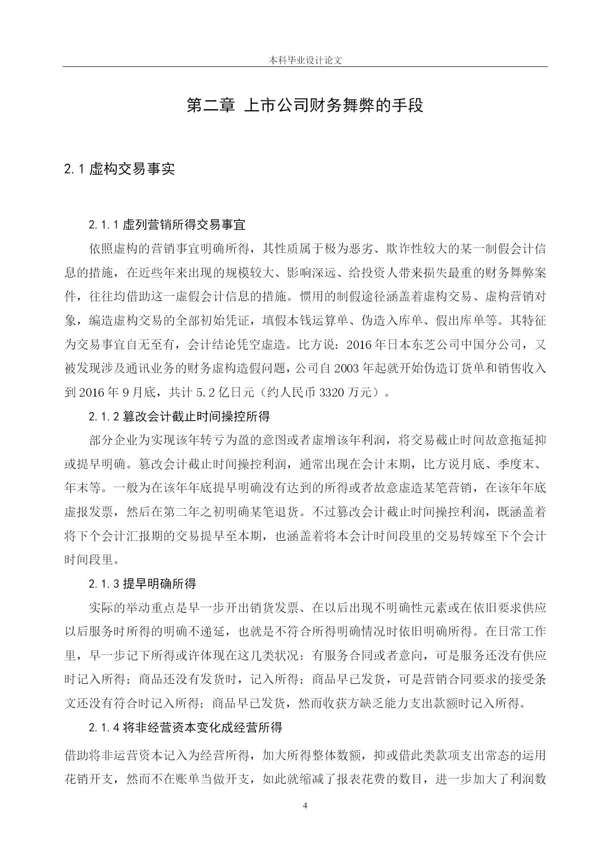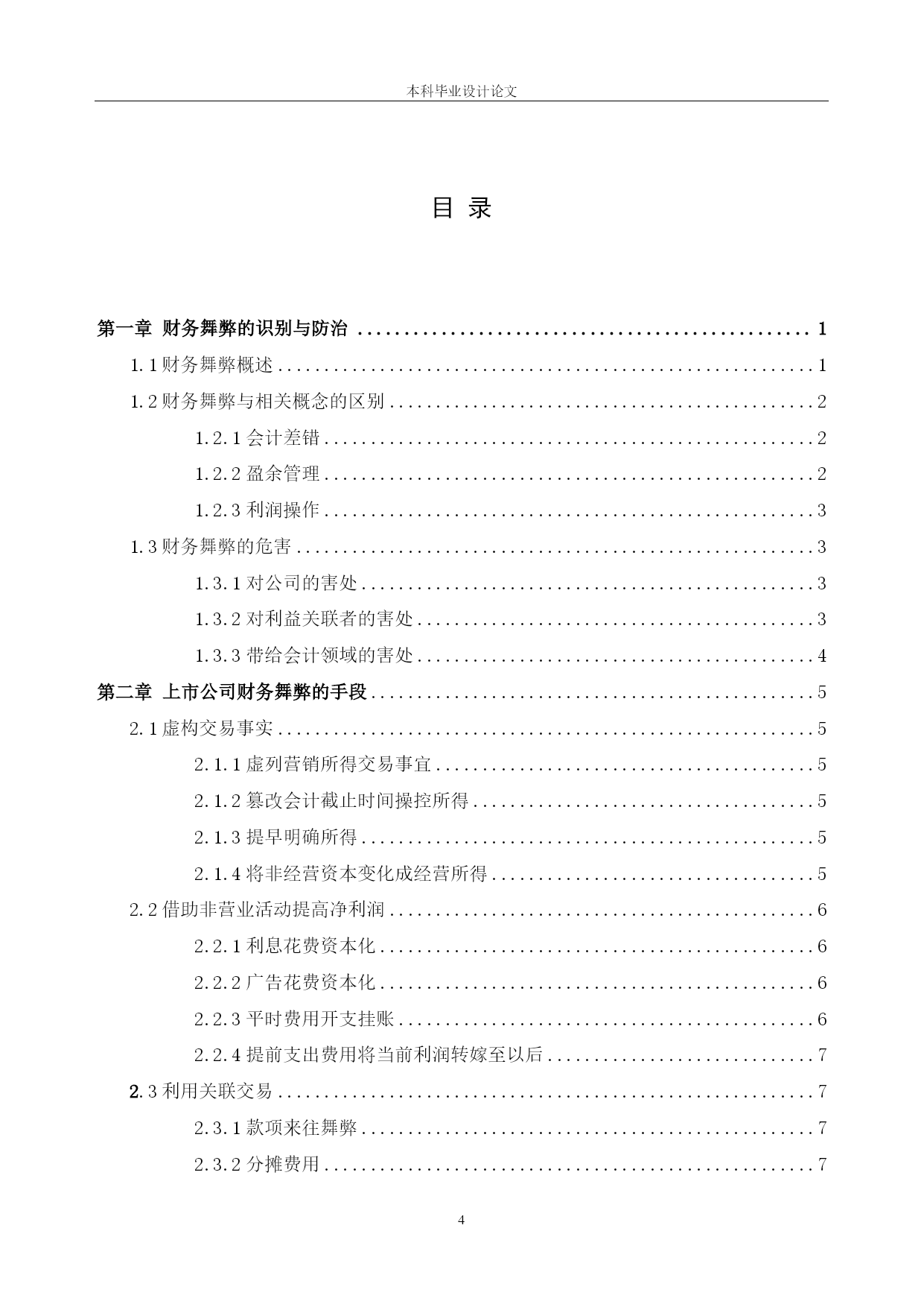 本科毕业设计论文2017年上(下)半年申请学士学位毕业设计(论文)封面学生姓名:丁斌论文题目:我国上市公司财务舞弊识别与治理教学单位:河南高等教育自学考试办公室河南科技大学继续教育学院2017年3月PAGE\*MERGEFORMAT5摘要上市企业财务舞弊情况早已成了资本领域普遍的不良痼疾,自1720年首例财务舞弊案发生之后,这类案件就在全球各地不断出现。迈进二十一世纪之后,臭名昭著的财务丑闻更层出不穷、不断发生。某些全球闻名的大企业也逐渐卷进舞弊门”,这使得世界资本领域里一片黑暗。国内的舞弊丑闻也呈愈演愈烈之势。上市企业出现财务舞弊状况,极大地损害害了投资人员的合法权利,且限制企业的平稳进步,也败坏了资本领域的道德根基。细致研究国内上市企业财务舞弊的因素,搞清舞弊途径及辨识技能,针对预防国内上市企业财务舞弊行为,助推上市企业良好平稳进步,保障投资人员的合法权利还有再次奠定资本领域诚信的根基来说,其意义极为深远。所以,论文围绕我国上市公司财务舞弊这一问题,自财务舞弊的涵义着手,重点基于国内上市企业财务舞弊的途径、诱因、害处等层面进行细致研究。依托上面的研究,最终点明预防国内上市企业财务舞弊举动的实际意见。怎样预防国内上市企业出现财务舞弊举动,文章觉得不管是上市企业、监督部门抑或注册会计师事务所都应当积极参与其中,坚持标本兼治、重在治本的原则,多管齐下,综合治理。关键词:财务舞弊,动因,解决对策AbstractThefinancialfraudoflistedcompanieshaslongbeenacommonbadhabitinthefieldofcapital,sincethefirstcaseoffinancialfraudoccurredin1720,suchcasescontinuetoappeararoundtheworld.Aftertwenty-firstCentury,theinfamousfinancialscandalsaremoreandmorefrequent.Someoftheworld'slargestcompaniesarealsoincreasinglyinvolvedinfraud,whichmakestheworldofcapitalinthedark.Domesticfraudscandalsarealsogrowingtrend.Thefinancialfraudoflistedcompanieshasgreatlydamagedthelegitimaterightsandinterestsofinvestors,andrestrictedthesmoothprogressofenterprises,butalsounderminedthemoralfoundationofthecapital.Acarefulstudyofthefactorsofdomesticlistedcompaniesfinancialfraud,fraudandfindoutwaysofidentificationskills,aimingatpreventingdomesticfinancialfraudoflistedcompanies,listedcompaniestoboostthegoodsteadyprogress,forsecurityinvestmentfoundationthelegitimaterightsofthepeopleandtheintegrityofthecapitalonceagainlaythefield,theimplicationsarefar-reaching.Therefore,thispaperfocusesontheissueoffinancialfraudofListedCompaniesinChina,fromthemeaningoffinancialfraud,focusingonthedomesticlistedcompaniesinthewayoffinancialfraud,incentives,harmandotheraspectsofthedetailedstudy.Relyingontheaboveresearch,thefinalpointofviewtopreventdomesticlistedcompaniesfinancialfraudactionoftheactualopinion.Howtopreventdomesticlistedcompaniesfinancialfraudact,articlethinkwhetherlistedcom