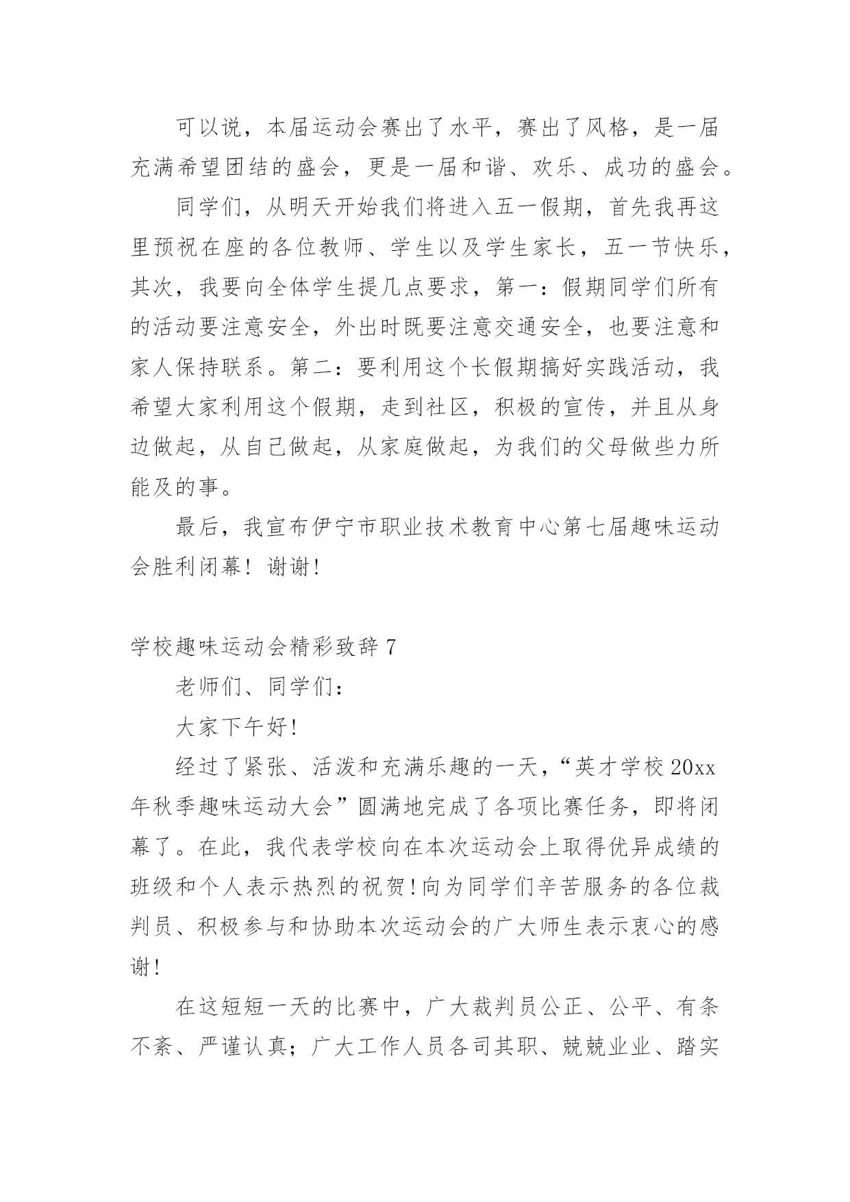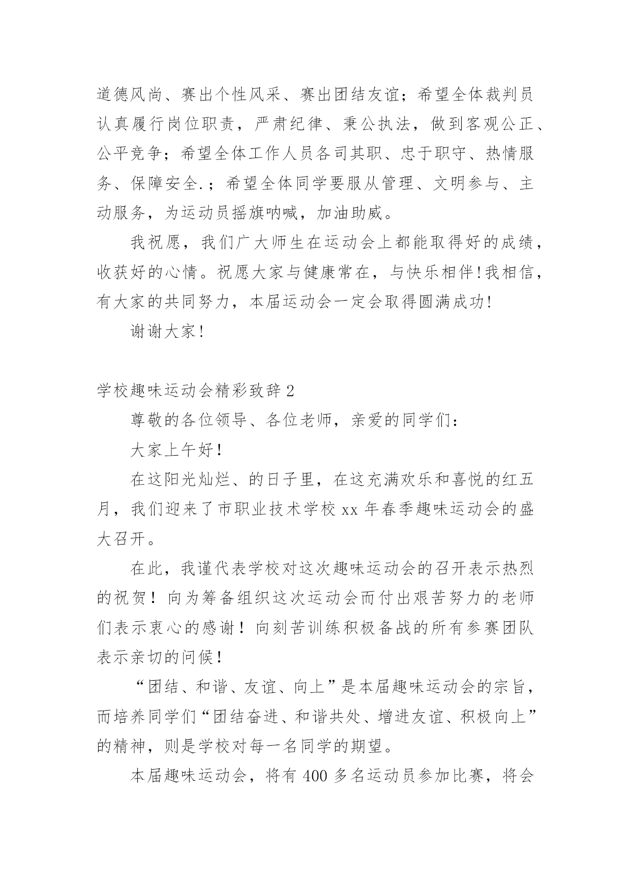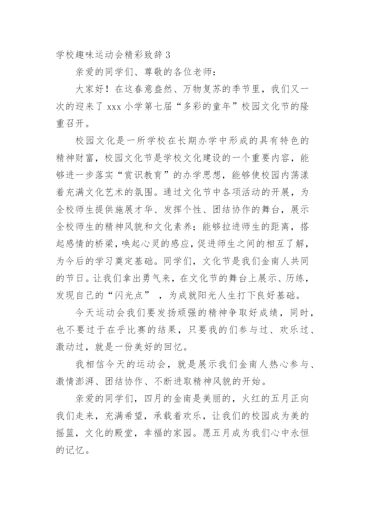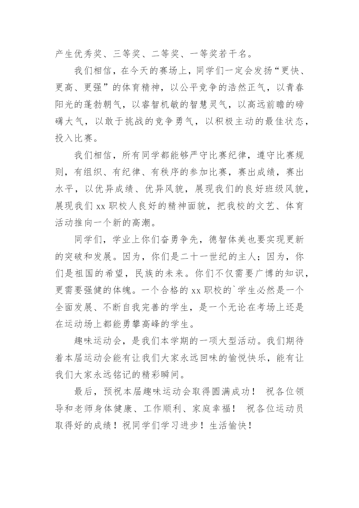 学校趣味运动会精彩致辞学校趣味运动会精彩致辞(通用7篇)无论是在学校还是在社会中,大家对致辞都不陌生吧,有些致辞超出了某种仪式本身的约束,上升到议论说明更广泛的问题就兼具了演讲的特点。你知道什么样的致辞才是优秀的致辞吗?下面是小编为大家整理的学校趣味运动会精彩致辞(通用7篇),仅供参考,希望能够帮助到大家。学校趣味运动会精彩致辞1敬爱的老师,亲爱的同学们:大家上午好!秋高气爽,稻谷飘香。我们满怀喜悦的心情迎来了xx学校趣味运动会。在此,我代表学校、代表组委会对本届运动会的召开,表示热烈的祝贺!对全体运动员,全体教师,全体工作人员表示衷心的感谢!这次运动会的召开,是学校响应教育部的号召,开展阳光体育运动的一次具体行动,同时也是学校素质教育的一次大展示,大检阅。这届运动会比赛项目的设置,既注重体育运动的竞技性,更注重体育运动的趣味性。“团结、奋进、文明、友谊”是本届运动会的宗旨和主题。作为xx学校的一员,我和大家一样,期待着这一届运动会能够精彩纷呈,笑声不断。我希望,参赛的师生要奋勇拼搏,赛出竞技水平、赛出道德风尚、赛出个性风采、赛出团结友谊;希望全体裁判员认真履行岗位职责,严肃纪律、秉公执法,做到客观公正、公平竞争;希望全体工作人员各司其职、忠于职守、热情服务、保障安全.;希望全体同学要服从管理、文明参与、主动服务,为运动员摇旗呐喊,加油助威。我祝愿,我们广大师生在运动会上都能取得好的成绩,收获好的心情。祝愿大家与健康常在,与快乐相伴!我相信,有大家的共同努力,本届运动会一定会取得圆满成功!谢谢大家!学校趣味运动会精彩致辞2尊敬的各位领导、各位老师,亲爱的同学们:大家上午好!在这阳光灿烂、的日子里,在这充满欢乐和喜悦的红五月,我们迎来了市职业技术学校xx年春季趣味运动会的盛大召开。在此,我谨代表学校对这次趣味运动会的召开表示热烈的祝贺!向为筹备组织这次运动会而付出艰苦努力的老师们表示衷心的感谢!向刻苦训练积极备战的所有参赛团队表示亲切的问候!“团结、和谐、友谊、向上”是本届趣味运动会的宗旨,而培养同学们“团结奋进、和谐共处、增进友谊、积极向上”的精神,则是学校对每一名同学的期望。本届趣味运动会,将有400多名运动员参加比赛,将会产生优秀奖、三等奖、二等奖、一等奖若干名。我们相信,在今天的赛场上,同学们一定会发扬“更快、更高、更强”的体育精神,以公平竞争的浩然正气,以青春阳光的蓬勃朝气,以睿智机敏的智慧灵气,以高远前瞻的磅礴大气,以敢于挑战的竞争勇气,以积极主动的最佳状态,投入比赛。我们相信,所有同学都能够严守比赛纪律,遵守比赛规则,有组织、有纪律、有秩序的参加比赛,赛出成绩,赛出水平,以优异成绩、优异风貌,展现我们的良好班级风貌,展现我们xx职校人良好的精神面貌,把我校的文艺、体育活动推向一个新的高潮。同学们,学业上你们奋勇争先,德智体美也要实现更新的突破和发展。因为,你们是二十一世纪的主人;因为,你们是祖国的希望,民族的未来。你们不仅需要广博的知识,更需要强健的体魄。一个合格的xx职校的`学生必然是一个全面发展、不断自我完善的学生,是一个无论在考场上还是在运动场上都能勇攀高峰的学生。趣味运动会,是我们本学期的一项大型活动。我们期待着本届运动会能有让我们大家永远回味的愉悦快乐,能有让我们大家永远铭记的精彩瞬间。最后,预祝本届趣味运动会取得圆满成功!祝各位领导和老师身体健康、工作顺利、家庭幸福!祝各位运动员取得好的成绩!祝同学们学习进步!生活愉快!学校趣味运动会精彩致辞3亲爱的同学们、尊敬的各位老师:大家好!在这春意盎然、万物复苏的季节里,我们又一次的迎来了xxx小学第七届“多彩的童年”校园文化节的隆重召开。校园文化是一所学校在长期办学中形成的具有特色的精神财富,校园文化节是学校文化建设的一个重要内容,能够进一步落实“赏识教育”的办学思想,能够使校园内荡漾着充满文化艺术的氛围。通过文化节中各项活动的开展,为全校师生提供施展才华、发挥个性、团结协作的舞台,展示全校师生的精神风貌和文化素养;能够拉进师生的距离,搭起感情的桥梁,唤起心灵的感应,促进师生之间的相互了解,为今后的学习奠定基础。同学们,文化节是我们金南人共同的节日。让我们拿出勇气来,在文化节的舞台上展示、历练,发现自己的“闪光点”,为成就阳光人生打下良好基础。今天运动会我们要发扬顽强的精神争取好成绩,同时,也不要过于在乎比赛的结果,只要我的们参与过、欢乐过、激动过,就是一份美好的回忆。我相信今天的运动会,就是展示我们金南人热心参与、激情澎湃、团结协作、不断进取精神风貌的开始。亲爱的同学们,四月的金南是美丽的,火红的五月正向我们走来,充满希望,承载着欢乐,让我们的校园成为美的摇篮,文化的殿堂,幸福的家园。愿五月成为我们心中永恒的记忆。预祝第九届趣味运动会圆满成功!预祝“多彩