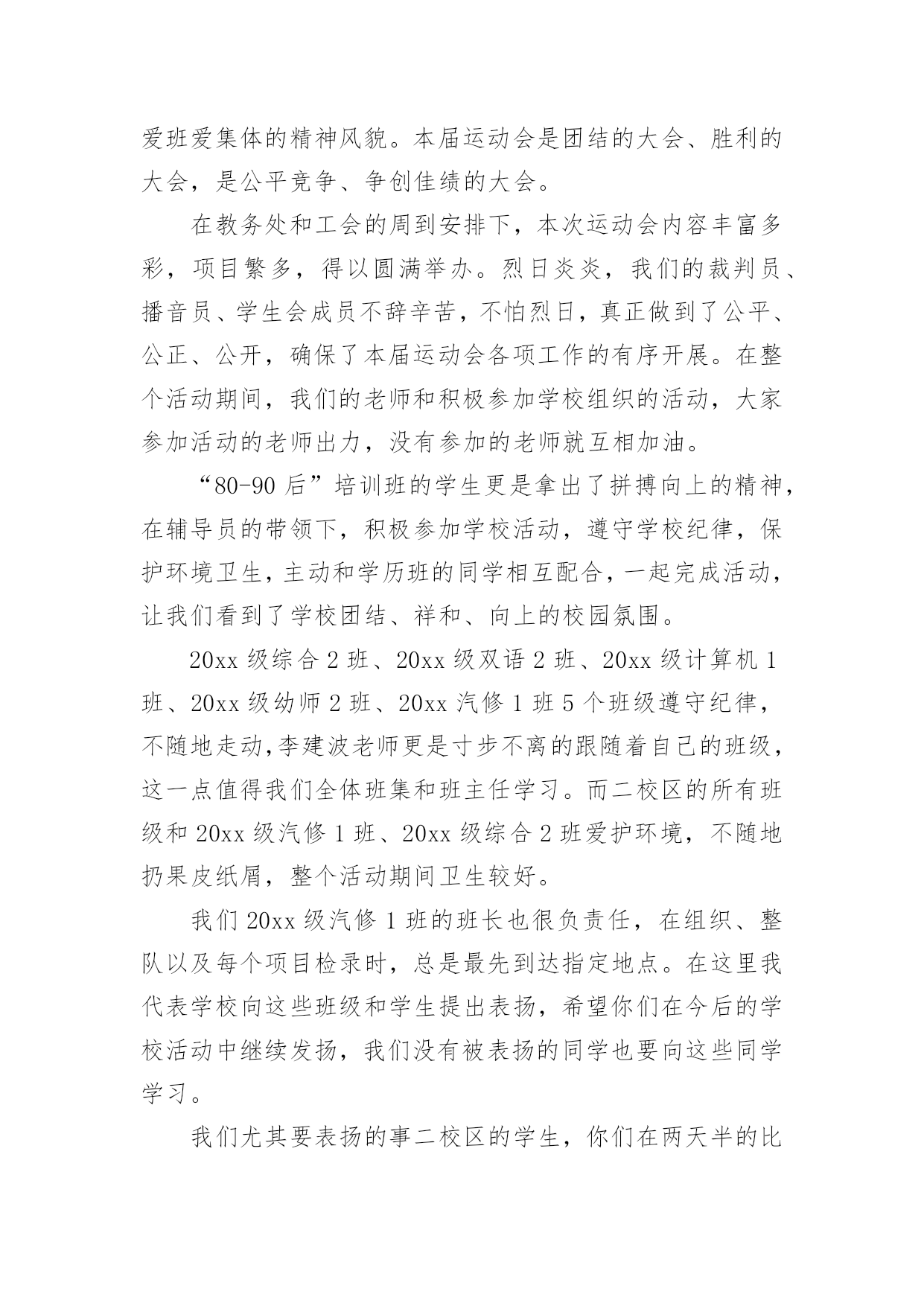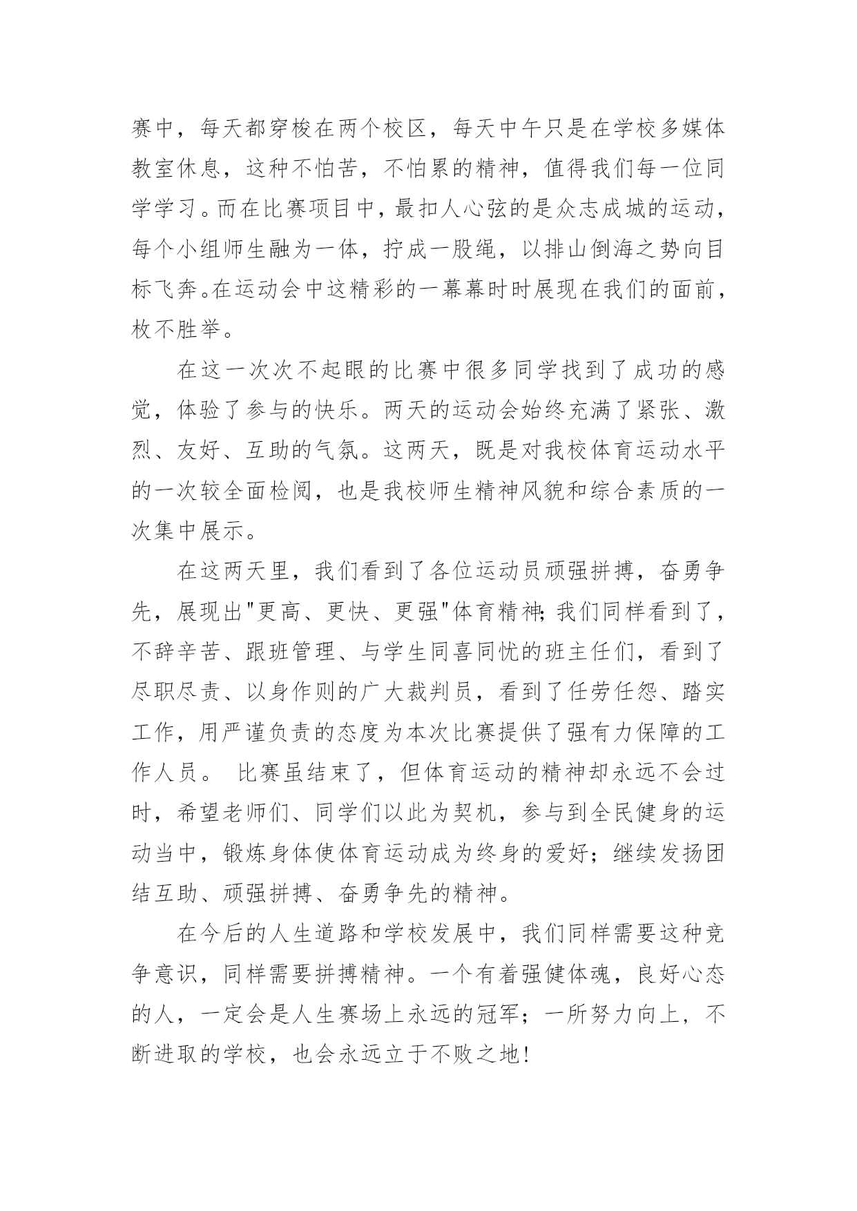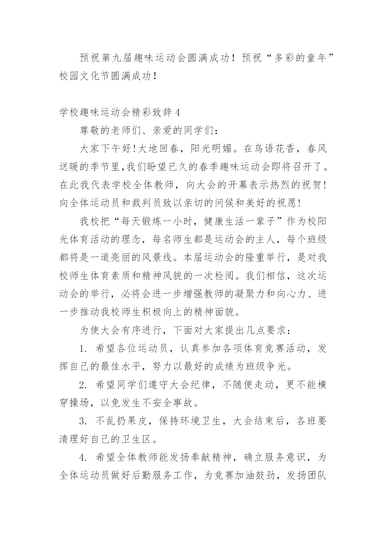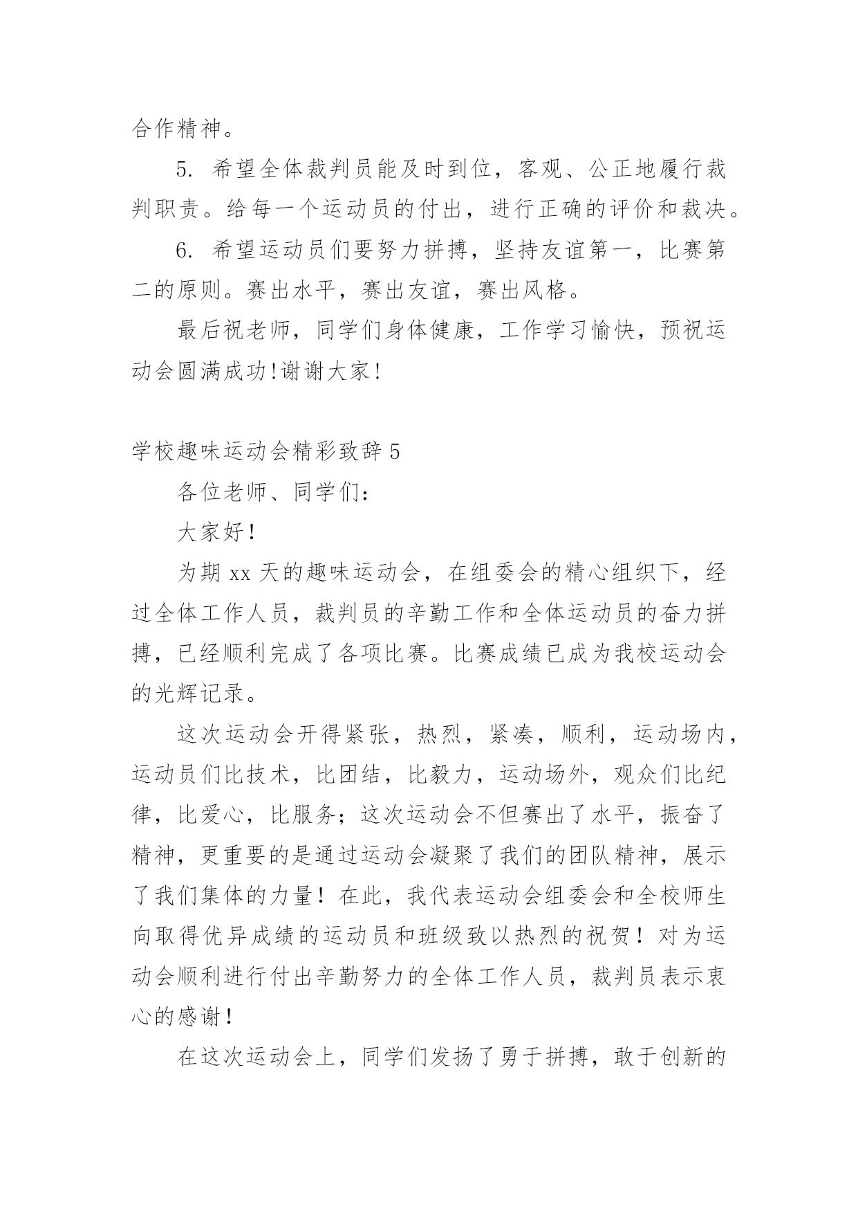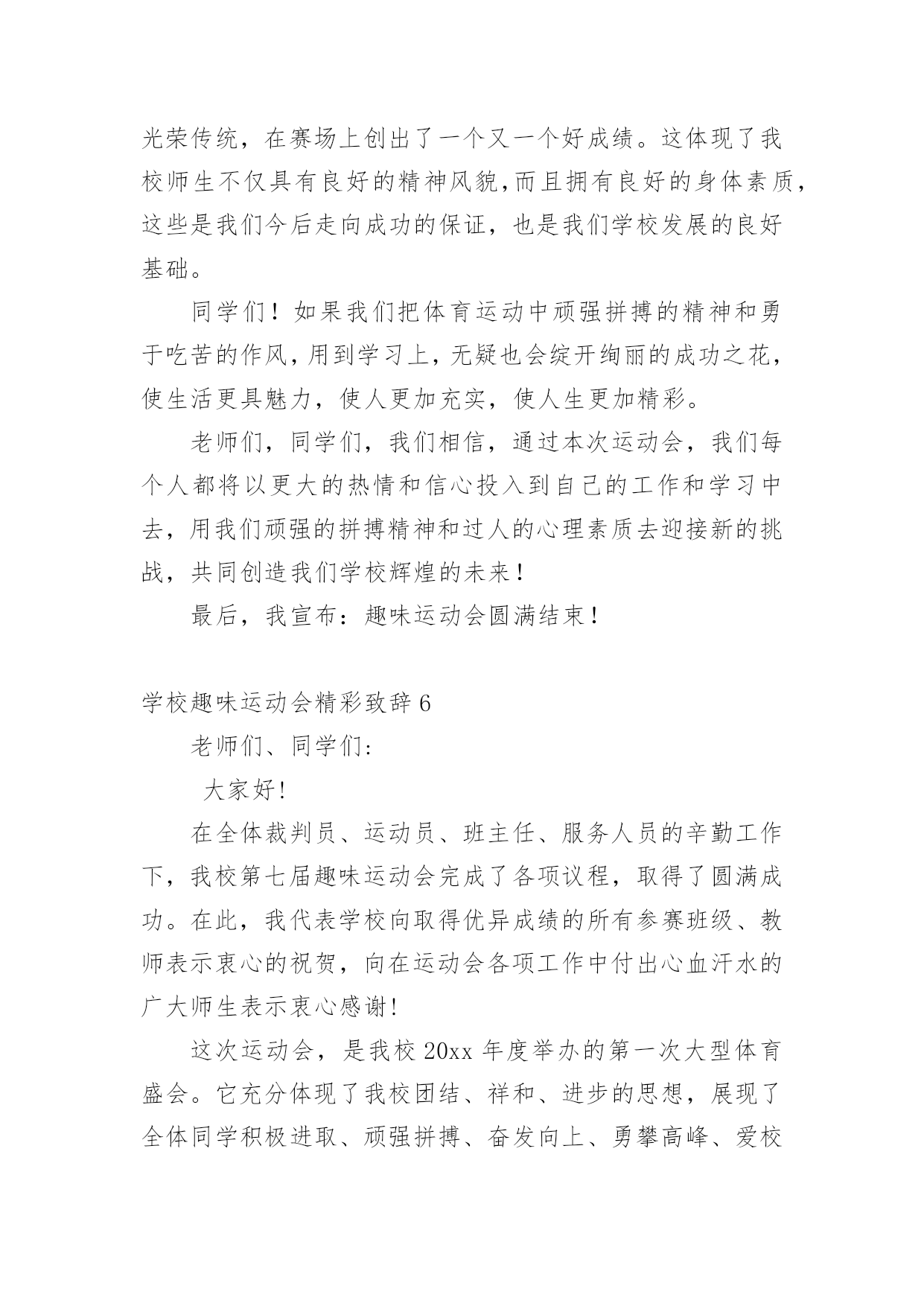 学校趣味运动会精彩致辞学校趣味运动会精彩致辞(通用7篇)无论是在学校还是在社会中,大家对致辞都不陌生吧,有些致辞超出了某种仪式本身的约束,上升到议论说明更广泛的问题就兼具了演讲的特点。你知道什么样的致辞才是优秀的致辞吗?下面是小编为大家整理的学校趣味运动会精彩致辞(通用7篇),仅供参考,希望能够帮助到大家。学校趣味运动会精彩致辞1敬爱的老师,亲爱的同学们:大家上午好!秋高气爽,稻谷飘香。我们满怀喜悦的心情迎来了xx学校趣味运动会。在此,我代表学校、代表组委会对本届运动会的召开,表示热烈的祝贺!对全体运动员,全体教师,全体工作人员表示衷心的感谢!这次运动会的召开,是学校响应教育部的号召,开展阳光体育运动的一次具体行动,同时也是学校素质教育的一次大展示,大检阅。这届运动会比赛项目的设置,既注重体育运动的竞技性,更注重体育运动的趣味性。“团结、奋进、文明、友谊”是本届运动会的宗旨和主题。作为xx学校的一员,我和大家一样,期待着这一届运动会能够精彩纷呈,笑声不断。我希望,参赛的师生要奋勇拼搏,赛出竞技水平、赛出道德风尚、赛出个性风采、赛出团结友谊;希望全体裁判员认真履行岗位职责,严肃纪律、秉公执法,做到客观公正、公平竞争;希望全体工作人员各司其职、忠于职守、热情服务、保障安全.;希望全体同学要服从管理、文明参与、主动服务,为运动员摇旗呐喊,加油助威。我祝愿,我们广大师生在运动会上都能取得好的成绩,收获好的心情。祝愿大家与健康常在,与快乐相伴!我相信,有大家的共同努力,本届运动会一定会取得圆满成功!谢谢大家!学校趣味运动会精彩致辞2尊敬的各位领导、各位老师,亲爱的同学们:大家上午好!在这阳光灿烂、的日子里,在这充满欢乐和喜悦的红五月,我们迎来了市职业技术学校xx年春季趣味运动会的盛大召开。在此,我谨代表学校对这次趣味运动会的召开表示热烈的祝贺!向为筹备组织这次运动会而付出艰苦努力的老师们表示衷心的感谢!向刻苦训练积极备战的所有参赛团队表示亲切的问候!“团结、和谐、友谊、向上”是本届趣味运动会的宗旨,而培养同学们“团结奋进、和谐共处、增进友谊、积极向上”的精神,则是学校对每一名同学的期望。本届趣味运动会,将有400多名运动员参加比赛,将会产生优秀奖、三等奖、二等奖、一等奖若干名。我们相信,在今天的赛场上,同学们一定会发扬“更快、更高、更强”的体育精神,以公平竞争的浩然正气,以青春阳光的蓬勃朝气,以睿智机敏的智慧灵气,以高远前瞻的磅礴大气,以敢于挑战的竞争勇气,以积极主动的最佳状态,投入比赛。我们相信,所有同学都能够严守比赛纪律,遵守比赛规则,有组织、有纪律、有秩序的参加比赛,赛出成绩,赛出水平,以优异成绩、优异风貌,展现我们的良好班级风貌,展现我们xx职校人良好的精神面貌,把我校的文艺、体育活动推向一个新的高潮。同学们,学业上你们奋勇争先,德智体美也要实现更新的突破和发展。因为,你们是二十一世纪的主人;因为,你们是祖国的希望,民族的未来。你们不仅需要广博的知识,更需要强健的体魄。一个合格的xx职校的`学生必然是一个全面发展、不断自我完善的学生,是一个无论在考场上还是在运动场上都能勇攀高峰的学生。趣味运动会,是我们本学期的一项大型活动。我们期待着本届运动会能有让我们大家永远回味的愉悦快乐,能有让我们大家永远铭记的精彩瞬间。最后,预祝本届趣味运动会取得圆满成功!祝各位领导和老师身体健康、工作顺利、家庭幸福!祝各位运动员取得好的成绩!祝同学们学习进步!生活愉快!学校趣味运动会精彩致辞3亲爱的同学们、尊敬的各位老师:大家好!在这春意盎然、万物复苏的季节里,我们又一次的迎来了xxx小学第七届“多彩的童年”校园文化节的隆重召开。校园文化是一所学校在长期办学中形成的具有特色的精神财富,校园文化节是学校文化建设的一个重要内容,能够进一步落实“赏识教育”的办学思想,能够使校园内荡漾着充满文化艺术的氛围。通过文化节中各项活动的开展,为全校师生提供施展才华、发挥个性、团结协作的舞台,展示全校师生的精神风貌和文化素养;能够拉进师生的距离,搭起感情的桥梁,唤起心灵的感应,促进师生之间的相互了解,为今后的学习奠定基础。同学们,文化节是我们金南人共同的节日。让我们拿出勇气来,在文化节的舞台上展示、历练,发现自己的“闪光点”,为成就阳光人生打下良好基础。今天运动会我们要发扬顽强的精神争取好成绩,同时,也不要过于在乎比赛的结果,只要我的们参与过、欢乐过、激动过,就是一份美好的回忆。我相信今天的运动会,就是展示我们金南人热心参与、激情澎湃、团结协作、不断进取精神风貌的开始。亲爱的同学们,四月的金南是美丽的,火红的五月正向我们走来,充满希望,承载着欢乐,让我们的校园成为美的摇篮,文化的殿堂,幸福的家园。愿五月成为我们心中永恒的记忆。预祝第九届趣味运动会圆满成功!预祝“多彩