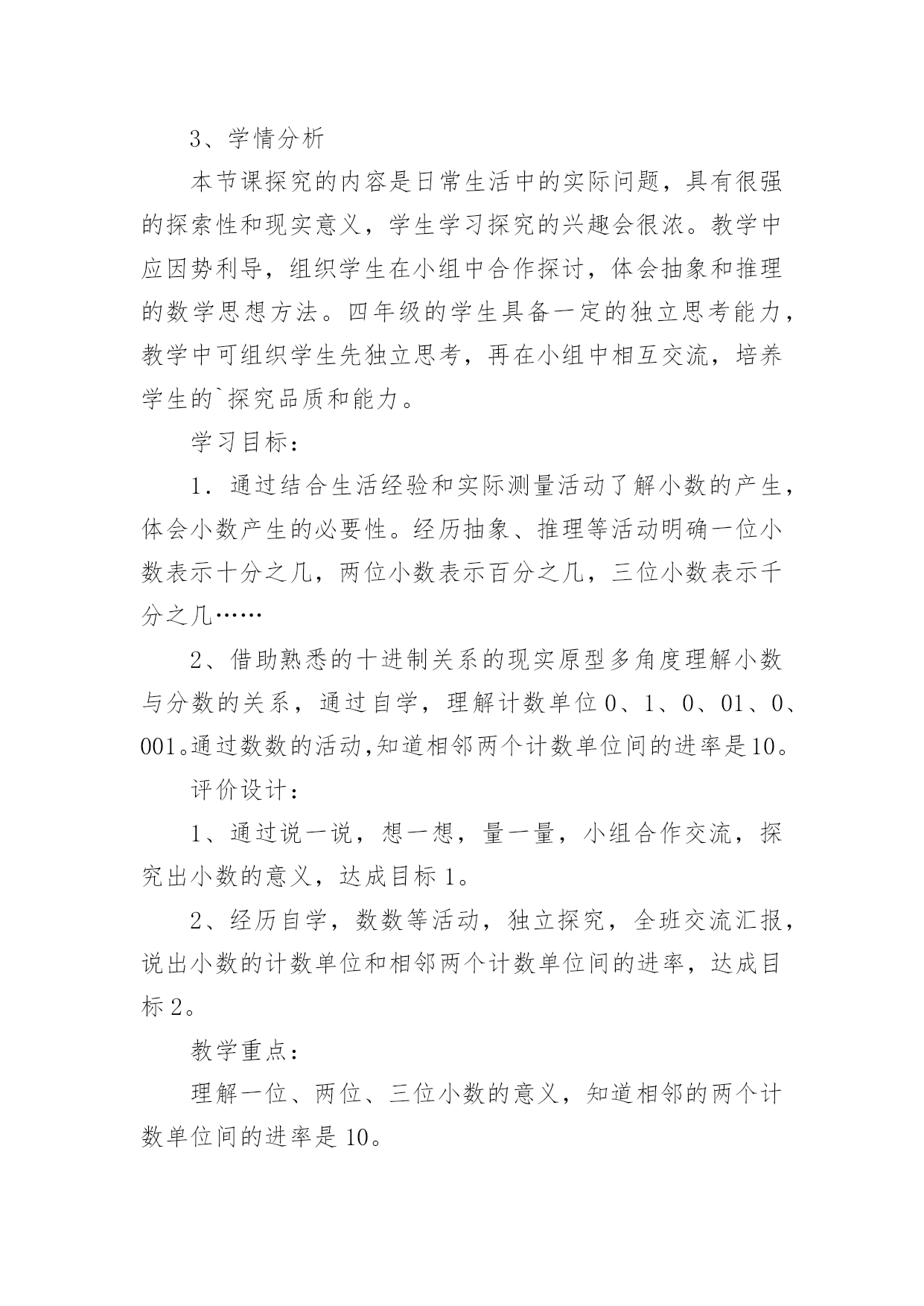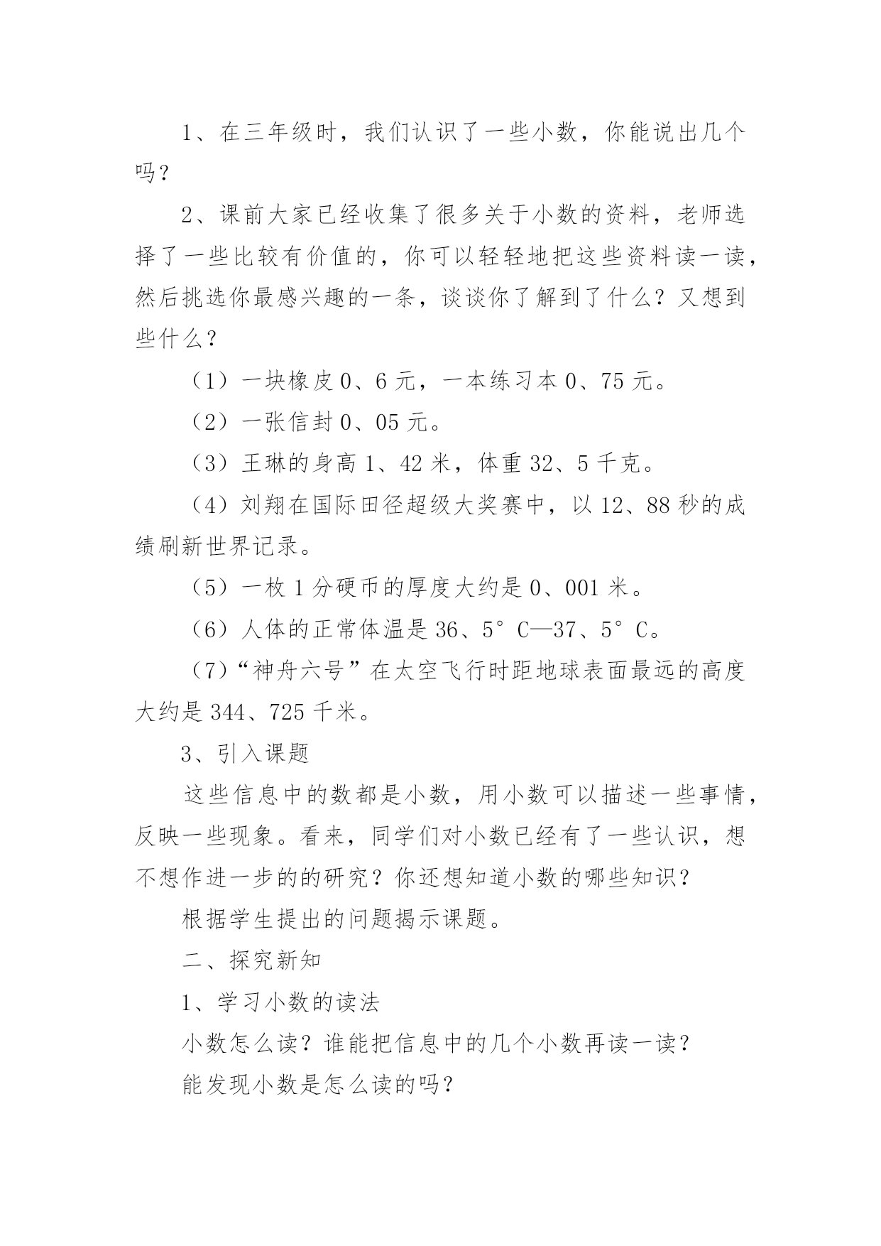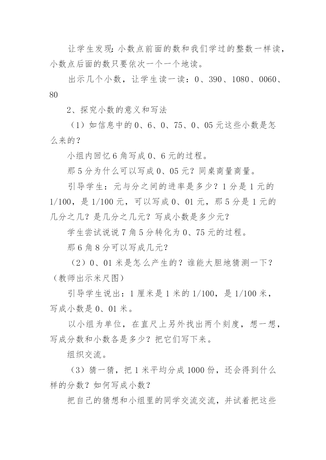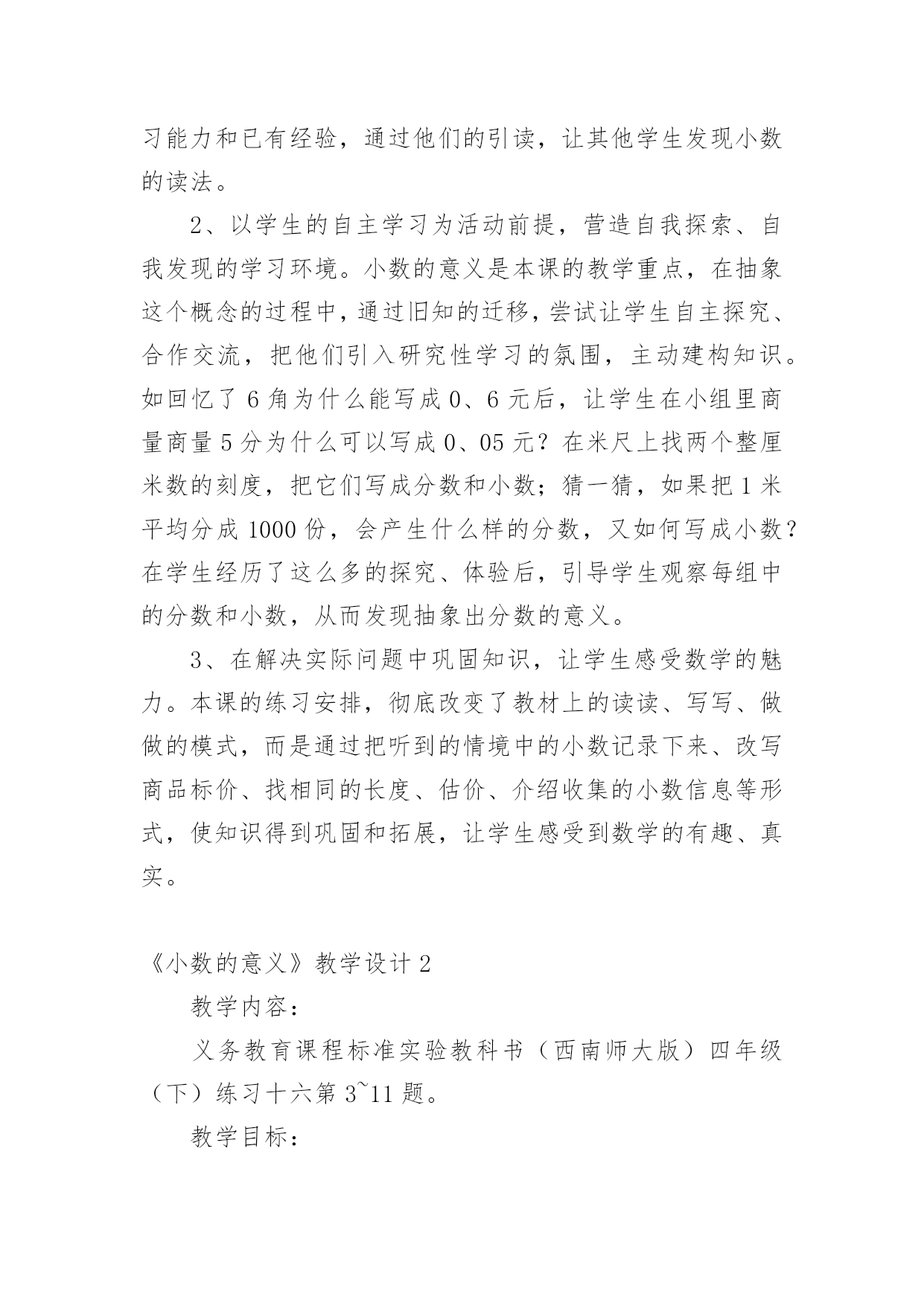 《小数的意义》教学设计(集合)《小数的意义》教学设计作为一位无私奉献的人民教师,常常要根据教学需要编写教学设计,教学设计是一个系统化规划教学系统的过程。一份好的教学设计是什么样子的呢?下面是小编为大家收集的《小数的意义》教学设计,仅供参考,大家一起来看看吧。《小数的意义》教学设计1教学内容:国标苏教版第28~30页例1、例2及相应的“试一试”、“练一练”,练习五第1~5题。教学目标:1、在现实情境中,能初步理解小数的意义,学会读写小数,体会小数与分数的联系。2、在用小数进行表达的过程中,感受小数与生活的联系,增强数学学习的兴趣。3、初步养成善于观察、善于比较、善于交流等良好的学习习惯。教学重点:理解小数的意义。教学过程:一、交流信息,引入课题1、在三年级时,我们认识了一些小数,你能说出几个吗?2、课前大家已经收集了很多关于小数的资料,老师选择了一些比较有价值的,你可以轻轻地把这些资料读一读,然后挑选你最感兴趣的一条,谈谈你了解到了什么?又想到些什么?(1)一块橡皮0、6元,一本练习本0、75元。(2)一张信封0、05元。(3)王琳的身高1、42米,体重32、5千克。(4)刘翔在国际田径超级大奖赛中,以12、88秒的成绩刷新世界记录。(5)一枚1分硬币的厚度大约是0、001米。(6)人体的正常体温是36、5°C—37、5°C。(7)“神舟六号”在太空飞行时距地球表面最远的高度大约是344、725千米。3、引入课题这些信息中的数都是小数,用小数可以描述一些事情,反映一些现象。看来,同学们对小数已经有了一些认识,想不想作进一步的的研究?你还想知道小数的哪些知识?根据学生提出的问题揭示课题。二、探究新知1、学习小数的读法小数怎么读?谁能把信息中的几个小数再读一读?能发现小数是怎么读的吗?让学生发现:小数点前面的数和我们学过的整数一样读,小数点后面的数只要依次一个一个地读。出示几个小数,让学生读一读:0、390、1080、0060、802、探究小数的意义和写法(1)如信息中的0、6、0、75、0、05元这些小数是怎么来的?小组内回忆6角写成0、6元的过程。那5分为什么可以写成0、05元?同桌商量商量。引导学生:元与分之间的进率是多少?1分是1元的1/100,是1/100元,可以写成0、01元,那5分是1元的几分之几?是几分之几元?写成小数是多少元?学生尝试说说7角5分转化为0、75元的过程。那6角8分可以写成几元?(2)0、01米是怎么产生的?谁能大胆地猜测一下?(教师出示米尺图)引导学生说出:1厘米是1米的1/100,是1/100米,写成小数是0、01米。以小组为单位,在直尺上另外找出两个刻度,想一想,写成分数和小数各是多少?把它们写下来。组织交流。(3)猜一猜,把1米平均分成1000份,还会得到什么样的分数?如何写成小数?把自己的猜想和小组里的同学交流交流,并试着把这些分数、小数写下来。组织全班交流。3、抽象概括:仔细观察上面每组的分数和小数,你能发现什么?把你的发现在小组里和同学交流。引导学生概括:通过刚才的学习,我们知道分母是10、100、1000……的分数,可以用小数表示。一位小数表示十分之几,两位小数表示百分之几,三位小数表示千分之几……以前我们学习了一位小数,今天又认识了两位小数和三位小数,还会有位数更多的小数吗?4、教学“试一试”先让学生独立完成,再组织交流,说说怎么想的。结合图来理解每个小数把整数“1”平均分成了几份,表示这样的'几份。三、练习拓展1、把听到的小数记录下来。早晨6点30分,小明从1、2米宽的小床上起来,挤了0、008米长的一段牙膏,用了0、05小时刷牙洗脸,喝了一杯0、243升的牛奶,吃了一只面包,背起2、5千克的书包,飞快地向离家1、46千米的学校跑去。指名板演。读一读这几个小数,选择整数部分是零的小数说说它们表示几分之几。2、最近学校附近开了一家文具店,但店里商品的标价不太规范,请你们帮个忙,把这些标价改成用“元”作单位的小数。(图略)铅笔3角小刀8分直尺5角9分练习本76/100元3、把你认为长度相同的找出来4毫米0、004米4/1000米0、04米4厘米4分米4/10米4、估价:一筒薯片的价格在5元~6元之间。5、把课前收集的小数信息,挑一个用今天学到的知识介绍给同桌听。四、课堂小结今天,我们进一步认识了小数,你有哪些收获?在我们的生活、生产中经常用到小数,课后围绕“生活中的小数”写一篇数学日记。反思:我总认为“小数的意义和读写”这一内容用传统的讲授法比较恰当,因为这些概念是约定束成的,而动手实践、自主探究等只能是一种形式上的追求。如何使传统教学与新理念融合在一起,达到比较完美的教学效果,本课进行了一点尝试。1、以小数在生活中的实际意义为切入点,从学生的生活经验和知识背景出发,引导学生进行积