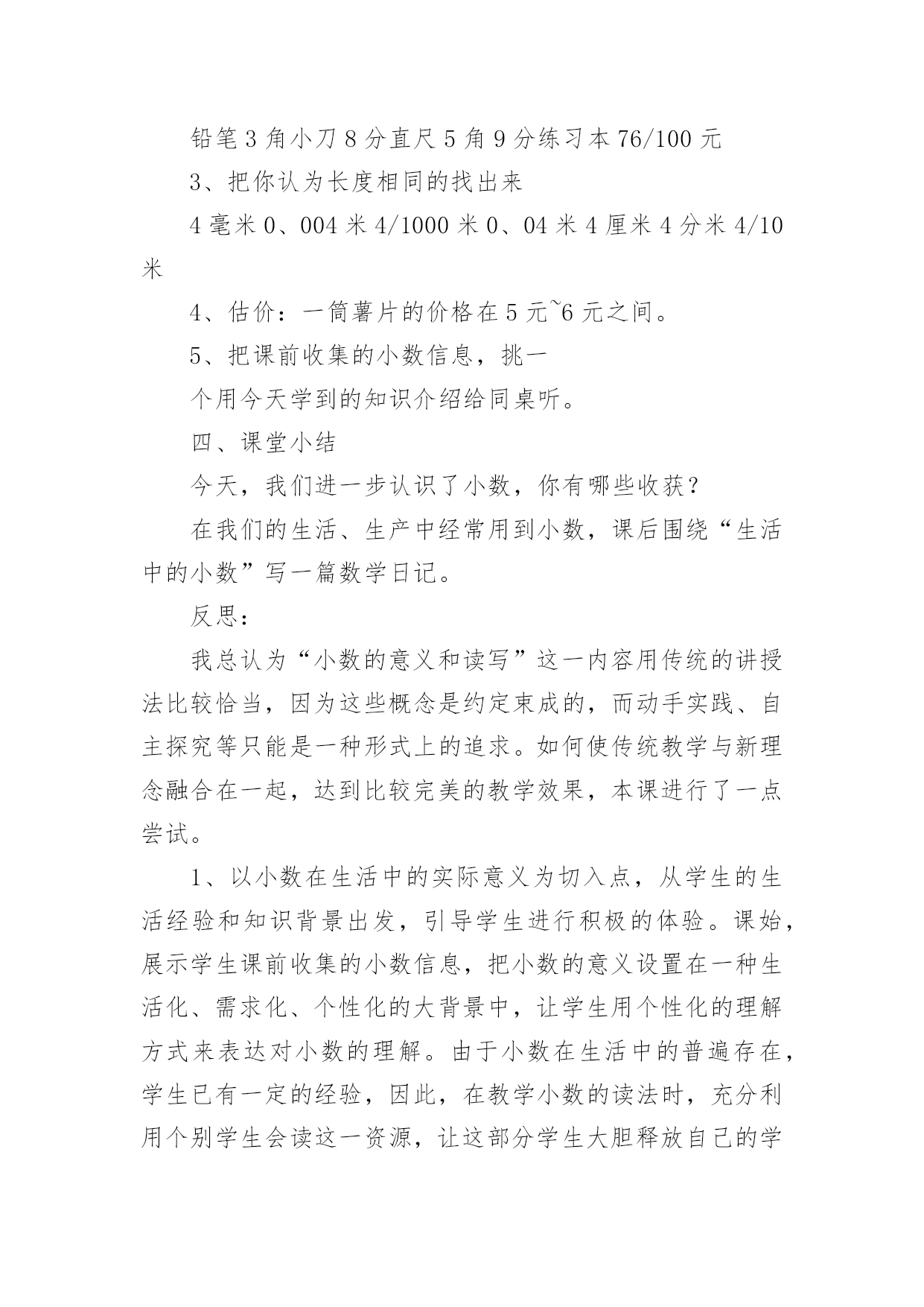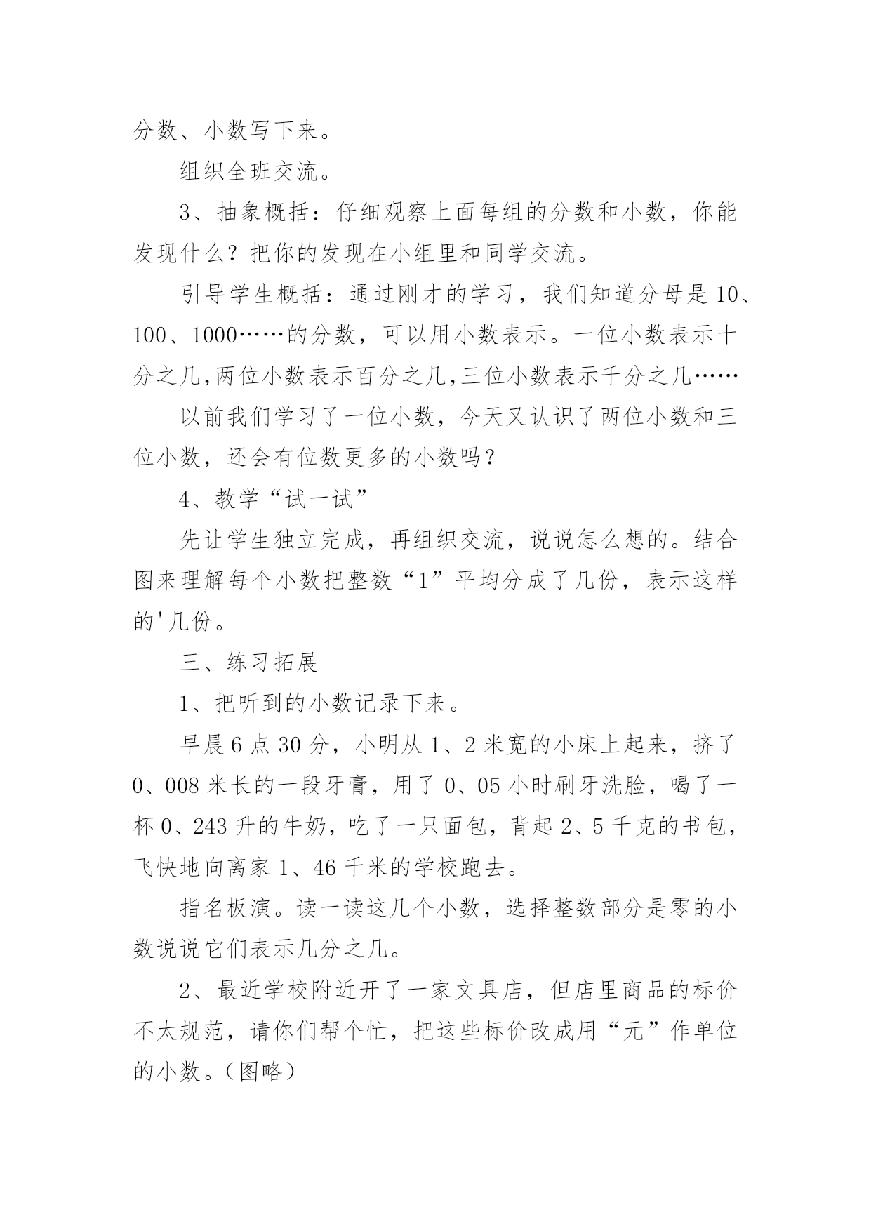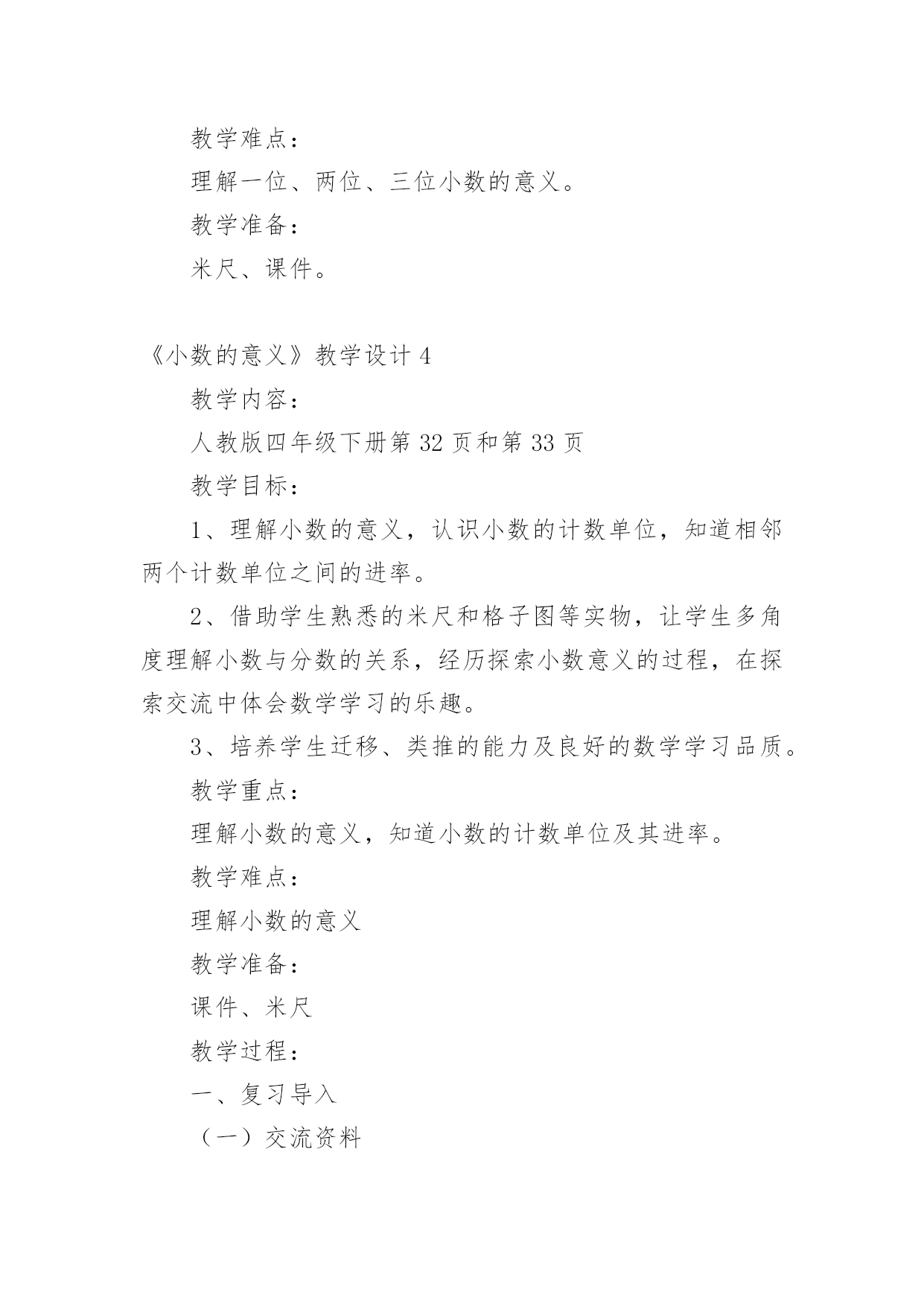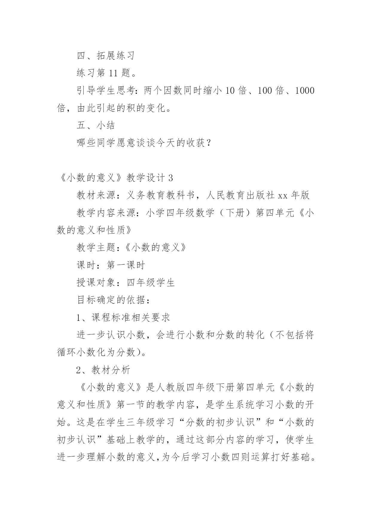 《小数的意义》教学设计(集合)《小数的意义》教学设计作为一位无私奉献的人民教师,常常要根据教学需要编写教学设计,教学设计是一个系统化规划教学系统的过程。一份好的教学设计是什么样子的呢?下面是小编为大家收集的《小数的意义》教学设计,仅供参考,大家一起来看看吧。《小数的意义》教学设计1教学内容:国标苏教版第28~30页例1、例2及相应的“试一试”、“练一练”,练习五第1~5题。教学目标:1、在现实情境中,能初步理解小数的意义,学会读写小数,体会小数与分数的联系。2、在用小数进行表达的过程中,感受小数与生活的联系,增强数学学习的兴趣。3、初步养成善于观察、善于比较、善于交流等良好的学习习惯。教学重点:理解小数的意义。教学过程:一、交流信息,引入课题1、在三年级时,我们认识了一些小数,你能说出几个吗?2、课前大家已经收集了很多关于小数的资料,老师选择了一些比较有价值的,你可以轻轻地把这些资料读一读,然后挑选你最感兴趣的一条,谈谈你了解到了什么?又想到些什么?(1)一块橡皮0、6元,一本练习本0、75元。(2)一张信封0、05元。(3)王琳的身高1、42米,体重32、5千克。(4)刘翔在国际田径超级大奖赛中,以12、88秒的成绩刷新世界记录。(5)一枚1分硬币的厚度大约是0、001米。(6)人体的正常体温是36、5°C—37、5°C。(7)“神舟六号”在太空飞行时距地球表面最远的高度大约是344、725千米。3、引入课题这些信息中的数都是小数,用小数可以描述一些事情,反映一些现象。看来,同学们对小数已经有了一些认识,想不想作进一步的的研究?你还想知道小数的哪些知识?根据学生提出的问题揭示课题。二、探究新知1、学习小数的读法小数怎么读?谁能把信息中的几个小数再读一读?能发现小数是怎么读的吗?让学生发现:小数点前面的数和我们学过的整数一样读,小数点后面的数只要依次一个一个地读。出示几个小数,让学生读一读:0、390、1080、0060、802、探究小数的意义和写法(1)如信息中的0、6、0、75、0、05元这些小数是怎么来的?小组内回忆6角写成0、6元的过程。那5分为什么可以写成0、05元?同桌商量商量。引导学生:元与分之间的进率是多少?1分是1元的1/100,是1/100元,可以写成0、01元,那5分是1元的几分之几?是几分之几元?写成小数是多少元?学生尝试说说7角5分转化为0、75元的过程。那6角8分可以写成几元?(2)0、01米是怎么产生的?谁能大胆地猜测一下?(教师出示米尺图)引导学生说出:1厘米是1米的1/100,是1/100米,写成小数是0、01米。以小组为单位,在直尺上另外找出两个刻度,想一想,写成分数和小数各是多少?把它们写下来。组织交流。(3)猜一猜,把1米平均分成1000份,还会得到什么样的分数?如何写成小数?把自己的猜想和小组里的同学交流交流,并试着把这些分数、小数写下来。组织全班交流。3、抽象概括:仔细观察上面每组的分数和小数,你能发现什么?把你的发现在小组里和同学交流。引导学生概括:通过刚才的学习,我们知道分母是10、100、1000……的分数,可以用小数表示。一位小数表示十分之几,两位小数表示百分之几,三位小数表示千分之几……以前我们学习了一位小数,今天又认识了两位小数和三位小数,还会有位数更多的小数吗?4、教学“试一试”先让学生独立完成,再组织交流,说说怎么想的。结合图来理解每个小数把整数“1”平均分成了几份,表示这样的'几份。三、练习拓展1、把听到的小数记录下来。早晨6点30分,小明从1、2米宽的小床上起来,挤了0、008米长的一段牙膏,用了0、05小时刷牙洗脸,喝了一杯0、243升的牛奶,吃了一只面包,背起2、5千克的书包,飞快地向离家1、46千米的学校跑去。指名板演。读一读这几个小数,选择整数部分是零的小数说说它们表示几分之几。2、最近学校附近开了一家文具店,但店里商品的标价不太规范,请你们帮个忙,把这些标价改成用“元”作单位的小数。(图略)铅笔3角小刀8分直尺5角9分练习本76/100元3、把你认为长度相同的找出来4毫米0、004米4/1000米0、04米4厘米4分米4/10米4、估价:一筒薯片的价格在5元~6元之间。5、把课前收集的小数信息,挑一个用今天学到的知识介绍给同桌听。四、课堂小结今天,我们进一步认识了小数,你有哪些收获?在我们的生活、生产中经常用到小数,课后围绕“生活中的小数”写一篇数学日记。反思:我总认为“小数的意义和读写”这一内容用传统的讲授法比较恰当,因为这些概念是约定束成的,而动手实践、自主探究等只能是一种形式上的追求。如何使传统教学与新理念融合在一起,达到比较完美的教学效果,本课进行了一点尝试。1、以小数在生活中的实际意义为切入点,从学生的生活经验和知识背景出发,引导学生进行积