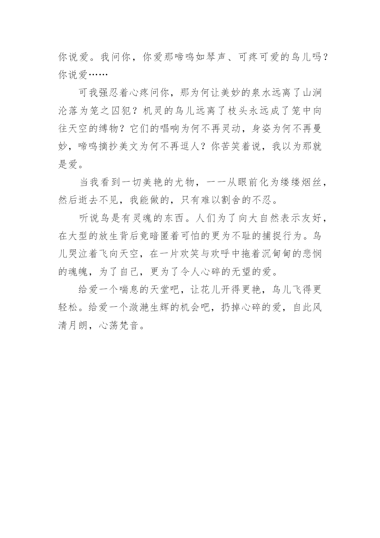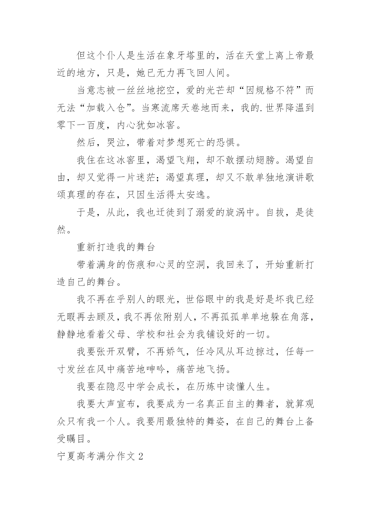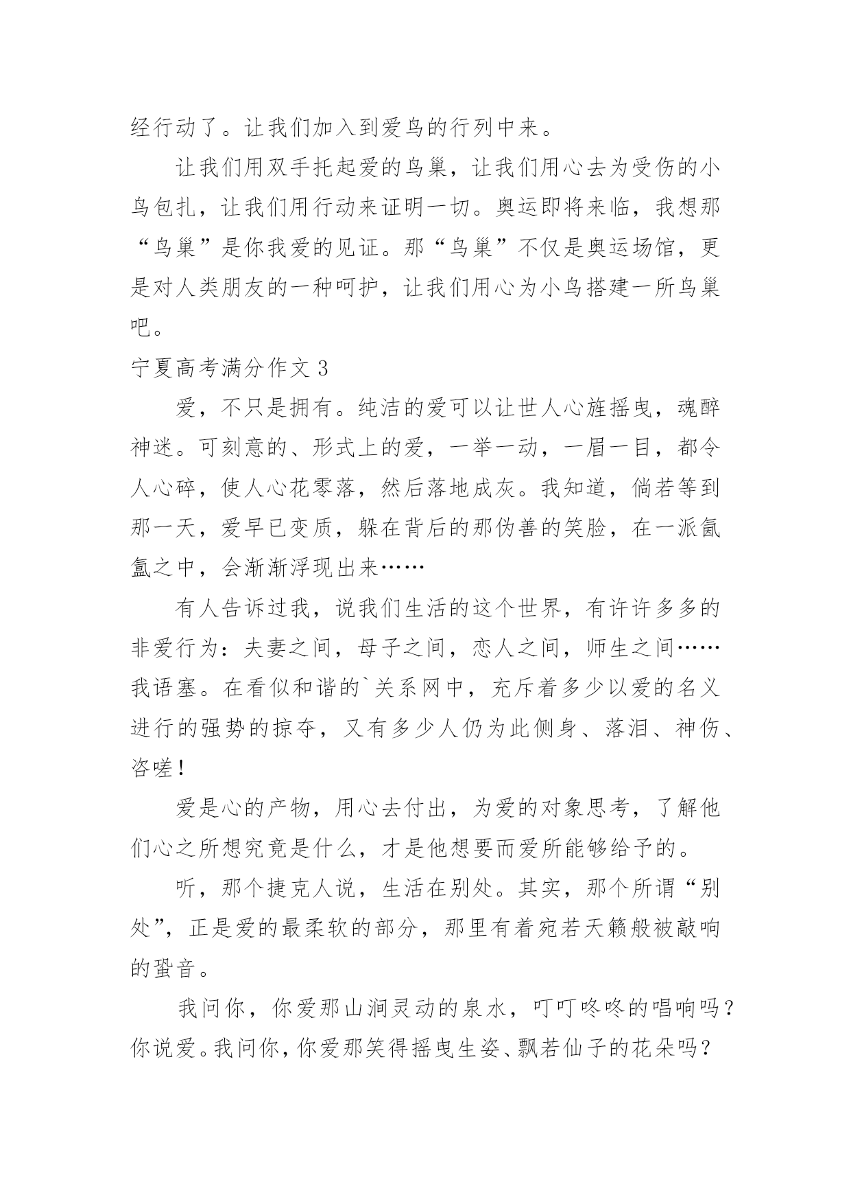 宁夏高考满分作文宁夏高考满分作文无论是身处学校还是步入社会,大家都有写作文的经历,对作文很是熟悉吧,根据写作命题的特点,作文可以分为命题作文和非命题作文。那么,怎么去写作文呢?以下是小编整理的宁夏高考满分作文,仅供参考,大家一起来看看吧。宁夏高考满分作文1从我呱呱坠地开始,我就在打造着这像荒地一般的舞台,我没有任何工具,除了双手和智慧,于是,我使用它们去开垦,这是我最美丽的舞台,尽管它那么小,尽管它不那么绚丽耀眼,但它是属于我的。有一天,当心中最美丽的舞台与我有咫尺之遥时,我发现,我无力踏上这个舞我受伤了。永不复原的伤。于是,这片净土,不再是我可以栖息的岛屿,而是囚禁着灰色梦想和灰色热情的灰色牢笼。我发现,我内心梦想的舞台坍塌了,在一瞬间我是谁,住在哪?我是什么,我是谁?是一个舞者,亦或是一个小丑?我不知道。我所知道的是,我失去了自己的自由。我们被外界束缚着,父母、社会、学校将我们“充盈”起来,他们胜利了。我成为了他们最忠实的仆人。但这个仆人是生活在象牙塔里的,活在天堂上离上帝最近的地方,只是,她已无力再飞回人间。当意志被一丝丝地挖空,爱的光芒却“因规格不符”而无法“加载入仓”。当寒流席天卷地而来,我的.世界降温到零下一百度,内心犹如冰窖。然后,哭泣,带着对梦想死亡的恐惧。我住在这冰窖里,渴望飞翔,却不敢摆动翅膀。渴望自由,却又觉得一片迷茫;渴望真理,却又不敢单独地演讲歌颂真理的存在,只因生活得太安逸。于是,从此,我也迁徙到了溺爱的旋涡中。自拔,是徒然。重新打造我的舞台带着满身的伤痕和心灵的空洞,我回来了,开始重新打造自己的舞台。我不再在乎别人的眼光,世俗眼中的我是好是坏我已经无暇再去顾及,我不再依附别人,不再孤孤单单地躲在角落,静静地看着父母、学校和社会为我铺设好的一切。我要张开双臂,不再娇气,任冷风从耳边掠过,任每一寸发丝在风中痛苦地呻吟,痛苦地飞扬。我要在隐忍中学会成长,在历炼中读懂人生。我要大声宣布,我要成为一名真正自主的舞者,就算观众只有我一个人。我要用最独特的舞姿,在自己的舞台上备受瞩目。宁夏高考满分作文2有人放鸟,有人捉鸟。如此之恶性循环,何时了……——题记天穹苍茫,映你孤弱身影如汪洋里的一叶孤舟,举你欲起的双翅如断崖间飘荡的一片秋叶。你背负长天飘然万里,整个天空都是你的。你一路东风来去自由,所以一路东风也是你的。想云路遥遥,关山冷落,一茎苇叶下的渡宿,异乡的梦里,可有亲朋的呼唤?远天的云影,误作北上的列车,可怜的孤雁,哪里才是你的栖身之地?麻雀的旧调,布谷的民歌,斑鸠的土谣。如今这仙乐,又有几人闻?面对儿童一双双质问的眼睛——哪儿能听到夜莺的歌唱?满怀虔诚地跪向苍茫的落日,殷殷渴盼人类的'朋友——鸟。人类在不断地扼杀自己的朋友,自然的大手,总有一天伸向我们,如同我们扼杀自己的朋友一样。曾几何时,枝头的歌唱已停止。曾几何时,人类的魔爪伸向了你。一个可怜孤弱的生命,就在那一刻停止。小鸟自由歌唱、自由飞翔的权利被剥夺了。不知何时,小鸟搬家了,从枝头搬到了笼子里。笼扼杀了天籁之音,扼杀了自由飞翔的梦。鸟是朋友,我们应该保护朋友。儿时,那一群屋檐下的啾啾,那枝头的高歌,还有那漂亮的外衣……人与鸟应该建立一种彼此依赖、彼此共存的关系。当我们看到受伤的小鸟时应该主动为它们包扎,还原它们的亮丽;当我们看到孩子用弹弓打鸟时,我们应该及时制止,告诉他鸟是我们的朋友,我们应该保护它;当看到城市街边一个个人工搭建的鸟巢时,我们感到欣慰,因为我们已经行动了。让我们加入到爱鸟的行列中来。让我们用双手托起爱的鸟巢,让我们用心去为受伤的小鸟包扎,让我们用行动来证明一切。奥运即将来临,我想那“鸟巢”是你我爱的见证。那“鸟巢”不仅是奥运场馆,更是对人类朋友的一种呵护,让我们用心为小鸟搭建一所鸟巢吧。宁夏高考满分作文3爱,不只是拥有。纯洁的爱可以让世人心旌摇曳,魂醉神迷。可刻意的、形式上的爱,一举一动,一眉一目,都令人心碎,使人心花零落,然后落地成灰。我知道,倘若等到那一天,爱早已变质,躲在背后的那伪善的笑脸,在一派氤氲之中,会渐渐浮现出来……有人告诉过我,说我们生活的这个世界,有许许多多的非爱行为:夫妻之间,母子之间,恋人之间,师生之间……我语塞。在看似和谐的`关系网中,充斥着多少以爱的名义进行的强势的掠夺,又有多少人仍为此侧身、落泪、神伤、咨嗟!爱是心的产物,用心去付出,为爱的对象思考,了解他们心之所想究竟是什么,才是他想要而爱所能够给予的。听,那个捷克人说,生活在别处。其实,那个所谓“别处”,正是爱的最柔软的部分,那里有着宛若天籁般被敲响的蛩音。我问你,你爱那山涧灵动的泉水,叮叮咚咚的唱响吗?你说爱。我问你,你爱那笑得摇曳生姿、飘若仙子的花朵吗?你说爱。我问你,你爱那啼鸣如琴声、可疼可爱的鸟儿吗?你说爱……可我强忍着心疼问你,那为何让美妙