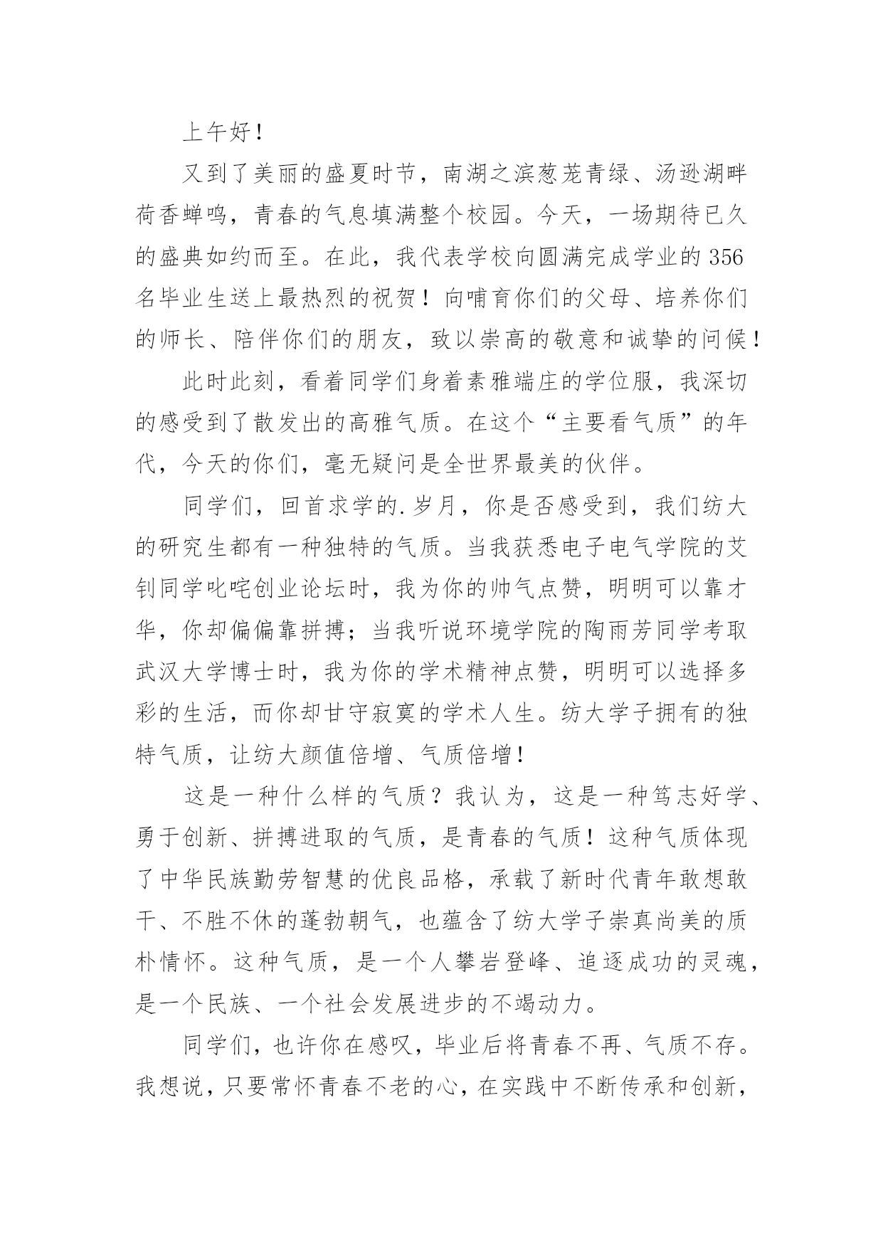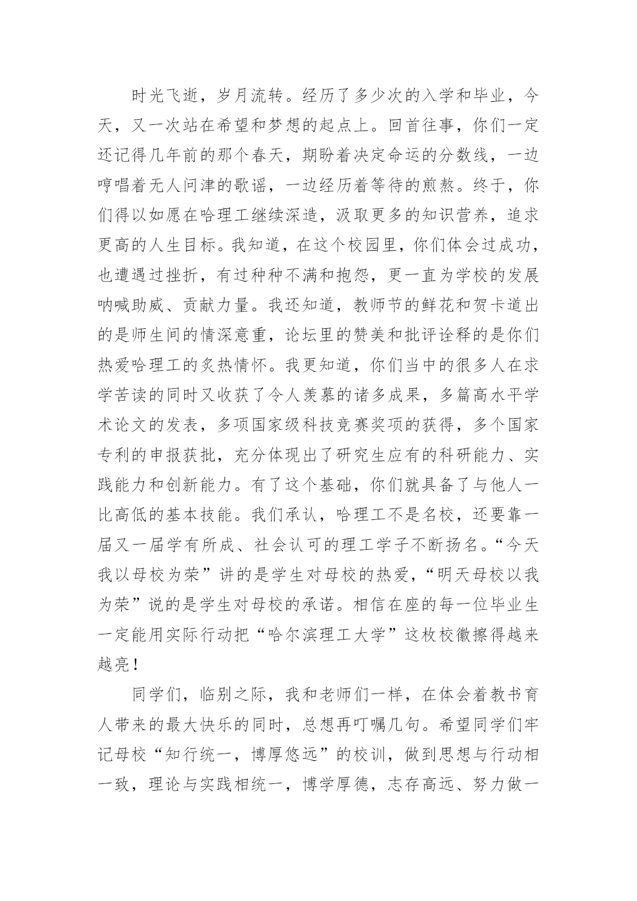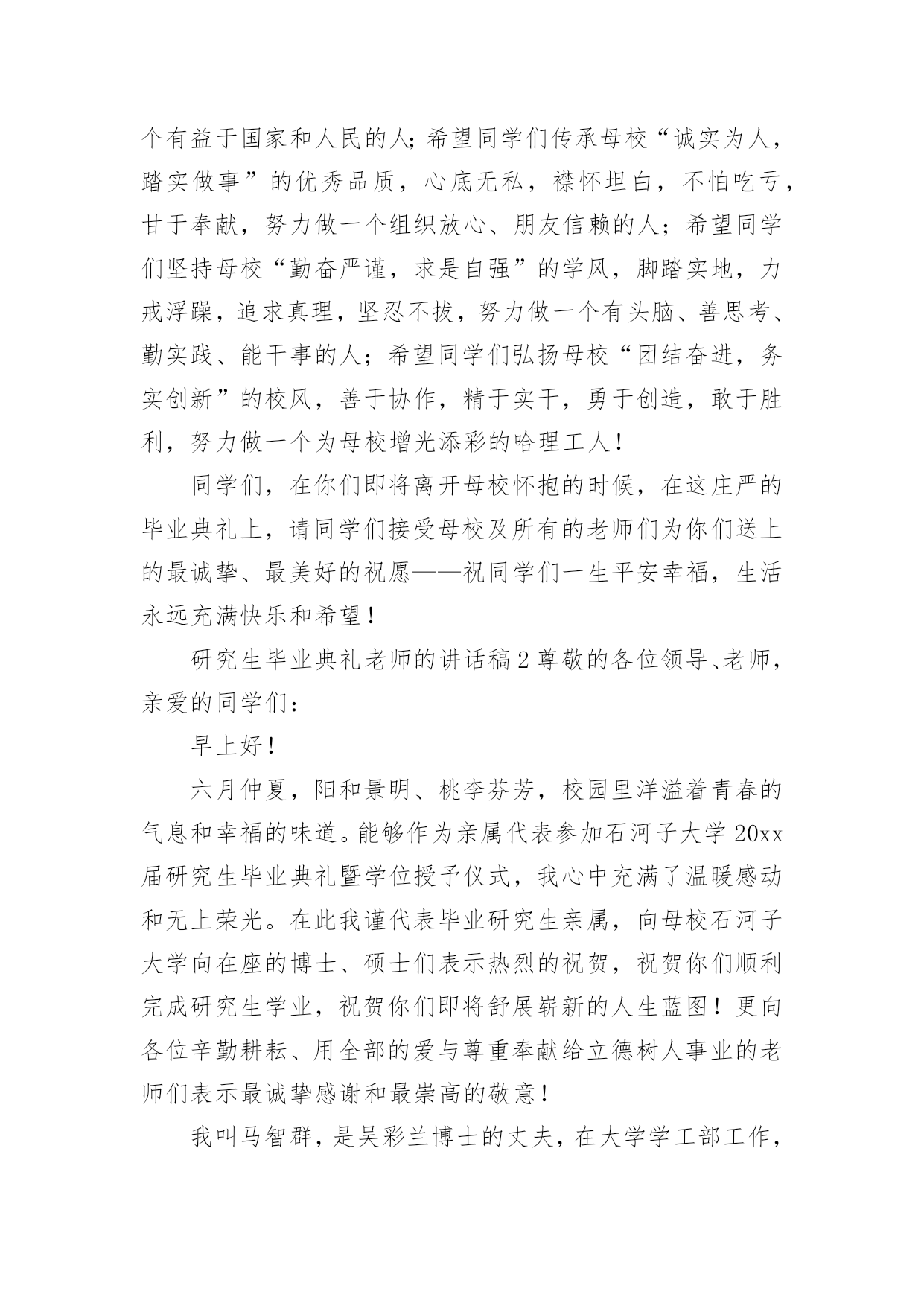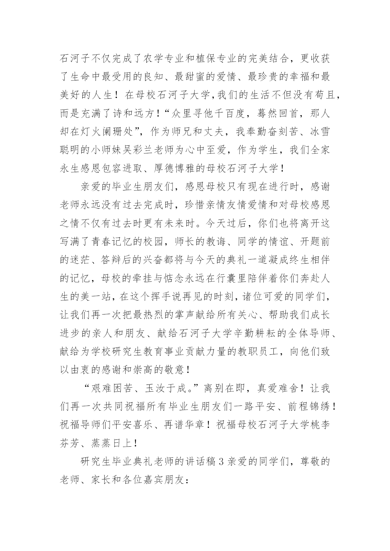 研究生毕业典礼老师的讲话稿研究生毕业典礼老师的讲话稿在社会一步步向前发展的今天,需要使用讲话稿的情况越来越多,讲话稿是在公务活动中针对特定场合,面对特定听众发表口头讲话的文稿。怎么写讲话稿才能避免踩雷呢?以下是小编为大家整理的研究生毕业典礼老师的讲话稿,希望对大家有所帮助。研究生毕业典礼老师的讲话稿1老师们,同学们:在这冬去春来万物复苏的美好季节,我们相聚在一起隆重举行一年一度的研究生毕业典礼,为xxxx届969名研究生授予博士学位和硕士学位。刚刚老师和同学们的发言,令我感触颇深,也曾经历过硕士毕业、博士毕业的我,深知流苏从右到左拨动的瞬间是多么的来之不易,我代表学校向你们表示由衷的祝贺!当然,今天过后,你们也将离开这写满了青春记忆的校园,师长的教诲、同学的情谊、开题前的迷茫、答辩后的兴奋都将与今天的典礼一道凝成终生相伴的记忆,陪伴着你们奔赴人生的下一站,在这个挥手说再见的时刻,同学们,请带上母校最为真挚的祝愿与祝福,你们的行囊里,永远不会缺少母校的牵挂与惦念!借此机会,请同学们与我一道,把最热烈的掌声献给所有关心、帮助你们成长进步的亲人和朋友、献给理工大学辛勤耕耘的全体导师、献给为学校研究生教育事业贡献力量的教职员工,向他们致以由衷的感谢和崇高的敬意!时光飞逝,岁月流转。经历了多少次的入学和毕业,今天,又一次站在希望和梦想的起点上。回首往事,你们一定还记得几年前的那个春天,期盼着决定命运的分数线,一边哼唱着无人问津的歌谣,一边经历着等待的煎熬。终于,你们得以如愿在哈理工继续深造,汲取更多的知识营养,追求更高的人生目标。我知道,在这个校园里,你们体会过成功,也遭遇过挫折,有过种种不满和抱怨,更一直为学校的发展呐喊助威、贡献力量。我还知道,教师节的鲜花和贺卡道出的是师生间的情深意重,论坛里的赞美和批评诠释的是你们热爱哈理工的炙热情怀。我更知道,你们当中的很多人在求学苦读的同时又收获了令人羡慕的诸多成果,多篇高水平学术论文的发表,多项国家级科技竞赛奖项的获得,多个国家专利的申报获批,充分体现出了研究生应有的科研能力、实践能力和创新能力。有了这个基础,你们就具备了与他人一比高低的基本技能。我们承认,哈理工不是名校,还要靠一届又一届学有所成、社会认可的理工学子不断扬名。“今天我以母校为荣”讲的是学生对母校的热爱,“明天母校以我为荣”说的是学生对母校的承诺。相信在座的每一位毕业生一定能用实际行动把“哈尔滨理工大学”这枚校徽擦得越来越亮!同学们,临别之际,我和老师们一样,在体会着教书育人带来的最大快乐的同时,总想再叮嘱几句。希望同学们牢记母校“知行统一,博厚悠远”的校训,做到思想与行动相一致,理论与实践相统一,博学厚德,志存高远、努力做一个有益于国家和人民的人;希望同学们传承母校“诚实为人,踏实做事”的优秀品质,心底无私,襟怀坦白,不怕吃亏,甘于奉献,努力做一个组织放心、朋友信赖的人;希望同学们坚持母校“勤奋严谨,求是自强”的学风,脚踏实地,力戒浮躁,追求真理,坚忍不拔,努力做一个有头脑、善思考、勤实践、能干事的人;希望同学们弘扬母校“团结奋进,务实创新”的校风,善于协作,精于实干,勇于创造,敢于胜利,努力做一个为母校增光添彩的哈理工人!同学们,在你们即将离开母校怀抱的时候,在这庄严的毕业典礼上,请同学们接受母校及所有的老师们为你们送上的最诚挚、最美好的祝愿——祝同学们一生平安幸福,生活永远充满快乐和希望!研究生毕业典礼老师的讲话稿2尊敬的各位领导、老师,亲爱的同学们:早上好!六月仲夏,阳和景明、桃李芬芳,校园里洋溢着青春的气息和幸福的味道。能够作为亲属代表参加石河子大学20xx届研究生毕业典礼暨学位授予仪式,我心中充满了温暖感动和无上荣光。在此我谨代表毕业研究生亲属,向母校石河子大学向在座的博士、硕士们表示热烈的祝贺,祝贺你们顺利完成研究生学业,祝贺你们即将舒展崭新的人生蓝图!更向各位辛勤耕耘、用全部的爱与尊重奉献给立德树人事业的老师们表示最诚挚感谢和最崇高的敬意!我叫马智群,是吴彩兰博士的丈夫,在大学学工部工作,是一名从事学生服务工作的“娃娃头”,也曾经历过硕士毕业并努力为博士学位奋斗的我,深知那学位帽上炫目的流苏从右到左拨动的瞬间是多么的来之不易。今晨,阳光明媚,怀揣着满满的幸福与感动,我们一家来到这神圣的礼堂。“昨夜西风凋碧树,独上高楼,望断天涯路。”回首望去,我的这位可爱天真的小师妹,“衣带渐宽终不悔,为伊消得人憔悴”,攻读博士的千余个日日夜夜里,是植物病理学实验室凌晨四点的寂静灯光,是超净工作台旁的洁净白大褂和很萌很可爱的瓶瓶罐罐们,是高速离心机的每分钟三万圈的斗转星移、变化神奇,是农学试验站的和风细雨、万物生发,是指导本硕学生的学术交流、观点碰撞,更是向导师向本春教授、赵思峰教授和广大农学院同事们、研究生处老师的躬身求教