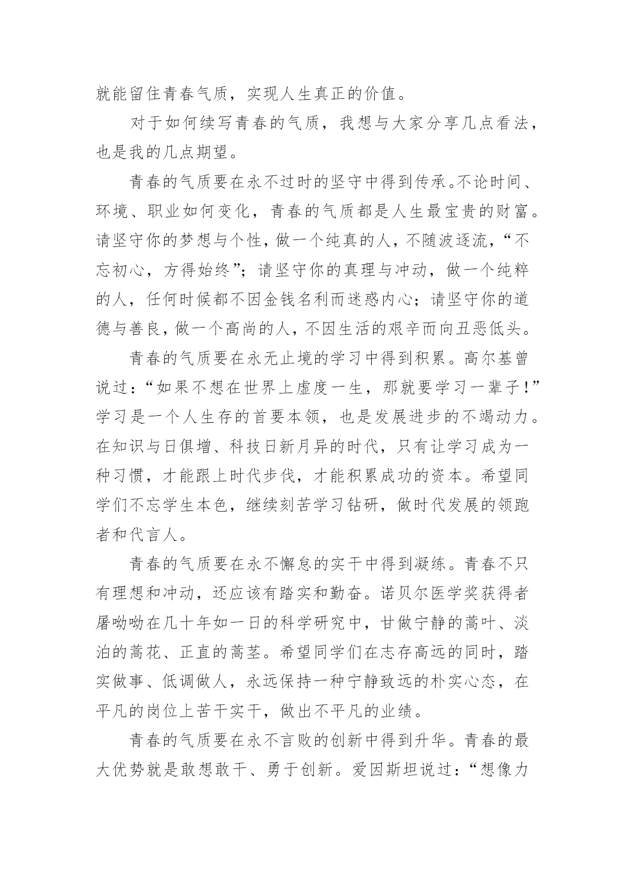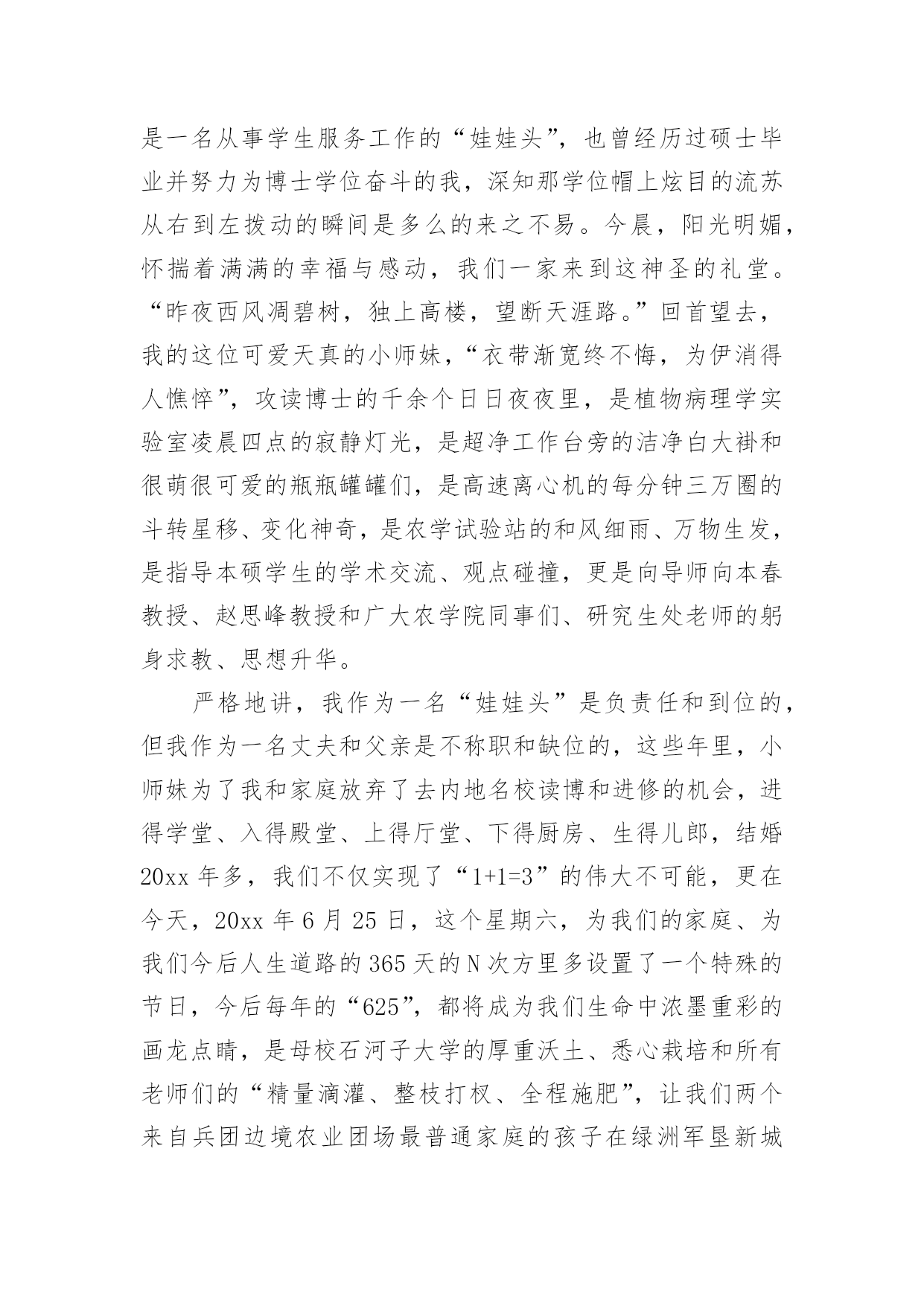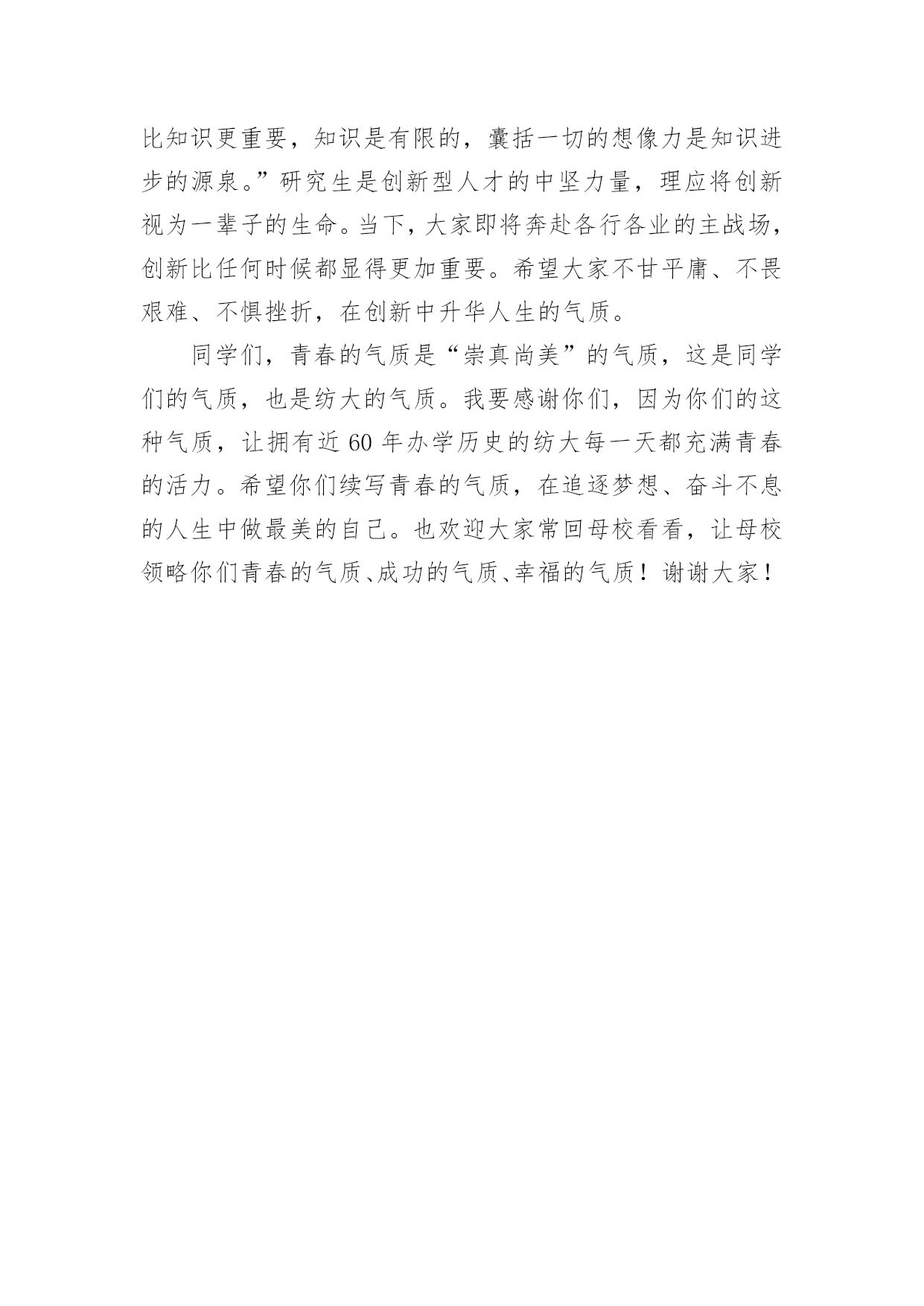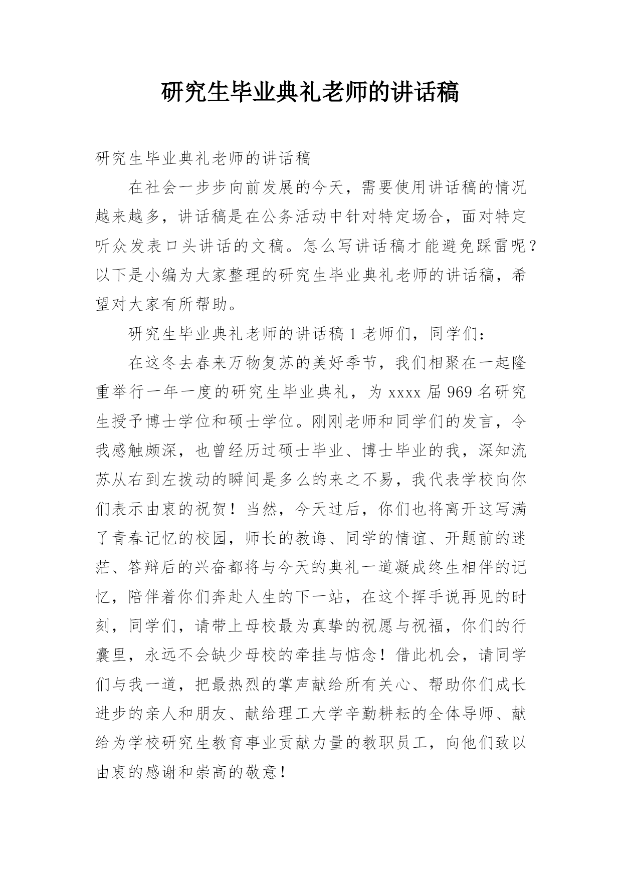 研究生毕业典礼老师的讲话稿研究生毕业典礼老师的讲话稿在社会一步步向前发展的今天,需要使用讲话稿的情况越来越多,讲话稿是在公务活动中针对特定场合,面对特定听众发表口头讲话的文稿。怎么写讲话稿才能避免踩雷呢?以下是小编为大家整理的研究生毕业典礼老师的讲话稿,希望对大家有所帮助。研究生毕业典礼老师的讲话稿1老师们,同学们:在这冬去春来万物复苏的美好季节,我们相聚在一起隆重举行一年一度的研究生毕业典礼,为xxxx届969名研究生授予博士学位和硕士学位。刚刚老师和同学们的发言,令我感触颇深,也曾经历过硕士毕业、博士毕业的我,深知流苏从右到左拨动的瞬间是多么的来之不易,我代表学校向你们表示由衷的祝贺!当然,今天过后,你们也将离开这写满了青春记忆的校园,师长的教诲、同学的情谊、开题前的迷茫、答辩后的兴奋都将与今天的典礼一道凝成终生相伴的记忆,陪伴着你们奔赴人生的下一站,在这个挥手说再见的时刻,同学们,请带上母校最为真挚的祝愿与祝福,你们的行囊里,永远不会缺少母校的牵挂与惦念!借此机会,请同学们与我一道,把最热烈的掌声献给所有关心、帮助你们成长进步的亲人和朋友、献给理工大学辛勤耕耘的全体导师、献给为学校研究生教育事业贡献力量的教职员工,向他们致以由衷的感谢和崇高的敬意!时光飞逝,岁月流转。经历了多少次的入学和毕业,今天,又一次站在希望和梦想的起点上。回首往事,你们一定还记得几年前的那个春天,期盼着决定命运的分数线,一边哼唱着无人问津的歌谣,一边经历着等待的煎熬。终于,你们得以如愿在哈理工继续深造,汲取更多的知识营养,追求更高的人生目标。我知道,在这个校园里,你们体会过成功,也遭遇过挫折,有过种种不满和抱怨,更一直为学校的发展呐喊助威、贡献力量。我还知道,教师节的鲜花和贺卡道出的是师生间的情深意重,论坛里的赞美和批评诠释的是你们热爱哈理工的炙热情怀。我更知道,你们当中的很多人在求学苦读的同时又收获了令人羡慕的诸多成果,多篇高水平学术论文的发表,多项国家级科技竞赛奖项的获得,多个国家专利的申报获批,充分体现出了研究生应有的科研能力、实践能力和创新能力。有了这个基础,你们就具备了与他人一比高低的基本技能。我们承认,哈理工不是名校,还要靠一届又一届学有所成、社会认可的理工学子不断扬名。“今天我以母校为荣”讲的是学生对母校的热爱,“明天母校以我为荣”说的是学生对母校的承诺。相信在座的每一位毕业生一定能用实际行动把“哈尔滨理工大学”这枚校徽擦得越来越亮!同学们,临别之际,我和老师们一样,在体会着教书育人带来的最大快乐的同时,总想再叮嘱几句。希望同学们牢记母校“知行统一,博厚悠远”的校训,做到思想与行动相一致,理论与实践相统一,博学厚德,志存高远、努力做一个有益于国家和人民的人;希望同学们传承母校“诚实为人,踏实做事”的优秀品质,心底无私,襟怀坦白,不怕吃亏,甘于奉献,努力做一个组织放心、朋友信赖的人;希望同学们坚持母校“勤奋严谨,求是自强”的学风,脚踏实地,力戒浮躁,追求真理,坚忍不拔,努力做一个有头脑、善思考、勤实践、能干事的人;希望同学们弘扬母校“团结奋进,务实创新”的校风,善于协作,精于实干,勇于创造,敢于胜利,努力做一个为母校增光添彩的哈理工人!同学们,在你们即将离开母校怀抱的时候,在这庄严的毕业典礼上,请同学们接受母校及所有的老师们为你们送上的最诚挚、最美好的祝愿——祝同学们一生平安幸福,生活永远充满快乐和希望!研究生毕业典礼老师的讲话稿2尊敬的各位领导、老师,亲爱的同学们:早上好!六月仲夏,阳和景明、桃李芬芳,校园里洋溢着青春的气息和幸福的味道。能够作为亲属代表参加石河子大学20xx届研究生毕业典礼暨学位授予仪式,我心中充满了温暖感动和无上荣光。在此我谨代表毕业研究生亲属,向母校石河子大学向在座的博士、硕士们表示热烈的祝贺,祝贺你们顺利完成研究生学业,祝贺你们即将舒展崭新的人生蓝图!更向各位辛勤耕耘、用全部的爱与尊重奉献给立德树人事业的老师们表示最诚挚感谢和最崇高的敬意!我叫马智群,是吴彩兰博士的丈夫,在大学学工部工作,是一名从事学生服务工作的“娃娃头”,也曾经历过硕士毕业并努力为博士学位奋斗的我,深知那学位帽上炫目的流苏从右到左拨动的瞬间是多么的来之不易。今晨,阳光明媚,怀揣着满满的幸福与感动,我们一家来到这神圣的礼堂。“昨夜西风凋碧树,独上高楼,望断天涯路。”回首望去,我的这位可爱天真的小师妹,“衣带渐宽终不悔,为伊消得人憔悴”,攻读博士的千余个日日夜夜里,是植物病理学实验室凌晨四点的寂静灯光,是超净工作台旁的洁净白大褂和很萌很可爱的瓶瓶罐罐们,是高速离心机的每分钟三万圈的斗转星移、变化神奇,是农学试验站的和风细雨、万物生发,是指导本硕学生的学术交流、观点碰撞,更是向导师向本春教授、赵思峰教授和广大农学院同事们、研究生处老师的躬身求教
