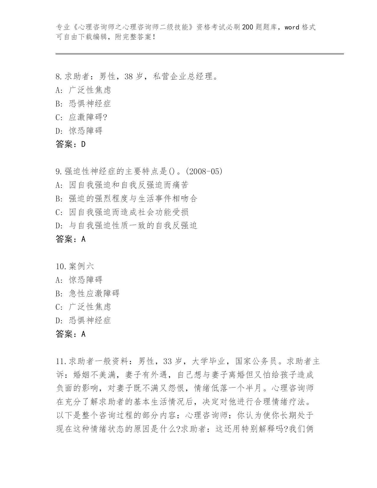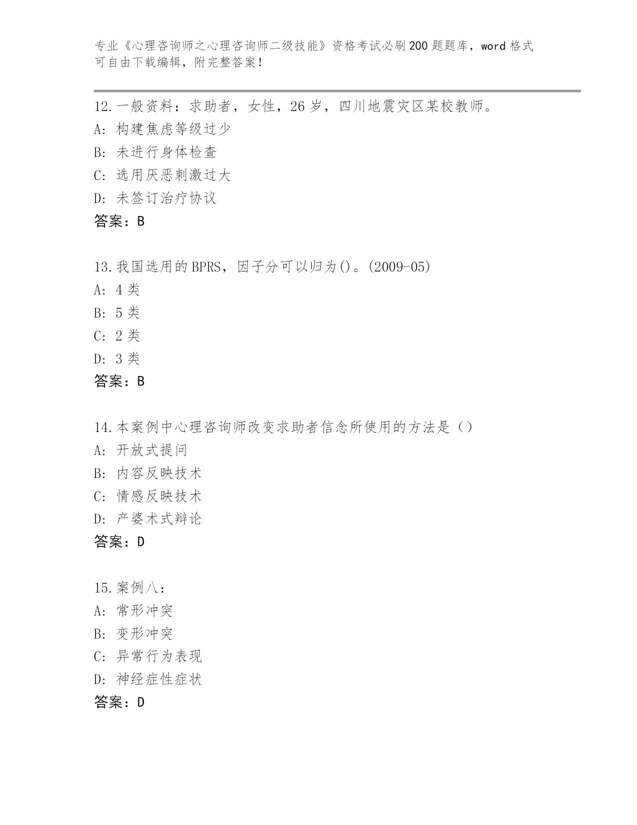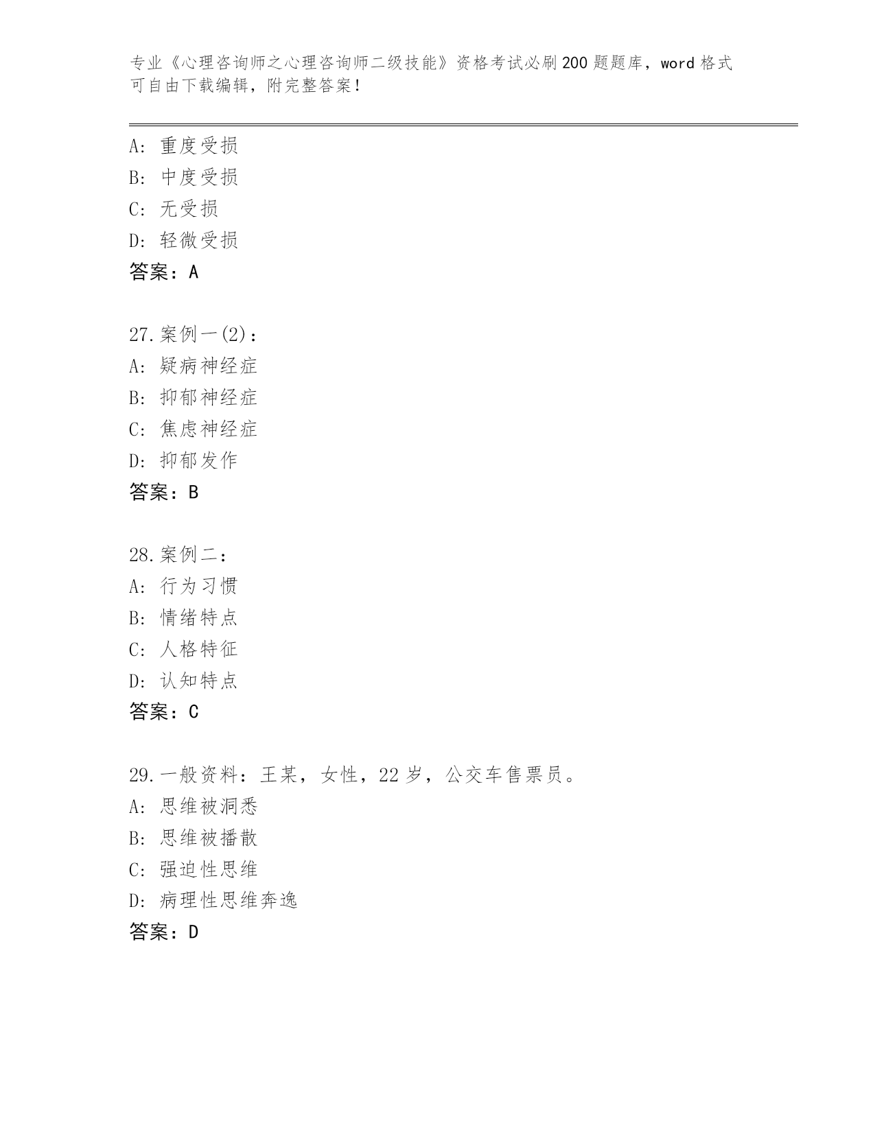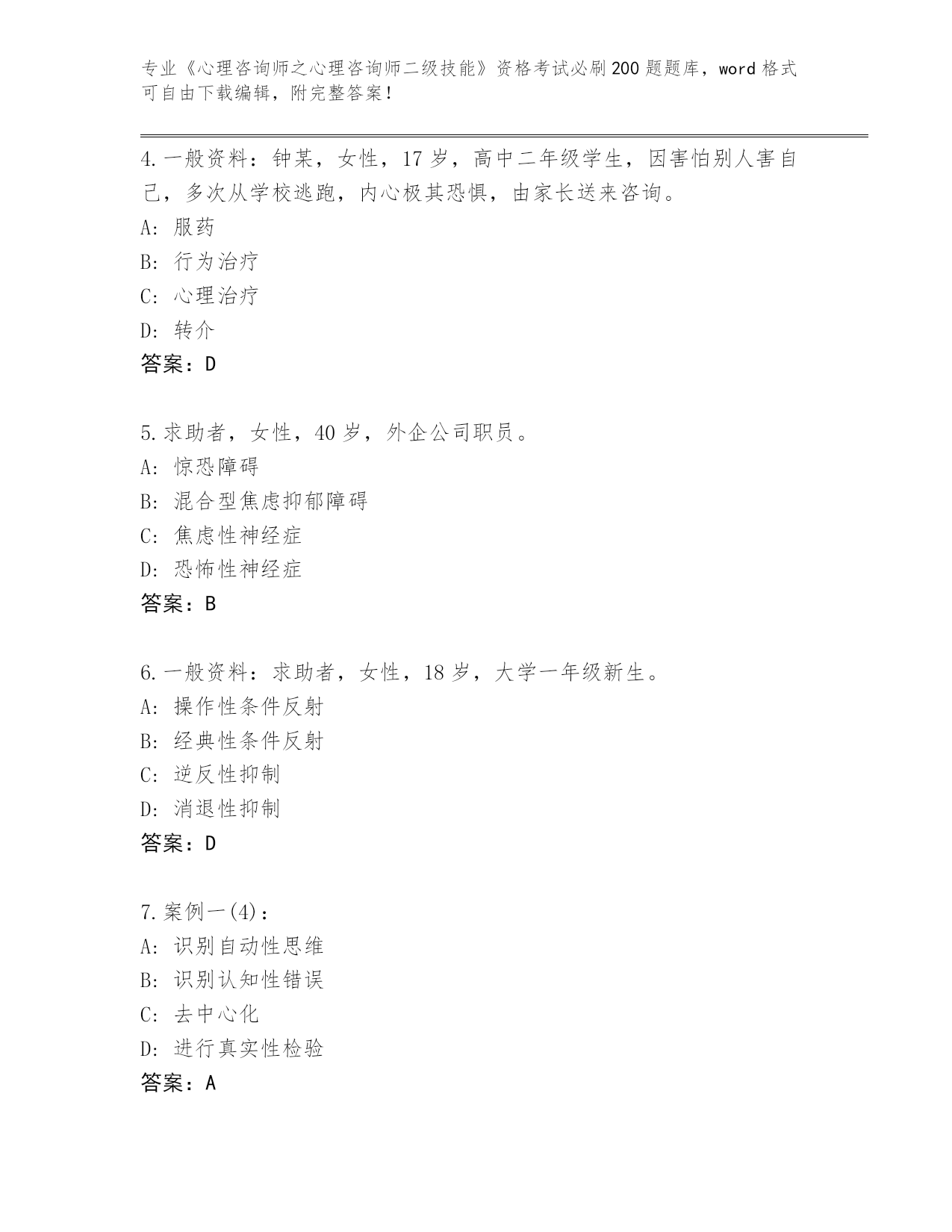 贵州省修文县2024《心理咨询师之心理咨询师二级技能》资格考试必刷200题真题附答案(培优A卷)