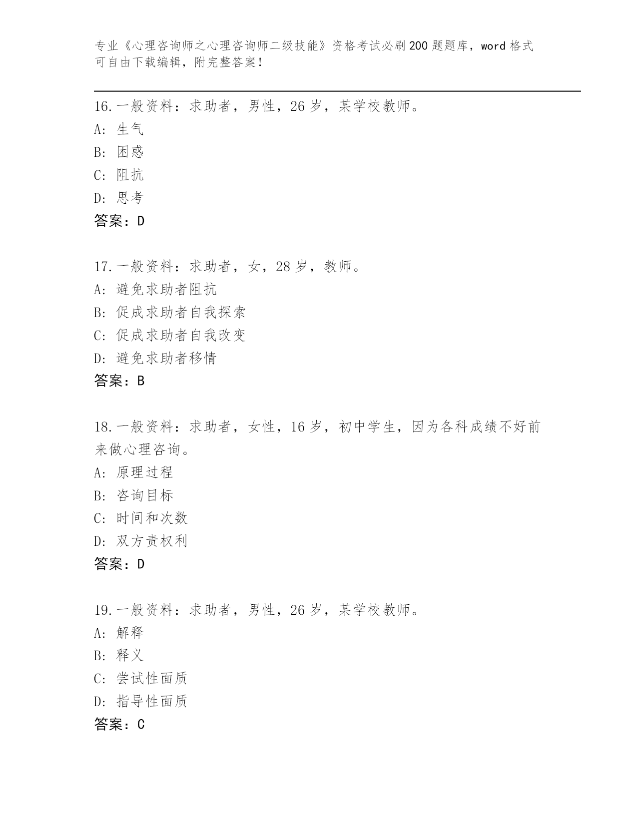 贵州省普定县整理《心理咨询师之心理咨询师二级技能》考试必刷200题王牌题库往年题考