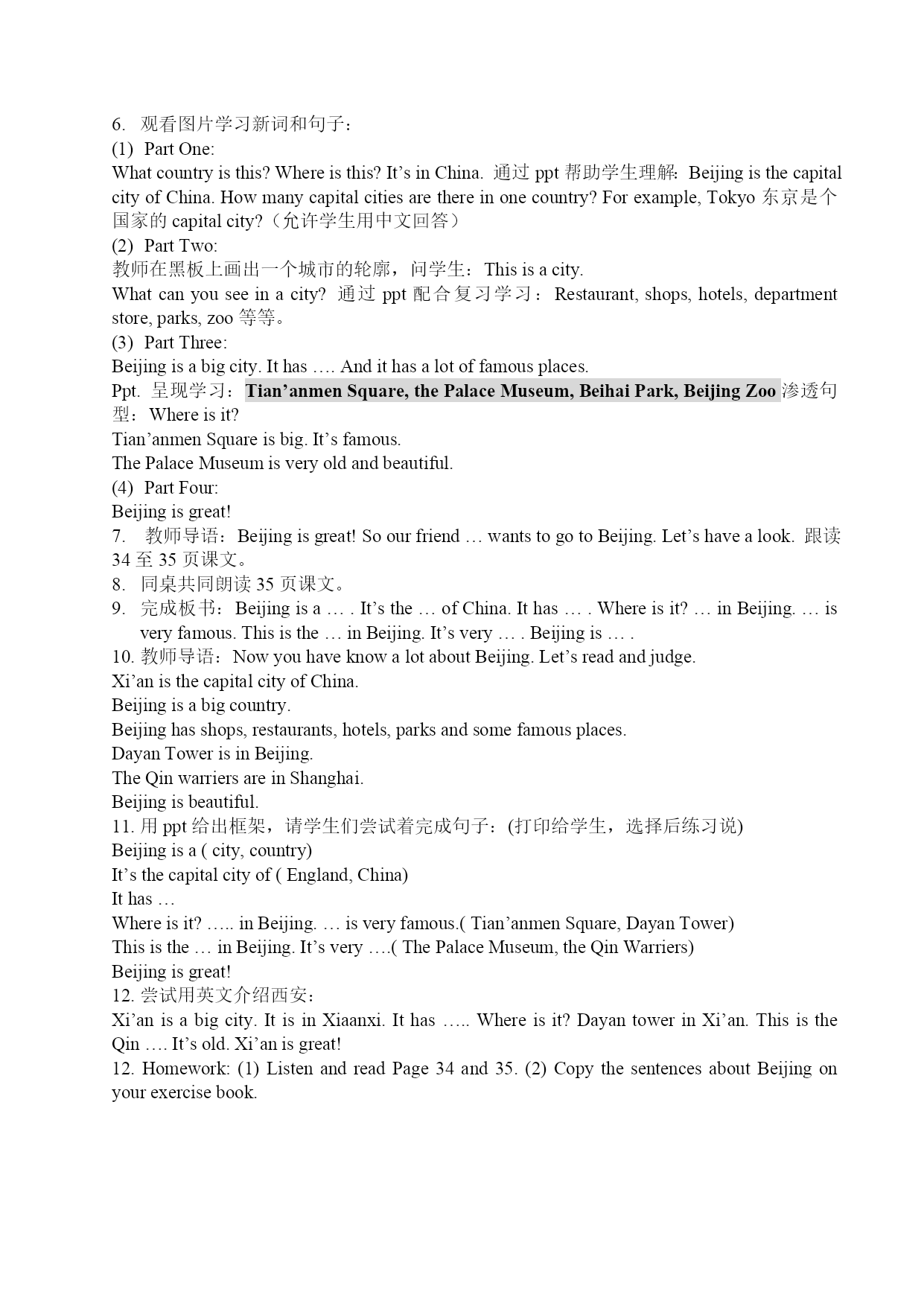 小学英语五年级第一学期(河北教育出版社)Unit3Lesson17Beijingisgreat!教学内容:Let’sgoonatrip.IwanttogotoBeijing.Ilovetogoontrips!IwantDannyandJennytocome,too.Tripsarefun!Youcome,too!Beijingisabigcity.ItisthecapitalcityofChina,ourcountry.Ithasshops,restaurantsandhotels.Thisisahotel.Whereisthis?Tian’anmenSquareinBeijing.Tian’anmenSquareisveryfamous.ThisisthePalaceMuseuminBeijing.Itisveryoldandbeautiful.Beijingisgreat.教学目标:能够听懂、会说、认读单词:Beijing,China,capital,city,shops,restaurants,hotels,Tian’anmenSquare,thePalaceMuseum,能够听懂、会说单词:trip,fun,country,bigandbeautiful,famous能够拓展的单词:DayanTower,QinWarriers能够运用所学句型进行简单的语言交流:1.Beijingisabigcity.ItisthecapitalcityofChina.Ithasshops,restaurantsandhotels.Thisisthe…inBeijing.It’sveryfamous/great/big/beautiful/famous.2.Whereisthis?…教学重点:主要的词汇、句型。教学过程:Showsomekeywordsonboardandletthestudentsguesswhattheymean.Class,look.Guess.Whoisshe?Now,canyouguessmoreaboutme.Herearesomehints.教师在黑板上画出自画像,然后列举一些关键词让学生猜测涵义。ZhangLujing,Beijing,English,ShannxiGuess:What’smyname?WheredoIlive?WhatdoIteach?WhereisMsZhang?如何学生还有困难,教师说出句首,请学生从关键词里跳出对应的部分。Iamhappytobehere.Shaanxiisabeautifulplace.It’sfamousforYan’an,Xi’anandHuaqingchi,Tayantaandsoon.Fupingisafamousplace.It’sfamousbecauseit’sthehometownofXiZhongxun’shometown.AndIknowFupingisfamousforchinas.(需要补充网络资料)将关键词中的Beijing圈出来,告诉学生:IcomefromBeijing.Beijingisalsoafamousplace.TodaywearegoingtotalkaboutBeijing.WhatdoyouknowaboutBeijing?学生可以用中英文回答,教师把学生提到的关键词记录在黑板的Beijing周围。教师导语:DoyouwanttogotoBeijing?Let’sgoonatrip.播放一段介绍北京的ppt.WelcometoBeijing.Beijingisabigcity.ItisthecapitalcityofChina,ourcountry.Ithasshops,restaurantsandhotels.Thisisahotel.Whereisthis?Tian’anmenSquareinBeijing.Tian’anmenSquareisveryfamous.ThisisthePalaceMuseuminBeijing.Itisveryoldandbeautiful.Beijingisgreat!提出问题,观看第二遍介绍:WhatcanyouseeinBeijing?观看图片学习新词和句子:PartOne:Whatcountryisthis?Whereisthis?It’sinChina.通过ppt帮助学生理解:BeijingisthecapitalcityofChina.Howmanycapitalcitiesarethereinonecountry?Forexample,Tokyo东京是个国家的capitalcity?(允许学生用中