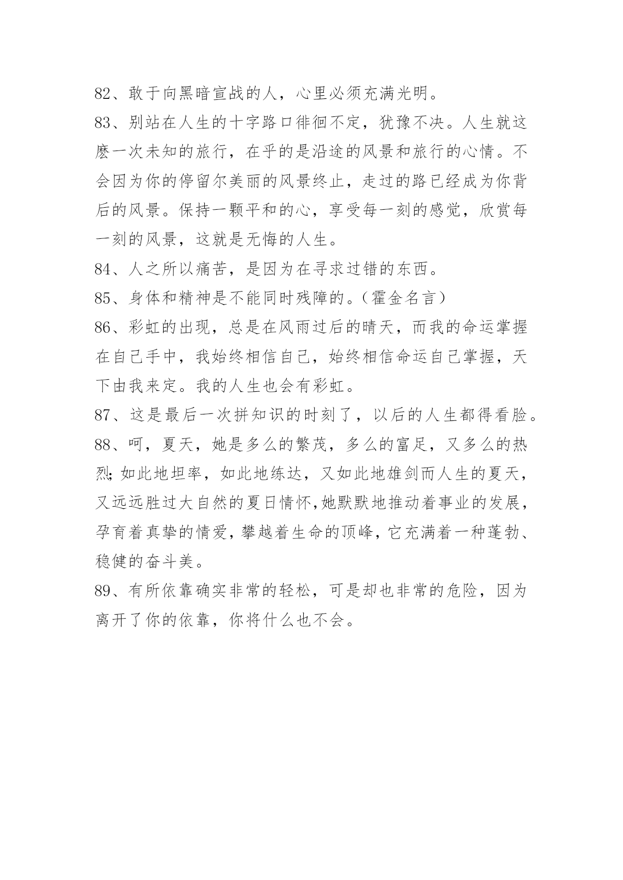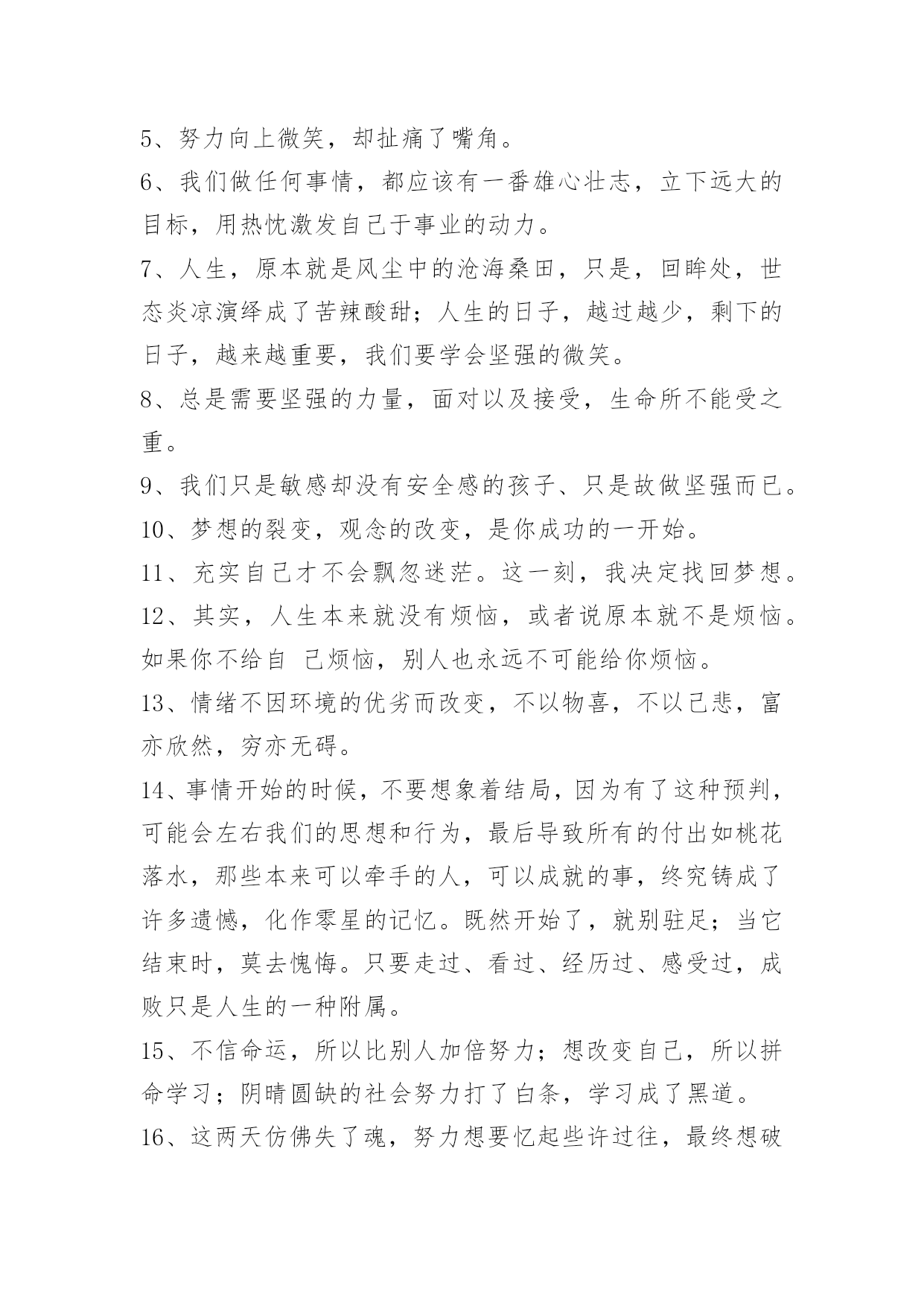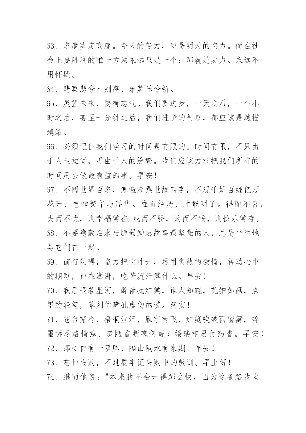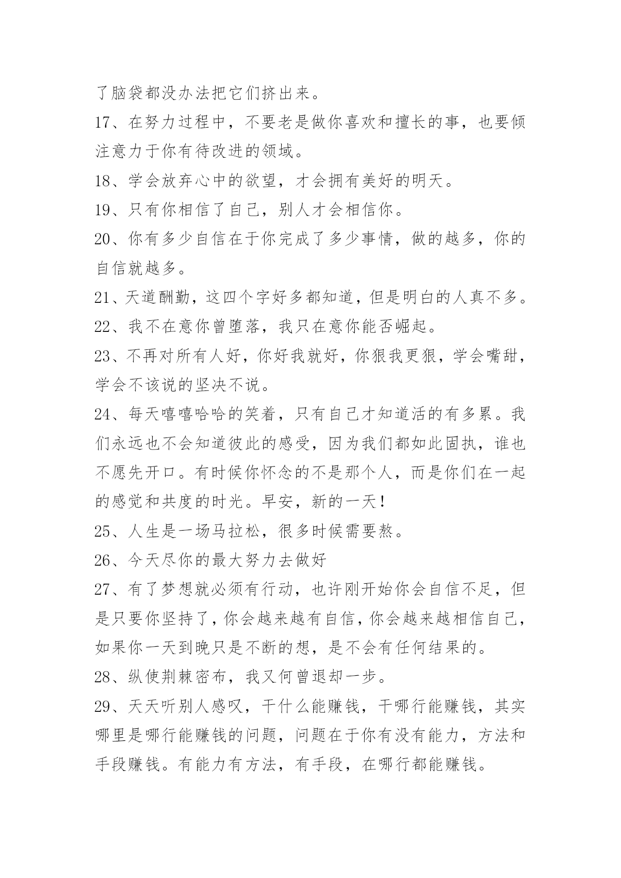 励志语句89条2022年常用励志语句汇编89条念书的时候,室友很得老师的喜欢,百思不得其解,拼命努力,拼命表现,只为了能多注意我一点。以下是小编精心准备的励志语句89条,欢迎参考。1、你适当地给他们设立目标,并从旁提醒与帮助,孩子们成功后会大喊大叫。那种喜悦会在无形中增强孩子的自信。在孩子以后的生活中,自信是一个人最重要的品质,所以从小就要给孩子树立自信,让他明白他能做什么,他一定能做什么。这样,你的孩子会一直在自信中成长,并成为生活中的强者。2、在路上,他解放了自己过去二十年来努力回避的记忆,任由这些回忆在他脑子里絮絮说着话,鲜活而跳跃,充满了能量。他不再需要用英里丈量自己走过的路程。他用的是回忆。3、有些人天资颇高而成就平凡,他们好比有大本钱而没有做出大生意,也有些人天资并不特异而成就则斐然可观,他们好比拿小本钱而做大生意。这中间的差别就在努力与不努力了。4、布金敦正是人们所期望的勇士吧!的努力不会白费的,他不屈不挠的搏斗会有回报的。勇敢起来吧,像布金敦那样振奋精神,勇往直前!5、努力向上微笑,却扯痛了嘴角。6、我们做任何事情,都应该有一番雄心壮志,立下远大的目标,用热忱激发自己于事业的动力。7、人生,原本就是风尘中的沧海桑田,只是,回眸处,世态炎凉演绎成了苦辣酸甜;人生的日子,越过越少,剩下的日子,越来越重要,我们要学会坚强的微笑。8、总是需要坚强的力量,面对以及接受,生命所不能受之重。9、我们只是敏感却没有安全感的孩子、只是故做坚强而已。10、梦想的裂变,观念的改变,是你成功的一开始。11、充实自己才不会飘忽迷茫。这一刻,我决定找回梦想。12、其实,人生本来就没有烦恼,或者说原本就不是烦恼。如果你不给自己烦恼,别人也永远不可能给你烦恼。13、情绪不因环境的优劣而改变,不以物喜,不以己悲,富亦欣然,穷亦无碍。14、事情开始的时候,不要想象着结局,因为有了这种预判,可能会左右我们的思想和行为,最后导致所有的付出如桃花落水,那些本来可以牵手的人,可以成就的事,终究铸成了许多遗憾,化作零星的记忆。既然开始了,就别驻足;当它结束时,莫去愧悔。只要走过、看过、经历过、感受过,成败只是人生的一种附属。15、不信命运,所以比别人加倍努力;想改变自己,所以拼命学习;阴晴圆缺的社会努力打了白条,学习成了黑道。16、这两天仿佛失了魂,努力想要忆起些许过往,最终想破了脑袋都没办法把它们挤出来。17、在努力过程中,不要老是做你喜欢和擅长的事,也要倾注意力于你有待改进的领域。18、学会放弃心中的欲望,才会拥有美好的明天。19、只有你相信了自己,别人才会相信你。20、你有多少自信在于你完成了多少事情,做的越多,你的自信就越多。21、天道酬勤,这四个字好多都知道,但是明白的人真不多。22、我不在意你曾堕落,我只在意你能否崛起。23、不再对所有人好,你好我就好,你狠我更狠,学会嘴甜,学会不该说的坚决不说。24、每天嘻嘻哈哈的笑着,只有自己才知道活的有多累。我们永远也不会知道彼此的感受,因为我们都如此固执,谁也不愿先开口。有时候你怀念的不是那个人,而是你们在一起的感觉和共度的时光。早安,新的一天!25、人生是一场马拉松,很多时候需要熬。26、今天尽你的最大努力去做好27、有了梦想就必须有行动,也许刚开始你会自信不足,但是只要你坚持了,你会越来越有自信,你会越来越相信自己,如果你一天到晚只是不断的想,是不会有任何结果的。28、纵使荆棘密布,我又何曾退却一步。29、天天听别人感叹,干什么能赚钱,干哪行能赚钱,其实哪里是哪行能赚钱的问题,问题在于你有没有能力,方法和手段赚钱。有能力有方法,有手段,在哪行都能赚钱。30、不要以那灵魂知己的名义,去等不该等的人,最后就是蹉跎那不该蹉跎的青春。31、痛苦和寂寞对年轻人是一剂良,它们不仅使灵魂更美好,更崇高,还保持了它青春的色泽。32、真正看透的人,知道社会的真相,为社会而悲伤,但却又爱着这个世界。33、就算星星碎掉了,溢出来的光也很好看。34、所谓幸运,就是当你准备好了的时候,机会来了。35、生活不如意,也要坚持下去,是风是雨,总能撑出一道彩虹,即使偏体鳞伤,也要笑着生活。36、人生的奔跑,不在于瞬间的爆发,取决于途中的坚持。想要到达的终点,没有遥不可及,只有持之以恒!37、不要质疑你的付出,这些都会一种累积一种沉淀,它们会默默铺路,只为让你成为更优秀的自己。38、五月,漫山遍野都是翠色盈盈,风光如画。那如绿毯一般铺开来的嫩草,总让人忍不住的想要趴下去躺一躺,去抚摸一下那柔软的绿。或者,就在上面打几个滚,闻一闻泥土清新的香味!那偶尔夹杂期间的不知名的小花,也都趁着这风和日丽都绽开了妩媚的笑颜,迎接夏天的到来!39、早期开始尝试为自己做人生和职业规划,并在不同阶段调整自己。40、忘掉今天的人将被明天忘掉。41、在你