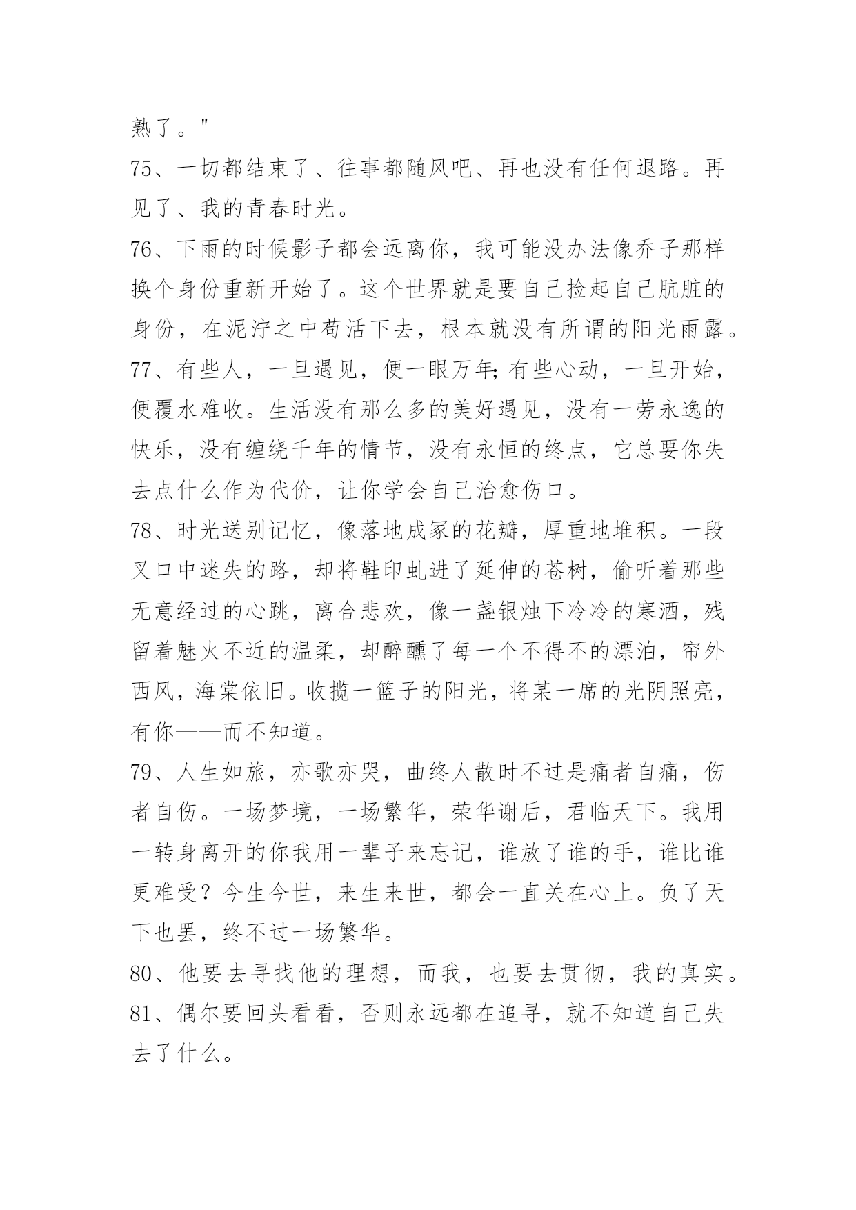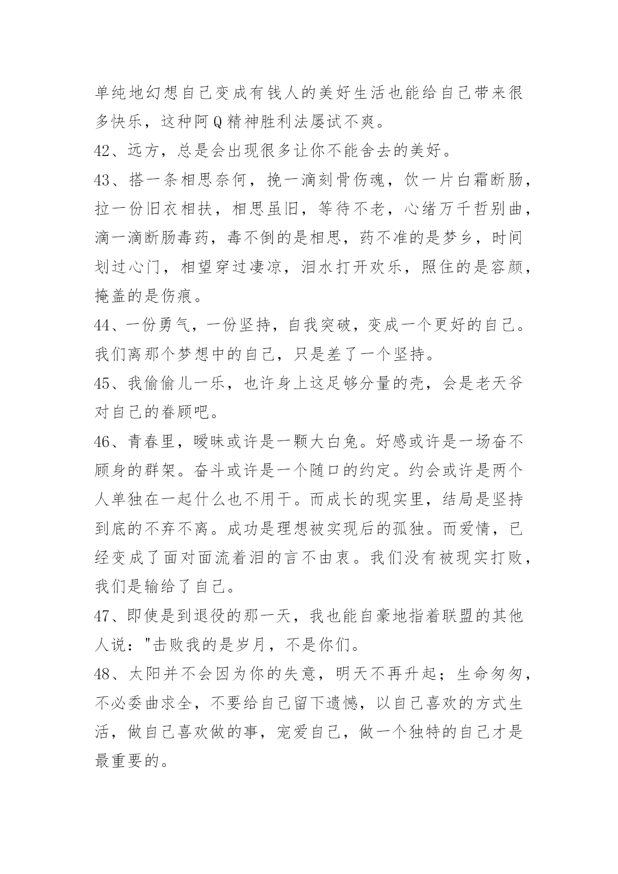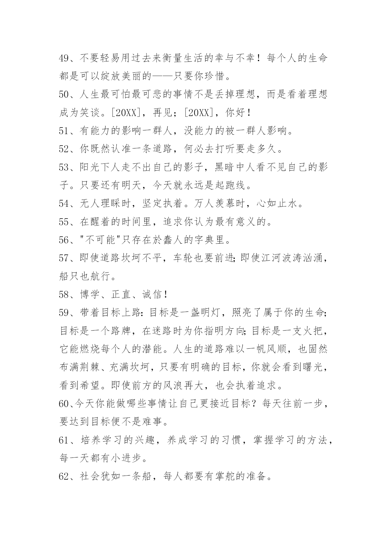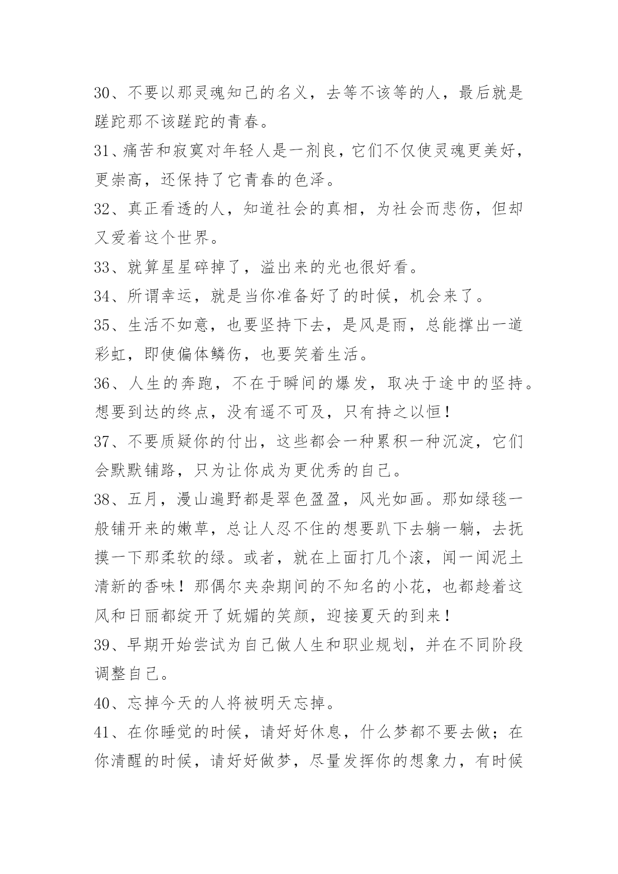 励志语句89条2022年常用励志语句汇编89条念书的时候,室友很得老师的喜欢,百思不得其解,拼命努力,拼命表现,只为了能多注意我一点。以下是小编精心准备的励志语句89条,欢迎参考。1、你适当地给他们设立目标,并从旁提醒与帮助,孩子们成功后会大喊大叫。那种喜悦会在无形中增强孩子的自信。在孩子以后的生活中,自信是一个人最重要的品质,所以从小就要给孩子树立自信,让他明白他能做什么,他一定能做什么。这样,你的孩子会一直在自信中成长,并成为生活中的强者。2、在路上,他解放了自己过去二十年来努力回避的记忆,任由这些回忆在他脑子里絮絮说着话,鲜活而跳跃,充满了能量。他不再需要用英里丈量自己走过的路程。他用的是回忆。3、有些人天资颇高而成就平凡,他们好比有大本钱而没有做出大生意,也有些人天资并不特异而成就则斐然可观,他们好比拿小本钱而做大生意。这中间的差别就在努力与不努力了。4、布金敦正是人们所期望的勇士吧!的努力不会白费的,他不屈不挠的搏斗会有回报的。勇敢起来吧,像布金敦那样振奋精神,勇往直前!5、努力向上微笑,却扯痛了嘴角。6、我们做任何事情,都应该有一番雄心壮志,立下远大的目标,用热忱激发自己于事业的动力。7、人生,原本就是风尘中的沧海桑田,只是,回眸处,世态炎凉演绎成了苦辣酸甜;人生的日子,越过越少,剩下的日子,越来越重要,我们要学会坚强的微笑。8、总是需要坚强的力量,面对以及接受,生命所不能受之重。9、我们只是敏感却没有安全感的孩子、只是故做坚强而已。10、梦想的裂变,观念的改变,是你成功的一开始。11、充实自己才不会飘忽迷茫。这一刻,我决定找回梦想。12、其实,人生本来就没有烦恼,或者说原本就不是烦恼。如果你不给自己烦恼,别人也永远不可能给你烦恼。13、情绪不因环境的优劣而改变,不以物喜,不以己悲,富亦欣然,穷亦无碍。14、事情开始的时候,不要想象着结局,因为有了这种预判,可能会左右我们的思想和行为,最后导致所有的付出如桃花落水,那些本来可以牵手的人,可以成就的事,终究铸成了许多遗憾,化作零星的记忆。既然开始了,就别驻足;当它结束时,莫去愧悔。只要走过、看过、经历过、感受过,成败只是人生的一种附属。15、不信命运,所以比别人加倍努力;想改变自己,所以拼命学习;阴晴圆缺的社会努力打了白条,学习成了黑道。16、这两天仿佛失了魂,努力想要忆起些许过往,最终想破了脑袋都没办法把它们挤出来。17、在努力过程中,不要老是做你喜欢和擅长的事,也要倾注意力于你有待改进的领域。18、学会放弃心中的欲望,才会拥有美好的明天。19、只有你相信了自己,别人才会相信你。20、你有多少自信在于你完成了多少事情,做的越多,你的自信就越多。21、天道酬勤,这四个字好多都知道,但是明白的人真不多。22、我不在意你曾堕落,我只在意你能否崛起。23、不再对所有人好,你好我就好,你狠我更狠,学会嘴甜,学会不该说的坚决不说。24、每天嘻嘻哈哈的笑着,只有自己才知道活的有多累。我们永远也不会知道彼此的感受,因为我们都如此固执,谁也不愿先开口。有时候你怀念的不是那个人,而是你们在一起的感觉和共度的时光。早安,新的一天!25、人生是一场马拉松,很多时候需要熬。26、今天尽你的最大努力去做好27、有了梦想就必须有行动,也许刚开始你会自信不足,但是只要你坚持了,你会越来越有自信,你会越来越相信自己,如果你一天到晚只是不断的想,是不会有任何结果的。28、纵使荆棘密布,我又何曾退却一步。29、天天听别人感叹,干什么能赚钱,干哪行能赚钱,其实哪里是哪行能赚钱的问题,问题在于你有没有能力,方法和手段赚钱。有能力有方法,有手段,在哪行都能赚钱。30、不要以那灵魂知己的名义,去等不该等的人,最后就是蹉跎那不该蹉跎的青春。31、痛苦和寂寞对年轻人是一剂良,它们不仅使灵魂更美好,更崇高,还保持了它青春的色泽。32、真正看透的人,知道社会的真相,为社会而悲伤,但却又爱着这个世界。33、就算星星碎掉了,溢出来的光也很好看。34、所谓幸运,就是当你准备好了的时候,机会来了。35、生活不如意,也要坚持下去,是风是雨,总能撑出一道彩虹,即使偏体鳞伤,也要笑着生活。36、人生的奔跑,不在于瞬间的爆发,取决于途中的坚持。想要到达的终点,没有遥不可及,只有持之以恒!37、不要质疑你的付出,这些都会一种累积一种沉淀,它们会默默铺路,只为让你成为更优秀的自己。38、五月,漫山遍野都是翠色盈盈,风光如画。那如绿毯一般铺开来的嫩草,总让人忍不住的想要趴下去躺一躺,去抚摸一下那柔软的绿。或者,就在上面打几个滚,闻一闻泥土清新的香味!那偶尔夹杂期间的不知名的小花,也都趁着这风和日丽都绽开了妩媚的笑颜,迎接夏天的到来!39、早期开始尝试为自己做人生和职业规划,并在不同阶段调整自己。40、忘掉今天的人将被明天忘掉。41、在你