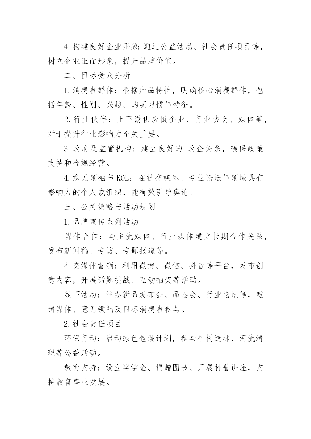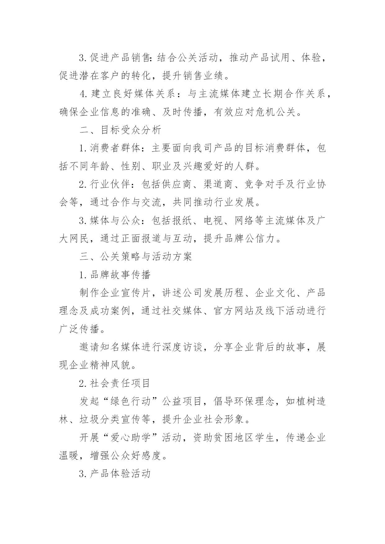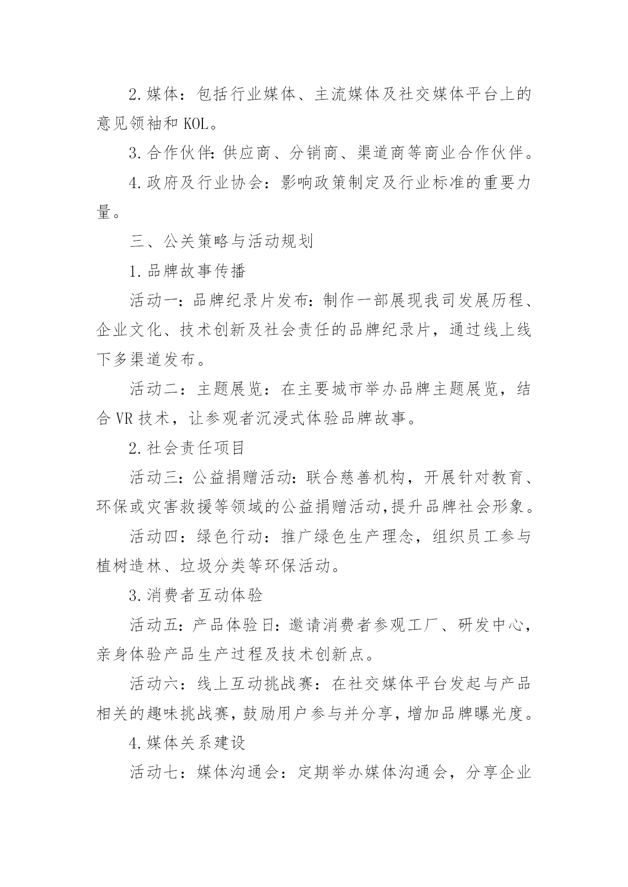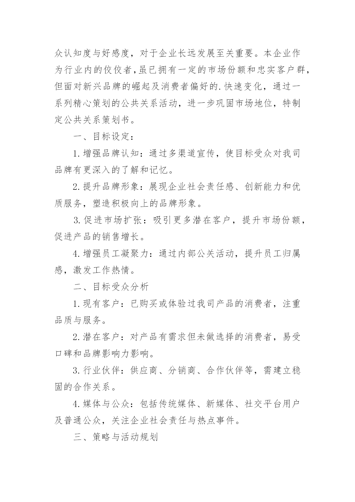 公共关系策划书篇1(精品)公共关系策划书时光如流水般匆匆流动,一段时间的工作已经结束了,很快就要开展新的工作了,当然要定好新的目标,需要认真地为此写一份策划书。那么如何把策划书做到重点突出呢?以下是小编为大家收集的公共关系策划书,供大家参考借鉴,希望可以帮助到有需要的朋友。公共关系策划书篇1为了进一步加强与公众、媒体、客户及合作伙伴的沟通与交流,提升品牌影响力和美誉度,特制定本公共关系策划书。一、目标设定:1.品牌形象塑造:通过一系列公关活动,强化我司的正面品牌形象,突出产品特色与企业文化。2.市场拓展:增加品牌曝光度,吸引潜在客户,拓展市场份额。3.客户忠诚度提升:增强现有客户的品牌忠诚度,促进口碑传播。4.媒体关系优化:建立并维护与媒体的良好关系,提升品牌在媒体中的'正面报道率。二、目标受众分析1.消费者:关注产品品质、性价比、品牌故事及社会责任的广泛消费群体。2.媒体:包括行业媒体、主流媒体及社交媒体平台上的意见领袖和KOL。3.合作伙伴:供应商、分销商、渠道商等商业合作伙伴。4.政府及行业协会:影响政策制定及行业标准的重要力量。三、公关策略与活动规划1.品牌故事传播活动一:品牌纪录片发布:制作一部展现我司发展历程、企业文化、技术创新及社会责任的品牌纪录片,通过线上线下多渠道发布。活动二:主题展览:在主要城市举办品牌主题展览,结合VR技术,让参观者沉浸式体验品牌故事。2.社会责任项目活动三:公益捐赠活动:联合慈善机构,开展针对教育、环保或灾害救援等领域的公益捐赠活动,提升品牌社会形象。活动四:绿色行动:推广绿色生产理念,组织员工参与植树造林、垃圾分类等环保活动。3.消费者互动体验活动五:产品体验日:邀请消费者参观工厂、研发中心,亲身体验产品生产过程及技术创新点。活动六:线上互动挑战赛:在社交媒体平台发起与产品相关的趣味挑战赛,鼓励用户参与并分享,增加品牌曝光度。4.媒体关系建设活动七:媒体沟通会:定期举办媒体沟通会,分享企业最新动态、产品信息及行业见解,增进与媒体的互动与了解。活动八:专访与深度报道:邀请主流媒体进行企业高层专访,撰写深度报道,展现企业领导力及行业影响力。四、执行计划1.时间规划:明确各项活动的时间节点,确保按计划有序推进。2.团队分工:成立专项公关小组,明确各成员职责,确保活动高效执行。3.预算分配:合理规划活动预算,确保资源有效利用。4.风险评估与应对:识别潜在风险,制定相应应对措施,确保活动顺利进行。公共关系策划书篇2在当前竞争激烈的市场环境中,xx公司作为行业内的佼佼者,一直致力于提供高品质的产品与服务,赢得了广泛的市场认可。然而,随着市场格局的不断变化和消费者需求的日益多样化,如何进一步提升品牌形象,增强公众认知度与好感度,成为我司当前面临的重要课题,特制定本公共关系策划书。一、项目目标:1.提升品牌知名度:通过多渠道宣传,扩大品牌影响力,提高品牌在目标市场中的'认知度。2.增强品牌美誉度:通过展示企业实力、社会责任及文化理念,树立正面企业形象,赢得公众信赖。3.促进产品销售:结合公关活动,推动产品试用、体验,促进潜在客户的转化,提升销售业绩。4.建立良好媒体关系:与主流媒体建立长期合作关系,确保企业信息的准确、及时传播,有效应对危机公关。二、目标受众分析1.消费者群体:主要面向我司产品的目标消费群体,包括不同年龄、性别、职业及兴趣爱好的人群。2.行业伙伴:包括供应商、渠道商、竞争对手及行业协会等,通过合作与交流,共同推动行业发展。3.媒体与公众:包括报纸、电视、网络等主流媒体及广大网民,通过正面报道与互动,提升品牌公信力。三、公关策略与活动方案1.品牌故事传播制作企业宣传片,讲述公司发展历程、企业文化、产品理念及成功案例,通过社交媒体、官方网站及线下活动进行广泛传播。邀请知名媒体进行深度访谈,分享企业背后的故事,展现企业精神风貌。2.社会责任项目发起“绿色行动”公益项目,倡导环保理念,如植树造林、垃圾分类宣传等,提升企业社会形象。开展“爱心助学”活动,资助贫困地区学生,传递企业温暖,增强公众好感度。3.产品体验活动组织产品体验会,邀请目标消费者、行业专家及媒体参与,亲身体验产品优势,收集反馈意见。开展线上“产品试用官”招募活动,鼓励用户分享使用体验,形成口碑传播。4.媒体关系维护建立媒体数据库,定期与主流媒体沟通,提供新闻素材,确保企业信息的及时发布。举办媒体交流会,邀请媒体代表参观企业,加深了解,建立长期合作关系。5.危机公关预案制定详细的危机公关预案,明确应对流程、责任分工及沟通策略,确保在突发事件中能够迅速、有效地应对。公共关系策划书篇3在当前竞争激烈的市场环境中,为了进一步提升我司品牌知名度、增强公众信任度、促进产品销售,以及构建良好的企业形象,特制定本公共关系策划书。一、目标设定